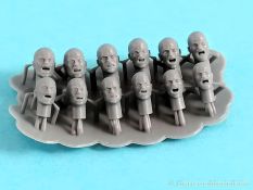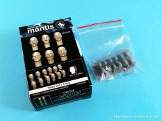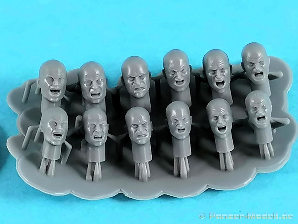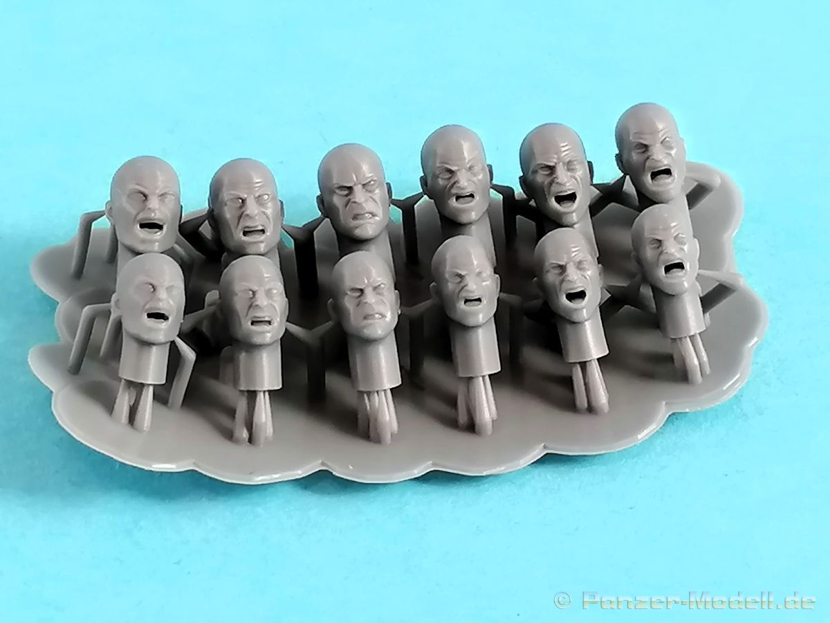 Unter dem Begriff “Angry” (Wütend, zornig, verärgert…) beschert uns Mantis ein Set mit insgesamt zwölf zum Thema passenden Köpfen. Interessant dabei ist die Tatsache das die Köpfe in zwei unterschiedlichen Größen gedruckt sind. Das läßt sich damit erklären das die im Handel angebotenen Figuren nicht immer den Maßstab 1:35 einhalten. Manche sind größer und manche sind kleiner. Die hintere Reihe hat eine durchschnittliche Höhe von einem 1 cm, die vordere Reihe der Köpfe hat eine Höhe von 0,8 cm. Der Durchmesser, inkl. Ohren beträgt bei den größeren Köpfen 0,5cm, bei den kleineren Köpfen eine Idee weniger. Die Physiognomie der Gesichter und die gespiegelten Emotionen sind sehr gut umgesetzt und umfasst unterschiedliche Ausdrucksformen. Erste Sahne. Alle 12 Köpfe sind in zwei Reihen auf einem Träger aufgedruckt. Ein paar Supports, angenehm klein und zierlich sind ebenfalls vorhanden, die sich aber problemlos entfernen lassen sollten. Die langen Hälse können entsprechend der gewählten Figur zugeschnitten werden. Allerdings sind alle Köpfe barhäuptigt dargestellt. Ideal für Helme. Für eine volle Haarpracht muß auf z.B. Magic Sculp zurückgegriffen werden. Schön an dem Set ist auch der Fakt das die Köpfe universell eingesetzt werden können. Figurenbauer dürfen sich freuen.