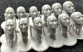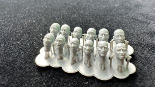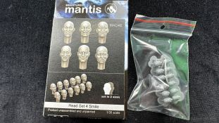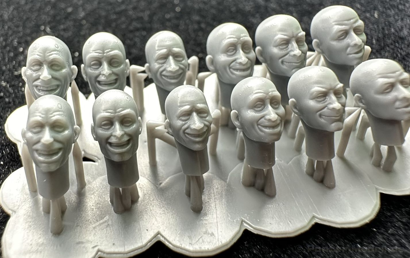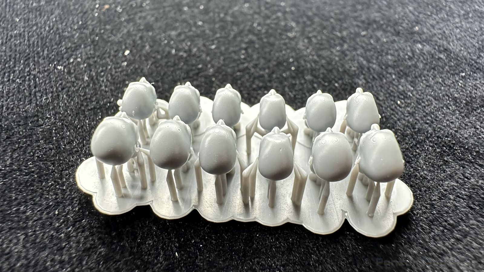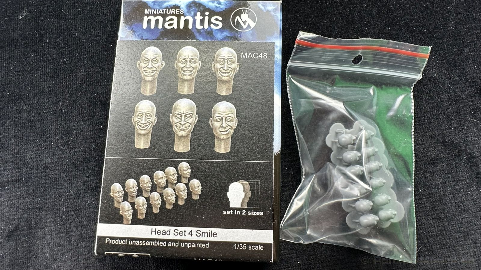 Mantis präsentiert hier in 3D Resindruck insgesamt 12 Köpfe, jedes Set ist einem „Gesichtsausdruck“ zugeordnet mit dem Set MAC48 haben wir Smile oder auf Deutsch Fröhlich. Der eigentliche Clou ist aber, dass wir 2 verschiedene Größen haben, das ist der Tatsache geschuldet das als Beispiel die Dragon Plastikfiguren im Maßstab 1:35 größer sind als z.B. die von Tamiya. Die hintere Reihe hat eine durchschnittliche Höhe von einem 1 cm, die vordere Reihe der Köpfe hat eine Höhe von 0,8 cm. Der Durchmesser, inkl. Ohren beträgt bei den größeren Köpfen 0,5cm, bei den kleineren Köpfen eine Idee weniger. Alle 12 Köpfe sind auf einem Träger aufgedruckt, ein paar Supports sind ebenfalls vorhanden die entfernt werden müssten. Zum Glück sind diese Art Angüsse minimal und verjüngen sich zum Ende hin, der Versäuberungsaufwand ist hier nicht sehr hoch. Die freudige(n) Emotion(en) sind gut eingefangen worden, wir finden hier von einem leichten Grinsen bis zu der überschwänglichen Freude eine breite Palette an Ausdrücken. Anatomisch gibt es da nichts zu meckern, ebenfalls wurde gut bedacht das die Köpfe einen langen Hals haben, um die passende Länge zuschneiden zu können. Alle Köpfe habe keine Haare, diese können bei Bedarf selbst mit z.B. Magic Sculp erstellt werden. Natürlich passen so auch Helme perfekt. Hier werden für den geneigten Militär/Figur/Dioramen Erbauer endlich lösungsorientierte Mittel an die Hand gegeben, sodass die Wunschfigur keinen „Wasserkopf“ mehr haben muss.