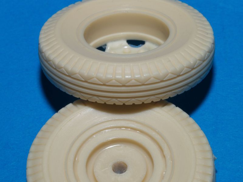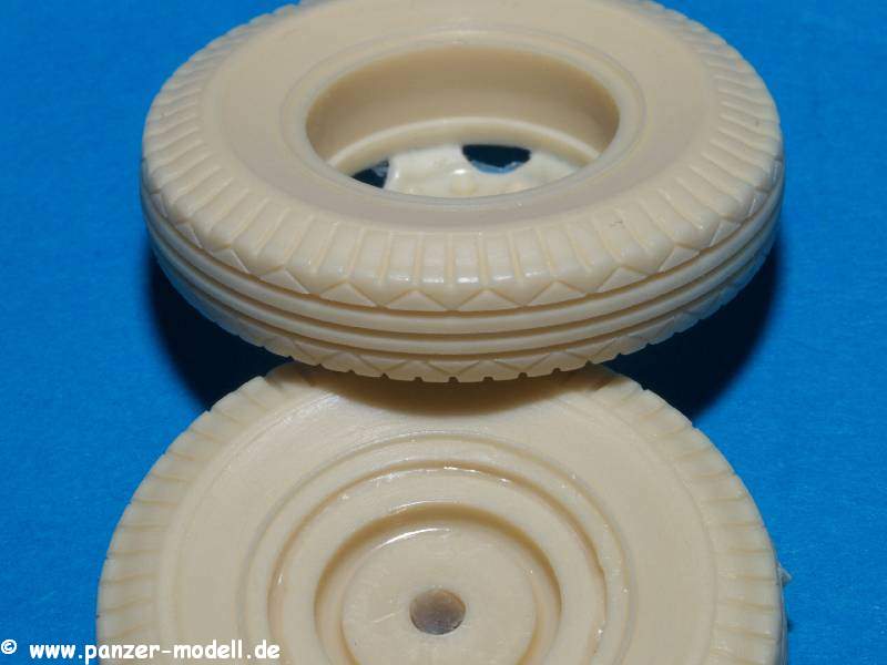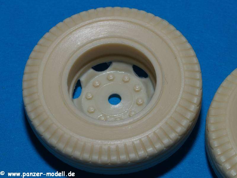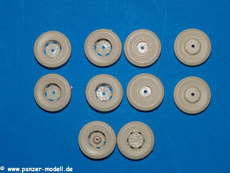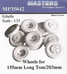 Unter der Nummer MP35042 gibt es bei MASTERS Productions Wheels for 155mm Long Tom/203mm. Das Set besteht aus zehn Reifen aus beige farbenen Resin und ersetzt die originalen Reifen, welche dem dem Bausätzen von AFV-Club beiliegen. Das Profil der Reifen von MASTERS Productions ist deutlich feiner als das recht grobstollige der Originalteile.