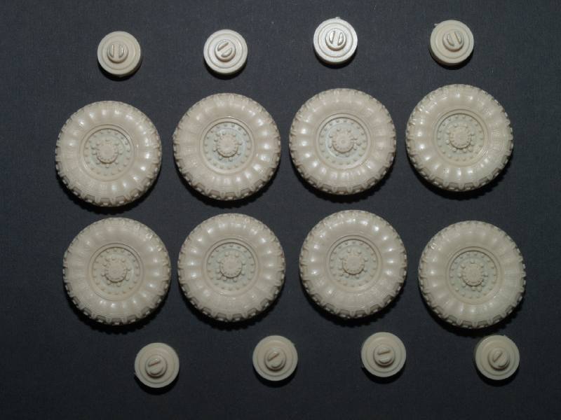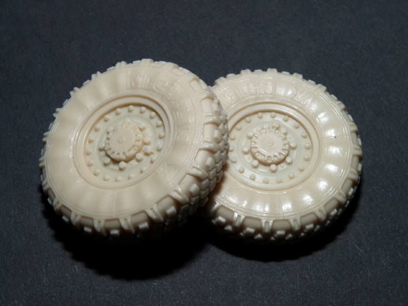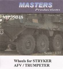 Unter der Nummer MP35058 gibt es bei MASTERS Productions Wheels for Stryker (AFV/Trumpeter). Das Set besteht aus acht Reifen aus beige farbenen Resin, sowie der entsprechenden Anzahl Adaptern für den Stryker von Trumpeter und ersetzt die originalen Reifen, welche den Stryke-Bausätzen beiliegen. Das Profil der Reifen wurde von MASTERS Productions sehr schön widergegeben. Auch der 'Michelin X'-Schriftzug kommt gut raus.