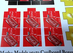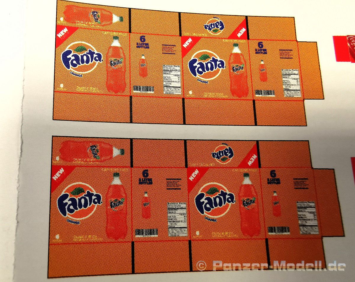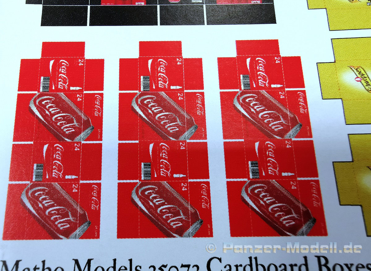 Auf dem Trägerpapier im Format DIN A5 befinden sich aufgedruckt 34 Getränkekartons von fünf verschiedenen Softdrink-Marken im Maßstab 1:35. Die Farben wirken sehr kräftig, die Schriftzüge sind scharf und sehr sauber gedruckt. Das Papier ist angenehm dünn und hat eine seidenmatte Oberfläche. Jetzt nur noch ausschneiden, falten, verkleben und fertig sind die Kartons. Sie dürften auf jedem Diorama und, in oder an, Fahrzeugen einen tollen Blickfang darstellen. Für die Dioramenbauer in den Bereichen Modern, zivil sowie auch militärisch, oder Post Apocalyptic also ein wahrhaft brauchbares Zubehörset für die Ausstattung von Gebäuden, oder Fahrzeugen. Fazit: Sehr empfehlenswert.