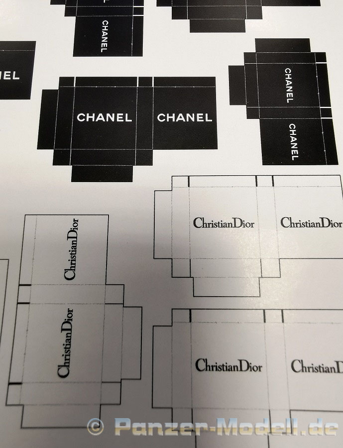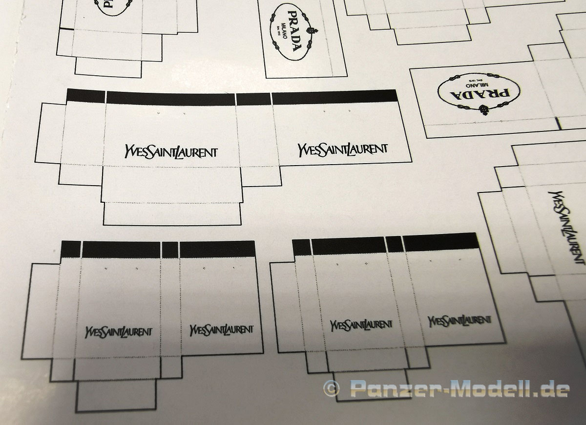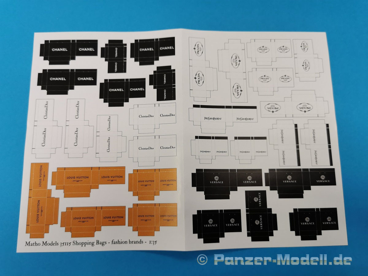 Auf dem Papierbogen im Format DIN A5 befinden sich aufgedruckt 32 Tragetaschen von sechs verschiedenen Luxus- oder Designer-Marken im Maßstab 1:35. Ebenfalls enthalten sind drei kleine Rollen mit dünnen Fäden in weiß, blau und schwarz mit denen die Trageriemen der Einkaufstaschen dargestellt werden können. Die jeweiligen Taschen sind in unterschiedlichen Größen vorhanden Man bekommt hier also exakt solche großen Einkaufstaschen mit denen die reichen und schönen Damen, nachdem sie die Kreditkarte ihrer Männer malträtiert haben, ihre Einkäufe nach Hause schleppen… Die Farben wirken sehr kräftig, die Schriftzüge sind scharf und sehr sauber gedruckt. Das Papier ist angenehm dünn und hat eine seidenmatte Oberfläche. Jetzt nur noch ausschneiden, falten, verkleben und fertig sind die Designertaschen. Sie dürften auf jedem Diorama und, in oder an, Fahrzeugen einen tollen Blickfang darstellen. Für die Dioramenbauer in den Bereichen Modern, zivil oder Post Apocalyptic, also ein wahrhaft brauchbares Zubehörset für die Ausstattung von Gebäuden oder Fahrzeugen. Auf militärischen Dioramen kann ich sie mir ebenfalls vorstellen. Hier liegen sie dann vielleicht irgendwo in einer Ecke am Gebäude oder an / in einem Müllcontainer. Grenzen setzt hier nur die Phantasie des Modellbauers. Fazit: Sehr empfehlenswert.