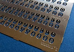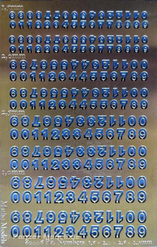 Ein schönes kleines Set mit einer Vielzahl fein geätzter Nummern, die für den geneigten Modellbauer ein schöne bereicherung für Verfeinerungen darstellt. Passend dazu gibt es von Matho auch Buchstaben, sowie die Zahlen auch in größeren Größen.