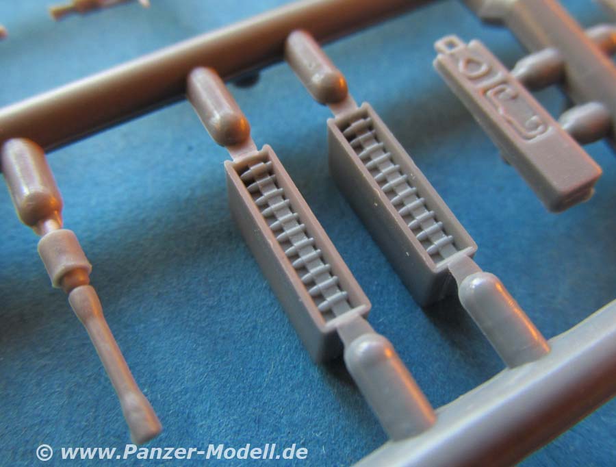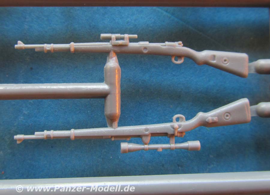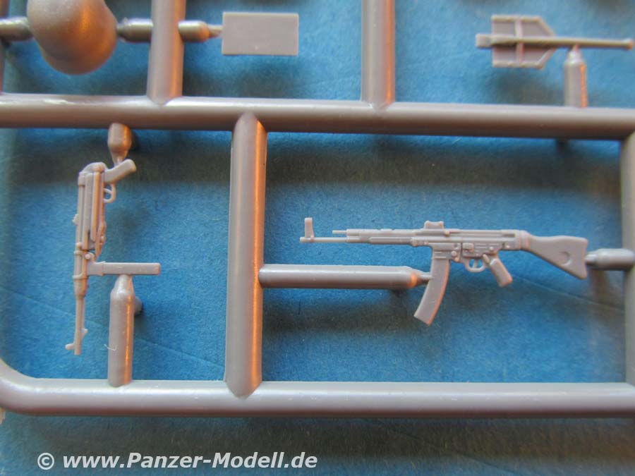 Beim Zubehör wurde nicht gespart - es handelt sich dabei um den Spritzling aus dem Masterbox Set 35115 und der beinhaltet wirklich alles was das Bastlerherz für Infanteriefiguren der Wehrmacht begehrt. Helme, Gasmaskenbehälter, Klappspaten, Essgeschirr, Magazintaschen und massenhaft Infanteriewaffen wie P-08 Luger, Walther P38, Mauser 98K mit verschiedenen Zieleinrichtungen, G43s, Stgw 44, MP 38, MP 717, Bergmann MP 34/1, MP 41, und natürlich MG 34 und MG 42s. Alle sehr schön und sauber gespritzt.