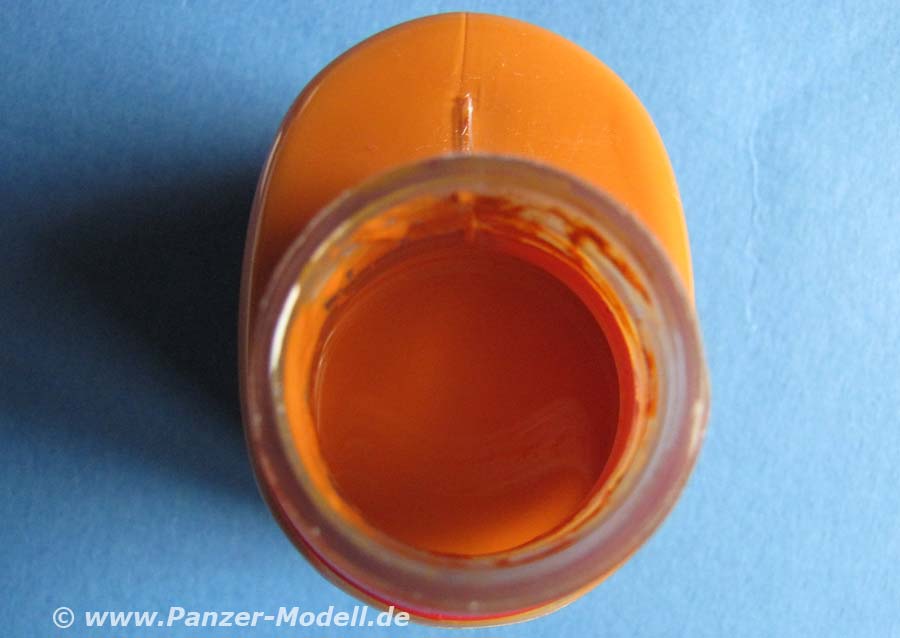 Im 75ml Plastikfläschchen ist eine hellbraune/orange Rostbrühe, die mittels Pinsel einfach auf das Modell gepinselt wird und beim Torcknen Rostschlieren in hellen Tönen entwickelt. Den vollen Umfang für realistische Rosteffekte wird man aber nur über mehrere unterschiedlich starke Anwendungen bekommen, ggf. auch mit der standard Rust Brühe.