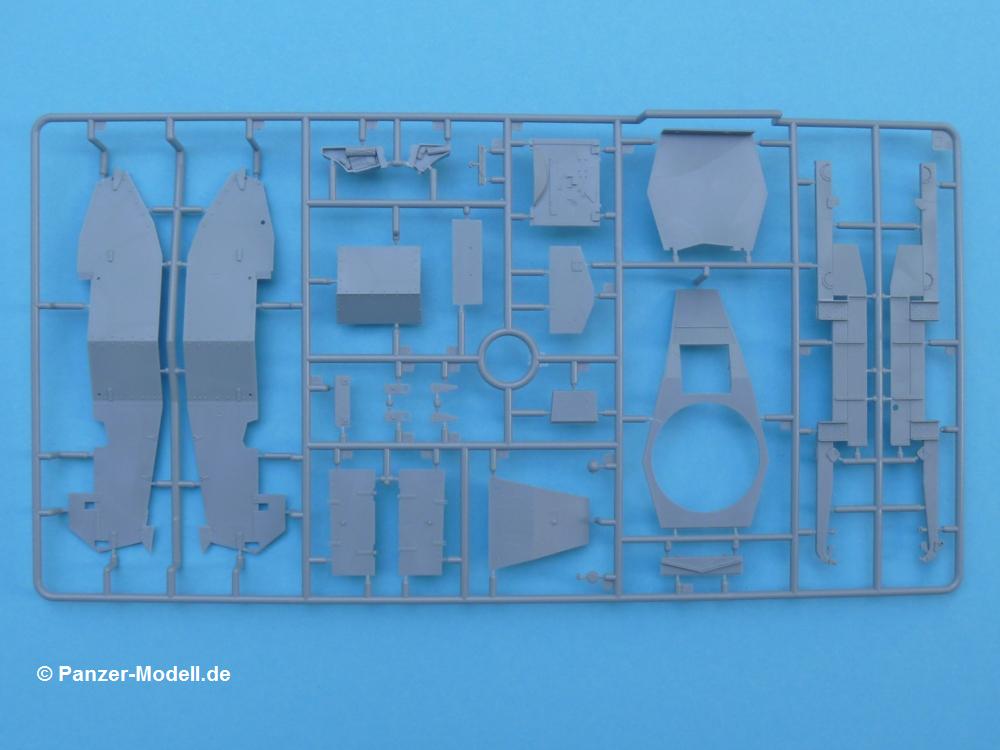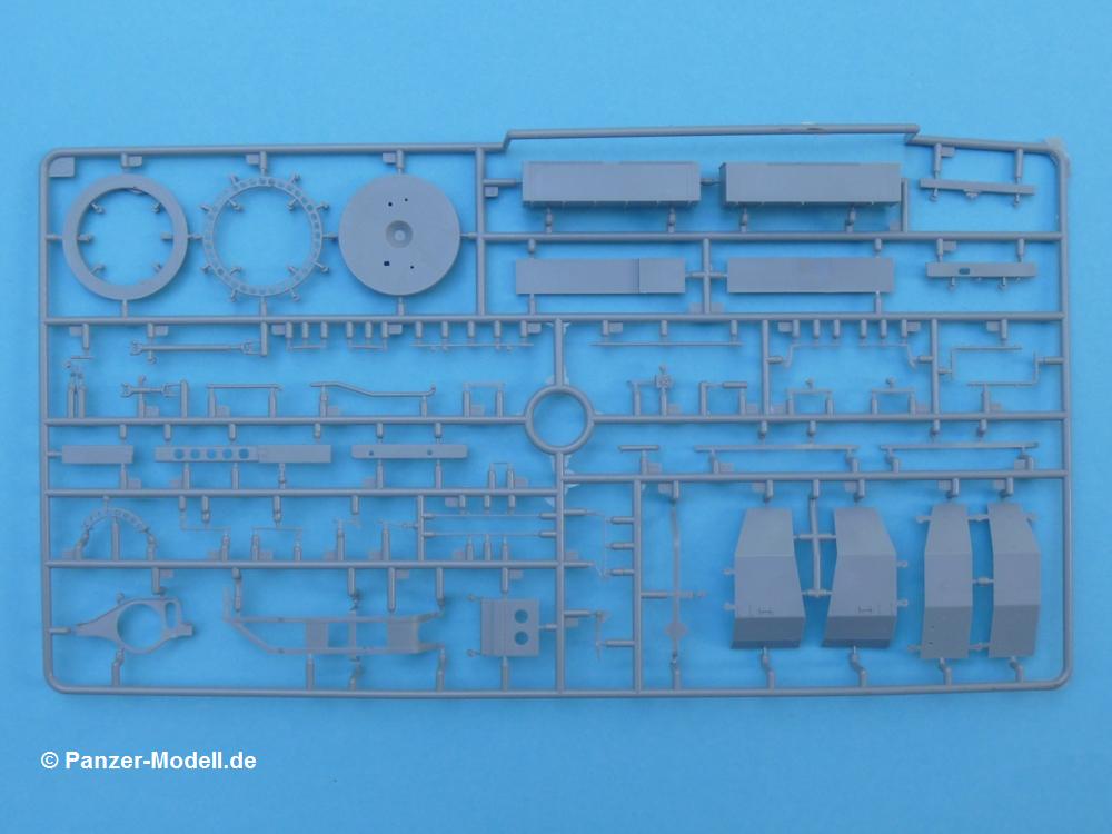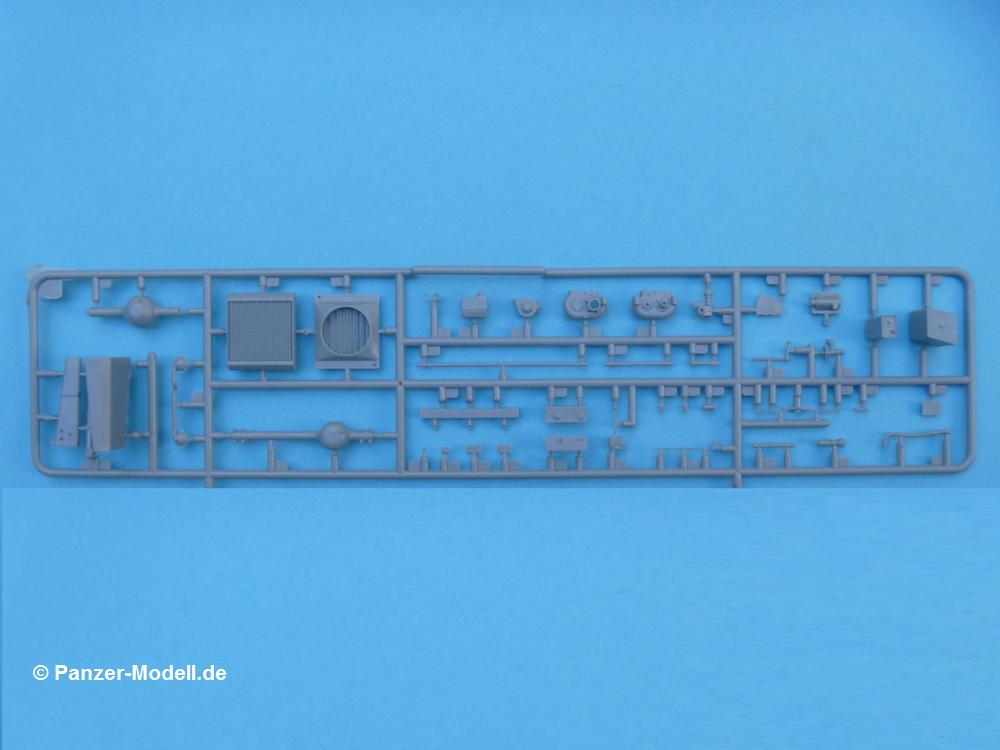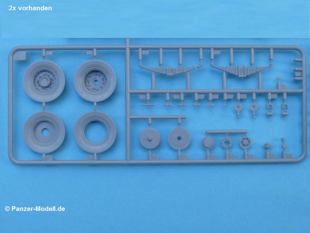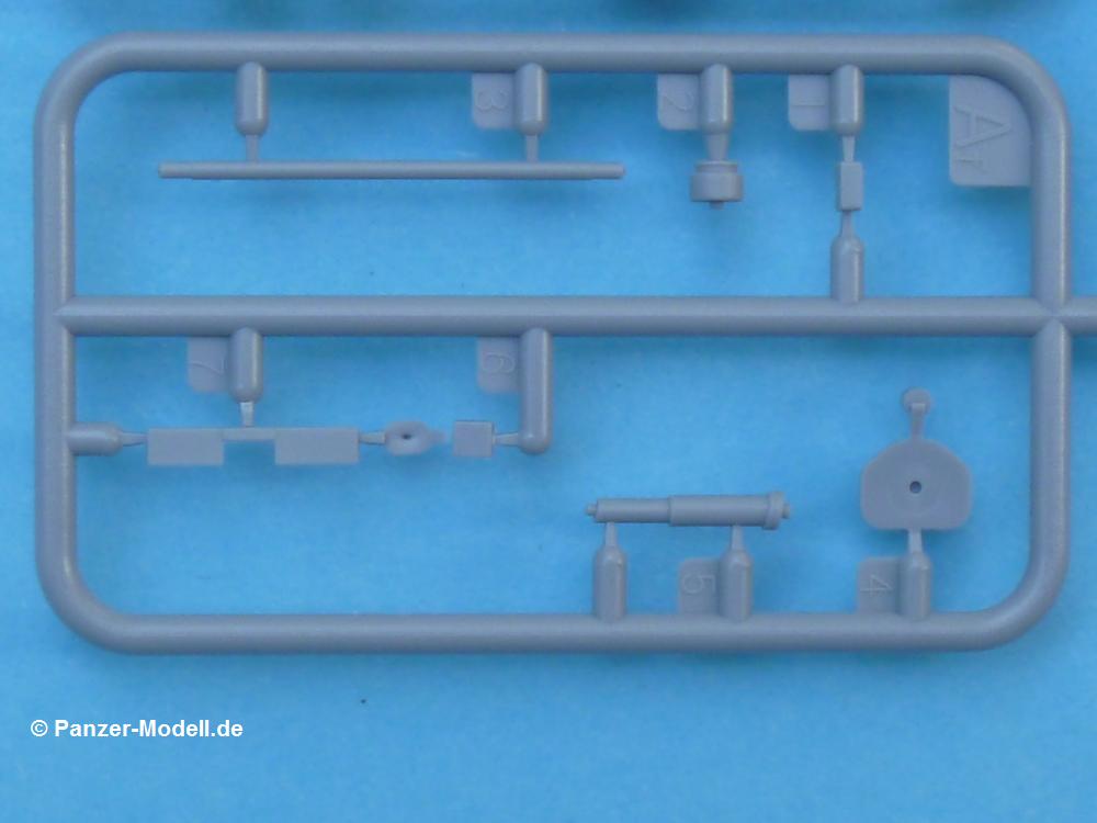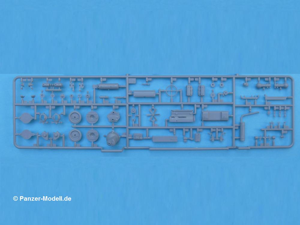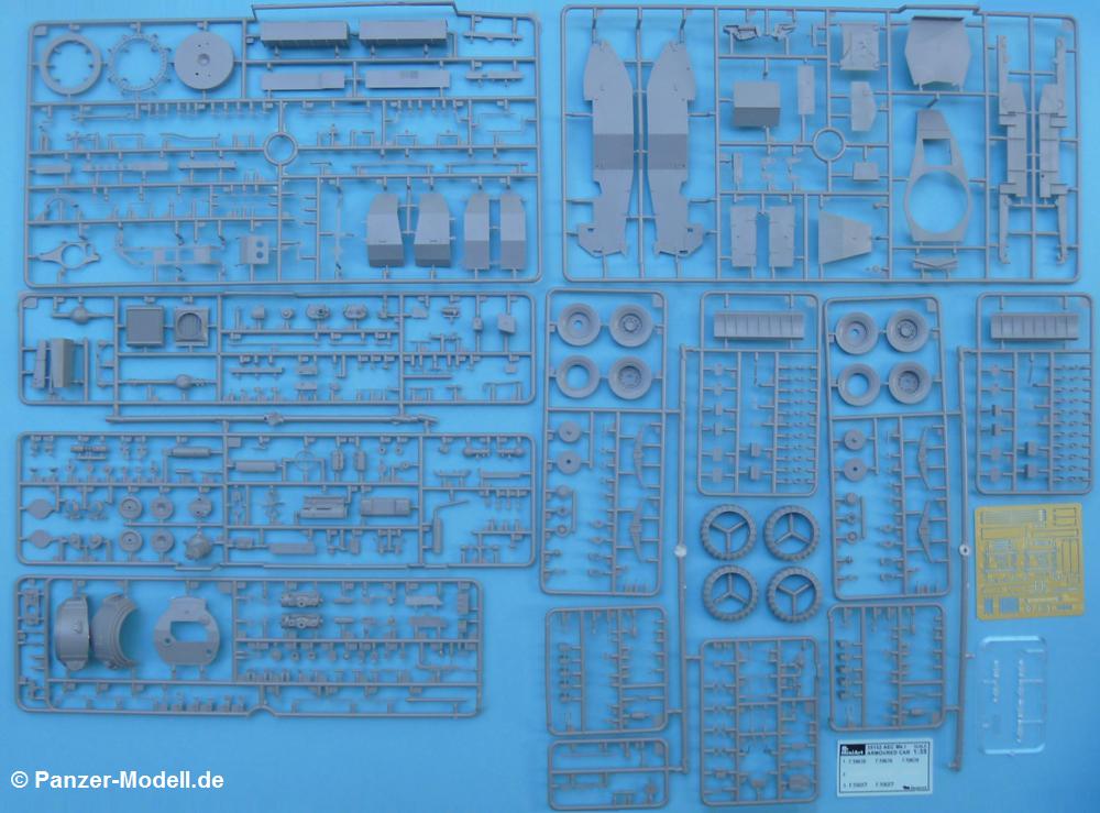 AEC (Associated Equipment Company) stellte 1941 das auf dem Fahrgestell des AEC Matador entwickelten AEC Armoured Car bei einer Parade in London vor. Das Mk.I hatte 3 Mann Besatzung und war mit einem 105 PS (78 kW) starken Diesel Motor ausgestattet, mit dem es ca. 58 km/h erreichen konnte. Die Bewaffnung bestand aus einem Valentine II Turm mit einer QF 2 Pounder (PaK Kaliber 40 mm); zusätzlich ein koaxiales MG. Vom Mk.I wurde 129 Stück hergestellt. Er wurde ab den letzten Monaten des Jahres 1942 hauptsächlich in Nordafrika eingesetzt. Seine Nachfolger Mk.II und Mk.III waren stärker bewaffnet und mit einem 158 PS (118 kW) Dieselmotor ausgestattet. Eine weitere Variante war mit einem Crusader AA Turm zur Flugabwehr ausgerüstet. Als erstes angekündigt, als zweites auf den Markt gekommen. MiniArt bringt uns hier das erste AEC Armoured Car, das Mk.I. Die Unterschiede zum Mk.II sind bereits durch den Valentine Turm mit der QF 2 Pounder PaK und der anderen Fahrzeugfront zu erkennen. Die hellgrauen Spritzlinge füllen den Karton gut aus. Insgesamt sind es 12 hellgraue, 1 klarer und 4 hellgraue Radreifen. Dazu kommt eine Ätzteilplatine, ein sparsamer Abziehbilderbogen (Decals) und eine 16-seitige Bauanleitung im A4 Format. Die Spritzlinge sind wie folgt aufgeteilt: - A (2x): Sandbleche, Kraftstoff- u. Munitionsbehälter, Munition - Ac (1x): Teile für Fahrersitz, Schwenkgetriebe für Turm - Ad (2x): Radfelgen, Blattfedern u. Aufhängungen, Kardangelenke, Flansche - Af (1x): Turmsitz, Halterungen an Motortrennwand - Ae (2x): Munitionsbehälter, Griffe, Feuerlöscher, Seilkauschen, Kleinstteile - B (1x): Kühler, Achsen, Tank, Getriebe - Ba (1x): Motor, Auspuff, Kupplung, Einspritzpumpe, Lenkrad, Bremstrommeln, Achsenden - C (1x): Turmboden, Munitionshalterungen, Außenstaukästen, Kotflügel, Kardanwellen, Motoraufnahme und -schutzrahmen - D (1x): Turm, Kanone, Blende. Funkgerät - Gd (1x): Winkelspiegel, Fahrerschutzscheibe - H (4x): Reifen - PE (1x): Schutzbügel f. Funkgerät, div. Halterungen Der 345x240x80 mm große Karton überrascht mit einer Fülle an Spritzlingen und Teilen, die man vom Anblick des Deckelbildes nicht erwartet. Ein kurzer Blick in die Bauanleitung verrät, dass das meiste im Inneren des Fahrzeugs seinen Platz finden wird. Die Teile aus grauem Plastik sind sauber gespritzt, ohne Verzug und Versatz, kein Grat, keine Fischhäute oder Sinkstellen. Einige wenige Auswerferspuren auf Innenseiten von Teilen, so dass die Spuren beim Zusammenbau verschwinden, ohn das man sie wegschleifen und verspachteln müsste. Aber gehen wir mal die Spritzlinge einzeln durch und schauen genauer hin. Spritzling A (2x): Die Sandbleche mit den Querrippen haben eine für Plastik annehmbare Stärke und kommen der Wirklichkeit recht nahe. Die Kästen für das Turmheck bestehen jeweils aus dem 5-seitigen Kastenkörper und dem passenden Deckel dazu. Gleiches gilt für die typisch britischen Kraftstoffbehälter, nur das hier am Deckel der Ausgußverschluß mit angegossen ist. Griffe sind nicht dran. Diese kommen erst beim Bau von der Ätzteilplatine. Die etwas über 1 mm durchmessende 2-Pfünder Munition ist am Ende mit einem sternförmigen Clip versehen. (Viel Spaß beim Bemalen, wenn man alle 44 Kartuschen verwenden will.) Die Munition ist ohne Kopf, aber dieser wäre nach Einstecken in die Halterungen im Turm sowieso nicht mehr zu sehen. Spritzling Ac (1x): Der Spritzling besteht hauptsächlich aus den 9, teilweise filigranen, Teilen des Fahrersitzes. Das Sitzpolster ist leicht gewellt, um die Kissenstruktur darzustellen. Weiterhin finden wir die 4 komplexen Teile des Turmschwenkgetriebes hier. Mit den Ecken, Winkeln und Nieten haben die Spritzformbauer einen fantastischen Job hingelegt. Die Millimeter großen Scharniere und Beschläge der Fahrerluke, bzw. der kleinen Schutzscheibe werden beim Abtrennen vom Spritzling die volle Aufmerksamkeit brauchen, sonst verschwinden sie mit dem ersten Atemzug im Nirwana. Das Armaturenbrett(chen) hat mal 2 Anzeigen, für die es keine Abziehbilder gibt. Selbst anmalen ist hier die Devise. Spritzling Ad (2x): Ins Auge stechen die Blattfedernpakete. Jede Blattfeder ist sauber zu erkennen. Schön auch die Räder mit ihren unzähligen Radmuttern und den Herstelleraufdrucken und Radgrößen auf den Seiten - DUNLOP - 13-15-20 - Made in England. Dazu kommen Kardangelenke und Deckel, bei denen man scheinbar keine einzige Schraube vergessen hat. Spritzling Ae (2x): Die größten Teile sind die Munitionskästen und die aus einem Stück bestehenden Luftfilter. Der Feuerlöscher mit angegossener Halterung lässt kein Detail vermissen. Achtung: Auch hier Kleinteilalarm! Motorraumklappenverschlüsse kleiner als 1 mm, Außenspiegelhaltestange mit ca. 0,4 mm Durchmesser sind nur einige. Der Tankdeckel mit seinem gewellten Rand ist da schon wieder ein großes Teil. Die Abschleppschäkel sind durchbohrt, damit man später den passenden Bolzen, an dem das Auge für das Sicherungskettchen erkennbar ist, durchstecken kann. Die Seilkauschen haben eine schöne Struktur, nur habe ich in der Bauanleitung keine Verwendung dieser Teile gefunden. Ein Abschleppseil übrigens auch nicht. Spritzling Af (1x): Einer der beiden kleinsten Spritzlinge. Hier finden wir Halterungen für die Motortrennwand, eine Stabilisierungsstange für das Fahrgestell und den Turmsitz. Spritzling B (1x): Der 2-teilige Kühler hat es einem gleich angetan. Beidseitig sind die Kühlrippen dargestellt. Die Achsen bestehen aus einem Teil, auf das nur der Kardandeckel aufgesetzt wird. Also, keine Angst vor Trennnähten, denn es gibt keine. Weitere Teile sind Schaltgestänge, Aufnahmen für die Federpakete, Querlenker und das Allradgetriebe. Spritzling Ba (1x): Die Hauptteile des Motors bestehen aus einem 3-teiligen Motorblock, Ölwanne, Zylinderkopfdeckeln, Einspritzpumpe, Auspuffkrümmer und Anbauteilen. Diesel-, Ölfilter und Kompressor sind weitere Details. Der Hammer - die 6 Einspritzdüsen müssen separat verkle