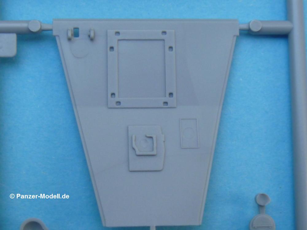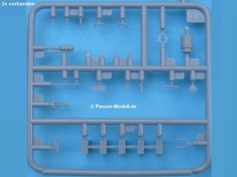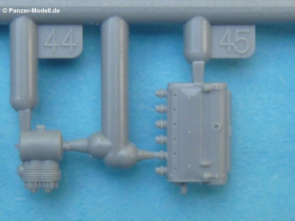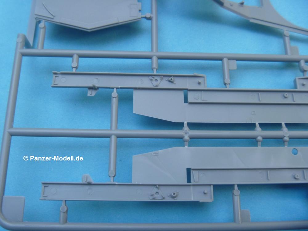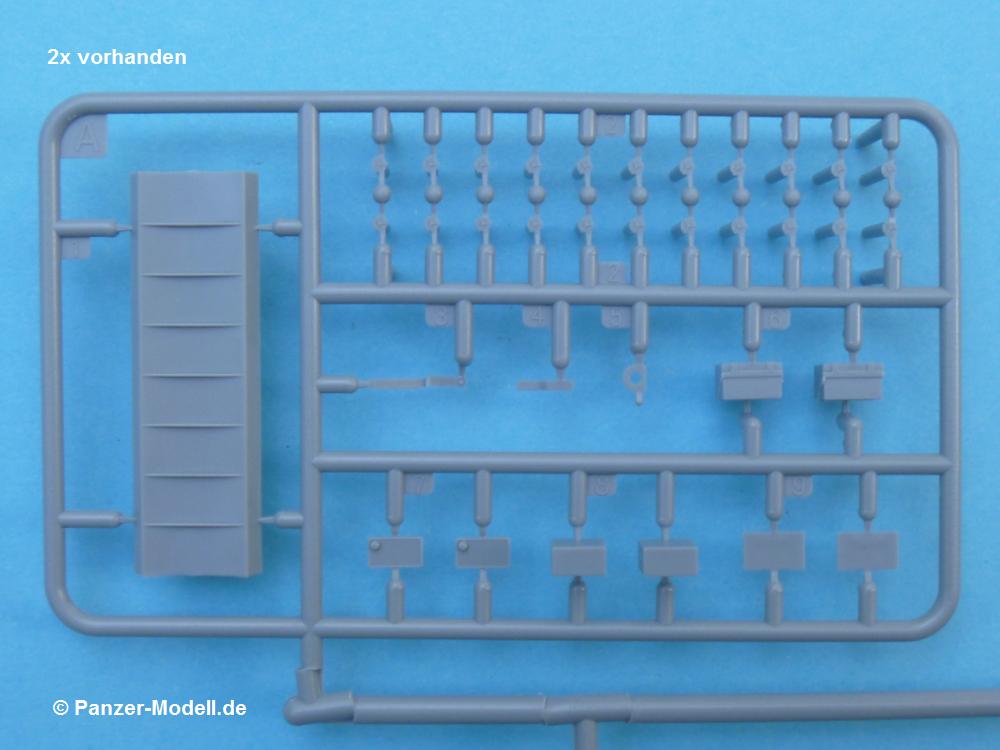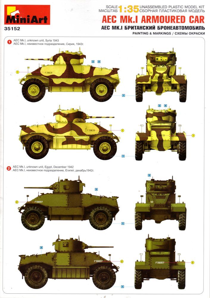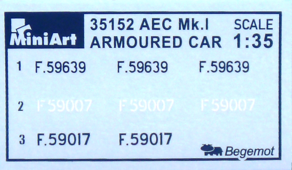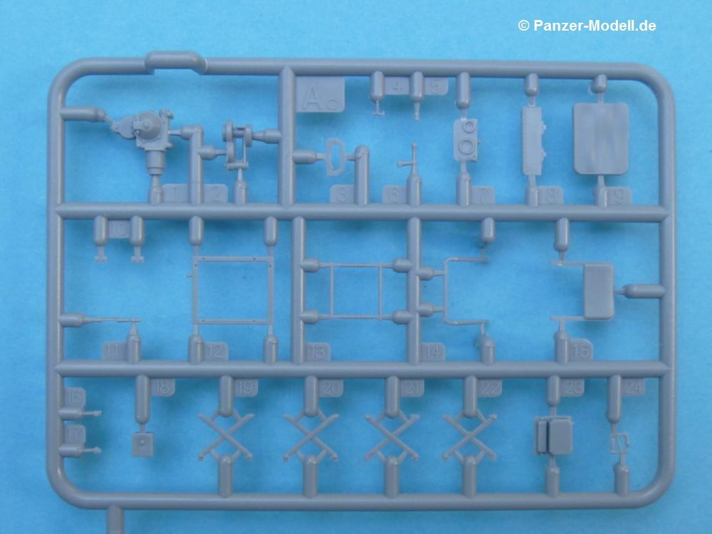 AEC (Associated Equipment Company) stellte 1941 das auf dem Fahrgestell des AEC Matador entwickelten AEC Armoured Car bei einer Parade in London vor. Das Mk.I hatte 3 Mann Besatzung und war mit einem 105 PS (78 kW) starken Diesel Motor ausgestattet, mit dem es ca. 58 km/h erreichen konnte. Die Bewaffnung bestand aus einem Valentine II Turm mit einer QF 2 Pounder (PaK Kaliber 40 mm); zusätzlich ein koaxiales MG. Vom Mk.I wurde 129 Stück hergestellt. Er wurde ab den letzten Monaten des Jahres 1942 hauptsächlich in Nordafrika eingesetzt. Seine Nachfolger Mk.II und Mk.III waren stärker bewaffnet und mit einem 158 PS (118 kW) Dieselmotor ausgestattet. Eine weitere Variante war mit einem Crusader AA Turm zur Flugabwehr ausgerüstet. Als erstes angekündigt, als zweites auf den Markt gekommen. MiniArt bringt uns hier das erste AEC Armoured Car, das Mk.I. Die Unterschiede zum Mk.II sind bereits durch den Valentine Turm mit der QF 2 Pounder PaK und der anderen Fahrzeugfront zu erkennen. Die hellgrauen Spritzlinge füllen den Karton gut aus. Insgesamt sind es 12 hellgraue, 1 klarer und 4 hellgraue Radreifen. Dazu kommt eine Ätzteilplatine, ein sparsamer Abziehbilderbogen (Decals) und eine 16-seitige Bauanleitung im A4 Format. Die Spritzlinge sind wie folgt aufgeteilt: - A (2x): Sandbleche, Kraftstoff- u. Munitionsbehälter, Munition - Ac (1x): Teile für Fahrersitz, Schwenkgetriebe für Turm - Ad (2x): Radfelgen, Blattfedern u. Aufhängungen, Kardangelenke, Flansche - Af (1x): Turmsitz, Halterungen an Motortrennwand - Ae (2x): Munitionsbehälter, Griffe, Feuerlöscher, Seilkauschen, Kleinstteile - B (1x): Kühler, Achsen, Tank, Getriebe - Ba (1x): Motor, Auspuff, Kupplung, Einspritzpumpe, Lenkrad, Bremstrommeln, Achsenden - C (1x): Turmboden, Munitionshalterungen, Außenstaukästen, Kotflügel, Kardanwellen, Motoraufnahme und -schutzrahmen - D (1x): Turm, Kanone, Blende. Funkgerät - Gd (1x): Winkelspiegel, Fahrerschutzscheibe - H (4x): Reifen - PE (1x): Schutzbügel f. Funkgerät, div. Halterungen Der 345x240x80 mm große Karton überrascht mit einer Fülle an Spritzlingen und Teilen, die man vom Anblick des Deckelbildes nicht erwartet. Ein kurzer Blick in die Bauanleitung verrät, dass das meiste im Inneren des Fahrzeugs seinen Platz finden wird. Die Teile aus grauem Plastik sind sauber gespritzt, ohne Verzug und Versatz, kein Grat, keine Fischhäute oder Sinkstellen. Einige wenige Auswerferspuren auf Innenseiten von Teilen, so dass die Spuren beim Zusammenbau verschwinden, ohn das man sie wegschleifen und verspachteln müsste. Aber gehen wir mal die Spritzlinge einzeln durch und schauen genauer hin. Spritzling A (2x): Die Sandbleche mit den Querrippen haben eine für Plastik annehmbare Stärke und kommen der Wirklichkeit recht nahe. Die Kästen für das Turmheck bestehen jeweils aus dem 5-seitigen Kastenkörper und dem passenden Deckel dazu. Gleiches gilt für die typisch britischen Kraftstoffbehälter, nur das hier am Deckel der Ausgußverschluß mit angegossen ist. Griffe sind nicht dran. Diese kommen erst beim Bau von der Ätzteilplatine. Die etwas über 1 mm durchmessende 2-Pfünder Munition ist am Ende mit einem sternförmigen Clip versehen. (Viel Spaß beim Bemalen, wenn man alle 44 Kartuschen verwenden will.) Die Munition ist ohne Kopf, aber dieser wäre nach Einstecken in die Halterungen im Turm sowieso nicht mehr zu sehen. Spritzling Ac (1x): Der Spritzling besteht hauptsächlich aus den 9, teilweise filigranen, Teilen des Fahrersitzes. Das Sitzpolster ist leicht gewellt, um die Kissenstruktur darzustellen. Weiterhin finden wir die 4 komplexen Teile des Turmschwenkgetriebes hier. Mit den Ecken, Winkeln und Nieten haben die Spritzformbauer einen fantastischen Job hingelegt. Die Millimeter großen Scharniere und Beschläge der Fahrerluke, bzw. der kleinen Schutzscheibe werden beim Abtrennen vom Spritzling die volle Aufmerksamkeit brauchen, sonst verschwinden sie mit dem ersten Atemzug im Nirwana. Das Armaturenbrett(chen) hat mal 2 Anzeigen, für die es keine Abziehbilder gibt. Selbst anmalen ist hier die Devise. Spritzling Ad (2x): Ins Auge stechen die Blattfedernpakete. Jede Blattfeder ist sauber zu erkennen. Schön auch die Räder mit ihren unzähligen Radmuttern und den Herstelleraufdrucken und Radgrößen auf den Seiten - DUNLOP - 13-15-20 - Made in England. Dazu kommen Kardangelenke und Deckel, bei denen man scheinbar keine einzige Schraube vergessen hat. Spritzling Ae (2x): Die größten Teile sind die Munitionskästen und die aus einem Stück bestehenden Luftfilter. Der Feuerlöscher mit angegossener Halterung lässt kein Detail vermissen. Achtung: Auch hier Kleinteilalarm! Motorraumklappenverschlüsse kleiner als 1 mm, Außenspiegelhaltestange mit ca. 0,4 mm Durchmesser sind nur einige. Der Tankdeckel mit seinem gewellten Rand ist da schon wieder ein großes Teil. Die Abschleppschäkel sind durchbohrt, damit man später den passenden Bolzen, an dem das Auge für das Sicherungskettchen erkennbar ist, durchstecken kann. Die Seilkauschen haben eine schöne Struktur, nur habe ich in der Bauanleitung keine Verwendung dieser Teile gefunden. Ein Abschleppseil übrigens auch nicht. Spritzling Af (1x): Einer der beiden kleinsten Spritzlinge. Hier finden wir Halterungen für die Motortrennwand, eine Stabilisierungsstange für das Fahrgestell und den Turmsitz. Spritzling B (1x): Der 2-teilige Kühler hat es einem gleich angetan. Beidseitig sind die Kühlrippen dargestellt. Die Achsen bestehen aus einem Teil, auf das nur der Kardandeckel aufgesetzt wird. Also, keine Angst vor Trennnähten, denn es gibt keine. Weitere Teile sind Schaltgestänge, Aufnahmen für die Federpakete, Querlenker und das Allradgetriebe. Spritzling Ba (1x): Die Hauptteile des Motors bestehen aus einem 3-teiligen Motorblock, Ölwanne, Zylinderkopfdeckeln, Einspritzpumpe, Auspuffkrümmer und Anbauteilen. Diesel-, Ölfilter und Kompressor sind weitere Details. Der Hammer - die 6 Einspritzdüsen müssen separat verkle