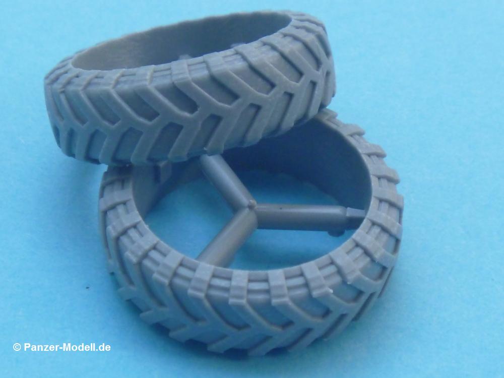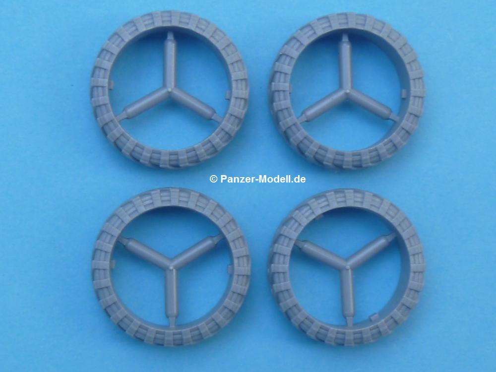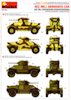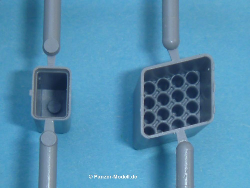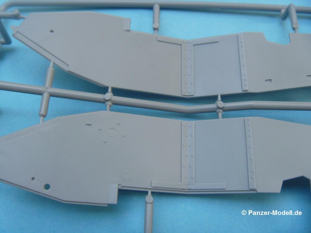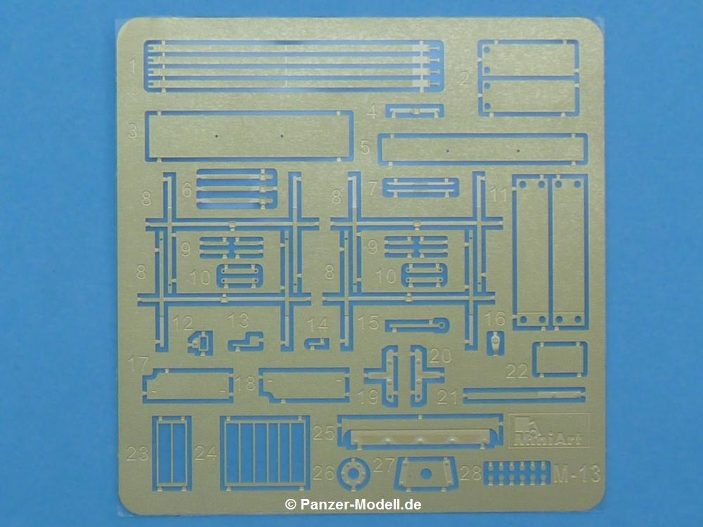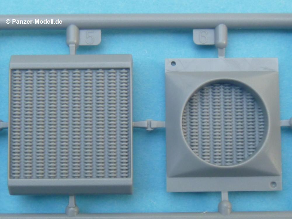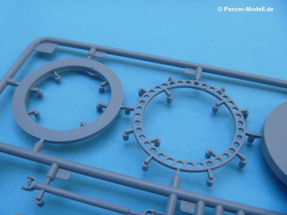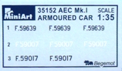 AEC (Associated Equipment Company) stellte 1941 das auf dem Fahrgestell des AEC Matador entwickelten AEC Armoured Car bei einer Parade in London vor. Das Mk.I hatte 3 Mann Besatzung und war mit einem 105 PS (78 kW) starken Diesel Motor ausgestattet, mit dem es ca. 58 km/h erreichen konnte. Die Bewaffnung bestand aus einem Valentine II Turm mit einer QF 2 Pounder (PaK Kaliber 40 mm); zusätzlich ein koaxiales MG. Vom Mk.I wurde 129 Stück hergestellt. Er wurde ab den letzten Monaten des Jahres 1942 hauptsächlich in Nordafrika eingesetzt. Seine Nachfolger Mk.II und Mk.III waren stärker bewaffnet und mit einem 158 PS (118 kW) Dieselmotor ausgestattet. Eine weitere Variante war mit einem Crusader AA Turm zur Flugabwehr ausgerüstet. Als erstes angekündigt, als zweites auf den Markt gekommen. MiniArt bringt uns hier das erste AEC Armoured Car, das Mk.I. Die Unterschiede zum Mk.II sind bereits durch den Valentine Turm mit der QF 2 Pounder PaK und der anderen Fahrzeugfront zu erkennen. Die hellgrauen Spritzlinge füllen den Karton gut aus. Insgesamt sind es 12 hellgraue, 1 klarer und 4 hellgraue Radreifen. Dazu kommt eine Ätzteilplatine, ein sparsamer Abziehbilderbogen (Decals) und eine 16-seitige Bauanleitung im A4 Format. Die Spritzlinge sind wie folgt aufgeteilt: - A (2x): Sandbleche, Kraftstoff- u. Munitionsbehälter, Munition - Ac (1x): Teile für Fahrersitz, Schwenkgetriebe für Turm - Ad (2x): Radfelgen, Blattfedern u. Aufhängungen, Kardangelenke, Flansche - Af (1x): Turmsitz, Halterungen an Motortrennwand - Ae (2x): Munitionsbehälter, Griffe, Feuerlöscher, Seilkauschen, Kleinstteile - B (1x): Kühler, Achsen, Tank, Getriebe - Ba (1x): Motor, Auspuff, Kupplung, Einspritzpumpe, Lenkrad, Bremstrommeln, Achsenden - C (1x): Turmboden, Munitionshalterungen, Außenstaukästen, Kotflügel, Kardanwellen, Motoraufnahme und -schutzrahmen - D (1x): Turm, Kanone, Blende. Funkgerät - Gd (1x): Winkelspiegel, Fahrerschutzscheibe - H (4x): Reifen - PE (1x): Schutzbügel f. Funkgerät, div. Halterungen Der 345x240x80 mm große Karton überrascht mit einer Fülle an Spritzlingen und Teilen, die man vom Anblick des Deckelbildes nicht erwartet. Ein kurzer Blick in die Bauanleitung verrät, dass das meiste im Inneren des Fahrzeugs seinen Platz finden wird. Die Teile aus grauem Plastik sind sauber gespritzt, ohne Verzug und Versatz, kein Grat, keine Fischhäute oder Sinkstellen. Einige wenige Auswerferspuren auf Innenseiten von Teilen, so dass die Spuren beim Zusammenbau verschwinden, ohn das man sie wegschleifen und verspachteln müsste. Aber gehen wir mal die Spritzlinge einzeln durch und schauen genauer hin. Spritzling A (2x): Die Sandbleche mit den Querrippen haben eine für Plastik annehmbare Stärke und kommen der Wirklichkeit recht nahe. Die Kästen für das Turmheck bestehen jeweils aus dem 5-seitigen Kastenkörper und dem passenden Deckel dazu. Gleiches gilt für die typisch britischen Kraftstoffbehälter, nur das hier am Deckel der Ausgußverschluß mit angegossen ist. Griffe sind nicht dran. Diese kommen erst beim Bau von der Ätzteilplatine. Die etwas über 1 mm durchmessende 2-Pfünder Munition ist am Ende mit einem sternförmigen Clip versehen. (Viel Spaß beim Bemalen, wenn man alle 44 Kartuschen verwenden will.) Die Munition ist ohne Kopf, aber dieser wäre nach Einstecken in die Halterungen im Turm sowieso nicht mehr zu sehen. Spritzling Ac (1x): Der Spritzling besteht hauptsächlich aus den 9, teilweise filigranen, Teilen des Fahrersitzes. Das Sitzpolster ist leicht gewellt, um die Kissenstruktur darzustellen. Weiterhin finden wir die 4 komplexen Teile des Turmschwenkgetriebes hier. Mit den Ecken, Winkeln und Nieten haben die Spritzformbauer einen fantastischen Job hingelegt. Die Millimeter großen Scharniere und Beschläge der Fahrerluke, bzw. der kleinen Schutzscheibe werden beim Abtrennen vom Spritzling die volle Aufmerksamkeit brauchen, sonst verschwinden sie mit dem ersten Atemzug im Nirwana. Das Armaturenbrett(chen) hat mal 2 Anzeigen, für die es keine Abziehbilder gibt. Selbst anmalen ist hier die Devise. Spritzling Ad (2x): Ins Auge stechen die Blattfedernpakete. Jede Blattfeder ist sauber zu erkennen. Schön auch die Räder mit ihren unzähligen Radmuttern und den Herstelleraufdrucken und Radgrößen auf den Seiten - DUNLOP - 13-15-20 - Made in England. Dazu kommen Kardangelenke und Deckel, bei denen man scheinbar keine einzige Schraube vergessen hat. Spritzling Ae (2x): Die größten Teile sind die Munitionskästen und die aus einem Stück bestehenden Luftfilter. Der Feuerlöscher mit angegossener Halterung lässt kein Detail vermissen. Achtung: Auch hier Kleinteilalarm! Motorraumklappenverschlüsse kleiner als 1 mm, Außenspiegelhaltestange mit ca. 0,4 mm Durchmesser sind nur einige. Der Tankdeckel mit seinem gewellten Rand ist da schon wieder ein großes Teil. Die Abschleppschäkel sind durchbohrt, damit man später den passenden Bolzen, an dem das Auge für das Sicherungskettchen erkennbar ist, durchstecken kann. Die Seilkauschen haben eine schöne Struktur, nur habe ich in der Bauanleitung keine Verwendung dieser Teile gefunden. Ein Abschleppseil übrigens auch nicht. Spritzling Af (1x): Einer der beiden kleinsten Spritzlinge. Hier finden wir Halterungen für die Motortrennwand, eine Stabilisierungsstange für das Fahrgestell und den Turmsitz. Spritzling B (1x): Der 2-teilige Kühler hat es einem gleich angetan. Beidseitig sind die Kühlrippen dargestellt. Die Achsen bestehen aus einem Teil, auf das nur der Kardandeckel aufgesetzt wird. Also, keine Angst vor Trennnähten, denn es gibt keine. Weitere Teile sind Schaltgestänge, Aufnahmen für die Federpakete, Querlenker und das Allradgetriebe. Spritzling Ba (1x): Die Hauptteile des Motors bestehen aus einem 3-teiligen Motorblock, Ölwanne, Zylinderkopfdeckeln, Einspritzpumpe, Auspuffkrümmer und Anbauteilen. Diesel-, Ölfilter und Kompressor sind weitere Details. Der Hammer - die 6 Einspritzdüsen müssen separat verkle