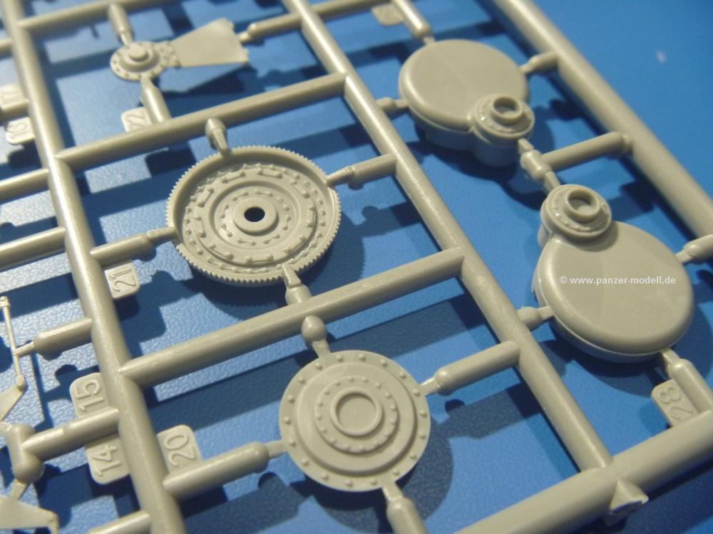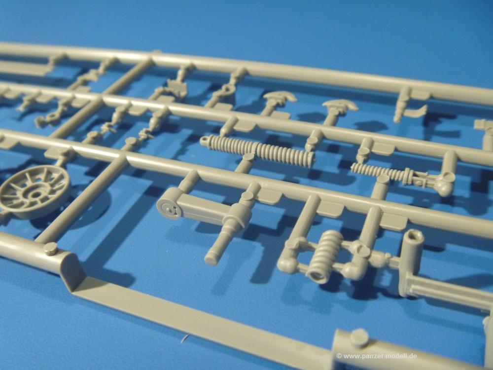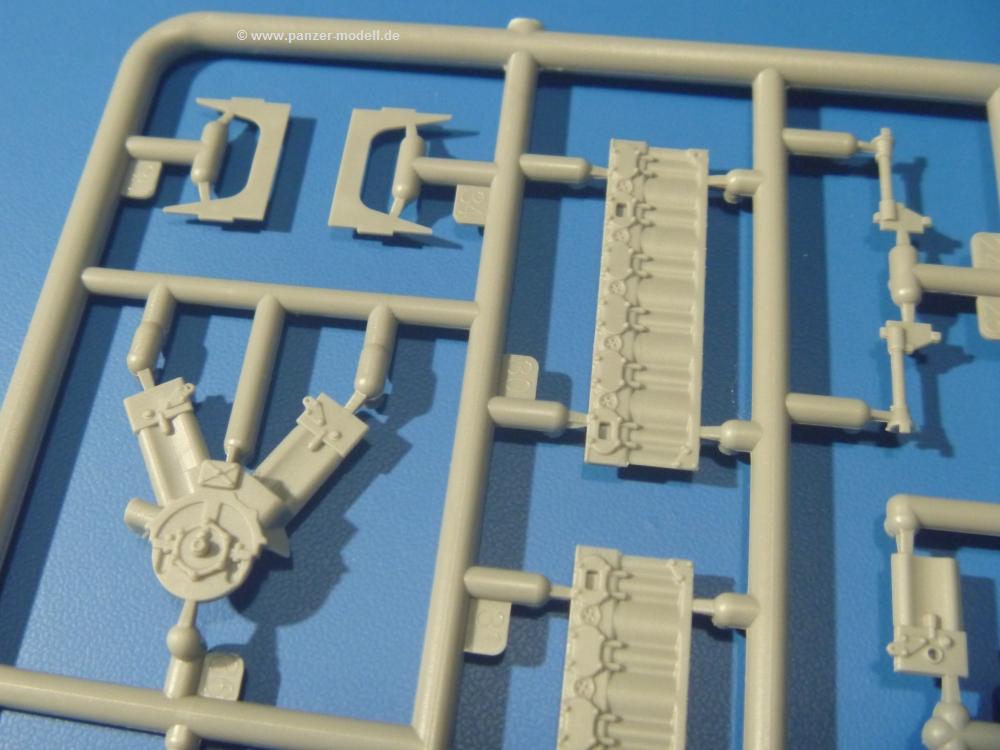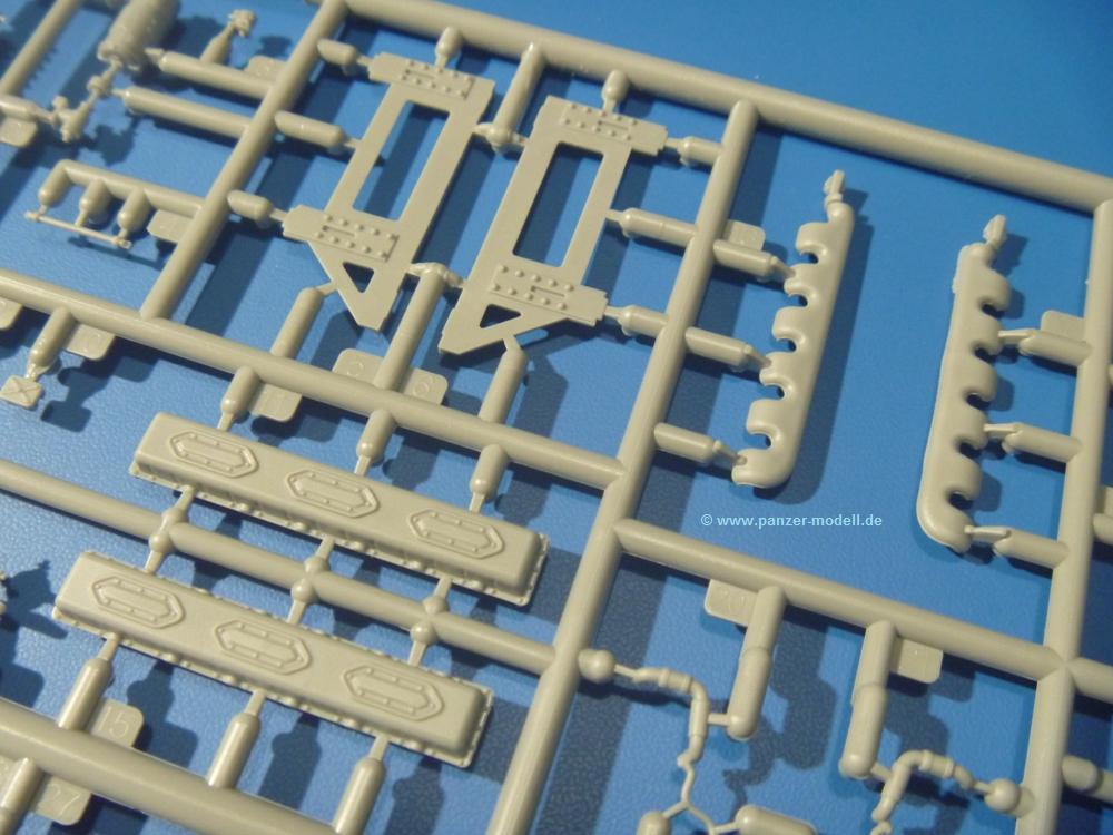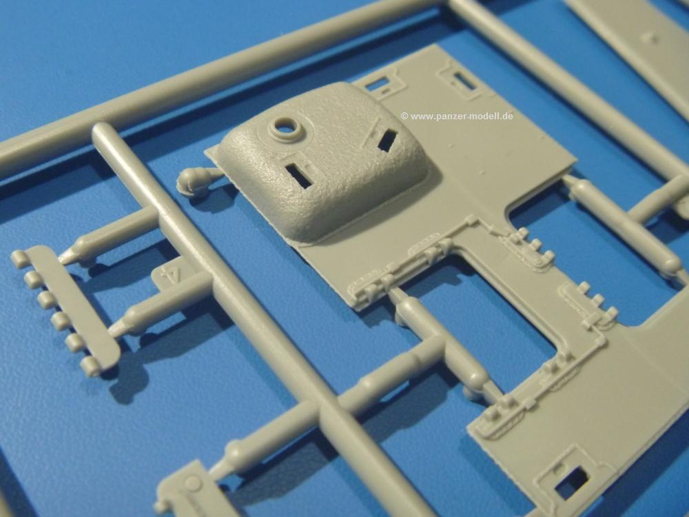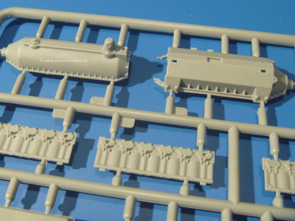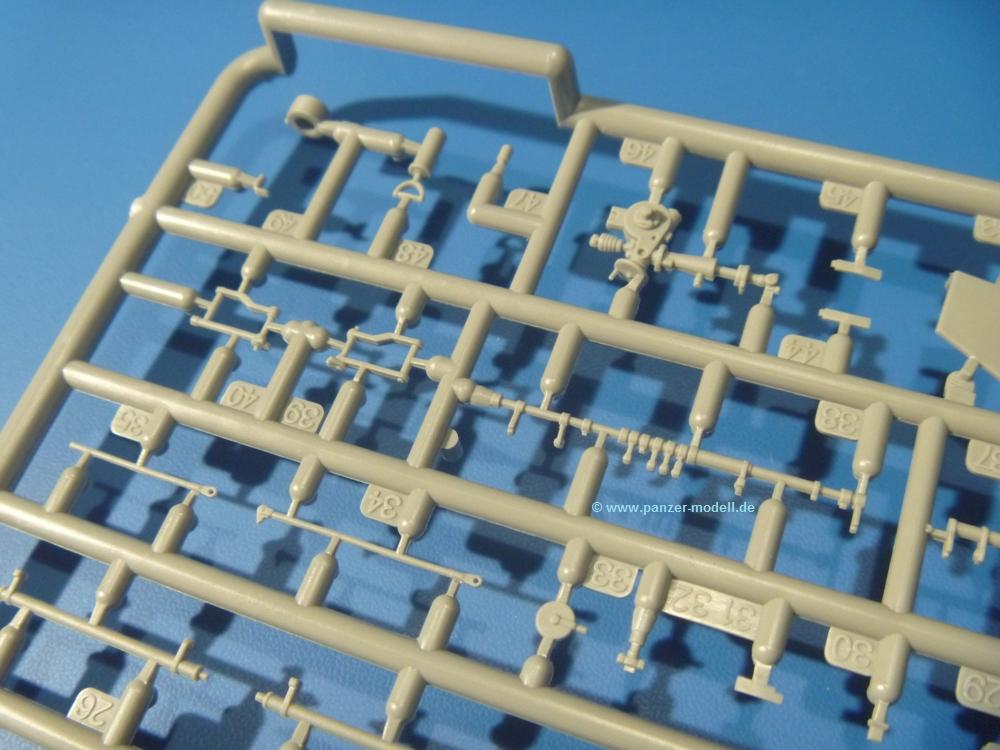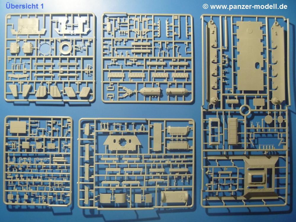 Die Teile aus hellgrauem Plastik sind sauber gespritzt, ohne Verzug und Versatz, hier und da minimaler Grat, keine Fischhäute. Auswerferspuren sind kaum zu sehen und nur auf Innenseiten von Teilen vorhanden, so dass sie beim Zusammenbau verschwinden, ohn das man sie wegschleifen und verspachteln müsste. Viel Vorsicht muss man aufwenden, um manche filigrane Teile wie Gestänge zerstörungsfrei von den Spritzlingen zu lösen.Tja, wie beschreibt man in aller Kürze einen Bausatz, bei dem man sich dermaßen im Detail verlieren kann? Ich habe mich diesmal für ein paar Fotos mehr entschieden und versuche, mich textlich kurz zu fassen.Motor und Getriebe sind im wahrsten Sinne ein Bausatz für sich, so dass es diese mittlerweile auch unter 35205 separat zu kaufen gibt. Lagerböcke, Zylinderköpfe, Zuluft-, Abgaskanäle, Auspuffrohre, Kühlschläuche, Kühler, Lichtmaschine, Einspritzpumpe, Elektromotor für Lüfterad, Lüfterrad, Luftfilter, Steuerstangen, Lenkbremsen - aus meiner Sicht fast alles da bis auf Einspritzleitungen und Verkabelung. Auf dem Wannenboden angegossen findet man vom Fahrerplatz bis zu den Lenkbremsen das entsprechende Gestänge. Die Tanks sind mit Einfüllschrauben versehen und auch die eingepressten Versteifungsrippen sind vorhanden. Schaut man sich die Oberwanne dann mal an, findet man so einige Schraubenlöcher, die dort zu finden sind, wo Motor-, bzw. Kühlerabdeckungen normalerweise angebracht sind. Wenn man also z.B. für eine Wartungsszene die Abdeckungen weglässt, sind die Schraubenlöcher da. Eine absolut realistische Darstellung. Die Zu- und Abluft sind offen. Hier kann man die Windleitbleche entsprechend positioniert einbauen. Den Zuluftdeckel über dem Lüfterrad bekommt man in 2 Varianten. Einmal in Vollplastik mit feiner Gitterstruktur und einmal durchbrochen. In die Öffnung werden dann aus PE-Teilen der Halterahmen und das Gitter eingesetzt. Die große Heckplatte, die auch abgeklappt angebaut werden kann, enthält die Öffnungen für die Auspuffrohre und eine große Wartungsöffnung. Auch hier findet man an den entsprechenden Stellen Schraubenlöcher, wenn man diese Deckel auflassen möchte. An der Innenseite der Heckplatte sind die Verschraubungen der Auspuffpanzerungen vorhanden.Im Kampfraum ist natürlich auch viel los. Der Fahrerplatz ist voll ausgestattet - Sitz, Bedien- und Schalthebel, Pedale, Armaturen. Die Fahrersehklappe bekommt Winkelspiegel aus Klarsichtmaterial. Alle Aussen- und Innendetails inkl. Verriegelungen sind vorhanden. Baut man die Klappe offen, muss man nur das Öffnergestänge entsprechend anbauen. Für die vier verschiedenen Munitionsarten gibt es entsprechende Halterungen. Der Bausatz enthält 60 Patronen, die nicht unbedingt alle verbaut werden müssen, wenn man einen gewissen Verbrauch darstellen möchte. Trommelmagazine für MG/MP mit PE Halterung sind vorhanden, nur die passenden Waffen dazu habe ich nicht gefunden. Dafür gibt es aber eine gehörige Anzahl Nahkampfstopfen, die separat verbaut werden. Optiken wie z.B. Zielfernrohr und Kommandantenoptik sind mit allen Innen- und Aussendetails in Vollplastik vorhanden. Die zahlreichen Winkelspiegel bestehen aus Klarsichtmaterial und werden mit PE-Bügeln weiter detailliert. Auch die vergitterten Innenraumleuchten sind glasklar. Neben der Munition nimmt den meisten Platz die Kanone ein. Verschluss, Verschlussblock, Rohrbremsen, Richtelemente, Richtschützensitz, Zielfernrohr, Hülsenabweiser, -sack, Rohrlager, um nur ein paar Details zu nennen. Die Verschraubung der Kanonenlagerung ist auch auf der Innenseite der Frontplatte wiedergegeben. Das Rohr ist aus einem Stück gegossen und an der Mündung ca. 3mm tief "aufgebohrt". Die Gussstruktur der Blende und Bledenlagerung weiß sehr zu gefallen.Das Fahrgestell beginnt bereits im Inneren mit den Federkästen, in die die schönen Druckfedern eingebaut werden. Alle Schwingarme sind separat ausgeführt. Die Räder sind rumherum detailliert und können drehbar angebaut werden. Die Kettenglieder werden ineinander geklipst und sollten theoretisch auch beweglich bleiben, wenn die feinen Stifte das aushalten. Ein genauer Blick auf die Glieder zeigt uns Gussnummern auf Innen- und Aussenseiten.Die 4 Aussentanks sind sehr fein detailliert. Bei den hinteren beiden hat man die Wahl, ob man die Tankhälften mit angegossenen Halterbändern anbringt, die Tanks weglässt und nur die Haltebänder aus PE-Teilen anbringt oder ob man die Tanks ohne angegossene Halterbänder nimmt und dann mit den PE-Bändern befestigt. Die Griffe an den Enden der Tanks sind aus PE-Material. Die 12 Eisgreifer werden auf den Kettenabdeckungen mittels einer Kombination aus Plastikösen und PE-Bändern befestigt. Gleiches gilt für die eingerollte Plane. Die Plastikösen sind winzig und werden genügend Vorsicht und Geduld fordern. Hupe und Lampe sind an PE Halterungen befestigt. Die Lampe ist innen hohl und mit einem geriffelten Klarsichtglas versehen. Werkzeug wie Schaufel und Säge ist ebenso vorhanden wie die Abschleppseile. Alle Luken lassen sich offen oder geschlossen anbauen und sind entsprechend beidseitig detailliert.Es sind Abziehbilder (Decals) für 2 (eigentlich 3) Varianten dabei.