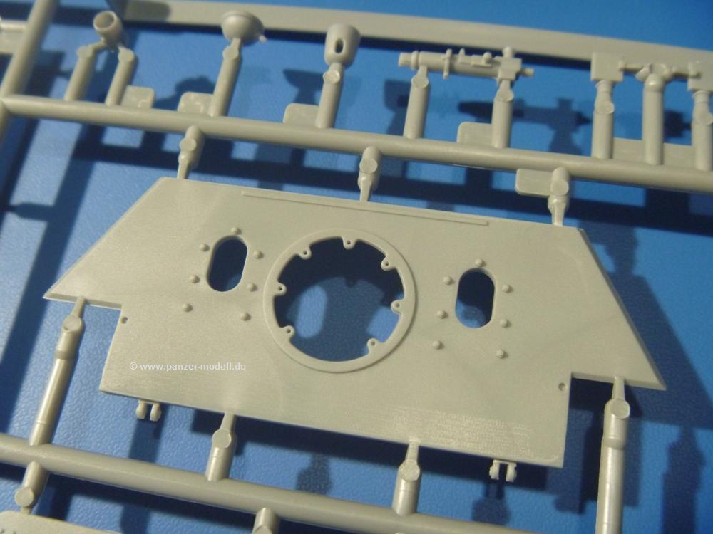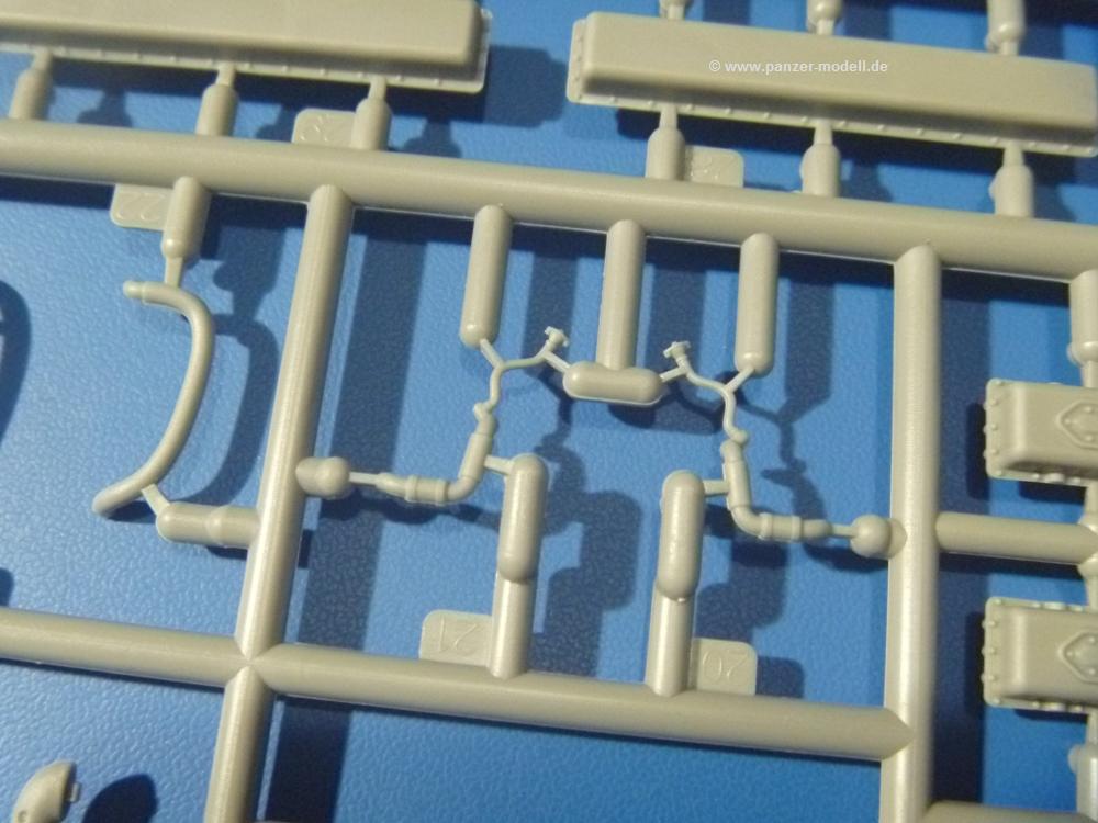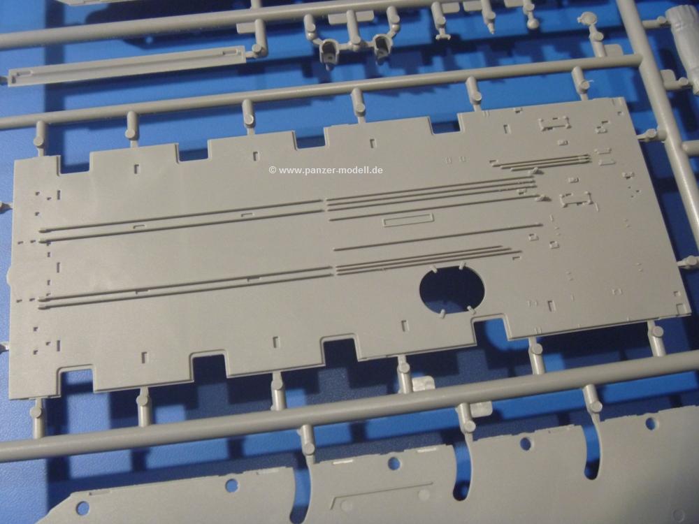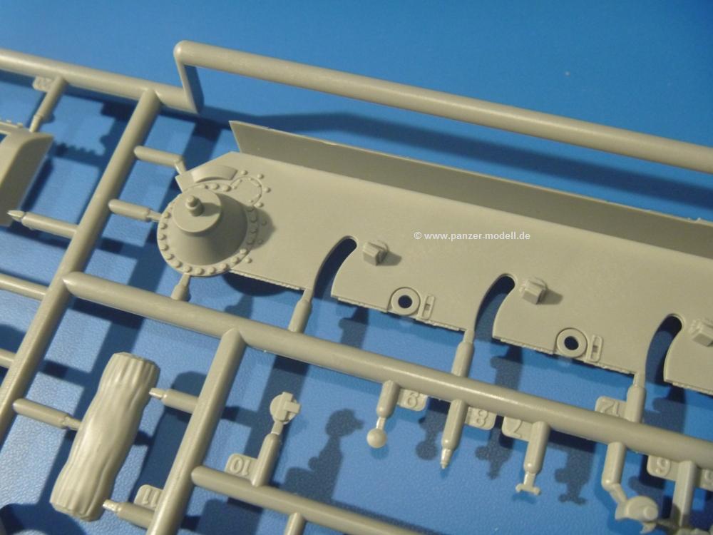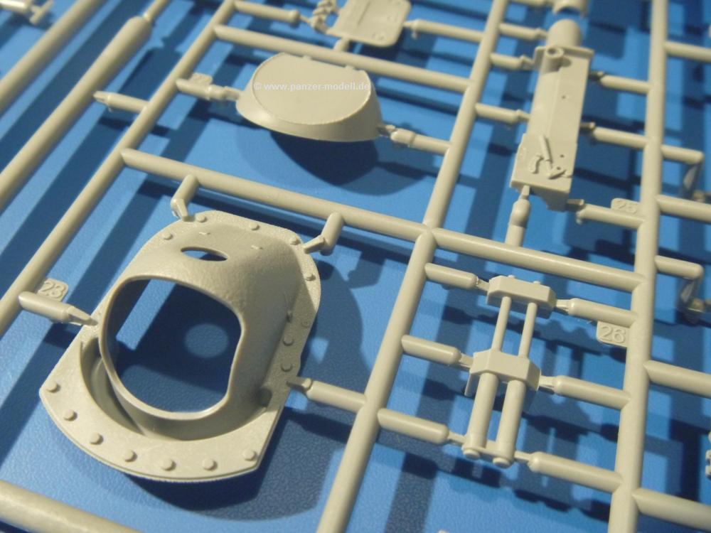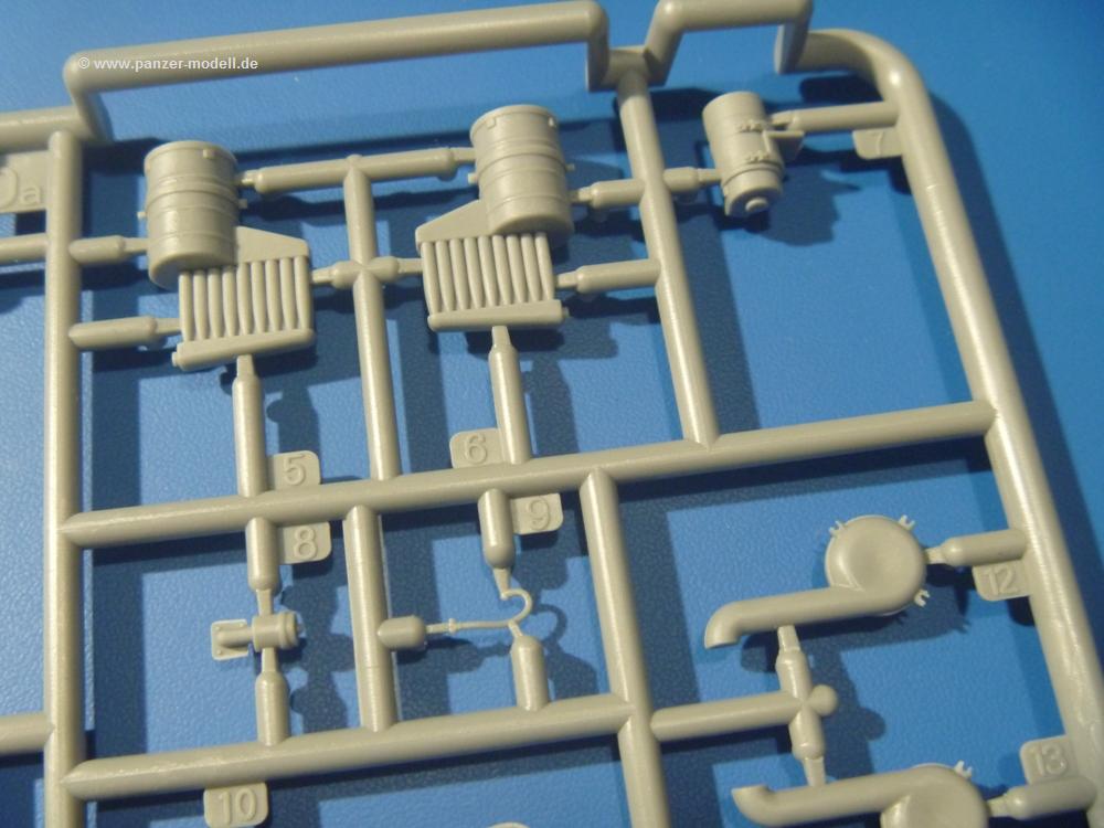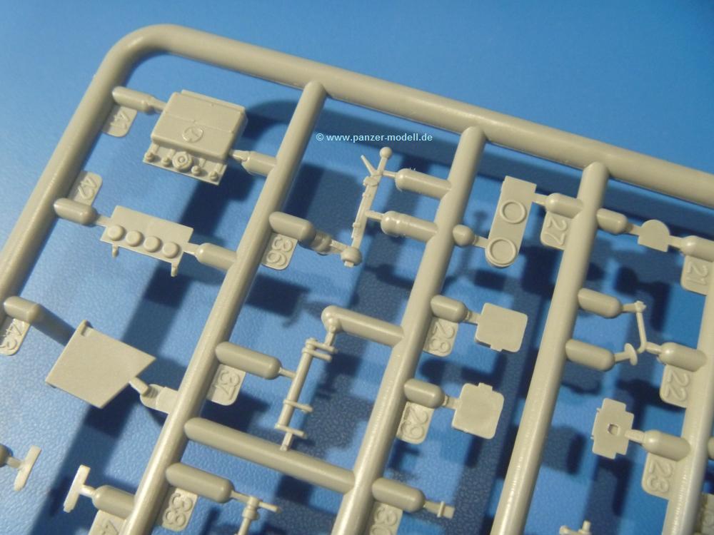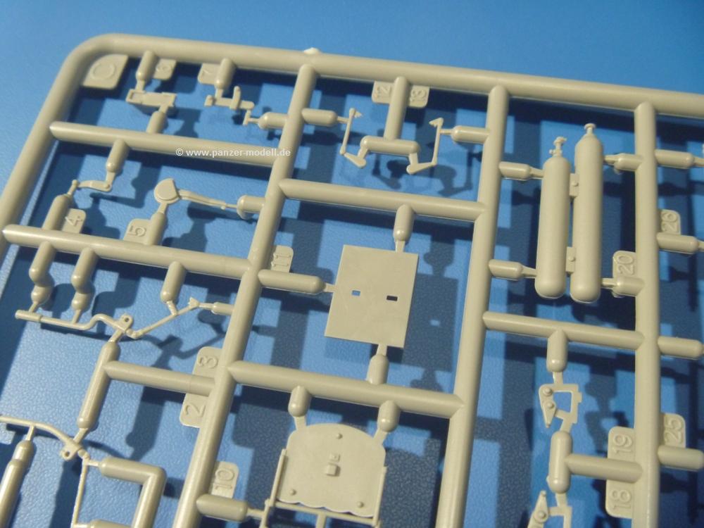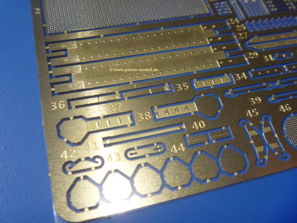 Die Teile aus hellgrauem Plastik sind sauber gespritzt, ohne Verzug und Versatz, hier und da minimaler Grat, keine Fischhäute. Auswerferspuren sind kaum zu sehen und nur auf Innenseiten von Teilen vorhanden, so dass sie beim Zusammenbau verschwinden, ohn das man sie wegschleifen und verspachteln müsste. Viel Vorsicht muss man aufwenden, um manche filigrane Teile wie Gestänge zerstörungsfrei von den Spritzlingen zu lösen.Tja, wie beschreibt man in aller Kürze einen Bausatz, bei dem man sich dermaßen im Detail verlieren kann? Ich habe mich diesmal für ein paar Fotos mehr entschieden und versuche, mich textlich kurz zu fassen.Motor und Getriebe sind im wahrsten Sinne ein Bausatz für sich, so dass es diese mittlerweile auch unter 35205 separat zu kaufen gibt. Lagerböcke, Zylinderköpfe, Zuluft-, Abgaskanäle, Auspuffrohre, Kühlschläuche, Kühler, Lichtmaschine, Einspritzpumpe, Elektromotor für Lüfterad, Lüfterrad, Luftfilter, Steuerstangen, Lenkbremsen - aus meiner Sicht fast alles da bis auf Einspritzleitungen und Verkabelung. Auf dem Wannenboden angegossen findet man vom Fahrerplatz bis zu den Lenkbremsen das entsprechende Gestänge. Die Tanks sind mit Einfüllschrauben versehen und auch die eingepressten Versteifungsrippen sind vorhanden. Schaut man sich die Oberwanne dann mal an, findet man so einige Schraubenlöcher, die dort zu finden sind, wo Motor-, bzw. Kühlerabdeckungen normalerweise angebracht sind. Wenn man also z.B. für eine Wartungsszene die Abdeckungen weglässt, sind die Schraubenlöcher da. Eine absolut realistische Darstellung. Die Zu- und Abluft sind offen. Hier kann man die Windleitbleche entsprechend positioniert einbauen. Den Zuluftdeckel über dem Lüfterrad bekommt man in 2 Varianten. Einmal in Vollplastik mit feiner Gitterstruktur und einmal durchbrochen. In die Öffnung werden dann aus PE-Teilen der Halterahmen und das Gitter eingesetzt. Die große Heckplatte, die auch abgeklappt angebaut werden kann, enthält die Öffnungen für die Auspuffrohre und eine große Wartungsöffnung. Auch hier findet man an den entsprechenden Stellen Schraubenlöcher, wenn man diese Deckel auflassen möchte. An der Innenseite der Heckplatte sind die Verschraubungen der Auspuffpanzerungen vorhanden.Im Kampfraum ist natürlich auch viel los. Der Fahrerplatz ist voll ausgestattet - Sitz, Bedien- und Schalthebel, Pedale, Armaturen. Die Fahrersehklappe bekommt Winkelspiegel aus Klarsichtmaterial. Alle Aussen- und Innendetails inkl. Verriegelungen sind vorhanden. Baut man die Klappe offen, muss man nur das Öffnergestänge entsprechend anbauen. Für die vier verschiedenen Munitionsarten gibt es entsprechende Halterungen. Der Bausatz enthält 60 Patronen, die nicht unbedingt alle verbaut werden müssen, wenn man einen gewissen Verbrauch darstellen möchte. Trommelmagazine für MG/MP mit PE Halterung sind vorhanden, nur die passenden Waffen dazu habe ich nicht gefunden. Dafür gibt es aber eine gehörige Anzahl Nahkampfstopfen, die separat verbaut werden. Optiken wie z.B. Zielfernrohr und Kommandantenoptik sind mit allen Innen- und Aussendetails in Vollplastik vorhanden. Die zahlreichen Winkelspiegel bestehen aus Klarsichtmaterial und werden mit PE-Bügeln weiter detailliert. Auch die vergitterten Innenraumleuchten sind glasklar. Neben der Munition nimmt den meisten Platz die Kanone ein. Verschluss, Verschlussblock, Rohrbremsen, Richtelemente, Richtschützensitz, Zielfernrohr, Hülsenabweiser, -sack, Rohrlager, um nur ein paar Details zu nennen. Die Verschraubung der Kanonenlagerung ist auch auf der Innenseite der Frontplatte wiedergegeben. Das Rohr ist aus einem Stück gegossen und an der Mündung ca. 3mm tief "aufgebohrt". Die Gussstruktur der Blende und Bledenlagerung weiß sehr zu gefallen.Das Fahrgestell beginnt bereits im Inneren mit den Federkästen, in die die schönen Druckfedern eingebaut werden. Alle Schwingarme sind separat ausgeführt. Die Räder sind rumherum detailliert und können drehbar angebaut werden. Die Kettenglieder werden ineinander geklipst und sollten theoretisch auch beweglich bleiben, wenn die feinen Stifte das aushalten. Ein genauer Blick auf die Glieder zeigt uns Gussnummern auf Innen- und Aussenseiten.Die 4 Aussentanks sind sehr fein detailliert. Bei den hinteren beiden hat man die Wahl, ob man die Tankhälften mit angegossenen Halterbändern anbringt, die Tanks weglässt und nur die Haltebänder aus PE-Teilen anbringt oder ob man die Tanks ohne angegossene Halterbänder nimmt und dann mit den PE-Bändern befestigt. Die Griffe an den Enden der Tanks sind aus PE-Material. Die 12 Eisgreifer werden auf den Kettenabdeckungen mittels einer Kombination aus Plastikösen und PE-Bändern befestigt. Gleiches gilt für die eingerollte Plane. Die Plastikösen sind winzig und werden genügend Vorsicht und Geduld fordern. Hupe und Lampe sind an PE Halterungen befestigt. Die Lampe ist innen hohl und mit einem geriffelten Klarsichtglas versehen. Werkzeug wie Schaufel und Säge ist ebenso vorhanden wie die Abschleppseile. Alle Luken lassen sich offen oder geschlossen anbauen und sind entsprechend beidseitig detailliert.Es sind Abziehbilder (Decals) für 2 (eigentlich 3) Varianten dabei.