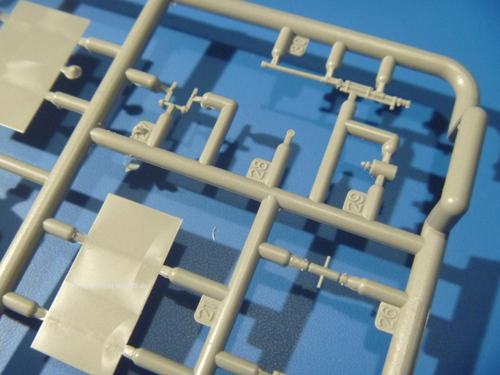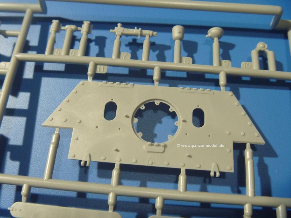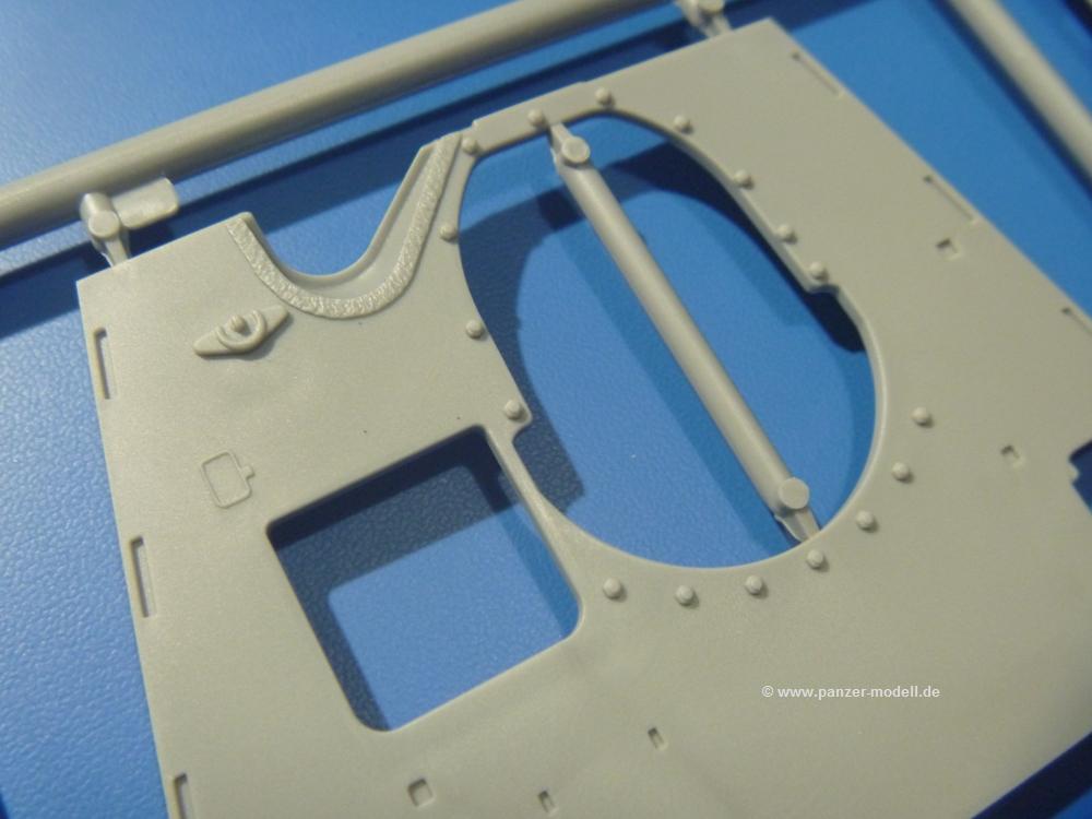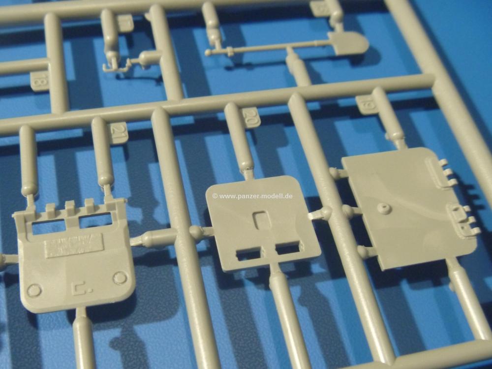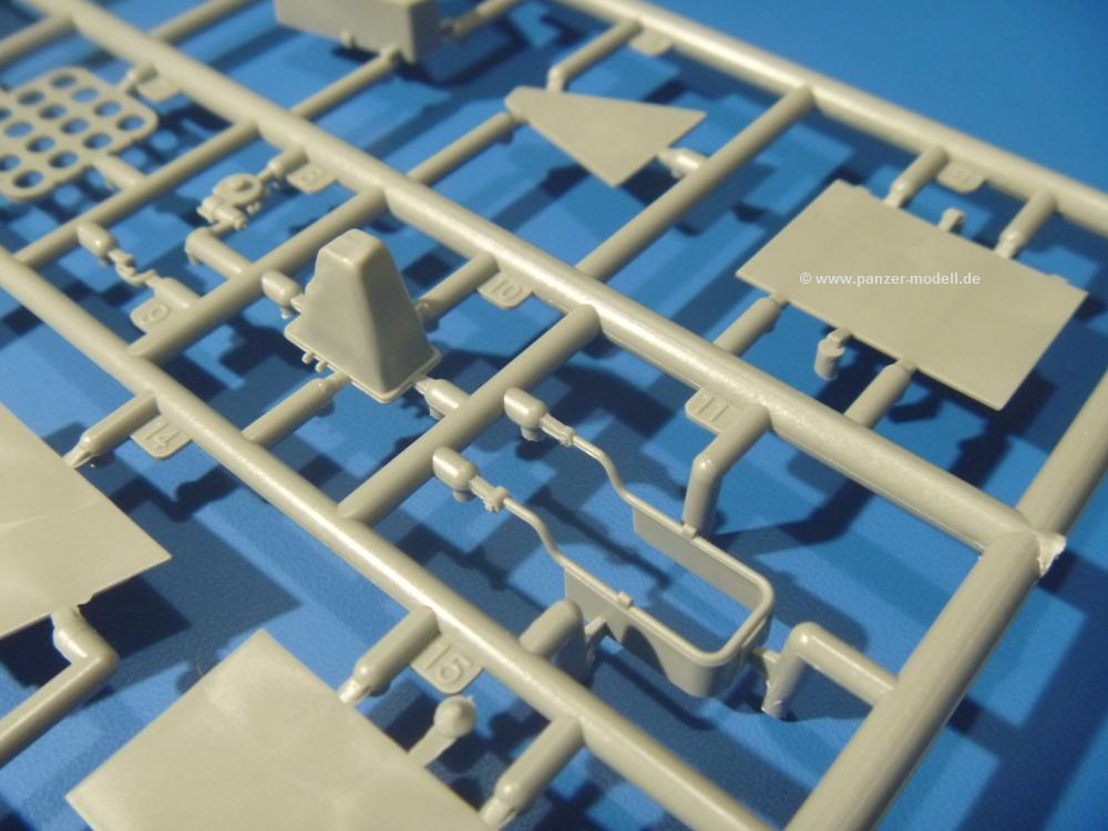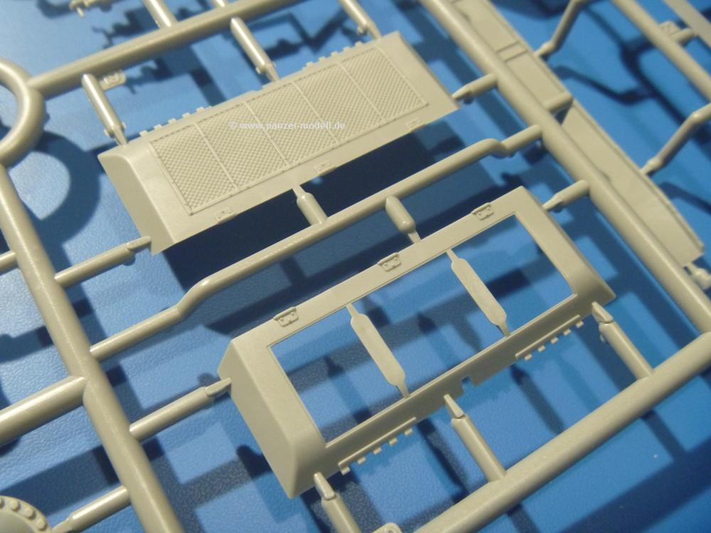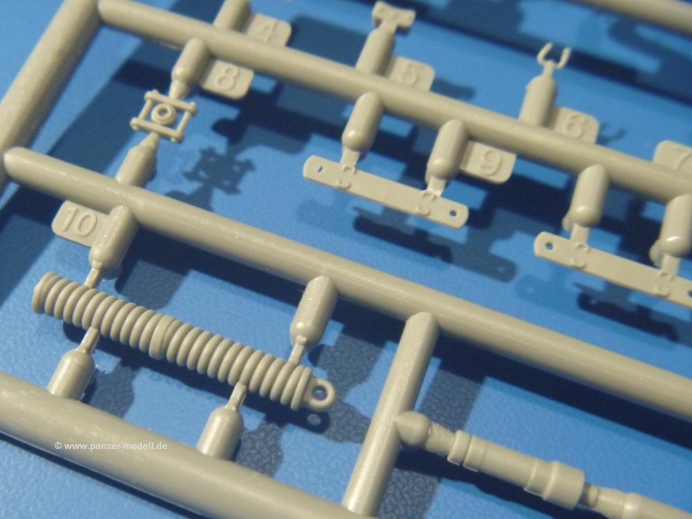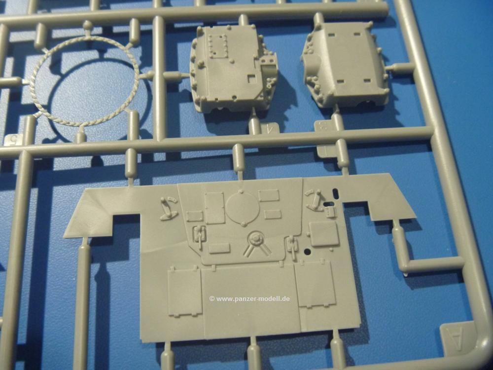 Die Teile aus hellgrauem Plastik sind sauber gespritzt, ohne Verzug und Versatz, hier und da minimaler Grat, keine Fischhäute. Auswerferspuren sind kaum zu sehen und nur auf Innenseiten von Teilen vorhanden, so dass sie beim Zusammenbau verschwinden, ohn das man sie wegschleifen und verspachteln müsste. Viel Vorsicht muss man aufwenden, um manche filigrane Teile wie Gestänge zerstörungsfrei von den Spritzlingen zu lösen.Tja, wie beschreibt man in aller Kürze einen Bausatz, bei dem man sich dermaßen im Detail verlieren kann? Ich habe mich diesmal für ein paar Fotos mehr entschieden und versuche, mich textlich kurz zu fassen.Motor und Getriebe sind im wahrsten Sinne ein Bausatz für sich, so dass es diese mittlerweile auch unter 35205 separat zu kaufen gibt. Lagerböcke, Zylinderköpfe, Zuluft-, Abgaskanäle, Auspuffrohre, Kühlschläuche, Kühler, Lichtmaschine, Einspritzpumpe, Elektromotor für Lüfterad, Lüfterrad, Luftfilter, Steuerstangen, Lenkbremsen - aus meiner Sicht fast alles da bis auf Einspritzleitungen und Verkabelung. Auf dem Wannenboden angegossen findet man vom Fahrerplatz bis zu den Lenkbremsen das entsprechende Gestänge. Die Tanks sind mit Einfüllschrauben versehen und auch die eingepressten Versteifungsrippen sind vorhanden. Schaut man sich die Oberwanne dann mal an, findet man so einige Schraubenlöcher, die dort zu finden sind, wo Motor-, bzw. Kühlerabdeckungen normalerweise angebracht sind. Wenn man also z.B. für eine Wartungsszene die Abdeckungen weglässt, sind die Schraubenlöcher da. Eine absolut realistische Darstellung. Die Zu- und Abluft sind offen. Hier kann man die Windleitbleche entsprechend positioniert einbauen. Den Zuluftdeckel über dem Lüfterrad bekommt man in 2 Varianten. Einmal in Vollplastik mit feiner Gitterstruktur und einmal durchbrochen. In die Öffnung werden dann aus PE-Teilen der Halterahmen und das Gitter eingesetzt. Die große Heckplatte, die auch abgeklappt angebaut werden kann, enthält die Öffnungen für die Auspuffrohre und eine große Wartungsöffnung. Auch hier findet man an den entsprechenden Stellen Schraubenlöcher, wenn man diese Deckel auflassen möchte. An der Innenseite der Heckplatte sind die Verschraubungen der Auspuffpanzerungen vorhanden.Im Kampfraum ist natürlich auch viel los. Der Fahrerplatz ist voll ausgestattet - Sitz, Bedien- und Schalthebel, Pedale, Armaturen. Die Fahrersehklappe bekommt Winkelspiegel aus Klarsichtmaterial. Alle Aussen- und Innendetails inkl. Verriegelungen sind vorhanden. Baut man die Klappe offen, muss man nur das Öffnergestänge entsprechend anbauen. Für die vier verschiedenen Munitionsarten gibt es entsprechende Halterungen. Der Bausatz enthält 60 Patronen, die nicht unbedingt alle verbaut werden müssen, wenn man einen gewissen Verbrauch darstellen möchte. Trommelmagazine für MG/MP mit PE Halterung sind vorhanden, nur die passenden Waffen dazu habe ich nicht gefunden. Dafür gibt es aber eine gehörige Anzahl Nahkampfstopfen, die separat verbaut werden. Optiken wie z.B. Zielfernrohr und Kommandantenoptik sind mit allen Innen- und Aussendetails in Vollplastik vorhanden. Die zahlreichen Winkelspiegel bestehen aus Klarsichtmaterial und werden mit PE-Bügeln weiter detailliert. Auch die vergitterten Innenraumleuchten sind glasklar. Neben der Munition nimmt den meisten Platz die Kanone ein. Verschluss, Verschlussblock, Rohrbremsen, Richtelemente, Richtschützensitz, Zielfernrohr, Hülsenabweiser, -sack, Rohrlager, um nur ein paar Details zu nennen. Die Verschraubung der Kanonenlagerung ist auch auf der Innenseite der Frontplatte wiedergegeben. Das Rohr ist aus einem Stück gegossen und an der Mündung ca. 3mm tief "aufgebohrt". Die Gussstruktur der Blende und Bledenlagerung weiß sehr zu gefallen.Das Fahrgestell beginnt bereits im Inneren mit den Federkästen, in die die schönen Druckfedern eingebaut werden. Alle Schwingarme sind separat ausgeführt. Die Räder sind rumherum detailliert und können drehbar angebaut werden. Die Kettenglieder werden ineinander geklipst und sollten theoretisch auch beweglich bleiben, wenn die feinen Stifte das aushalten. Ein genauer Blick auf die Glieder zeigt uns Gussnummern auf Innen- und Aussenseiten.Die 4 Aussentanks sind sehr fein detailliert. Bei den hinteren beiden hat man die Wahl, ob man die Tankhälften mit angegossenen Halterbändern anbringt, die Tanks weglässt und nur die Haltebänder aus PE-Teilen anbringt oder ob man die Tanks ohne angegossene Halterbänder nimmt und dann mit den PE-Bändern befestigt. Die Griffe an den Enden der Tanks sind aus PE-Material. Die 12 Eisgreifer werden auf den Kettenabdeckungen mittels einer Kombination aus Plastikösen und PE-Bändern befestigt. Gleiches gilt für die eingerollte Plane. Die Plastikösen sind winzig und werden genügend Vorsicht und Geduld fordern. Hupe und Lampe sind an PE Halterungen befestigt. Die Lampe ist innen hohl und mit einem geriffelten Klarsichtglas versehen. Werkzeug wie Schaufel und Säge ist ebenso vorhanden wie die Abschleppseile. Alle Luken lassen sich offen oder geschlossen anbauen und sind entsprechend beidseitig detailliert.Es sind Abziehbilder (Decals) für 2 (eigentlich 3) Varianten dabei.