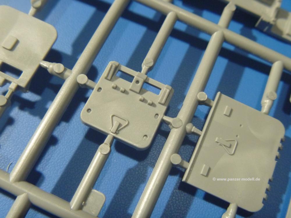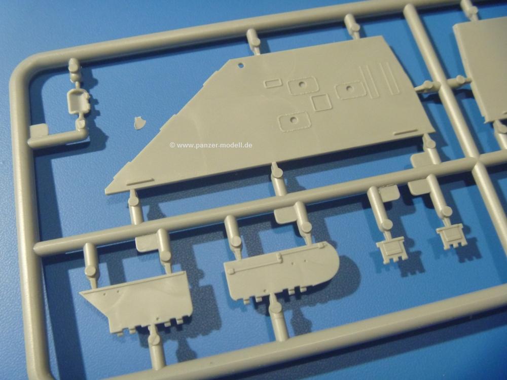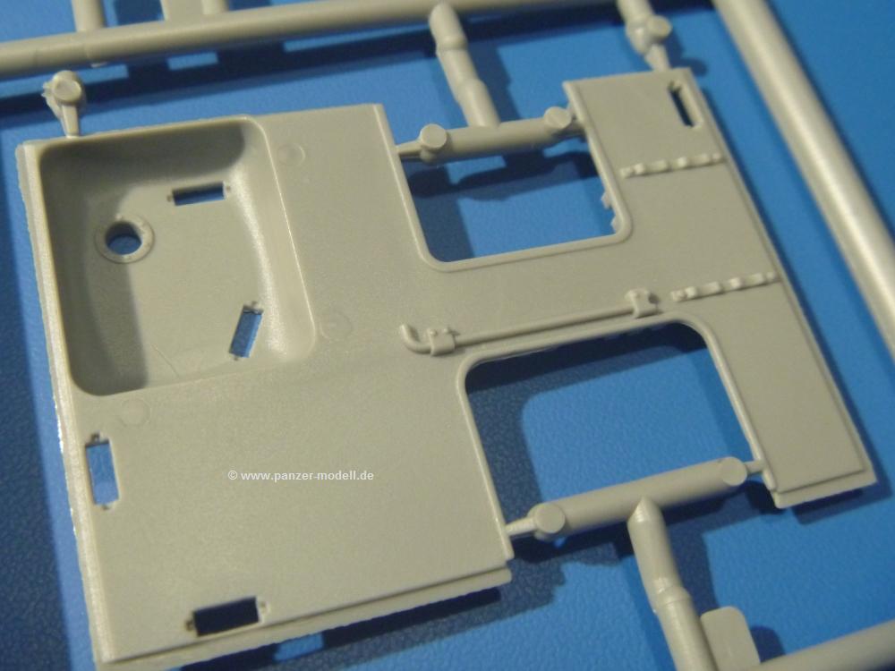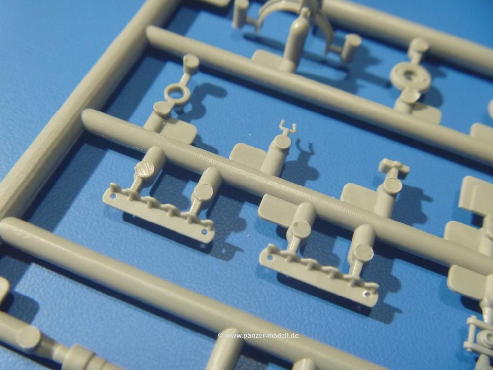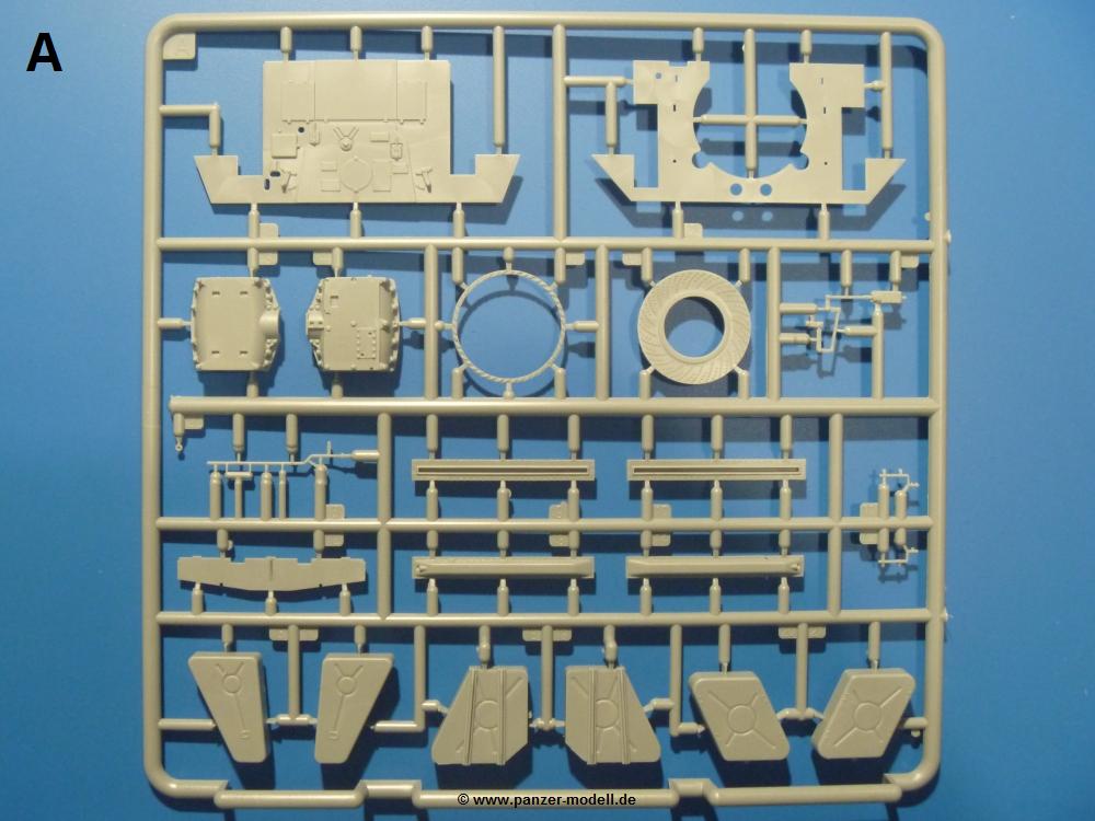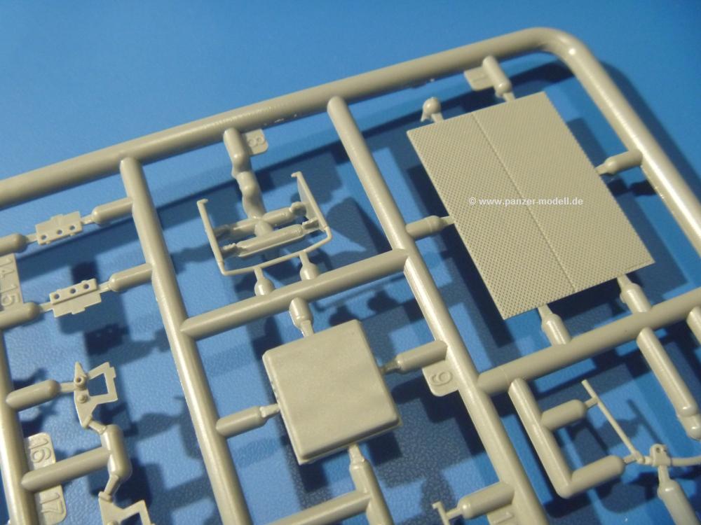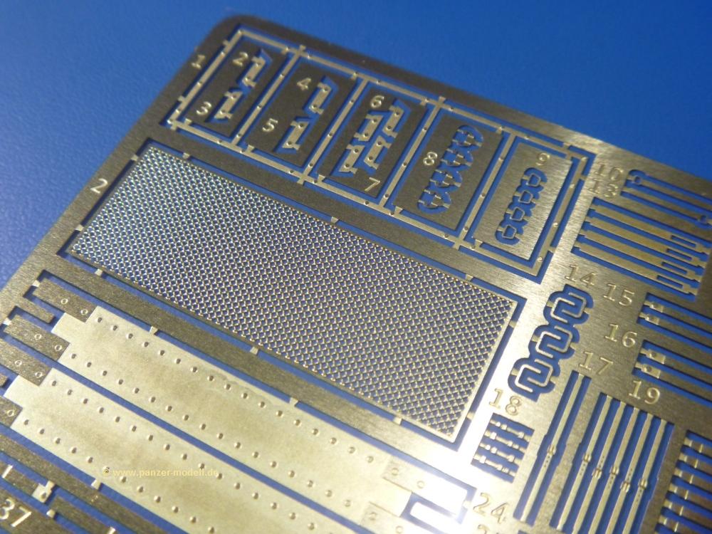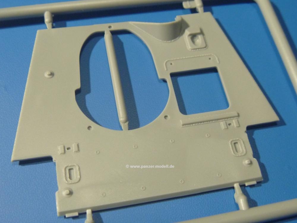 Die Teile aus hellgrauem Plastik sind sauber gespritzt, ohne Verzug und Versatz, hier und da minimaler Grat, keine Fischhäute. Auswerferspuren sind kaum zu sehen und nur auf Innenseiten von Teilen vorhanden, so dass sie beim Zusammenbau verschwinden, ohn das man sie wegschleifen und verspachteln müsste. Viel Vorsicht muss man aufwenden, um manche filigrane Teile wie Gestänge zerstörungsfrei von den Spritzlingen zu lösen.Tja, wie beschreibt man in aller Kürze einen Bausatz, bei dem man sich dermaßen im Detail verlieren kann? Ich habe mich diesmal für ein paar Fotos mehr entschieden und versuche, mich textlich kurz zu fassen.Motor und Getriebe sind im wahrsten Sinne ein Bausatz für sich, so dass es diese mittlerweile auch unter 35205 separat zu kaufen gibt. Lagerböcke, Zylinderköpfe, Zuluft-, Abgaskanäle, Auspuffrohre, Kühlschläuche, Kühler, Lichtmaschine, Einspritzpumpe, Elektromotor für Lüfterad, Lüfterrad, Luftfilter, Steuerstangen, Lenkbremsen - aus meiner Sicht fast alles da bis auf Einspritzleitungen und Verkabelung. Auf dem Wannenboden angegossen findet man vom Fahrerplatz bis zu den Lenkbremsen das entsprechende Gestänge. Die Tanks sind mit Einfüllschrauben versehen und auch die eingepressten Versteifungsrippen sind vorhanden. Schaut man sich die Oberwanne dann mal an, findet man so einige Schraubenlöcher, die dort zu finden sind, wo Motor-, bzw. Kühlerabdeckungen normalerweise angebracht sind. Wenn man also z.B. für eine Wartungsszene die Abdeckungen weglässt, sind die Schraubenlöcher da. Eine absolut realistische Darstellung. Die Zu- und Abluft sind offen. Hier kann man die Windleitbleche entsprechend positioniert einbauen. Den Zuluftdeckel über dem Lüfterrad bekommt man in 2 Varianten. Einmal in Vollplastik mit feiner Gitterstruktur und einmal durchbrochen. In die Öffnung werden dann aus PE-Teilen der Halterahmen und das Gitter eingesetzt. Die große Heckplatte, die auch abgeklappt angebaut werden kann, enthält die Öffnungen für die Auspuffrohre und eine große Wartungsöffnung. Auch hier findet man an den entsprechenden Stellen Schraubenlöcher, wenn man diese Deckel auflassen möchte. An der Innenseite der Heckplatte sind die Verschraubungen der Auspuffpanzerungen vorhanden.Im Kampfraum ist natürlich auch viel los. Der Fahrerplatz ist voll ausgestattet - Sitz, Bedien- und Schalthebel, Pedale, Armaturen. Die Fahrersehklappe bekommt Winkelspiegel aus Klarsichtmaterial. Alle Aussen- und Innendetails inkl. Verriegelungen sind vorhanden. Baut man die Klappe offen, muss man nur das Öffnergestänge entsprechend anbauen. Für die vier verschiedenen Munitionsarten gibt es entsprechende Halterungen. Der Bausatz enthält 60 Patronen, die nicht unbedingt alle verbaut werden müssen, wenn man einen gewissen Verbrauch darstellen möchte. Trommelmagazine für MG/MP mit PE Halterung sind vorhanden, nur die passenden Waffen dazu habe ich nicht gefunden. Dafür gibt es aber eine gehörige Anzahl Nahkampfstopfen, die separat verbaut werden. Optiken wie z.B. Zielfernrohr und Kommandantenoptik sind mit allen Innen- und Aussendetails in Vollplastik vorhanden. Die zahlreichen Winkelspiegel bestehen aus Klarsichtmaterial und werden mit PE-Bügeln weiter detailliert. Auch die vergitterten Innenraumleuchten sind glasklar. Neben der Munition nimmt den meisten Platz die Kanone ein. Verschluss, Verschlussblock, Rohrbremsen, Richtelemente, Richtschützensitz, Zielfernrohr, Hülsenabweiser, -sack, Rohrlager, um nur ein paar Details zu nennen. Die Verschraubung der Kanonenlagerung ist auch auf der Innenseite der Frontplatte wiedergegeben. Das Rohr ist aus einem Stück gegossen und an der Mündung ca. 3mm tief "aufgebohrt". Die Gussstruktur der Blende und Bledenlagerung weiß sehr zu gefallen.Das Fahrgestell beginnt bereits im Inneren mit den Federkästen, in die die schönen Druckfedern eingebaut werden. Alle Schwingarme sind separat ausgeführt. Die Räder sind rumherum detailliert und können drehbar angebaut werden. Die Kettenglieder werden ineinander geklipst und sollten theoretisch auch beweglich bleiben, wenn die feinen Stifte das aushalten. Ein genauer Blick auf die Glieder zeigt uns Gussnummern auf Innen- und Aussenseiten.Die 4 Aussentanks sind sehr fein detailliert. Bei den hinteren beiden hat man die Wahl, ob man die Tankhälften mit angegossenen Halterbändern anbringt, die Tanks weglässt und nur die Haltebänder aus PE-Teilen anbringt oder ob man die Tanks ohne angegossene Halterbänder nimmt und dann mit den PE-Bändern befestigt. Die Griffe an den Enden der Tanks sind aus PE-Material. Die 12 Eisgreifer werden auf den Kettenabdeckungen mittels einer Kombination aus Plastikösen und PE-Bändern befestigt. Gleiches gilt für die eingerollte Plane. Die Plastikösen sind winzig und werden genügend Vorsicht und Geduld fordern. Hupe und Lampe sind an PE Halterungen befestigt. Die Lampe ist innen hohl und mit einem geriffelten Klarsichtglas versehen. Werkzeug wie Schaufel und Säge ist ebenso vorhanden wie die Abschleppseile. Alle Luken lassen sich offen oder geschlossen anbauen und sind entsprechend beidseitig detailliert.Es sind Abziehbilder (Decals) für 2 (eigentlich 3) Varianten dabei.