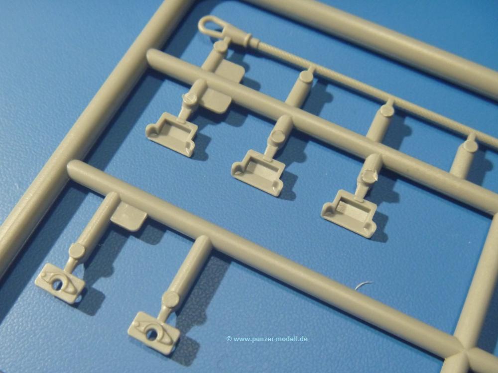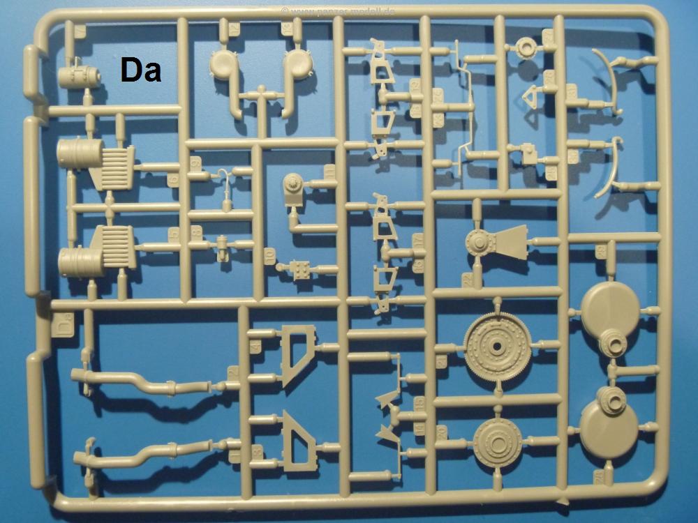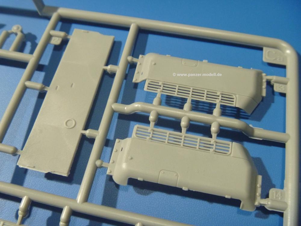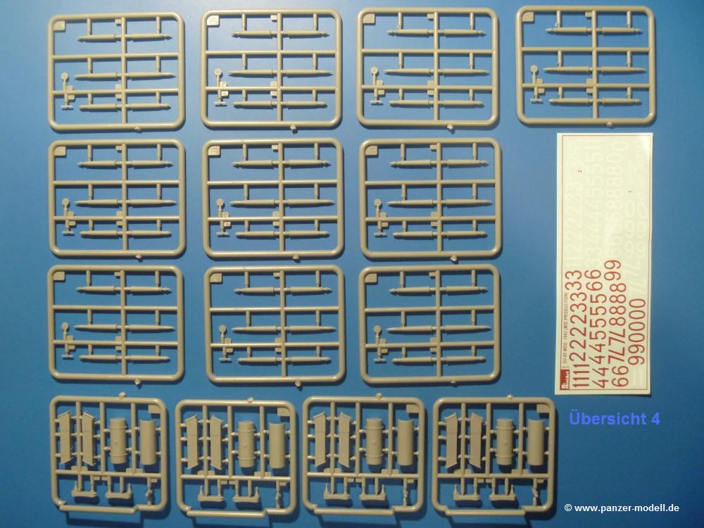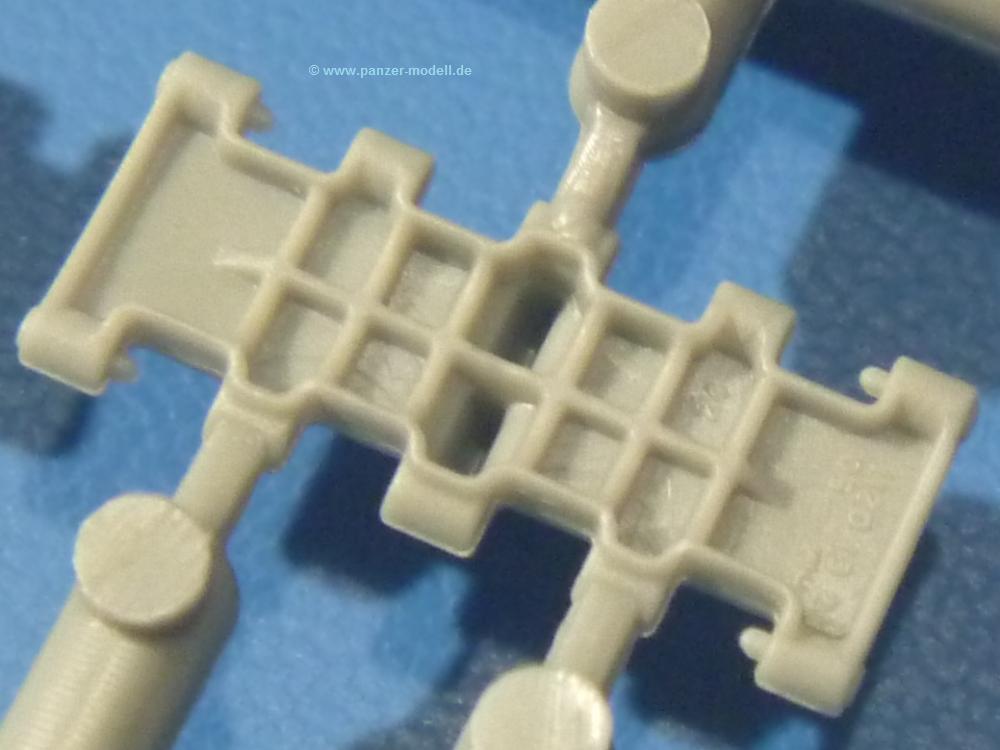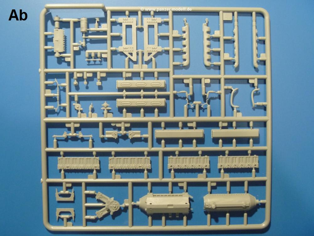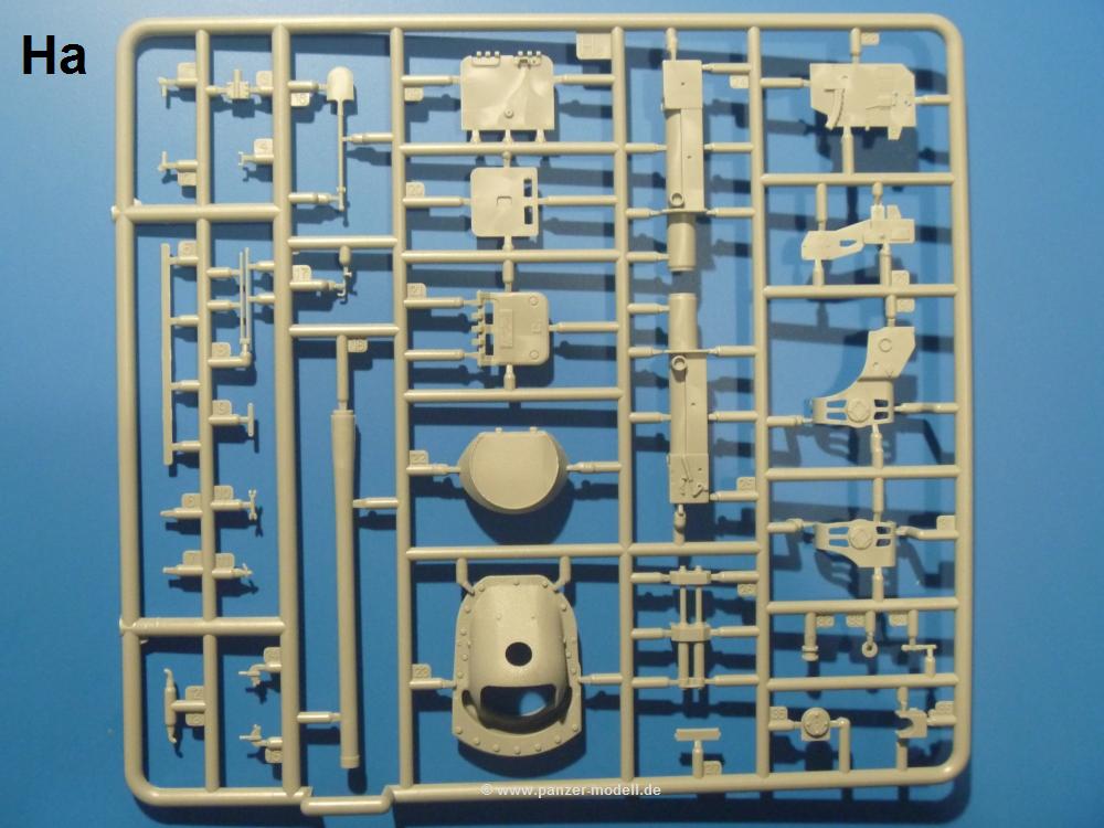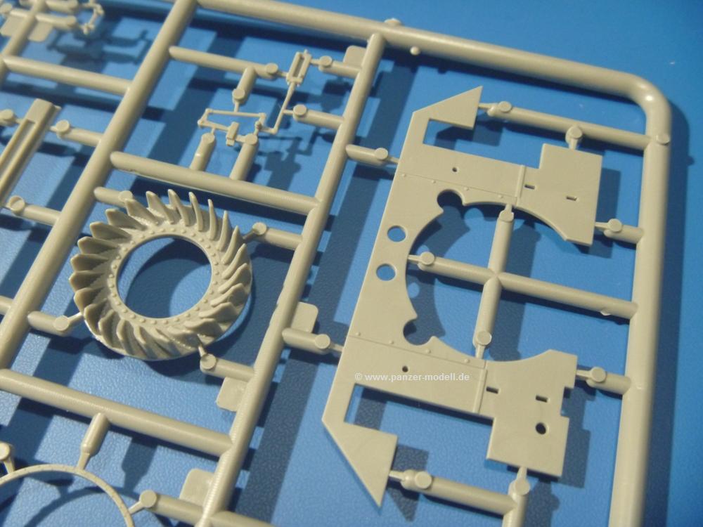 Die Teile aus hellgrauem Plastik sind sauber gespritzt, ohne Verzug und Versatz, hier und da minimaler Grat, keine Fischhäute. Auswerferspuren sind kaum zu sehen und nur auf Innenseiten von Teilen vorhanden, so dass sie beim Zusammenbau verschwinden, ohn das man sie wegschleifen und verspachteln müsste. Viel Vorsicht muss man aufwenden, um manche filigrane Teile wie Gestänge zerstörungsfrei von den Spritzlingen zu lösen.Tja, wie beschreibt man in aller Kürze einen Bausatz, bei dem man sich dermaßen im Detail verlieren kann? Ich habe mich diesmal für ein paar Fotos mehr entschieden und versuche, mich textlich kurz zu fassen.Motor und Getriebe sind im wahrsten Sinne ein Bausatz für sich, so dass es diese mittlerweile auch unter 35205 separat zu kaufen gibt. Lagerböcke, Zylinderköpfe, Zuluft-, Abgaskanäle, Auspuffrohre, Kühlschläuche, Kühler, Lichtmaschine, Einspritzpumpe, Elektromotor für Lüfterad, Lüfterrad, Luftfilter, Steuerstangen, Lenkbremsen - aus meiner Sicht fast alles da bis auf Einspritzleitungen und Verkabelung. Auf dem Wannenboden angegossen findet man vom Fahrerplatz bis zu den Lenkbremsen das entsprechende Gestänge. Die Tanks sind mit Einfüllschrauben versehen und auch die eingepressten Versteifungsrippen sind vorhanden. Schaut man sich die Oberwanne dann mal an, findet man so einige Schraubenlöcher, die dort zu finden sind, wo Motor-, bzw. Kühlerabdeckungen normalerweise angebracht sind. Wenn man also z.B. für eine Wartungsszene die Abdeckungen weglässt, sind die Schraubenlöcher da. Eine absolut realistische Darstellung. Die Zu- und Abluft sind offen. Hier kann man die Windleitbleche entsprechend positioniert einbauen. Den Zuluftdeckel über dem Lüfterrad bekommt man in 2 Varianten. Einmal in Vollplastik mit feiner Gitterstruktur und einmal durchbrochen. In die Öffnung werden dann aus PE-Teilen der Halterahmen und das Gitter eingesetzt. Die große Heckplatte, die auch abgeklappt angebaut werden kann, enthält die Öffnungen für die Auspuffrohre und eine große Wartungsöffnung. Auch hier findet man an den entsprechenden Stellen Schraubenlöcher, wenn man diese Deckel auflassen möchte. An der Innenseite der Heckplatte sind die Verschraubungen der Auspuffpanzerungen vorhanden.Im Kampfraum ist natürlich auch viel los. Der Fahrerplatz ist voll ausgestattet - Sitz, Bedien- und Schalthebel, Pedale, Armaturen. Die Fahrersehklappe bekommt Winkelspiegel aus Klarsichtmaterial. Alle Aussen- und Innendetails inkl. Verriegelungen sind vorhanden. Baut man die Klappe offen, muss man nur das Öffnergestänge entsprechend anbauen. Für die vier verschiedenen Munitionsarten gibt es entsprechende Halterungen. Der Bausatz enthält 60 Patronen, die nicht unbedingt alle verbaut werden müssen, wenn man einen gewissen Verbrauch darstellen möchte. Trommelmagazine für MG/MP mit PE Halterung sind vorhanden, nur die passenden Waffen dazu habe ich nicht gefunden. Dafür gibt es aber eine gehörige Anzahl Nahkampfstopfen, die separat verbaut werden. Optiken wie z.B. Zielfernrohr und Kommandantenoptik sind mit allen Innen- und Aussendetails in Vollplastik vorhanden. Die zahlreichen Winkelspiegel bestehen aus Klarsichtmaterial und werden mit PE-Bügeln weiter detailliert. Auch die vergitterten Innenraumleuchten sind glasklar. Neben der Munition nimmt den meisten Platz die Kanone ein. Verschluss, Verschlussblock, Rohrbremsen, Richtelemente, Richtschützensitz, Zielfernrohr, Hülsenabweiser, -sack, Rohrlager, um nur ein paar Details zu nennen. Die Verschraubung der Kanonenlagerung ist auch auf der Innenseite der Frontplatte wiedergegeben. Das Rohr ist aus einem Stück gegossen und an der Mündung ca. 3mm tief "aufgebohrt". Die Gussstruktur der Blende und Bledenlagerung weiß sehr zu gefallen.Das Fahrgestell beginnt bereits im Inneren mit den Federkästen, in die die schönen Druckfedern eingebaut werden. Alle Schwingarme sind separat ausgeführt. Die Räder sind rumherum detailliert und können drehbar angebaut werden. Die Kettenglieder werden ineinander geklipst und sollten theoretisch auch beweglich bleiben, wenn die feinen Stifte das aushalten. Ein genauer Blick auf die Glieder zeigt uns Gussnummern auf Innen- und Aussenseiten.Die 4 Aussentanks sind sehr fein detailliert. Bei den hinteren beiden hat man die Wahl, ob man die Tankhälften mit angegossenen Halterbändern anbringt, die Tanks weglässt und nur die Haltebänder aus PE-Teilen anbringt oder ob man die Tanks ohne angegossene Halterbänder nimmt und dann mit den PE-Bändern befestigt. Die Griffe an den Enden der Tanks sind aus PE-Material. Die 12 Eisgreifer werden auf den Kettenabdeckungen mittels einer Kombination aus Plastikösen und PE-Bändern befestigt. Gleiches gilt für die eingerollte Plane. Die Plastikösen sind winzig und werden genügend Vorsicht und Geduld fordern. Hupe und Lampe sind an PE Halterungen befestigt. Die Lampe ist innen hohl und mit einem geriffelten Klarsichtglas versehen. Werkzeug wie Schaufel und Säge ist ebenso vorhanden wie die Abschleppseile. Alle Luken lassen sich offen oder geschlossen anbauen und sind entsprechend beidseitig detailliert.Es sind Abziehbilder (Decals) für 2 (eigentlich 3) Varianten dabei.