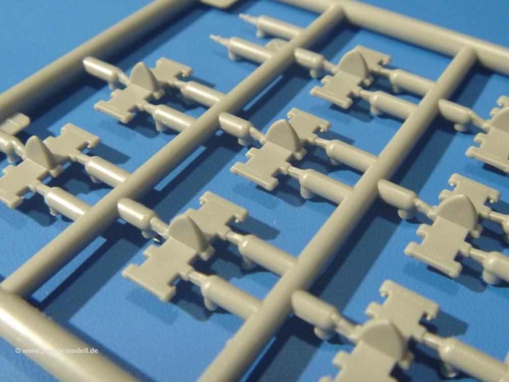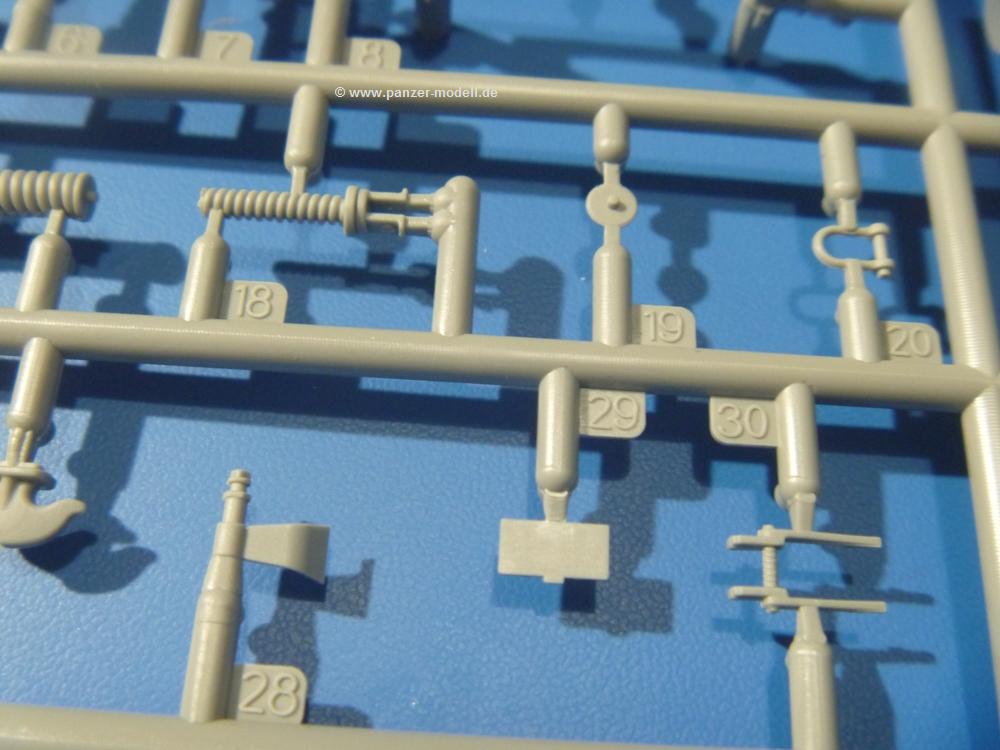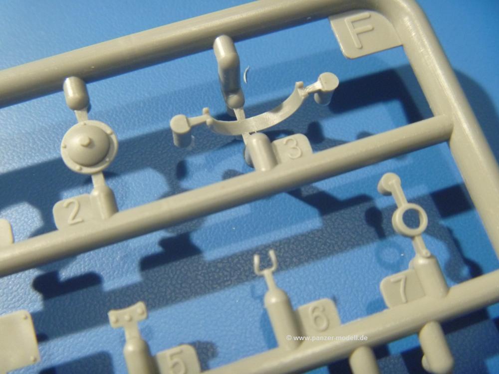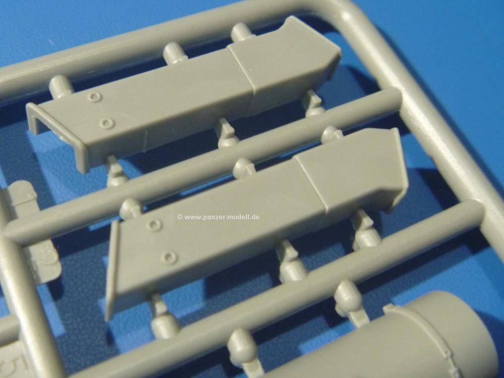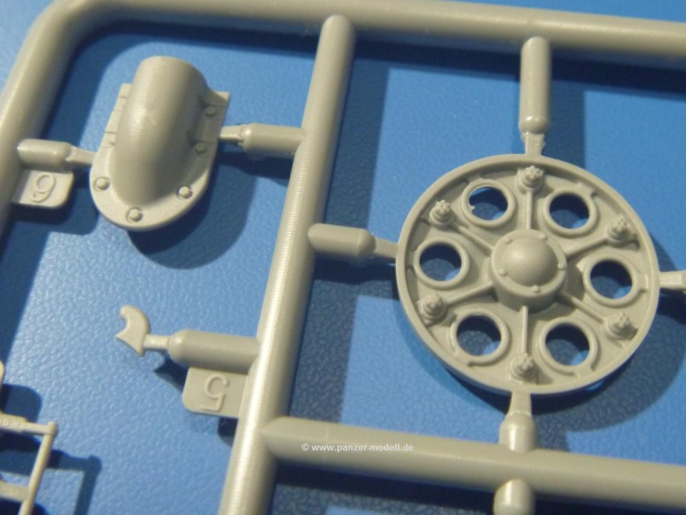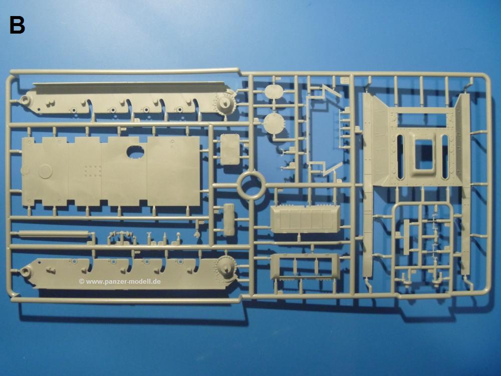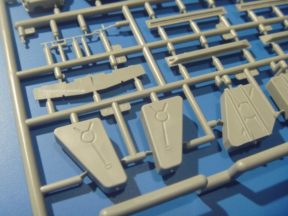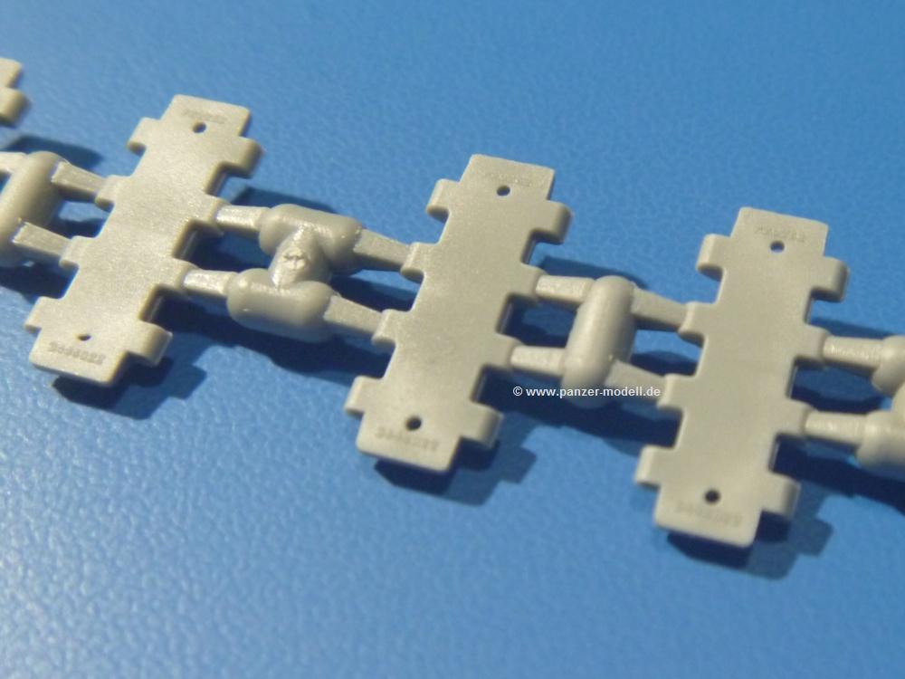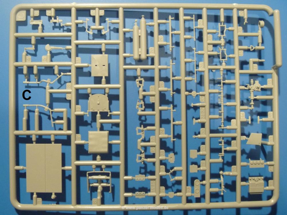 Die Teile aus hellgrauem Plastik sind sauber gespritzt, ohne Verzug und Versatz, hier und da minimaler Grat, keine Fischhäute. Auswerferspuren sind kaum zu sehen und nur auf Innenseiten von Teilen vorhanden, so dass sie beim Zusammenbau verschwinden, ohn das man sie wegschleifen und verspachteln müsste. Viel Vorsicht muss man aufwenden, um manche filigrane Teile wie Gestänge zerstörungsfrei von den Spritzlingen zu lösen.Tja, wie beschreibt man in aller Kürze einen Bausatz, bei dem man sich dermaßen im Detail verlieren kann? Ich habe mich diesmal für ein paar Fotos mehr entschieden und versuche, mich textlich kurz zu fassen.Motor und Getriebe sind im wahrsten Sinne ein Bausatz für sich, so dass es diese mittlerweile auch unter 35205 separat zu kaufen gibt. Lagerböcke, Zylinderköpfe, Zuluft-, Abgaskanäle, Auspuffrohre, Kühlschläuche, Kühler, Lichtmaschine, Einspritzpumpe, Elektromotor für Lüfterad, Lüfterrad, Luftfilter, Steuerstangen, Lenkbremsen - aus meiner Sicht fast alles da bis auf Einspritzleitungen und Verkabelung. Auf dem Wannenboden angegossen findet man vom Fahrerplatz bis zu den Lenkbremsen das entsprechende Gestänge. Die Tanks sind mit Einfüllschrauben versehen und auch die eingepressten Versteifungsrippen sind vorhanden. Schaut man sich die Oberwanne dann mal an, findet man so einige Schraubenlöcher, die dort zu finden sind, wo Motor-, bzw. Kühlerabdeckungen normalerweise angebracht sind. Wenn man also z.B. für eine Wartungsszene die Abdeckungen weglässt, sind die Schraubenlöcher da. Eine absolut realistische Darstellung. Die Zu- und Abluft sind offen. Hier kann man die Windleitbleche entsprechend positioniert einbauen. Den Zuluftdeckel über dem Lüfterrad bekommt man in 2 Varianten. Einmal in Vollplastik mit feiner Gitterstruktur und einmal durchbrochen. In die Öffnung werden dann aus PE-Teilen der Halterahmen und das Gitter eingesetzt. Die große Heckplatte, die auch abgeklappt angebaut werden kann, enthält die Öffnungen für die Auspuffrohre und eine große Wartungsöffnung. Auch hier findet man an den entsprechenden Stellen Schraubenlöcher, wenn man diese Deckel auflassen möchte. An der Innenseite der Heckplatte sind die Verschraubungen der Auspuffpanzerungen vorhanden.Im Kampfraum ist natürlich auch viel los. Der Fahrerplatz ist voll ausgestattet - Sitz, Bedien- und Schalthebel, Pedale, Armaturen. Die Fahrersehklappe bekommt Winkelspiegel aus Klarsichtmaterial. Alle Aussen- und Innendetails inkl. Verriegelungen sind vorhanden. Baut man die Klappe offen, muss man nur das Öffnergestänge entsprechend anbauen. Für die vier verschiedenen Munitionsarten gibt es entsprechende Halterungen. Der Bausatz enthält 60 Patronen, die nicht unbedingt alle verbaut werden müssen, wenn man einen gewissen Verbrauch darstellen möchte. Trommelmagazine für MG/MP mit PE Halterung sind vorhanden, nur die passenden Waffen dazu habe ich nicht gefunden. Dafür gibt es aber eine gehörige Anzahl Nahkampfstopfen, die separat verbaut werden. Optiken wie z.B. Zielfernrohr und Kommandantenoptik sind mit allen Innen- und Aussendetails in Vollplastik vorhanden. Die zahlreichen Winkelspiegel bestehen aus Klarsichtmaterial und werden mit PE-Bügeln weiter detailliert. Auch die vergitterten Innenraumleuchten sind glasklar. Neben der Munition nimmt den meisten Platz die Kanone ein. Verschluss, Verschlussblock, Rohrbremsen, Richtelemente, Richtschützensitz, Zielfernrohr, Hülsenabweiser, -sack, Rohrlager, um nur ein paar Details zu nennen. Die Verschraubung der Kanonenlagerung ist auch auf der Innenseite der Frontplatte wiedergegeben. Das Rohr ist aus einem Stück gegossen und an der Mündung ca. 3mm tief "aufgebohrt". Die Gussstruktur der Blende und Bledenlagerung weiß sehr zu gefallen.Das Fahrgestell beginnt bereits im Inneren mit den Federkästen, in die die schönen Druckfedern eingebaut werden. Alle Schwingarme sind separat ausgeführt. Die Räder sind rumherum detailliert und können drehbar angebaut werden. Die Kettenglieder werden ineinander geklipst und sollten theoretisch auch beweglich bleiben, wenn die feinen Stifte das aushalten. Ein genauer Blick auf die Glieder zeigt uns Gussnummern auf Innen- und Aussenseiten.Die 4 Aussentanks sind sehr fein detailliert. Bei den hinteren beiden hat man die Wahl, ob man die Tankhälften mit angegossenen Halterbändern anbringt, die Tanks weglässt und nur die Haltebänder aus PE-Teilen anbringt oder ob man die Tanks ohne angegossene Halterbänder nimmt und dann mit den PE-Bändern befestigt. Die Griffe an den Enden der Tanks sind aus PE-Material. Die 12 Eisgreifer werden auf den Kettenabdeckungen mittels einer Kombination aus Plastikösen und PE-Bändern befestigt. Gleiches gilt für die eingerollte Plane. Die Plastikösen sind winzig und werden genügend Vorsicht und Geduld fordern. Hupe und Lampe sind an PE Halterungen befestigt. Die Lampe ist innen hohl und mit einem geriffelten Klarsichtglas versehen. Werkzeug wie Schaufel und Säge ist ebenso vorhanden wie die Abschleppseile. Alle Luken lassen sich offen oder geschlossen anbauen und sind entsprechend beidseitig detailliert.Es sind Abziehbilder (Decals) für 2 (eigentlich 3) Varianten dabei.