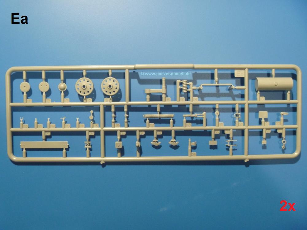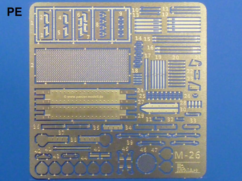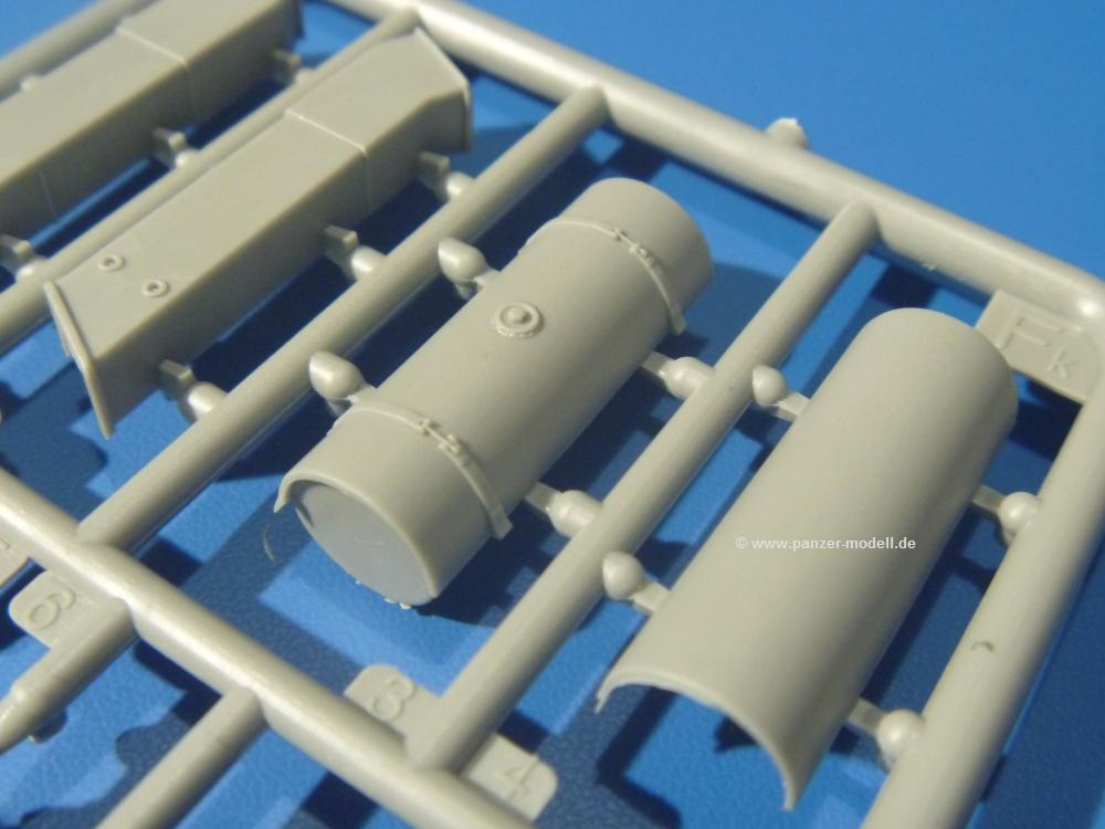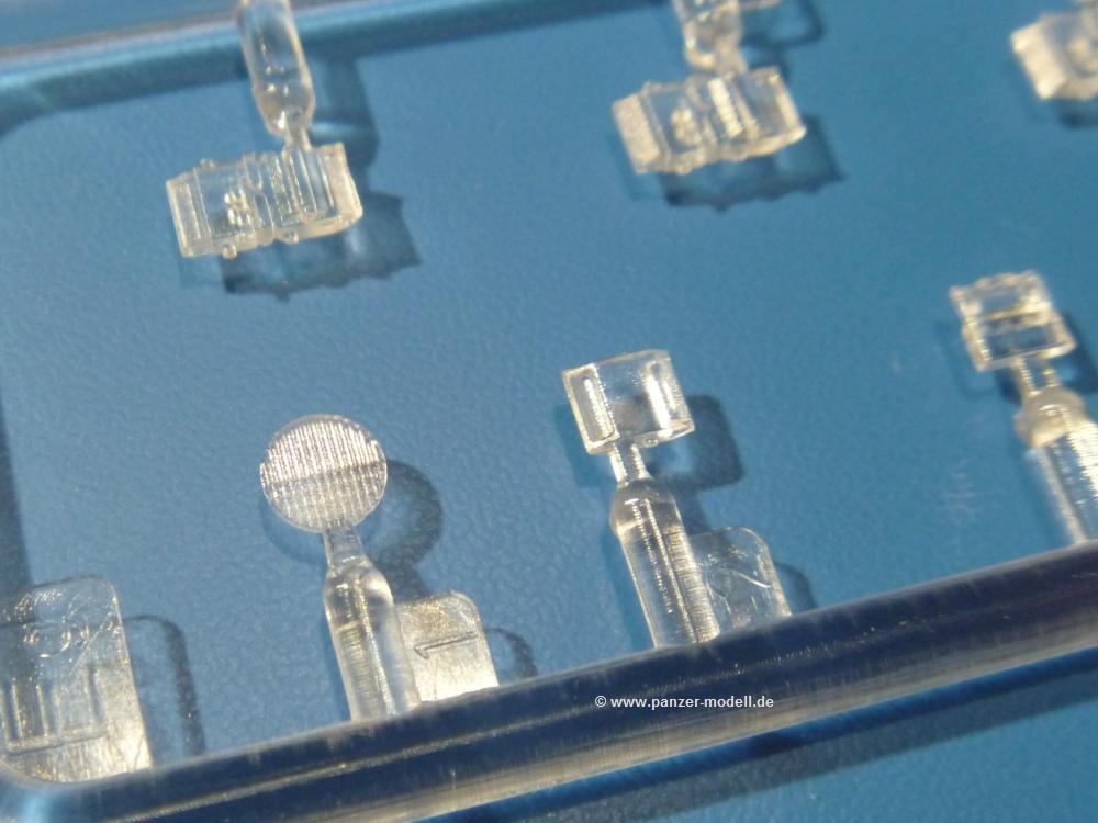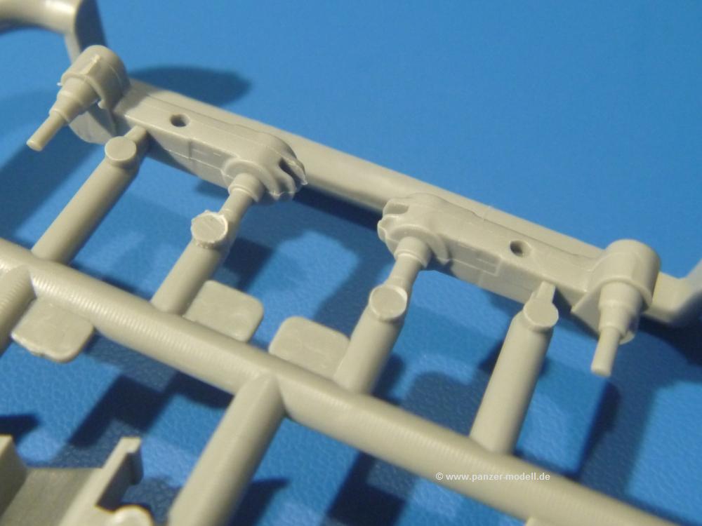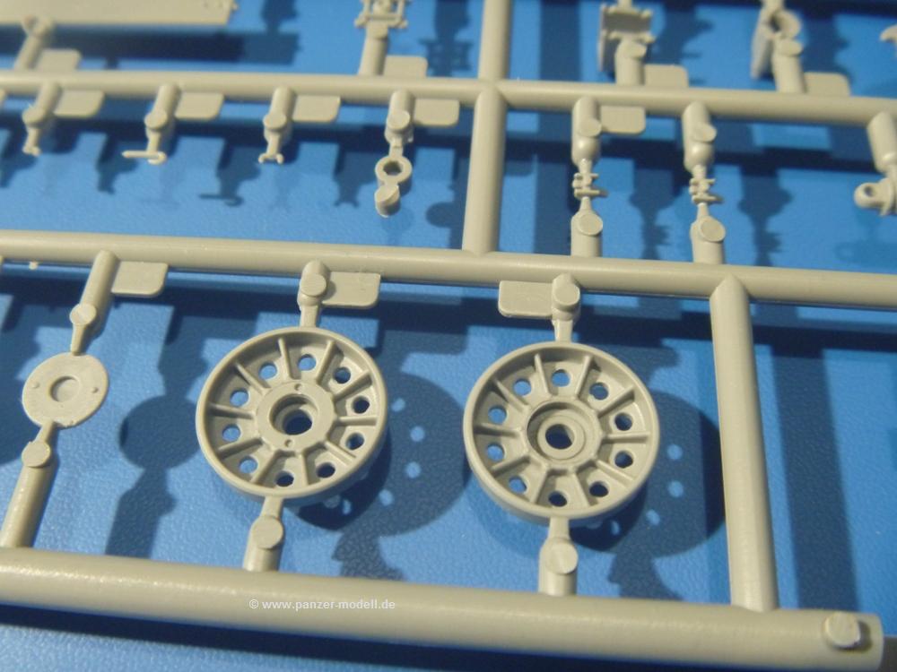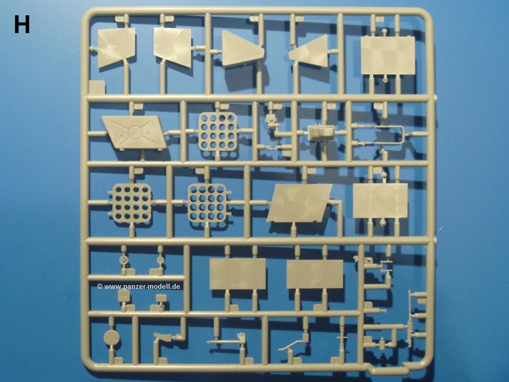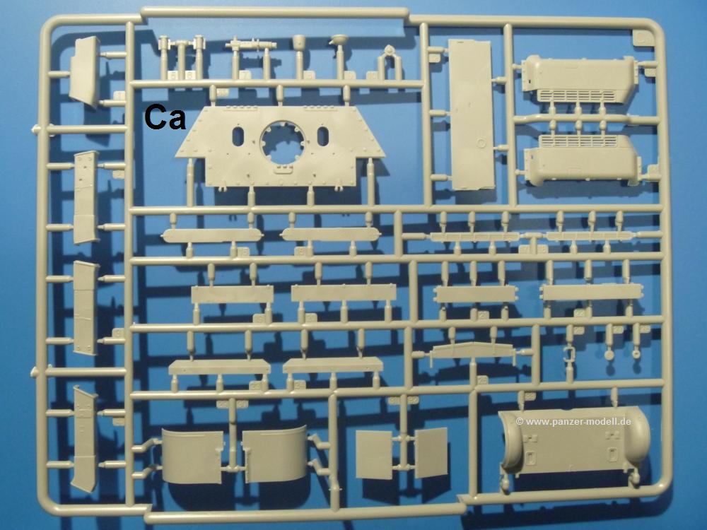 Die Teile aus hellgrauem Plastik sind sauber gespritzt, ohne Verzug und Versatz, hier und da minimaler Grat, keine Fischhäute. Auswerferspuren sind kaum zu sehen und nur auf Innenseiten von Teilen vorhanden, so dass sie beim Zusammenbau verschwinden, ohn das man sie wegschleifen und verspachteln müsste. Viel Vorsicht muss man aufwenden, um manche filigrane Teile wie Gestänge zerstörungsfrei von den Spritzlingen zu lösen.Tja, wie beschreibt man in aller Kürze einen Bausatz, bei dem man sich dermaßen im Detail verlieren kann? Ich habe mich diesmal für ein paar Fotos mehr entschieden und versuche, mich textlich kurz zu fassen.Motor und Getriebe sind im wahrsten Sinne ein Bausatz für sich, so dass es diese mittlerweile auch unter 35205 separat zu kaufen gibt. Lagerböcke, Zylinderköpfe, Zuluft-, Abgaskanäle, Auspuffrohre, Kühlschläuche, Kühler, Lichtmaschine, Einspritzpumpe, Elektromotor für Lüfterad, Lüfterrad, Luftfilter, Steuerstangen, Lenkbremsen - aus meiner Sicht fast alles da bis auf Einspritzleitungen und Verkabelung. Auf dem Wannenboden angegossen findet man vom Fahrerplatz bis zu den Lenkbremsen das entsprechende Gestänge. Die Tanks sind mit Einfüllschrauben versehen und auch die eingepressten Versteifungsrippen sind vorhanden. Schaut man sich die Oberwanne dann mal an, findet man so einige Schraubenlöcher, die dort zu finden sind, wo Motor-, bzw. Kühlerabdeckungen normalerweise angebracht sind. Wenn man also z.B. für eine Wartungsszene die Abdeckungen weglässt, sind die Schraubenlöcher da. Eine absolut realistische Darstellung. Die Zu- und Abluft sind offen. Hier kann man die Windleitbleche entsprechend positioniert einbauen. Den Zuluftdeckel über dem Lüfterrad bekommt man in 2 Varianten. Einmal in Vollplastik mit feiner Gitterstruktur und einmal durchbrochen. In die Öffnung werden dann aus PE-Teilen der Halterahmen und das Gitter eingesetzt. Die große Heckplatte, die auch abgeklappt angebaut werden kann, enthält die Öffnungen für die Auspuffrohre und eine große Wartungsöffnung. Auch hier findet man an den entsprechenden Stellen Schraubenlöcher, wenn man diese Deckel auflassen möchte. An der Innenseite der Heckplatte sind die Verschraubungen der Auspuffpanzerungen vorhanden.Im Kampfraum ist natürlich auch viel los. Der Fahrerplatz ist voll ausgestattet - Sitz, Bedien- und Schalthebel, Pedale, Armaturen. Die Fahrersehklappe bekommt Winkelspiegel aus Klarsichtmaterial. Alle Aussen- und Innendetails inkl. Verriegelungen sind vorhanden. Baut man die Klappe offen, muss man nur das Öffnergestänge entsprechend anbauen. Für die vier verschiedenen Munitionsarten gibt es entsprechende Halterungen. Der Bausatz enthält 60 Patronen, die nicht unbedingt alle verbaut werden müssen, wenn man einen gewissen Verbrauch darstellen möchte. Trommelmagazine für MG/MP mit PE Halterung sind vorhanden, nur die passenden Waffen dazu habe ich nicht gefunden. Dafür gibt es aber eine gehörige Anzahl Nahkampfstopfen, die separat verbaut werden. Optiken wie z.B. Zielfernrohr und Kommandantenoptik sind mit allen Innen- und Aussendetails in Vollplastik vorhanden. Die zahlreichen Winkelspiegel bestehen aus Klarsichtmaterial und werden mit PE-Bügeln weiter detailliert. Auch die vergitterten Innenraumleuchten sind glasklar. Neben der Munition nimmt den meisten Platz die Kanone ein. Verschluss, Verschlussblock, Rohrbremsen, Richtelemente, Richtschützensitz, Zielfernrohr, Hülsenabweiser, -sack, Rohrlager, um nur ein paar Details zu nennen. Die Verschraubung der Kanonenlagerung ist auch auf der Innenseite der Frontplatte wiedergegeben. Das Rohr ist aus einem Stück gegossen und an der Mündung ca. 3mm tief "aufgebohrt". Die Gussstruktur der Blende und Bledenlagerung weiß sehr zu gefallen.Das Fahrgestell beginnt bereits im Inneren mit den Federkästen, in die die schönen Druckfedern eingebaut werden. Alle Schwingarme sind separat ausgeführt. Die Räder sind rumherum detailliert und können drehbar angebaut werden. Die Kettenglieder werden ineinander geklipst und sollten theoretisch auch beweglich bleiben, wenn die feinen Stifte das aushalten. Ein genauer Blick auf die Glieder zeigt uns Gussnummern auf Innen- und Aussenseiten.Die 4 Aussentanks sind sehr fein detailliert. Bei den hinteren beiden hat man die Wahl, ob man die Tankhälften mit angegossenen Halterbändern anbringt, die Tanks weglässt und nur die Haltebänder aus PE-Teilen anbringt oder ob man die Tanks ohne angegossene Halterbänder nimmt und dann mit den PE-Bändern befestigt. Die Griffe an den Enden der Tanks sind aus PE-Material. Die 12 Eisgreifer werden auf den Kettenabdeckungen mittels einer Kombination aus Plastikösen und PE-Bändern befestigt. Gleiches gilt für die eingerollte Plane. Die Plastikösen sind winzig und werden genügend Vorsicht und Geduld fordern. Hupe und Lampe sind an PE Halterungen befestigt. Die Lampe ist innen hohl und mit einem geriffelten Klarsichtglas versehen. Werkzeug wie Schaufel und Säge ist ebenso vorhanden wie die Abschleppseile. Alle Luken lassen sich offen oder geschlossen anbauen und sind entsprechend beidseitig detailliert.Es sind Abziehbilder (Decals) für 2 (eigentlich 3) Varianten dabei.