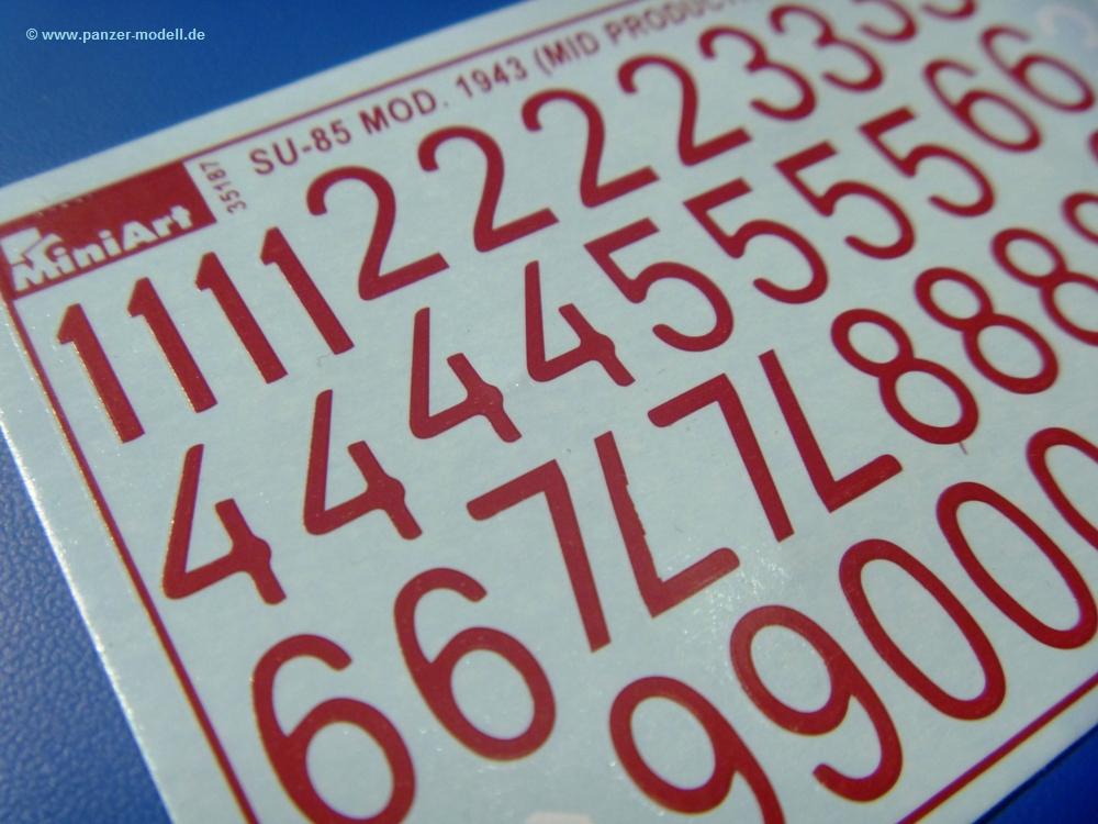 Der Bausatz: Als MiniArt nach einer langen Dürreperiode endlich einen neuen Bausatz der SU-122 und gleich mit voller Inneneinrichtung auf den Markt brachte, keimte die Hoffnung auf, dass dies auch für die SU-85 passieren würde. Die Hoffnung wurde nicht getrübt! In einem 385 x 240 x 95 mm großen Stülpkarton präsentiert man uns die SU-85 mit voller Einrichtung mit sage und schreibe 74 hellgrauen Spritzlingen, 1 klaren Spritzling, 1 PE-Platine, 1 Decalbogen und einer 26-seitigen Bauanleitung. Da kommen einem die 805 Teile im Vergleich zur Spritzlingzahl fast wenig vor.Schauen wir in der Übersicht, was uns das Modell bietet:
