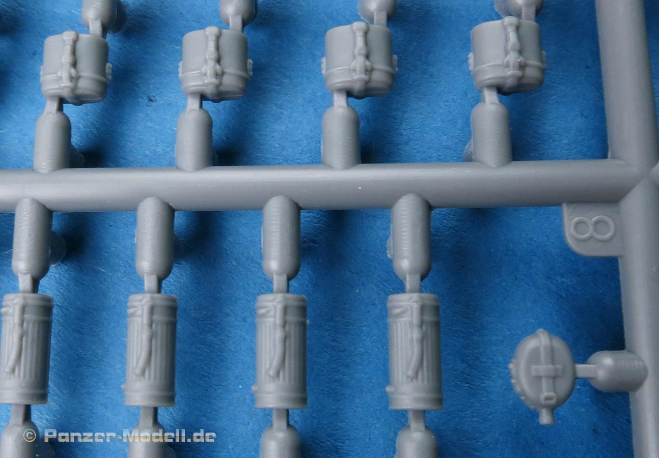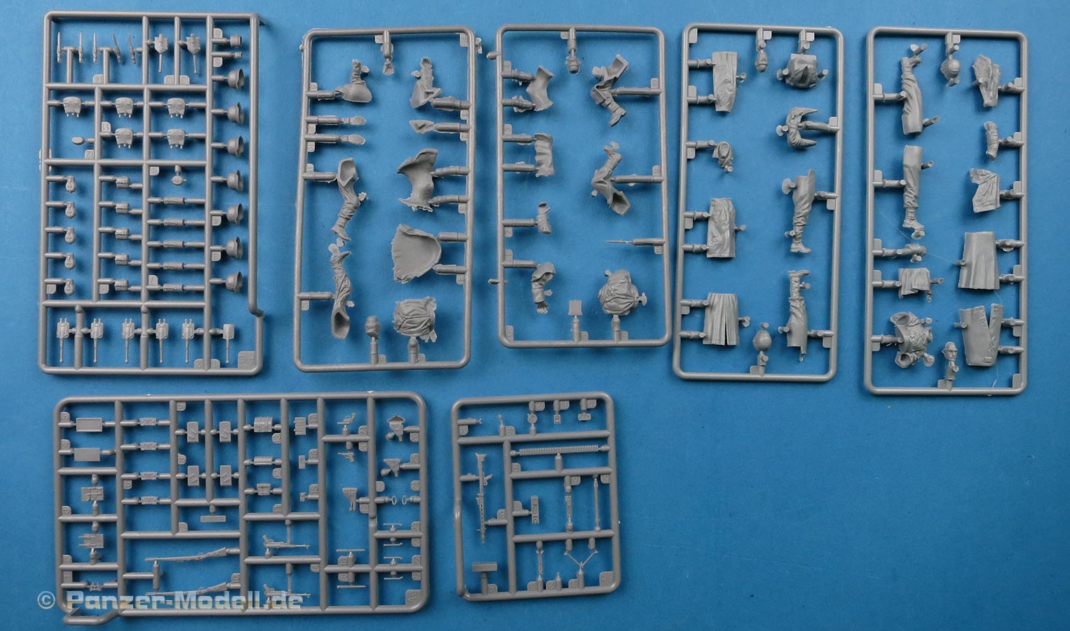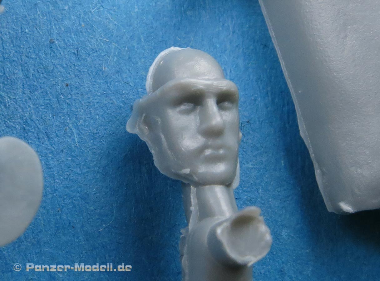 Neben den vielen neuen Fahrzeugen findet Miniart auch immer noch Zeit um Figurensets auf den Markt zu bringen Im Bausatzkarton finden wir 7 Spritzlinge zum Bau von 4 Figuren und passendem Zubehör. Die Teile an den Spritzlingen machen durch die Bank einen guten Eindruck - auch wenn Spritzgussfiguren immer ein bisschen an Fischhaut und Unschärfe an den Kanten, bzw. an Grat der Formtrennnaht leidet. Hier muss einiges an Versäuberungsarbeit geleistet werden. Der Faltenwurf der Uniform ist weicher als bei Resinfiguren, aber kommt glaubhaft rüber. Auch die Gesichter sind für Spritzguss gut ausgeführt. Details wie Hosennähte und Gamaschen finde ich sehr schön. Auch die Darstellung der Ponchos ist recht gelungen und verleiht den Figuren damit schon dieses "Ardennen-Flair". Die Posen der Figuren sind je zwei entspannt sitzende und stehende Figuren, die man recht individuell auf und an Fahrzeugen und Dioramen einsetzen kann. Für knapp über 10 Euro bekommt man hier vier gute Figuren in Spritzguss - kein Vergleich zu Resinfiguren von der Qualität aber eben auch nicht vom Preis.