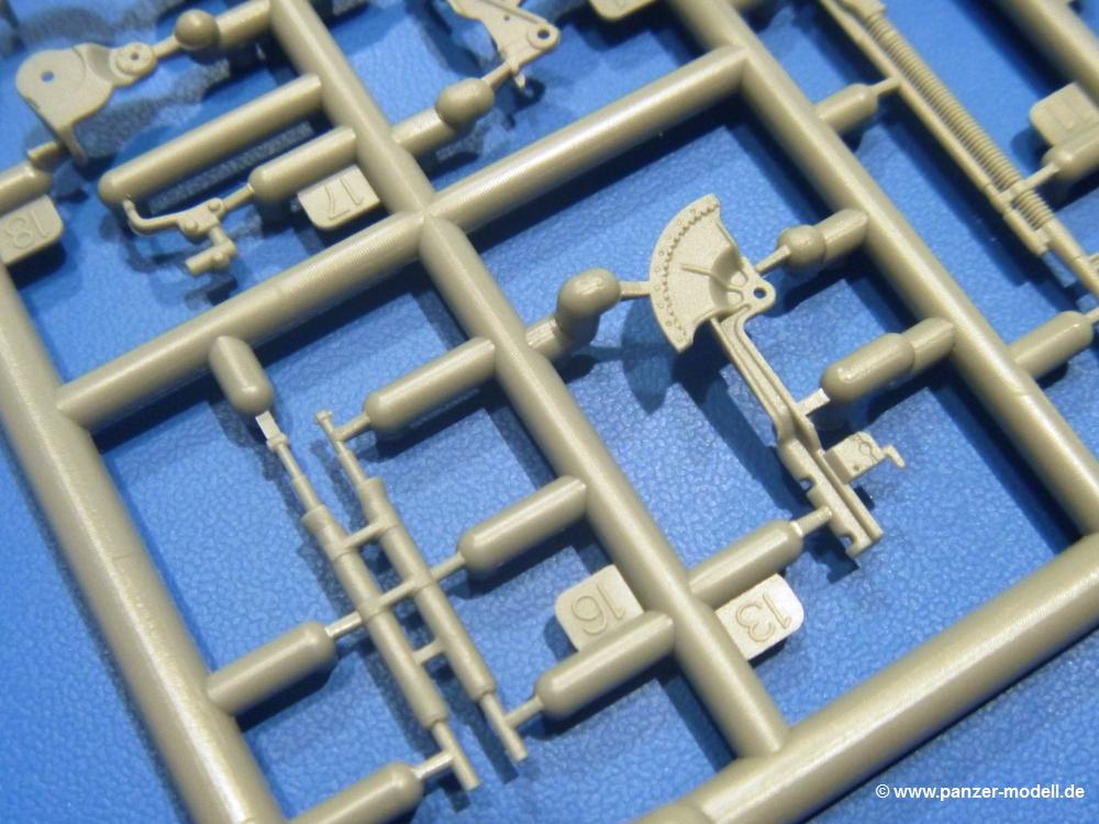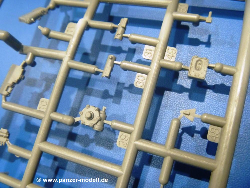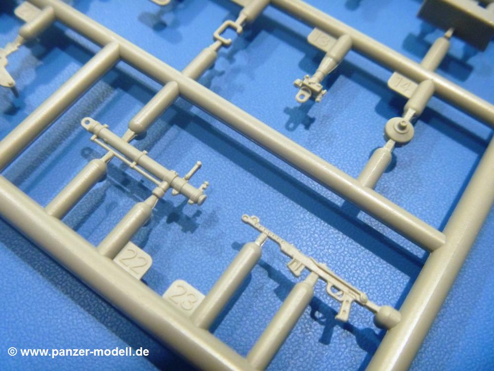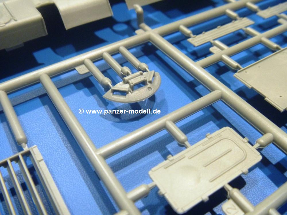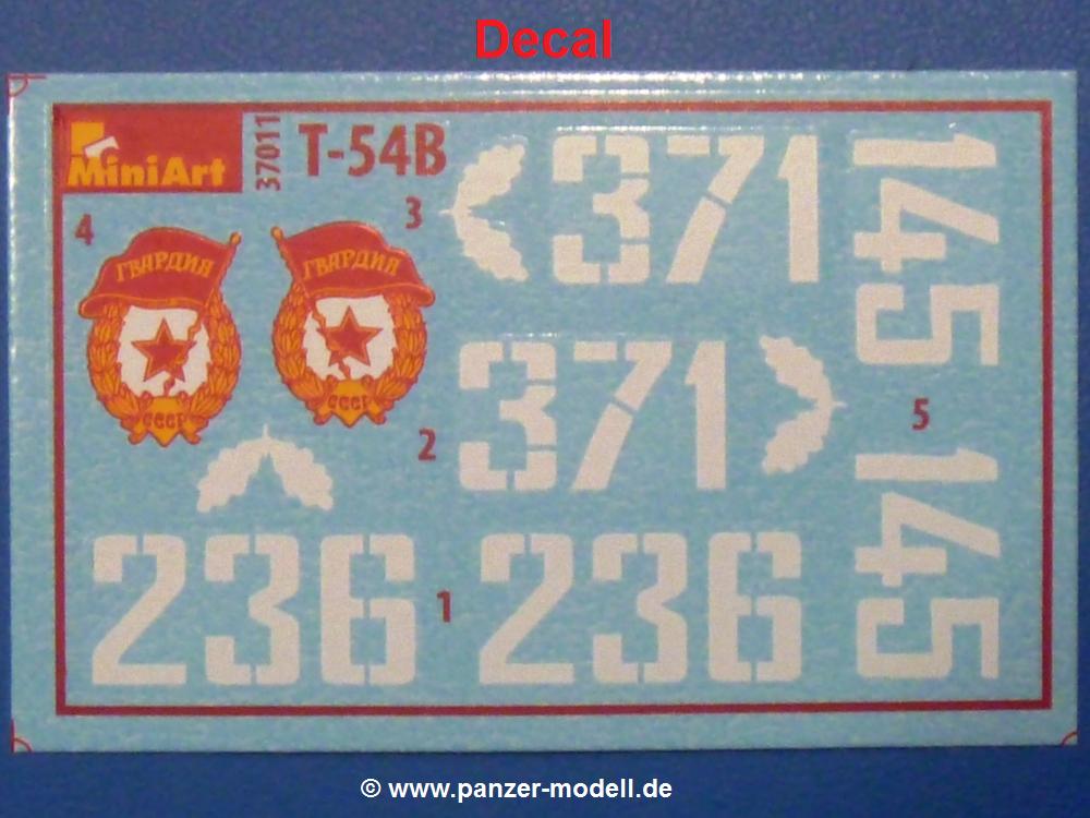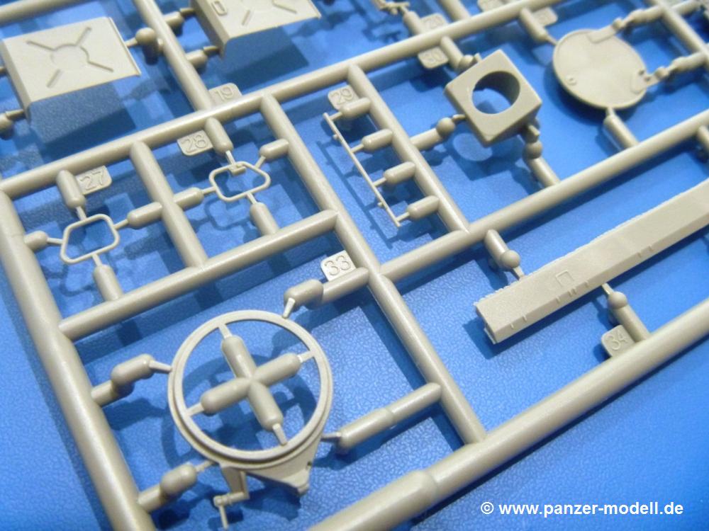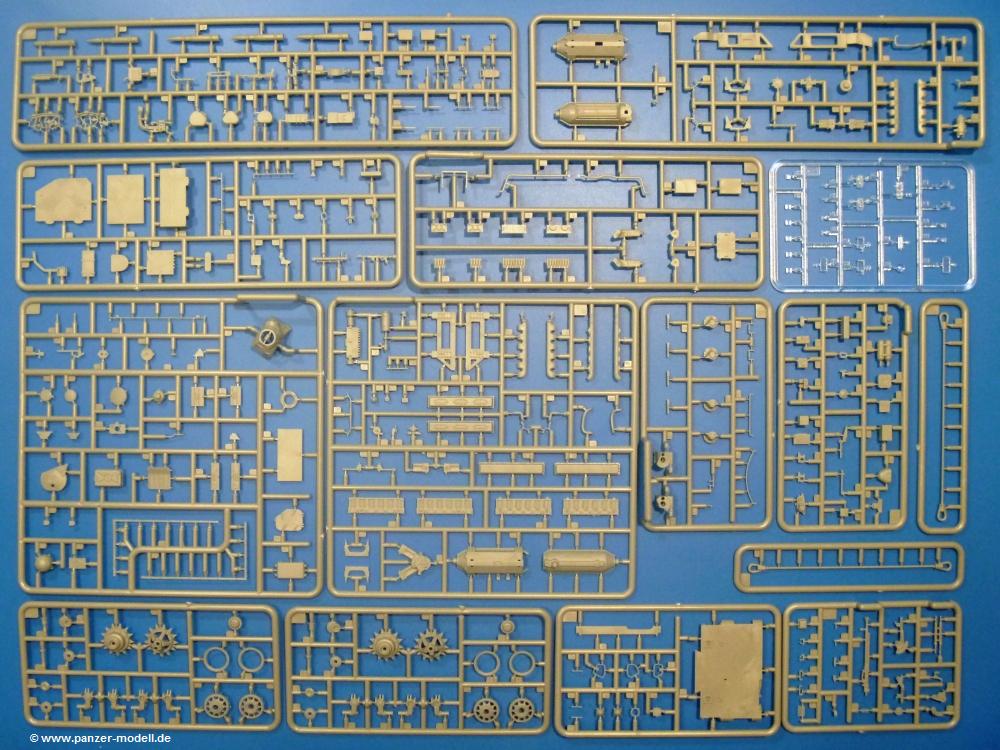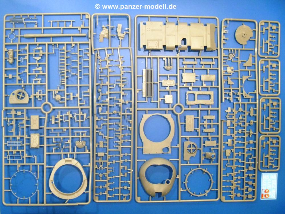 Die Teile aus hellgrauem Plastik sind sauber gespritzt, ohne Verzug und Versatz, hier und da minimaler Grat, keine Fischhäute. Auswerferspuren sind kaum zu sehen und nur auf Innenseiten von Teilen vorhanden, so dass sie beim Zusammenbau verschwinden, ohne das man sie wegschleifen und verspachteln müsste. Viel Vorsicht muss man aufwenden, um manche filigrane Teile wie Gestänge und Leitungen zerstörungsfrei von den Spritzlingen zu lösen.Was wird nun geboten? "Jede Menge!" kann man schon zu Anfang sagen. Separate Drehstäbe, Schwingarmlager, Schwingarme und die Notausstiegluke finden ihren Platz im Wannenboden. Neben der Notausstiegsluke findet man auch Öffnung und Verschlussdeckel zum Grabenbeschuss. Die 5 Bodenbleche des Kampfraumbodens sind sehr schön wiedergegeben. Der Fahrerplatz ist mit Lenk-, Schalthebeln, Pedalen und mehrteiligem Fahrersitz ausgestattet. Rechts vom Fahrer findet man einen großen Staukasten, an den der Munitionsbunker für 20 Schuss separate 100 mm Munition angrenzt. An die Wanneninnenwände werden so einige Instrumente, Munitions-, Schalt- und Staukästen angebaut. Auch weitere 100 mm Munition und eine Feuerlöschanlage gibt es. Dazu kommt ein separater Handfeuerlöscher.Der 12-Zylinder V-Dieselmotor enthält viele Details wie die Einspritzpumpe, Ein- und Auslasskanäle, Lichtmaschine, Anlasser, Luftfilterkasten mit untergebautem Zyklonluftfilter, Anlasskompressor, Kraftstofffilter, Turbo und verschiedene Leitungen. Nur die Einspritzleitungen von der Einspritzpumpe zu den Düsen muss man selbst (z.B. aus feinem Draht) herstellen. Die Motortrennwand ist schon gut detailliert. Zusätzliche Teile sind ein MG-Munitionsbehälter, eine 100 mm Patrone, ein Schaltkasten. Das Gimmick hier ist der Kampfraumlüfter mit dem PE-Gitter.Auch im Turm wurde kein Detail ausgelassen. Rohrbremsen, Verschlussblock und Hülsenabweiser erwartet man auf alle Fälle. Der Verschluss als separates Teil erlaubt das Einlegen von 100 mm Munition, Bediengestänge ist vorhanden. Höhen- und Seitenrichtmaschine sind samt ihrer Elektromotoren sauber wiedergegeben. Die Sitze der Besatzung sind ebenso da wie die Munitionshalterungen samt der separaten Munition und dem Funkgerät. Das koaxiale MG mit Munitions- und Hülsenfangkasten ist reichlich detailliert. Das Zielfernrohr des Richtschützen und die Nachtsichtoptik sind schon kleine Bausätze für sich. Wenn ich mit nicht verzählt habe, kommen bei der Kommandantenluke je nach Variation bis zu 29(!) Teile zusammen - Winkelspiegel, Scheibenwischer, Bediengriffe, Suchscheinwerfer etc.Auch Außen ist so einiges los. Für die Kraftstofftanks auf den Kettenabdeckungen gibt es separate Leitungen. Den Wetterschutz für den Fahrer kann man aufgebaut mit Glaseinsatz, Scheibenwischer und Bedienhebel dafür aufbauen oder zusammengefaltet auf der gerollten Plane am Turmheck platzieren. Die Plane wird von PE-Bändern gehalten. Das Fla-MG setzt sich aus fast 30 Teilen zusammen. Hier gibt es auch ein Stück Munitionsgurt. Die Kanonenblende kann man wahlweise ohne oder mit Blendenplane einbauen. Je nach Wahl unterscheidet sich dann der Anbau des Schießscheinwerfers. Entscheidet man sich für die Nachtkampfvariante des Scheinwerfers, darf man innen auch eine Glühlampe aus Klarsichtmaterial einsetzen. Apropos Nachtkampfvariante - die Bauanleitung gibt dafür Optionen vor. Für den Nachtkampf also offene Such- und Schießscheinwerfer und eingebaute Nachtkampfoptik oder für den Tagkampf mit Deckeln verschlossen.Für das Fahrgestell gilt, wenn man die Schwingarme nicht feststellt, bleibt es beweglich, so dass man es z.B. an Dioramengelände anpassen kann. Die Einzelgliederkette kommt einem da entgegen. Wirft man einen genaueren Blick auf die Glieder, wird man die feinen Gussnummern erkennen. Bei den Laufrollen hat man die Wahl zwischen den älteren Spinnennetzrädern oder den moderneren 5-Speichenrädern. Der Bemalungsplan zeigt den T-54 aber immer nur mit 5-Speichenrädern.Es sind Abziehbilder (Decals) für 4 Versionen dabei.