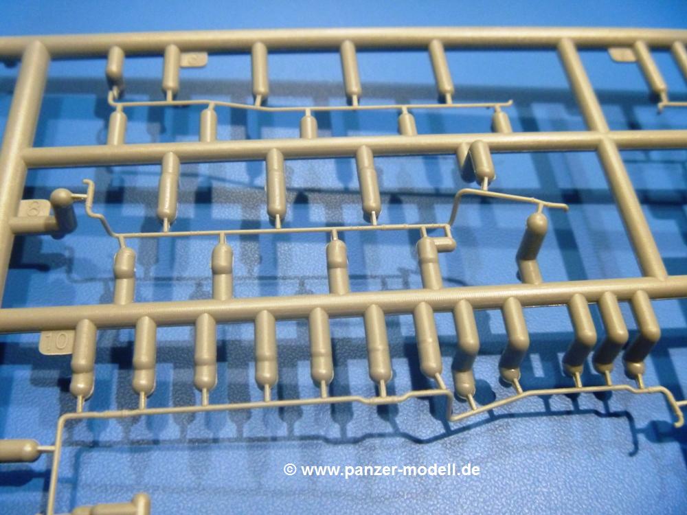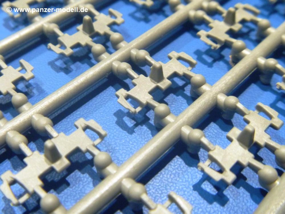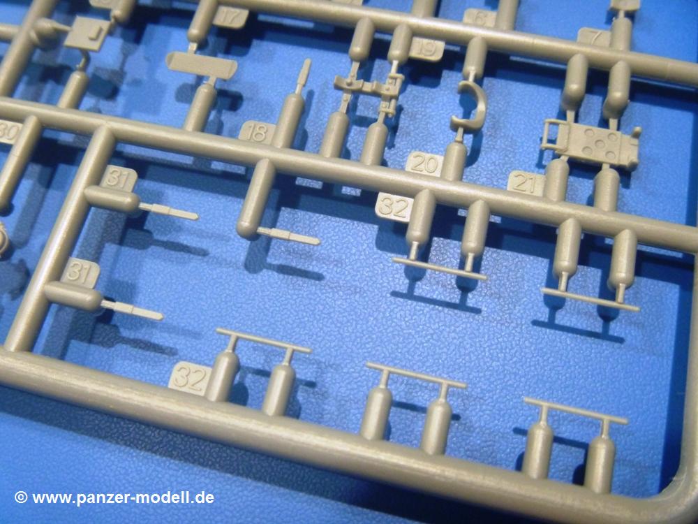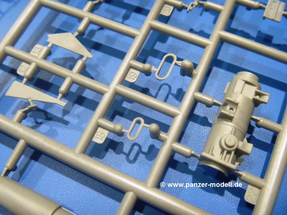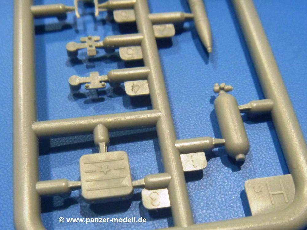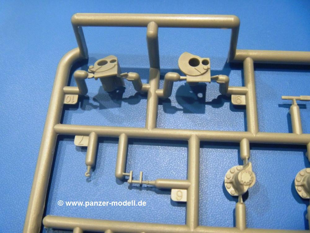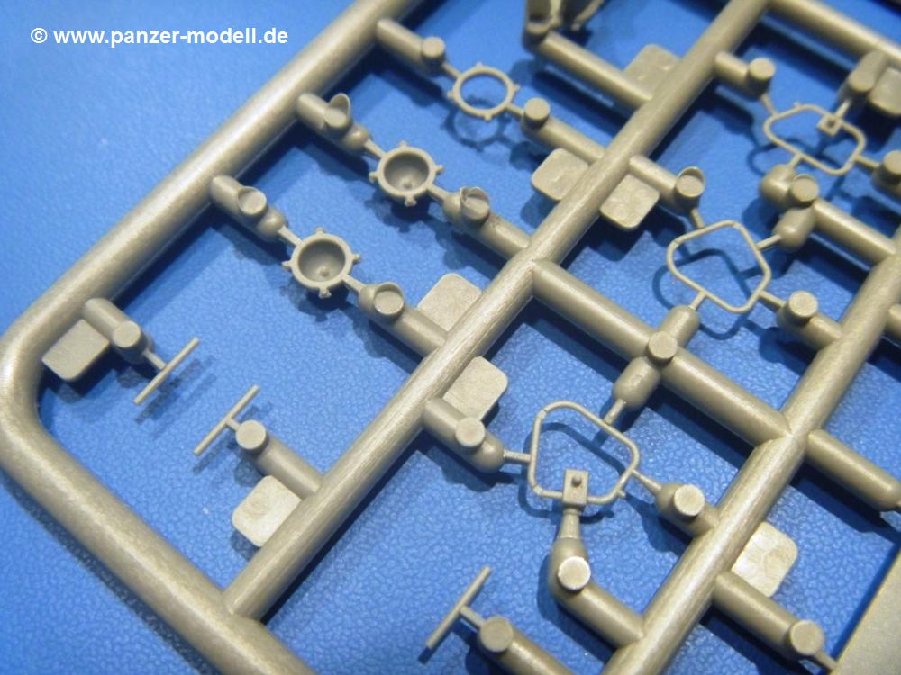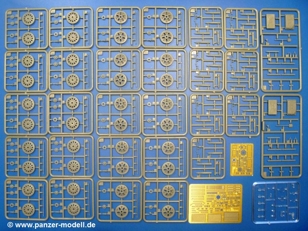 Die Teile aus hellgrauem Plastik sind sauber gespritzt, ohne Verzug und Versatz, hier und da minimaler Grat, keine Fischhäute. Auswerferspuren sind kaum zu sehen und nur auf Innenseiten von Teilen vorhanden, so dass sie beim Zusammenbau verschwinden, ohne das man sie wegschleifen und verspachteln müsste. Viel Vorsicht muss man aufwenden, um manche filigrane Teile wie Gestänge und Leitungen zerstörungsfrei von den Spritzlingen zu lösen.Was wird nun geboten? "Jede Menge!" kann man schon zu Anfang sagen. Separate Drehstäbe, Schwingarmlager, Schwingarme und die Notausstiegluke finden ihren Platz im Wannenboden. Neben der Notausstiegsluke findet man auch Öffnung und Verschlussdeckel zum Grabenbeschuss. Die 5 Bodenbleche des Kampfraumbodens sind sehr schön wiedergegeben. Der Fahrerplatz ist mit Lenk-, Schalthebeln, Pedalen und mehrteiligem Fahrersitz ausgestattet. Rechts vom Fahrer findet man einen großen Staukasten, an den der Munitionsbunker für 20 Schuss separate 100 mm Munition angrenzt. An die Wanneninnenwände werden so einige Instrumente, Munitions-, Schalt- und Staukästen angebaut. Auch weitere 100 mm Munition und eine Feuerlöschanlage gibt es. Dazu kommt ein separater Handfeuerlöscher.Der 12-Zylinder V-Dieselmotor enthält viele Details wie die Einspritzpumpe, Ein- und Auslasskanäle, Lichtmaschine, Anlasser, Luftfilterkasten mit untergebautem Zyklonluftfilter, Anlasskompressor, Kraftstofffilter, Turbo und verschiedene Leitungen. Nur die Einspritzleitungen von der Einspritzpumpe zu den Düsen muss man selbst (z.B. aus feinem Draht) herstellen. Die Motortrennwand ist schon gut detailliert. Zusätzliche Teile sind ein MG-Munitionsbehälter, eine 100 mm Patrone, ein Schaltkasten. Das Gimmick hier ist der Kampfraumlüfter mit dem PE-Gitter.Auch im Turm wurde kein Detail ausgelassen. Rohrbremsen, Verschlussblock und Hülsenabweiser erwartet man auf alle Fälle. Der Verschluss als separates Teil erlaubt das Einlegen von 100 mm Munition, Bediengestänge ist vorhanden. Höhen- und Seitenrichtmaschine sind samt ihrer Elektromotoren sauber wiedergegeben. Die Sitze der Besatzung sind ebenso da wie die Munitionshalterungen samt der separaten Munition und dem Funkgerät. Das koaxiale MG mit Munitions- und Hülsenfangkasten ist reichlich detailliert. Das Zielfernrohr des Richtschützen und die Nachtsichtoptik sind schon kleine Bausätze für sich. Wenn ich mit nicht verzählt habe, kommen bei der Kommandantenluke je nach Variation bis zu 29(!) Teile zusammen - Winkelspiegel, Scheibenwischer, Bediengriffe, Suchscheinwerfer etc.Auch Außen ist so einiges los. Für die Kraftstofftanks auf den Kettenabdeckungen gibt es separate Leitungen. Den Wetterschutz für den Fahrer kann man aufgebaut mit Glaseinsatz, Scheibenwischer und Bedienhebel dafür aufbauen oder zusammengefaltet auf der gerollten Plane am Turmheck platzieren. Die Plane wird von PE-Bändern gehalten. Das Fla-MG setzt sich aus fast 30 Teilen zusammen. Hier gibt es auch ein Stück Munitionsgurt. Die Kanonenblende kann man wahlweise ohne oder mit Blendenplane einbauen. Je nach Wahl unterscheidet sich dann der Anbau des Schießscheinwerfers. Entscheidet man sich für die Nachtkampfvariante des Scheinwerfers, darf man innen auch eine Glühlampe aus Klarsichtmaterial einsetzen. Apropos Nachtkampfvariante - die Bauanleitung gibt dafür Optionen vor. Für den Nachtkampf also offene Such- und Schießscheinwerfer und eingebaute Nachtkampfoptik oder für den Tagkampf mit Deckeln verschlossen.Für das Fahrgestell gilt, wenn man die Schwingarme nicht feststellt, bleibt es beweglich, so dass man es z.B. an Dioramengelände anpassen kann. Die Einzelgliederkette kommt einem da entgegen. Wirft man einen genaueren Blick auf die Glieder, wird man die feinen Gussnummern erkennen. Bei den Laufrollen hat man die Wahl zwischen den älteren Spinnennetzrädern oder den moderneren 5-Speichenrädern. Der Bemalungsplan zeigt den T-54 aber immer nur mit 5-Speichenrädern.Es sind Abziehbilder (Decals) für 4 Versionen dabei.