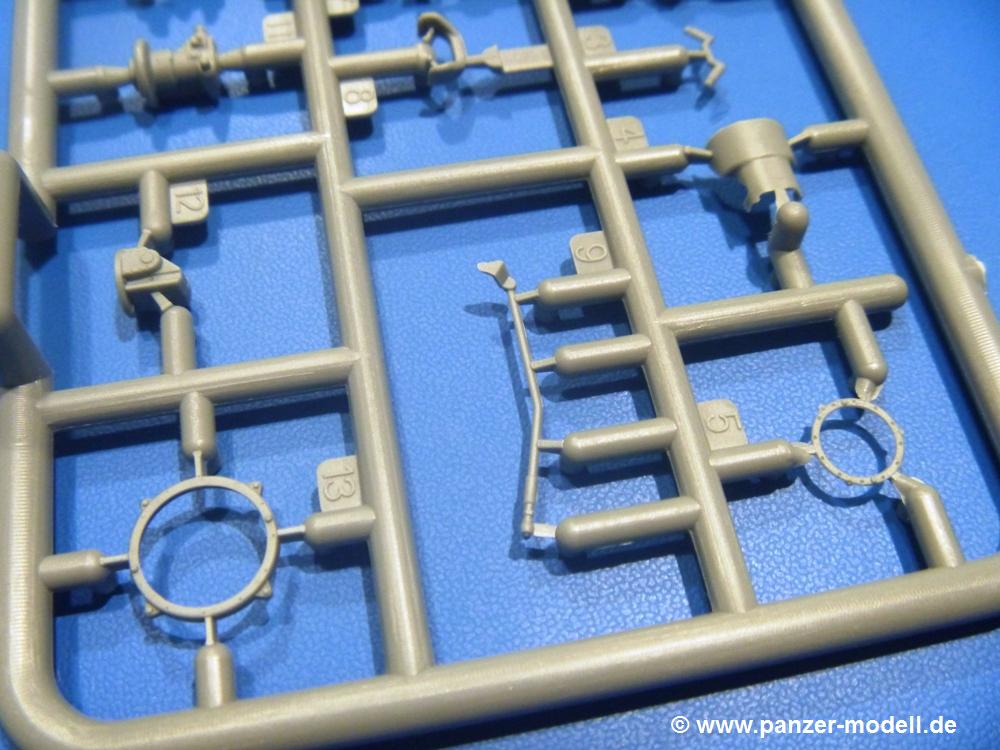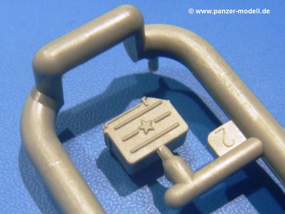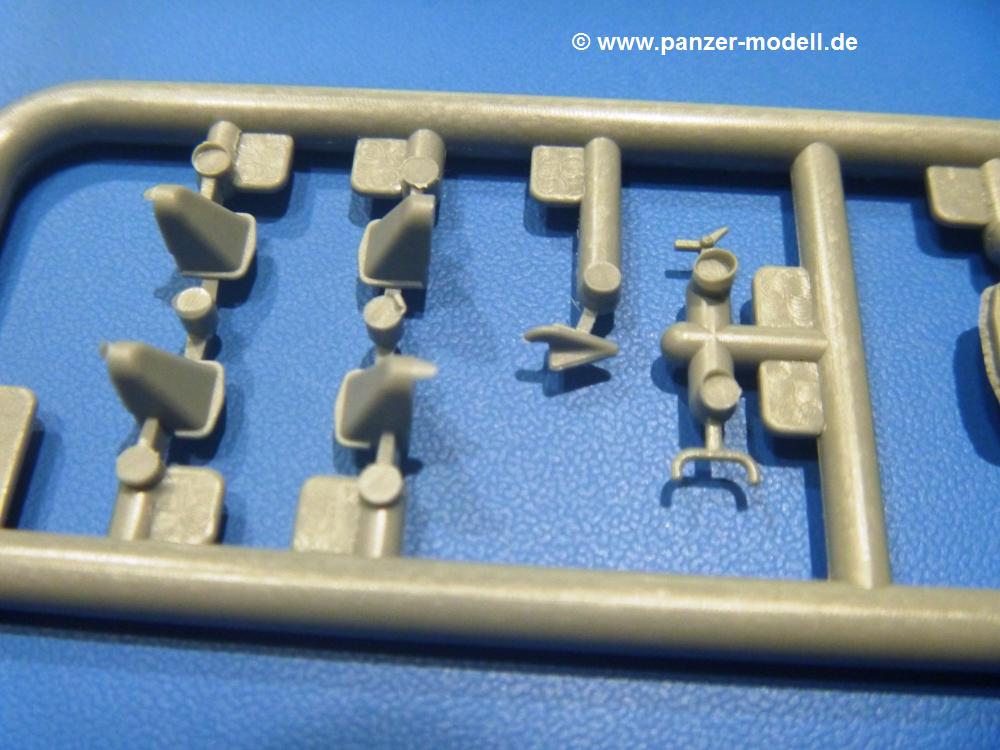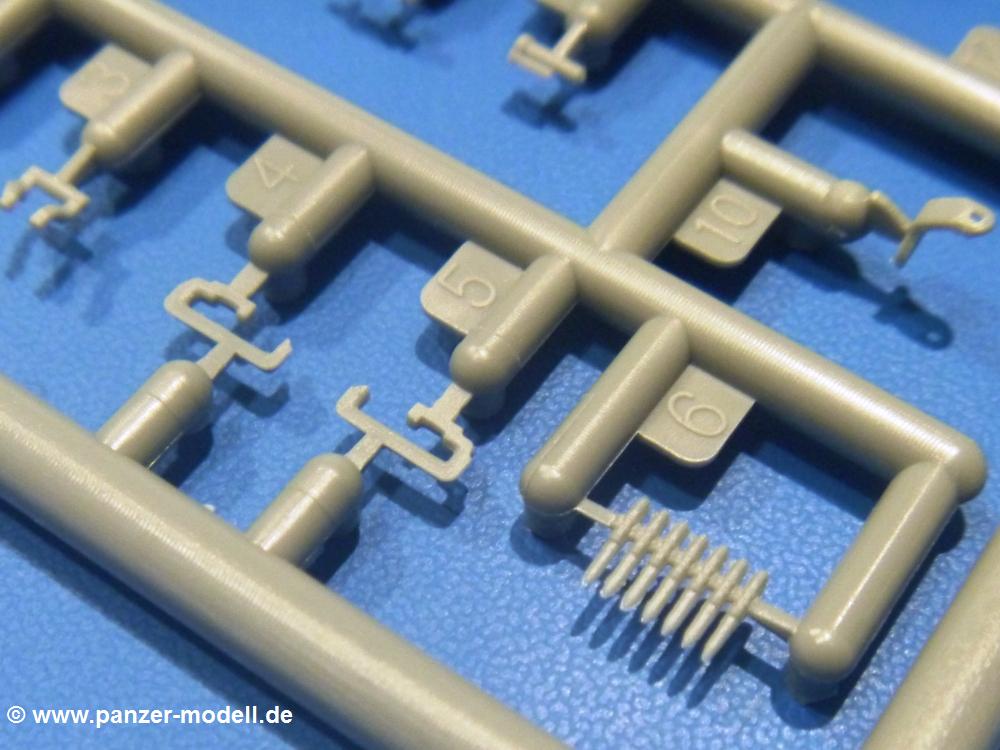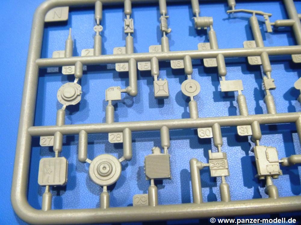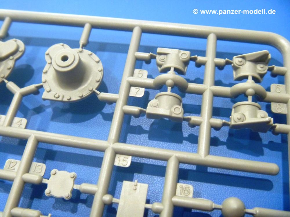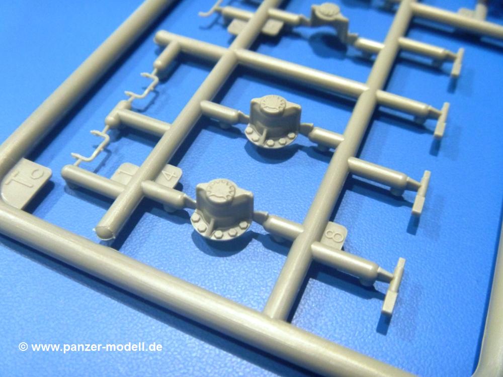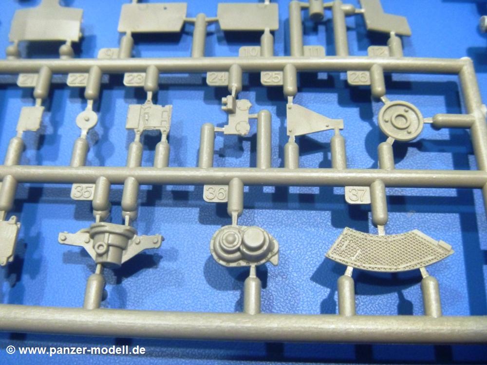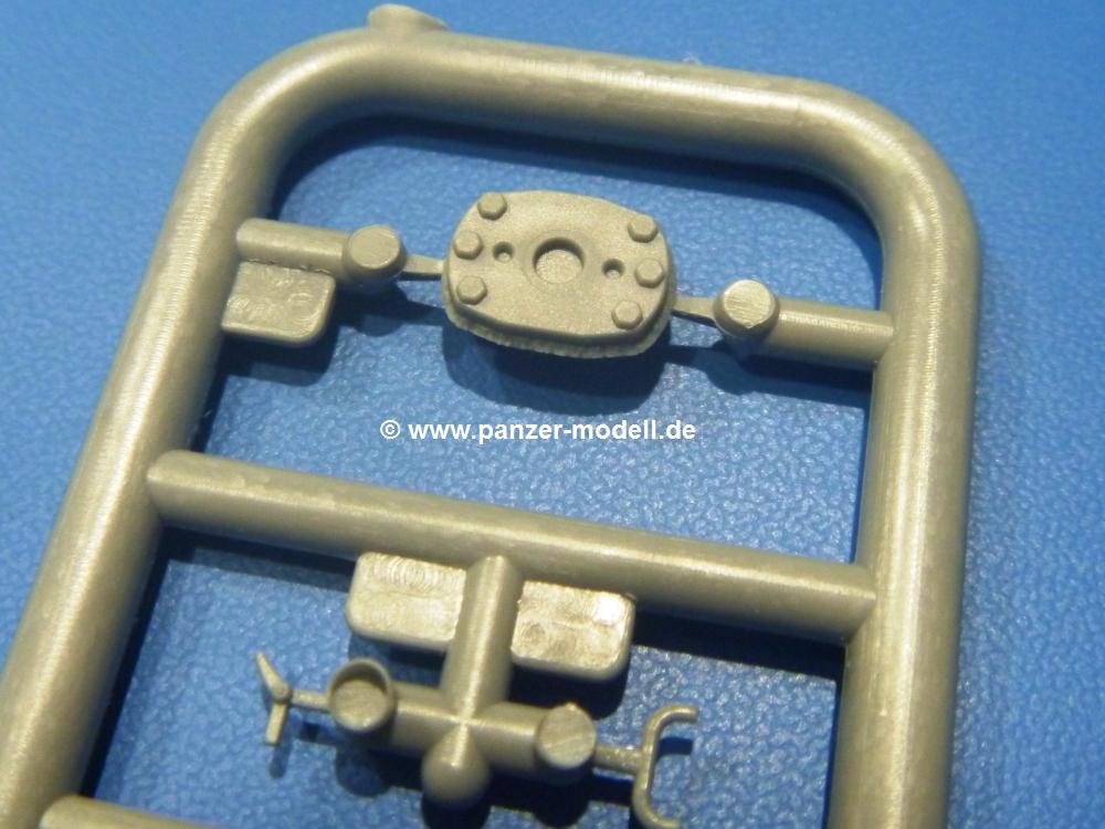 Die Teile aus hellgrauem Plastik sind sauber gespritzt, ohne Verzug und Versatz, hier und da minimaler Grat, keine Fischhäute. Auswerferspuren sind kaum zu sehen und nur auf Innenseiten von Teilen vorhanden, so dass sie beim Zusammenbau verschwinden, ohne das man sie wegschleifen und verspachteln müsste. Viel Vorsicht muss man aufwenden, um manche filigrane Teile wie Gestänge und Leitungen zerstörungsfrei von den Spritzlingen zu lösen.Was wird nun geboten? "Jede Menge!" kann man schon zu Anfang sagen. Separate Drehstäbe, Schwingarmlager, Schwingarme und die Notausstiegluke finden ihren Platz im Wannenboden. Neben der Notausstiegsluke findet man auch Öffnung und Verschlussdeckel zum Grabenbeschuss. Die 5 Bodenbleche des Kampfraumbodens sind sehr schön wiedergegeben. Der Fahrerplatz ist mit Lenk-, Schalthebeln, Pedalen und mehrteiligem Fahrersitz ausgestattet. Rechts vom Fahrer findet man einen großen Staukasten, an den der Munitionsbunker für 20 Schuss separate 100 mm Munition angrenzt. An die Wanneninnenwände werden so einige Instrumente, Munitions-, Schalt- und Staukästen angebaut. Auch weitere 100 mm Munition und eine Feuerlöschanlage gibt es. Dazu kommt ein separater Handfeuerlöscher.Der 12-Zylinder V-Dieselmotor enthält viele Details wie die Einspritzpumpe, Ein- und Auslasskanäle, Lichtmaschine, Anlasser, Luftfilterkasten mit untergebautem Zyklonluftfilter, Anlasskompressor, Kraftstofffilter, Turbo und verschiedene Leitungen. Nur die Einspritzleitungen von der Einspritzpumpe zu den Düsen muss man selbst (z.B. aus feinem Draht) herstellen. Die Motortrennwand ist schon gut detailliert. Zusätzliche Teile sind ein MG-Munitionsbehälter, eine 100 mm Patrone, ein Schaltkasten. Das Gimmick hier ist der Kampfraumlüfter mit dem PE-Gitter.Auch im Turm wurde kein Detail ausgelassen. Rohrbremsen, Verschlussblock und Hülsenabweiser erwartet man auf alle Fälle. Der Verschluss als separates Teil erlaubt das Einlegen von 100 mm Munition, Bediengestänge ist vorhanden. Höhen- und Seitenrichtmaschine sind samt ihrer Elektromotoren sauber wiedergegeben. Die Sitze der Besatzung sind ebenso da wie die Munitionshalterungen samt der separaten Munition und dem Funkgerät. Das koaxiale MG mit Munitions- und Hülsenfangkasten ist reichlich detailliert. Das Zielfernrohr des Richtschützen und die Nachtsichtoptik sind schon kleine Bausätze für sich. Wenn ich mit nicht verzählt habe, kommen bei der Kommandantenluke je nach Variation bis zu 29(!) Teile zusammen - Winkelspiegel, Scheibenwischer, Bediengriffe, Suchscheinwerfer etc.Auch Außen ist so einiges los. Für die Kraftstofftanks auf den Kettenabdeckungen gibt es separate Leitungen. Den Wetterschutz für den Fahrer kann man aufgebaut mit Glaseinsatz, Scheibenwischer und Bedienhebel dafür aufbauen oder zusammengefaltet auf der gerollten Plane am Turmheck platzieren. Die Plane wird von PE-Bändern gehalten. Das Fla-MG setzt sich aus fast 30 Teilen zusammen. Hier gibt es auch ein Stück Munitionsgurt. Die Kanonenblende kann man wahlweise ohne oder mit Blendenplane einbauen. Je nach Wahl unterscheidet sich dann der Anbau des Schießscheinwerfers. Entscheidet man sich für die Nachtkampfvariante des Scheinwerfers, darf man innen auch eine Glühlampe aus Klarsichtmaterial einsetzen. Apropos Nachtkampfvariante - die Bauanleitung gibt dafür Optionen vor. Für den Nachtkampf also offene Such- und Schießscheinwerfer und eingebaute Nachtkampfoptik oder für den Tagkampf mit Deckeln verschlossen.Für das Fahrgestell gilt, wenn man die Schwingarme nicht feststellt, bleibt es beweglich, so dass man es z.B. an Dioramengelände anpassen kann. Die Einzelgliederkette kommt einem da entgegen. Wirft man einen genaueren Blick auf die Glieder, wird man die feinen Gussnummern erkennen. Bei den Laufrollen hat man die Wahl zwischen den älteren Spinnennetzrädern oder den moderneren 5-Speichenrädern. Der Bemalungsplan zeigt den T-54 aber immer nur mit 5-Speichenrädern.Es sind Abziehbilder (Decals) für 4 Versionen dabei.