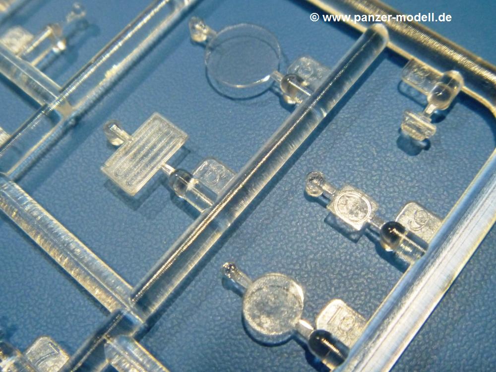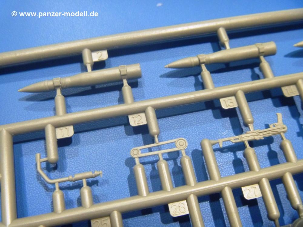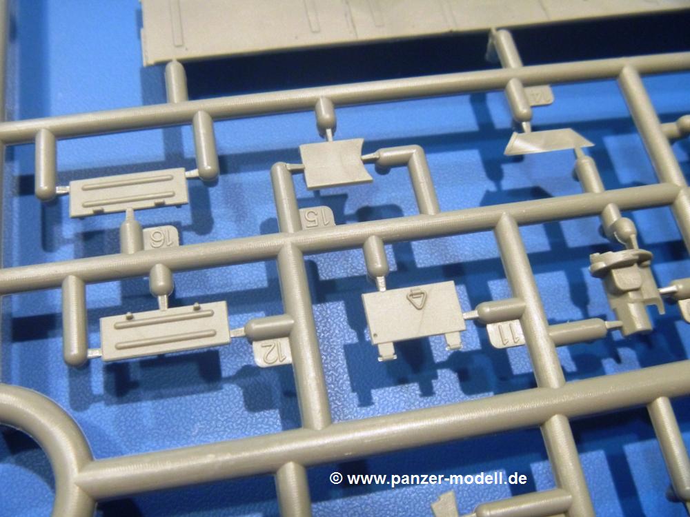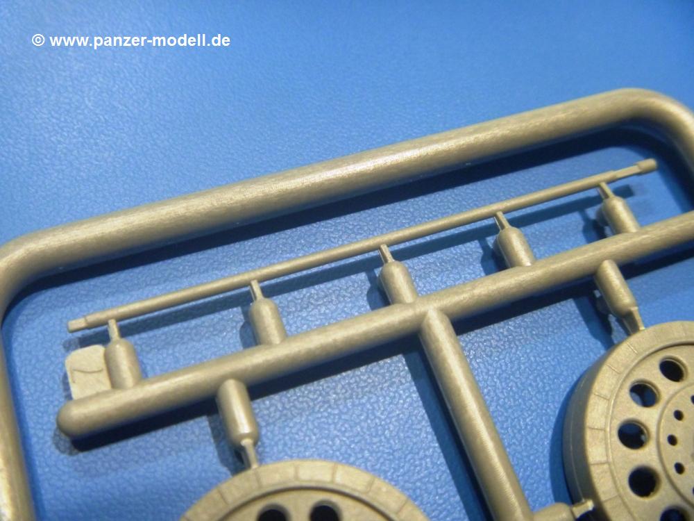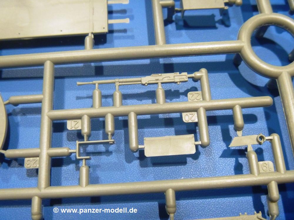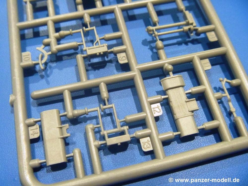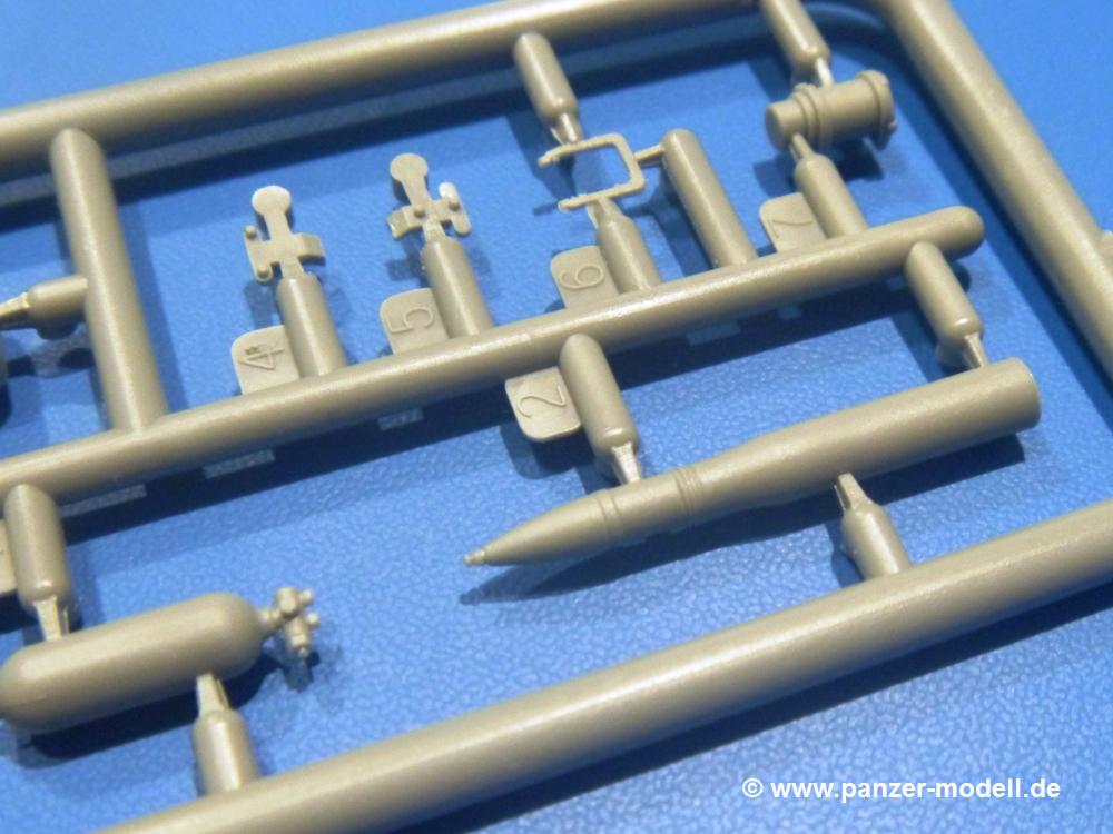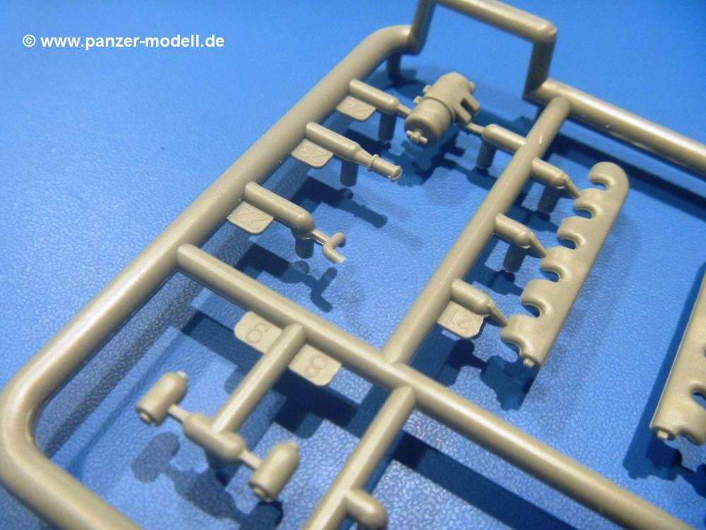 Die Teile aus hellgrauem Plastik sind sauber gespritzt, ohne Verzug und Versatz, hier und da minimaler Grat, keine Fischhäute. Auswerferspuren sind kaum zu sehen und nur auf Innenseiten von Teilen vorhanden, so dass sie beim Zusammenbau verschwinden, ohne das man sie wegschleifen und verspachteln müsste. Viel Vorsicht muss man aufwenden, um manche filigrane Teile wie Gestänge und Leitungen zerstörungsfrei von den Spritzlingen zu lösen.Was wird nun geboten? "Jede Menge!" kann man schon zu Anfang sagen. Separate Drehstäbe, Schwingarmlager, Schwingarme und die Notausstiegluke finden ihren Platz im Wannenboden. Neben der Notausstiegsluke findet man auch Öffnung und Verschlussdeckel zum Grabenbeschuss. Die 5 Bodenbleche des Kampfraumbodens sind sehr schön wiedergegeben. Der Fahrerplatz ist mit Lenk-, Schalthebeln, Pedalen und mehrteiligem Fahrersitz ausgestattet. Rechts vom Fahrer findet man einen großen Staukasten, an den der Munitionsbunker für 20 Schuss separate 100 mm Munition angrenzt. An die Wanneninnenwände werden so einige Instrumente, Munitions-, Schalt- und Staukästen angebaut. Auch weitere 100 mm Munition und eine Feuerlöschanlage gibt es. Dazu kommt ein separater Handfeuerlöscher.Der 12-Zylinder V-Dieselmotor enthält viele Details wie die Einspritzpumpe, Ein- und Auslasskanäle, Lichtmaschine, Anlasser, Luftfilterkasten mit untergebautem Zyklonluftfilter, Anlasskompressor, Kraftstofffilter, Turbo und verschiedene Leitungen. Nur die Einspritzleitungen von der Einspritzpumpe zu den Düsen muss man selbst (z.B. aus feinem Draht) herstellen. Die Motortrennwand ist schon gut detailliert. Zusätzliche Teile sind ein MG-Munitionsbehälter, eine 100 mm Patrone, ein Schaltkasten. Das Gimmick hier ist der Kampfraumlüfter mit dem PE-Gitter.Auch im Turm wurde kein Detail ausgelassen. Rohrbremsen, Verschlussblock und Hülsenabweiser erwartet man auf alle Fälle. Der Verschluss als separates Teil erlaubt das Einlegen von 100 mm Munition, Bediengestänge ist vorhanden. Höhen- und Seitenrichtmaschine sind samt ihrer Elektromotoren sauber wiedergegeben. Die Sitze der Besatzung sind ebenso da wie die Munitionshalterungen samt der separaten Munition und dem Funkgerät. Das koaxiale MG mit Munitions- und Hülsenfangkasten ist reichlich detailliert. Das Zielfernrohr des Richtschützen und die Nachtsichtoptik sind schon kleine Bausätze für sich. Wenn ich mit nicht verzählt habe, kommen bei der Kommandantenluke je nach Variation bis zu 29(!) Teile zusammen - Winkelspiegel, Scheibenwischer, Bediengriffe, Suchscheinwerfer etc.Auch Außen ist so einiges los. Für die Kraftstofftanks auf den Kettenabdeckungen gibt es separate Leitungen. Den Wetterschutz für den Fahrer kann man aufgebaut mit Glaseinsatz, Scheibenwischer und Bedienhebel dafür aufbauen oder zusammengefaltet auf der gerollten Plane am Turmheck platzieren. Die Plane wird von PE-Bändern gehalten. Das Fla-MG setzt sich aus fast 30 Teilen zusammen. Hier gibt es auch ein Stück Munitionsgurt. Die Kanonenblende kann man wahlweise ohne oder mit Blendenplane einbauen. Je nach Wahl unterscheidet sich dann der Anbau des Schießscheinwerfers. Entscheidet man sich für die Nachtkampfvariante des Scheinwerfers, darf man innen auch eine Glühlampe aus Klarsichtmaterial einsetzen. Apropos Nachtkampfvariante - die Bauanleitung gibt dafür Optionen vor. Für den Nachtkampf also offene Such- und Schießscheinwerfer und eingebaute Nachtkampfoptik oder für den Tagkampf mit Deckeln verschlossen.Für das Fahrgestell gilt, wenn man die Schwingarme nicht feststellt, bleibt es beweglich, so dass man es z.B. an Dioramengelände anpassen kann. Die Einzelgliederkette kommt einem da entgegen. Wirft man einen genaueren Blick auf die Glieder, wird man die feinen Gussnummern erkennen. Bei den Laufrollen hat man die Wahl zwischen den älteren Spinnennetzrädern oder den moderneren 5-Speichenrädern. Der Bemalungsplan zeigt den T-54 aber immer nur mit 5-Speichenrädern.Es sind Abziehbilder (Decals) für 4 Versionen dabei.