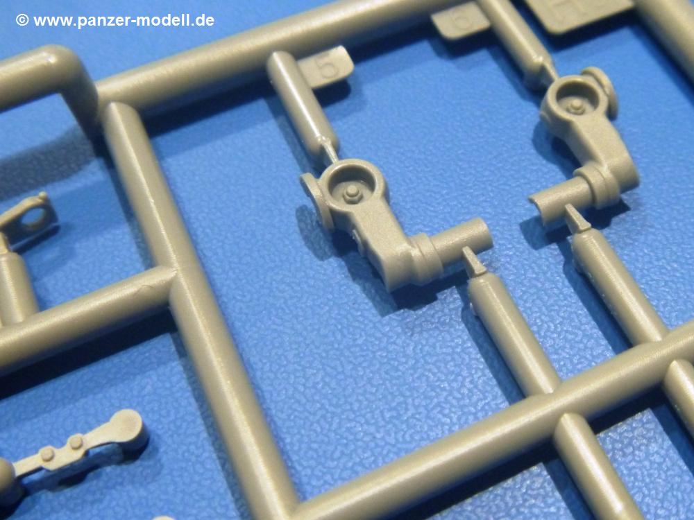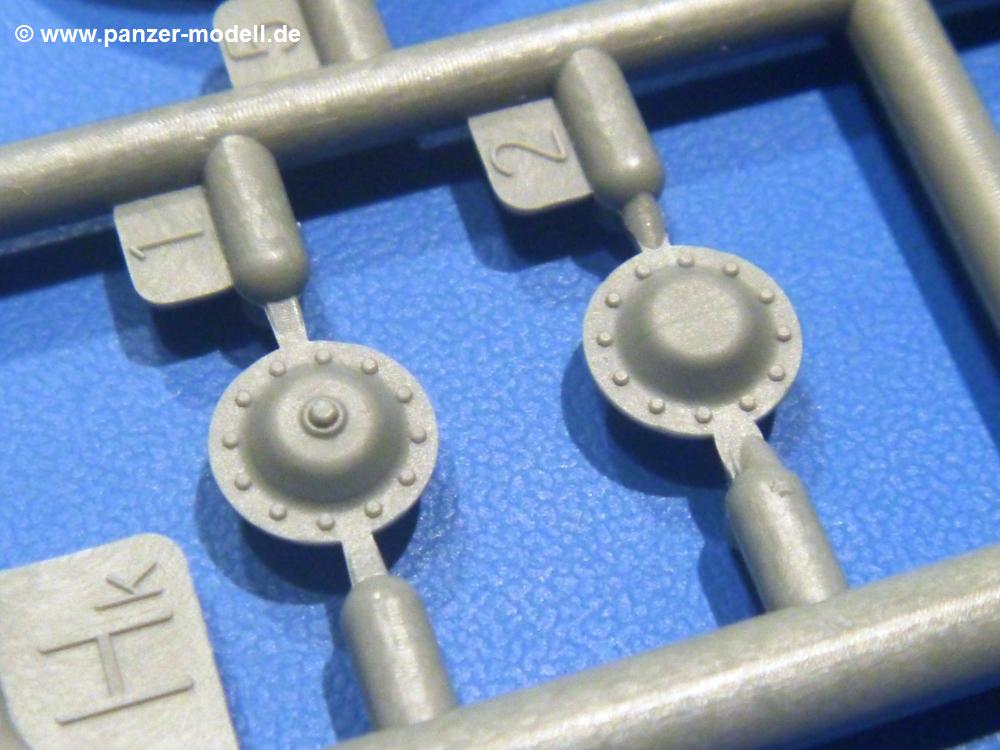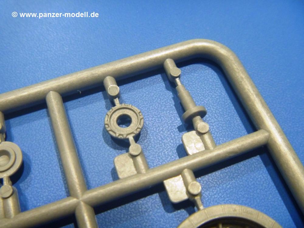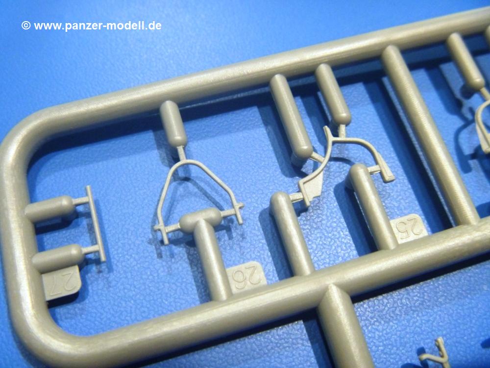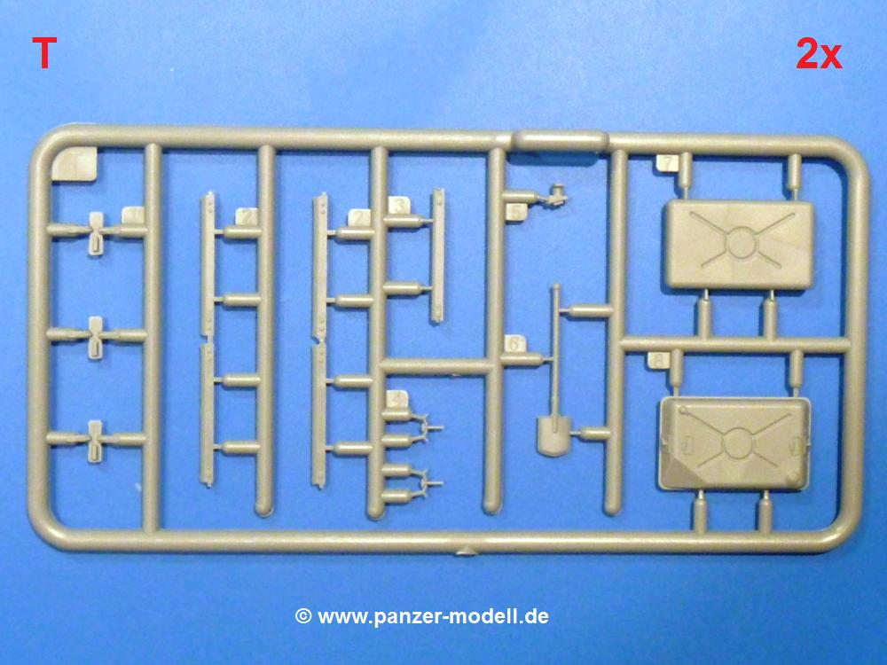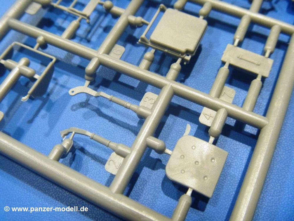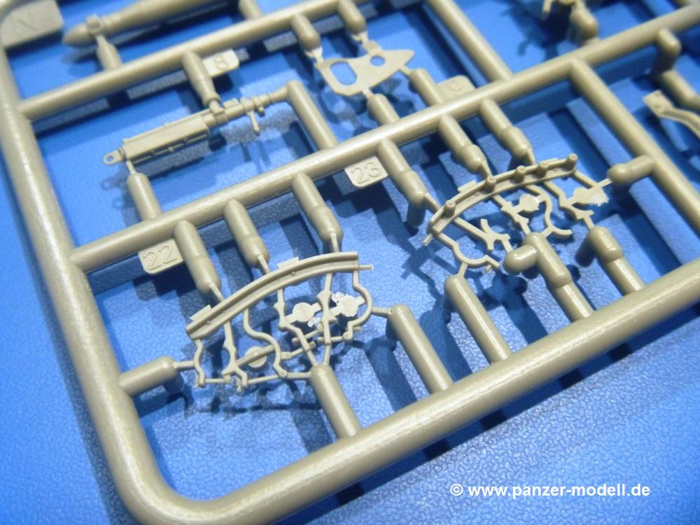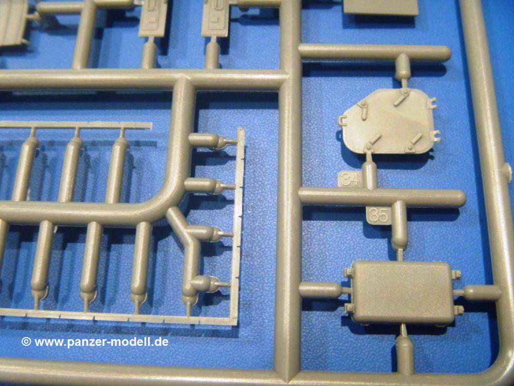 Die Teile aus hellgrauem Plastik sind sauber gespritzt, ohne Verzug und Versatz, hier und da minimaler Grat, keine Fischhäute. Auswerferspuren sind kaum zu sehen und nur auf Innenseiten von Teilen vorhanden, so dass sie beim Zusammenbau verschwinden, ohne das man sie wegschleifen und verspachteln müsste. Viel Vorsicht muss man aufwenden, um manche filigrane Teile wie Gestänge und Leitungen zerstörungsfrei von den Spritzlingen zu lösen.Was wird nun geboten? "Jede Menge!" kann man schon zu Anfang sagen. Separate Drehstäbe, Schwingarmlager, Schwingarme und die Notausstiegluke finden ihren Platz im Wannenboden. Neben der Notausstiegsluke findet man auch Öffnung und Verschlussdeckel zum Grabenbeschuss. Die 5 Bodenbleche des Kampfraumbodens sind sehr schön wiedergegeben. Der Fahrerplatz ist mit Lenk-, Schalthebeln, Pedalen und mehrteiligem Fahrersitz ausgestattet. Rechts vom Fahrer findet man einen großen Staukasten, an den der Munitionsbunker für 20 Schuss separate 100 mm Munition angrenzt. An die Wanneninnenwände werden so einige Instrumente, Munitions-, Schalt- und Staukästen angebaut. Auch weitere 100 mm Munition und eine Feuerlöschanlage gibt es. Dazu kommt ein separater Handfeuerlöscher.Der 12-Zylinder V-Dieselmotor enthält viele Details wie die Einspritzpumpe, Ein- und Auslasskanäle, Lichtmaschine, Anlasser, Luftfilterkasten mit untergebautem Zyklonluftfilter, Anlasskompressor, Kraftstofffilter, Turbo und verschiedene Leitungen. Nur die Einspritzleitungen von der Einspritzpumpe zu den Düsen muss man selbst (z.B. aus feinem Draht) herstellen. Die Motortrennwand ist schon gut detailliert. Zusätzliche Teile sind ein MG-Munitionsbehälter, eine 100 mm Patrone, ein Schaltkasten. Das Gimmick hier ist der Kampfraumlüfter mit dem PE-Gitter.Auch im Turm wurde kein Detail ausgelassen. Rohrbremsen, Verschlussblock und Hülsenabweiser erwartet man auf alle Fälle. Der Verschluss als separates Teil erlaubt das Einlegen von 100 mm Munition, Bediengestänge ist vorhanden. Höhen- und Seitenrichtmaschine sind samt ihrer Elektromotoren sauber wiedergegeben. Die Sitze der Besatzung sind ebenso da wie die Munitionshalterungen samt der separaten Munition und dem Funkgerät. Das koaxiale MG mit Munitions- und Hülsenfangkasten ist reichlich detailliert. Das Zielfernrohr des Richtschützen und die Nachtsichtoptik sind schon kleine Bausätze für sich. Wenn ich mit nicht verzählt habe, kommen bei der Kommandantenluke je nach Variation bis zu 29(!) Teile zusammen - Winkelspiegel, Scheibenwischer, Bediengriffe, Suchscheinwerfer etc.Auch Außen ist so einiges los. Für die Kraftstofftanks auf den Kettenabdeckungen gibt es separate Leitungen. Den Wetterschutz für den Fahrer kann man aufgebaut mit Glaseinsatz, Scheibenwischer und Bedienhebel dafür aufbauen oder zusammengefaltet auf der gerollten Plane am Turmheck platzieren. Die Plane wird von PE-Bändern gehalten. Das Fla-MG setzt sich aus fast 30 Teilen zusammen. Hier gibt es auch ein Stück Munitionsgurt. Die Kanonenblende kann man wahlweise ohne oder mit Blendenplane einbauen. Je nach Wahl unterscheidet sich dann der Anbau des Schießscheinwerfers. Entscheidet man sich für die Nachtkampfvariante des Scheinwerfers, darf man innen auch eine Glühlampe aus Klarsichtmaterial einsetzen. Apropos Nachtkampfvariante - die Bauanleitung gibt dafür Optionen vor. Für den Nachtkampf also offene Such- und Schießscheinwerfer und eingebaute Nachtkampfoptik oder für den Tagkampf mit Deckeln verschlossen.Für das Fahrgestell gilt, wenn man die Schwingarme nicht feststellt, bleibt es beweglich, so dass man es z.B. an Dioramengelände anpassen kann. Die Einzelgliederkette kommt einem da entgegen. Wirft man einen genaueren Blick auf die Glieder, wird man die feinen Gussnummern erkennen. Bei den Laufrollen hat man die Wahl zwischen den älteren Spinnennetzrädern oder den moderneren 5-Speichenrädern. Der Bemalungsplan zeigt den T-54 aber immer nur mit 5-Speichenrädern.Es sind Abziehbilder (Decals) für 4 Versionen dabei.