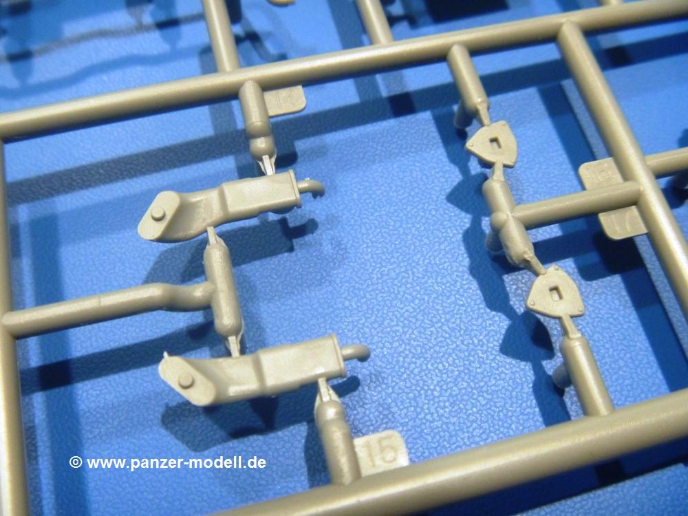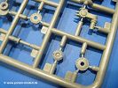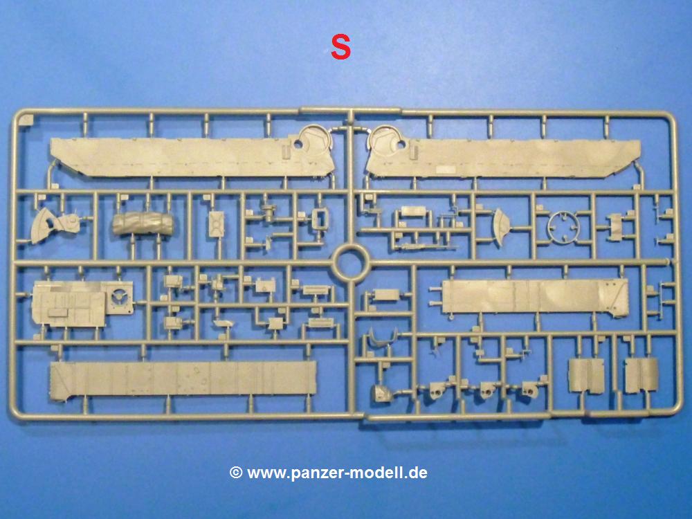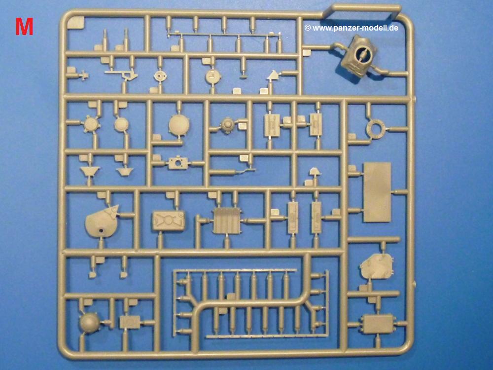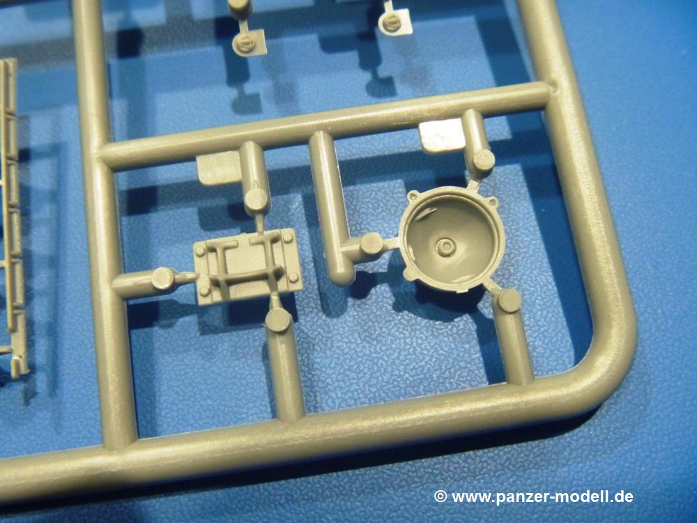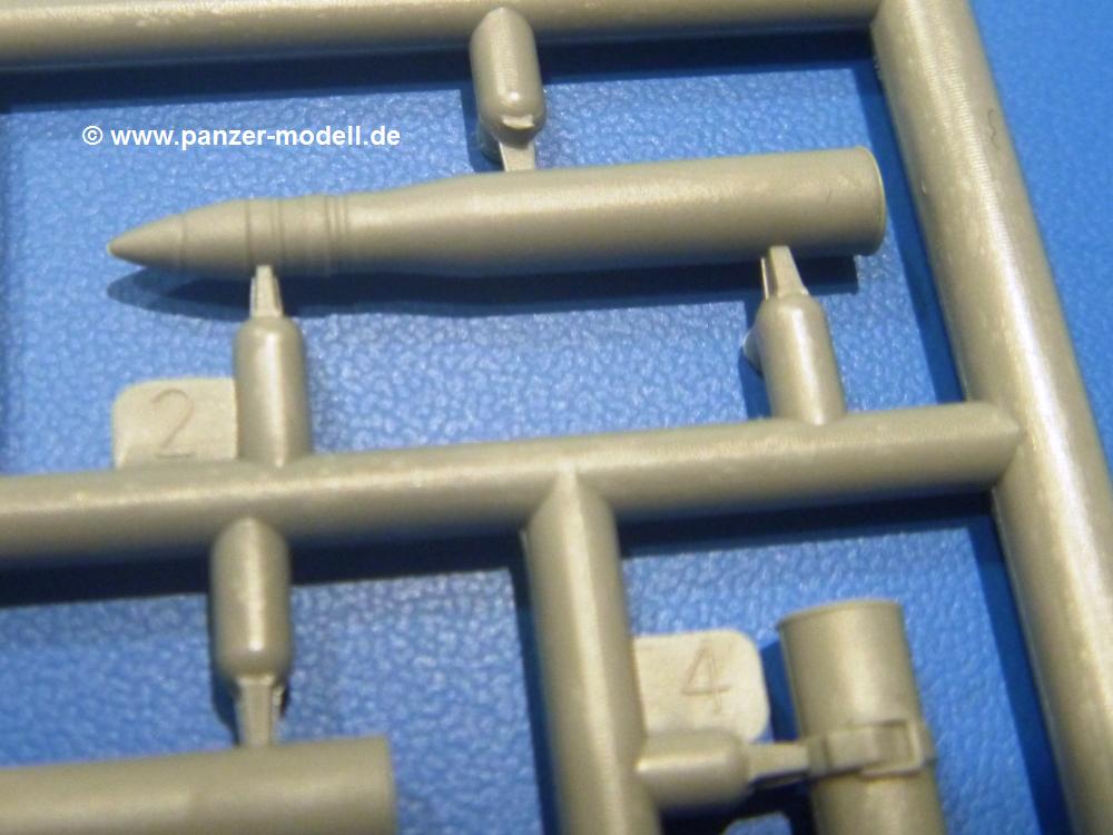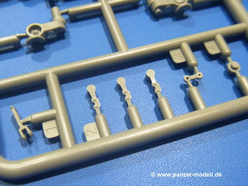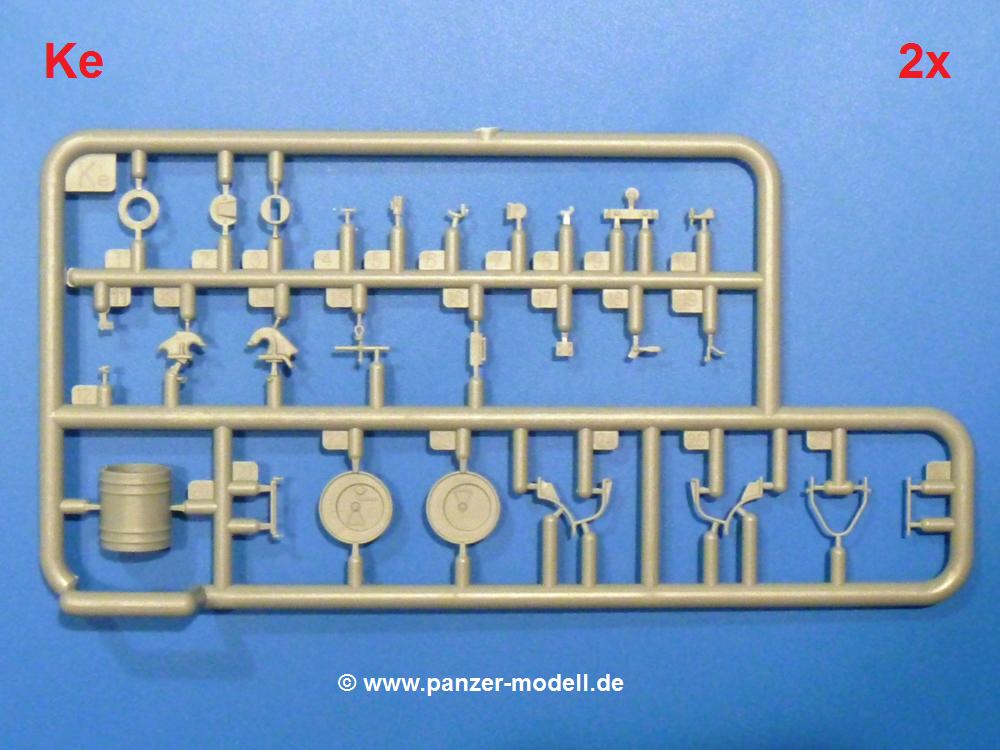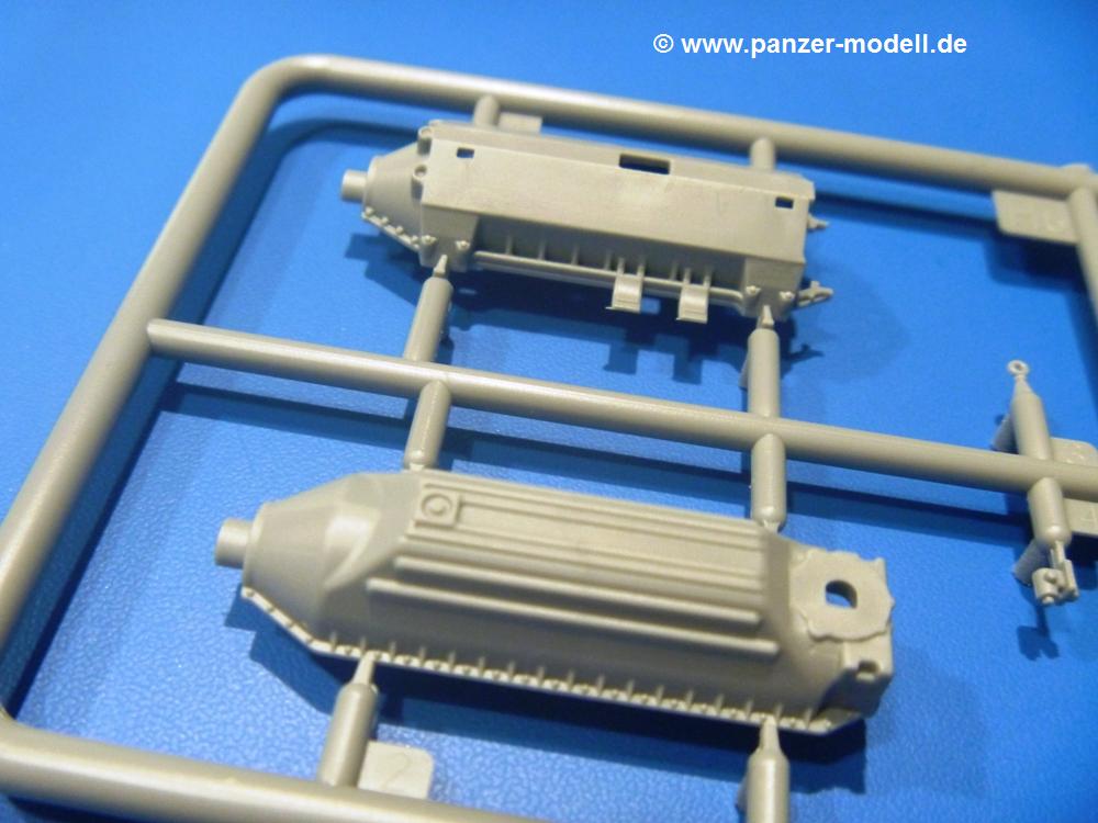 Die Teile aus hellgrauem Plastik sind sauber gespritzt, ohne Verzug und Versatz, hier und da minimaler Grat, keine Fischhäute. Auswerferspuren sind kaum zu sehen und nur auf Innenseiten von Teilen vorhanden, so dass sie beim Zusammenbau verschwinden, ohne das man sie wegschleifen und verspachteln müsste. Viel Vorsicht muss man aufwenden, um manche filigrane Teile wie Gestänge und Leitungen zerstörungsfrei von den Spritzlingen zu lösen.Was wird nun geboten? "Jede Menge!" kann man schon zu Anfang sagen. Separate Drehstäbe, Schwingarmlager, Schwingarme und die Notausstiegluke finden ihren Platz im Wannenboden. Neben der Notausstiegsluke findet man auch Öffnung und Verschlussdeckel zum Grabenbeschuss. Die 5 Bodenbleche des Kampfraumbodens sind sehr schön wiedergegeben. Der Fahrerplatz ist mit Lenk-, Schalthebeln, Pedalen und mehrteiligem Fahrersitz ausgestattet. Rechts vom Fahrer findet man einen großen Staukasten, an den der Munitionsbunker für 20 Schuss separate 100 mm Munition angrenzt. An die Wanneninnenwände werden so einige Instrumente, Munitions-, Schalt- und Staukästen angebaut. Auch weitere 100 mm Munition und eine Feuerlöschanlage gibt es. Dazu kommt ein separater Handfeuerlöscher.Der 12-Zylinder V-Dieselmotor enthält viele Details wie die Einspritzpumpe, Ein- und Auslasskanäle, Lichtmaschine, Anlasser, Luftfilterkasten mit untergebautem Zyklonluftfilter, Anlasskompressor, Kraftstofffilter, Turbo und verschiedene Leitungen. Nur die Einspritzleitungen von der Einspritzpumpe zu den Düsen muss man selbst (z.B. aus feinem Draht) herstellen. Die Motortrennwand ist schon gut detailliert. Zusätzliche Teile sind ein MG-Munitionsbehälter, eine 100 mm Patrone, ein Schaltkasten. Das Gimmick hier ist der Kampfraumlüfter mit dem PE-Gitter.Auch im Turm wurde kein Detail ausgelassen. Rohrbremsen, Verschlussblock und Hülsenabweiser erwartet man auf alle Fälle. Der Verschluss als separates Teil erlaubt das Einlegen von 100 mm Munition, Bediengestänge ist vorhanden. Höhen- und Seitenrichtmaschine sind samt ihrer Elektromotoren sauber wiedergegeben. Die Sitze der Besatzung sind ebenso da wie die Munitionshalterungen samt der separaten Munition und dem Funkgerät. Das koaxiale MG mit Munitions- und Hülsenfangkasten ist reichlich detailliert. Das Zielfernrohr des Richtschützen und die Nachtsichtoptik sind schon kleine Bausätze für sich. Wenn ich mit nicht verzählt habe, kommen bei der Kommandantenluke je nach Variation bis zu 29(!) Teile zusammen - Winkelspiegel, Scheibenwischer, Bediengriffe, Suchscheinwerfer etc.Auch Außen ist so einiges los. Für die Kraftstofftanks auf den Kettenabdeckungen gibt es separate Leitungen. Den Wetterschutz für den Fahrer kann man aufgebaut mit Glaseinsatz, Scheibenwischer und Bedienhebel dafür aufbauen oder zusammengefaltet auf der gerollten Plane am Turmheck platzieren. Die Plane wird von PE-Bändern gehalten. Das Fla-MG setzt sich aus fast 30 Teilen zusammen. Hier gibt es auch ein Stück Munitionsgurt. Die Kanonenblende kann man wahlweise ohne oder mit Blendenplane einbauen. Je nach Wahl unterscheidet sich dann der Anbau des Schießscheinwerfers. Entscheidet man sich für die Nachtkampfvariante des Scheinwerfers, darf man innen auch eine Glühlampe aus Klarsichtmaterial einsetzen. Apropos Nachtkampfvariante - die Bauanleitung gibt dafür Optionen vor. Für den Nachtkampf also offene Such- und Schießscheinwerfer und eingebaute Nachtkampfoptik oder für den Tagkampf mit Deckeln verschlossen.Für das Fahrgestell gilt, wenn man die Schwingarme nicht feststellt, bleibt es beweglich, so dass man es z.B. an Dioramengelände anpassen kann. Die Einzelgliederkette kommt einem da entgegen. Wirft man einen genaueren Blick auf die Glieder, wird man die feinen Gussnummern erkennen. Bei den Laufrollen hat man die Wahl zwischen den älteren Spinnennetzrädern oder den moderneren 5-Speichenrädern. Der Bemalungsplan zeigt den T-54 aber immer nur mit 5-Speichenrädern.Es sind Abziehbilder (Decals) für 4 Versionen dabei.