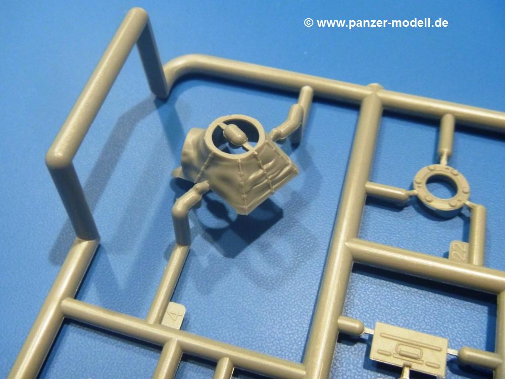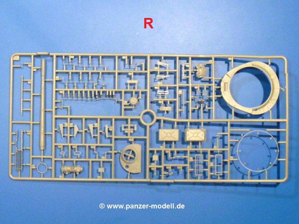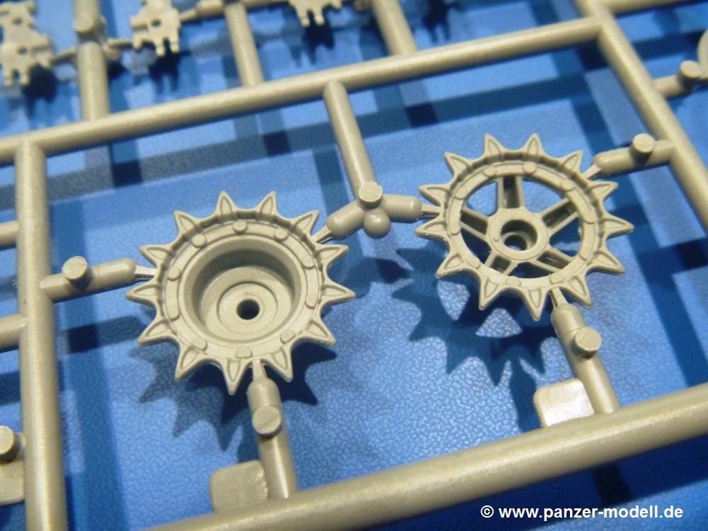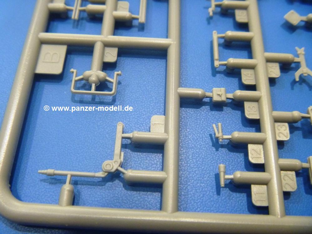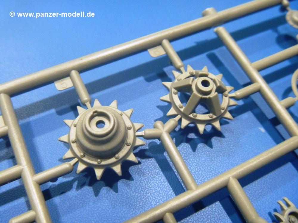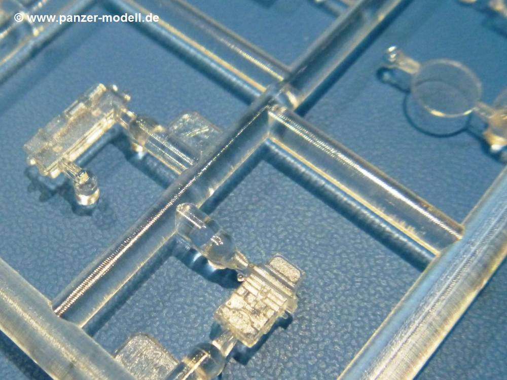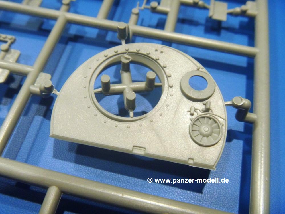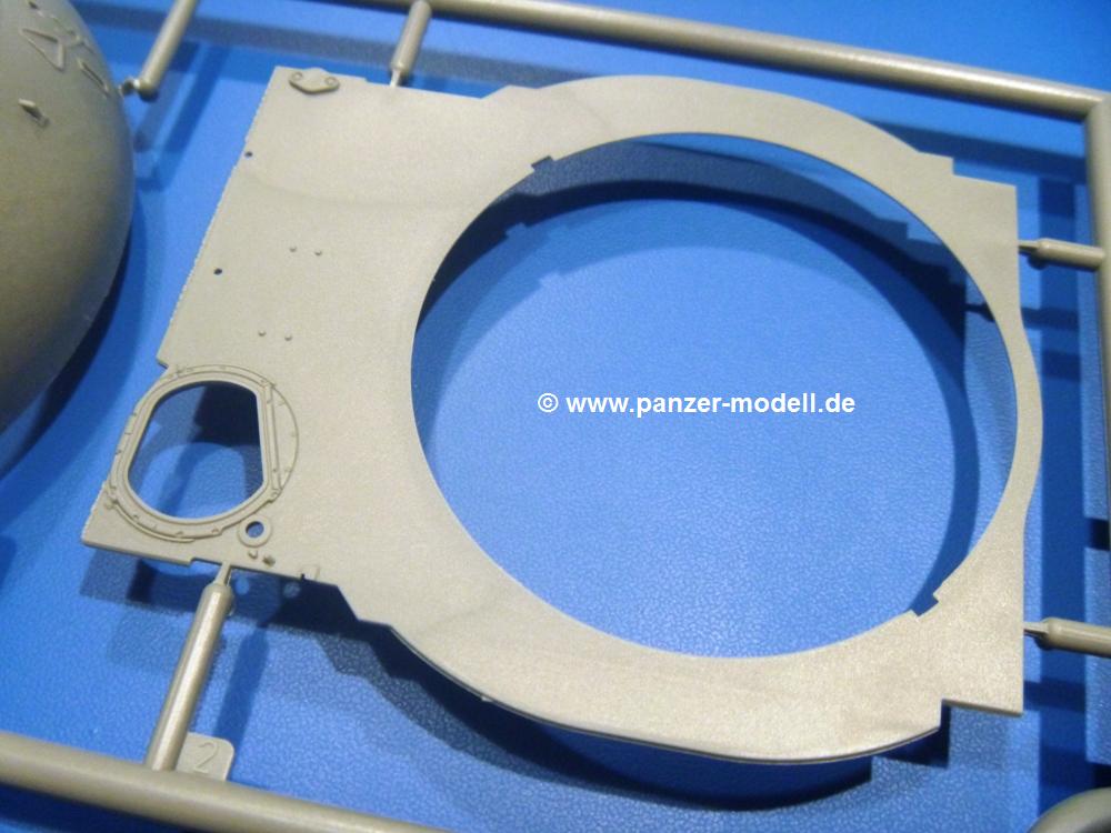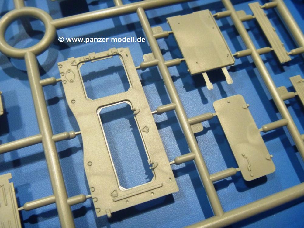 Die Teile aus hellgrauem Plastik sind sauber gespritzt, ohne Verzug und Versatz, hier und da minimaler Grat, keine Fischhäute. Auswerferspuren sind kaum zu sehen und nur auf Innenseiten von Teilen vorhanden, so dass sie beim Zusammenbau verschwinden, ohne das man sie wegschleifen und verspachteln müsste. Viel Vorsicht muss man aufwenden, um manche filigrane Teile wie Gestänge und Leitungen zerstörungsfrei von den Spritzlingen zu lösen.Was wird nun geboten? "Jede Menge!" kann man schon zu Anfang sagen. Separate Drehstäbe, Schwingarmlager, Schwingarme und die Notausstiegluke finden ihren Platz im Wannenboden. Neben der Notausstiegsluke findet man auch Öffnung und Verschlussdeckel zum Grabenbeschuss. Die 5 Bodenbleche des Kampfraumbodens sind sehr schön wiedergegeben. Der Fahrerplatz ist mit Lenk-, Schalthebeln, Pedalen und mehrteiligem Fahrersitz ausgestattet. Rechts vom Fahrer findet man einen großen Staukasten, an den der Munitionsbunker für 20 Schuss separate 100 mm Munition angrenzt. An die Wanneninnenwände werden so einige Instrumente, Munitions-, Schalt- und Staukästen angebaut. Auch weitere 100 mm Munition und eine Feuerlöschanlage gibt es. Dazu kommt ein separater Handfeuerlöscher.Der 12-Zylinder V-Dieselmotor enthält viele Details wie die Einspritzpumpe, Ein- und Auslasskanäle, Lichtmaschine, Anlasser, Luftfilterkasten mit untergebautem Zyklonluftfilter, Anlasskompressor, Kraftstofffilter, Turbo und verschiedene Leitungen. Nur die Einspritzleitungen von der Einspritzpumpe zu den Düsen muss man selbst (z.B. aus feinem Draht) herstellen. Die Motortrennwand ist schon gut detailliert. Zusätzliche Teile sind ein MG-Munitionsbehälter, eine 100 mm Patrone, ein Schaltkasten. Das Gimmick hier ist der Kampfraumlüfter mit dem PE-Gitter.Auch im Turm wurde kein Detail ausgelassen. Rohrbremsen, Verschlussblock und Hülsenabweiser erwartet man auf alle Fälle. Der Verschluss als separates Teil erlaubt das Einlegen von 100 mm Munition, Bediengestänge ist vorhanden. Höhen- und Seitenrichtmaschine sind samt ihrer Elektromotoren sauber wiedergegeben. Die Sitze der Besatzung sind ebenso da wie die Munitionshalterungen samt der separaten Munition und dem Funkgerät. Das koaxiale MG mit Munitions- und Hülsenfangkasten ist reichlich detailliert. Das Zielfernrohr des Richtschützen und die Nachtsichtoptik sind schon kleine Bausätze für sich. Wenn ich mit nicht verzählt habe, kommen bei der Kommandantenluke je nach Variation bis zu 29(!) Teile zusammen - Winkelspiegel, Scheibenwischer, Bediengriffe, Suchscheinwerfer etc.Auch Außen ist so einiges los. Für die Kraftstofftanks auf den Kettenabdeckungen gibt es separate Leitungen. Den Wetterschutz für den Fahrer kann man aufgebaut mit Glaseinsatz, Scheibenwischer und Bedienhebel dafür aufbauen oder zusammengefaltet auf der gerollten Plane am Turmheck platzieren. Die Plane wird von PE-Bändern gehalten. Das Fla-MG setzt sich aus fast 30 Teilen zusammen. Hier gibt es auch ein Stück Munitionsgurt. Die Kanonenblende kann man wahlweise ohne oder mit Blendenplane einbauen. Je nach Wahl unterscheidet sich dann der Anbau des Schießscheinwerfers. Entscheidet man sich für die Nachtkampfvariante des Scheinwerfers, darf man innen auch eine Glühlampe aus Klarsichtmaterial einsetzen. Apropos Nachtkampfvariante - die Bauanleitung gibt dafür Optionen vor. Für den Nachtkampf also offene Such- und Schießscheinwerfer und eingebaute Nachtkampfoptik oder für den Tagkampf mit Deckeln verschlossen.Für das Fahrgestell gilt, wenn man die Schwingarme nicht feststellt, bleibt es beweglich, so dass man es z.B. an Dioramengelände anpassen kann. Die Einzelgliederkette kommt einem da entgegen. Wirft man einen genaueren Blick auf die Glieder, wird man die feinen Gussnummern erkennen. Bei den Laufrollen hat man die Wahl zwischen den älteren Spinnennetzrädern oder den moderneren 5-Speichenrädern. Der Bemalungsplan zeigt den T-54 aber immer nur mit 5-Speichenrädern.Es sind Abziehbilder (Decals) für 4 Versionen dabei.