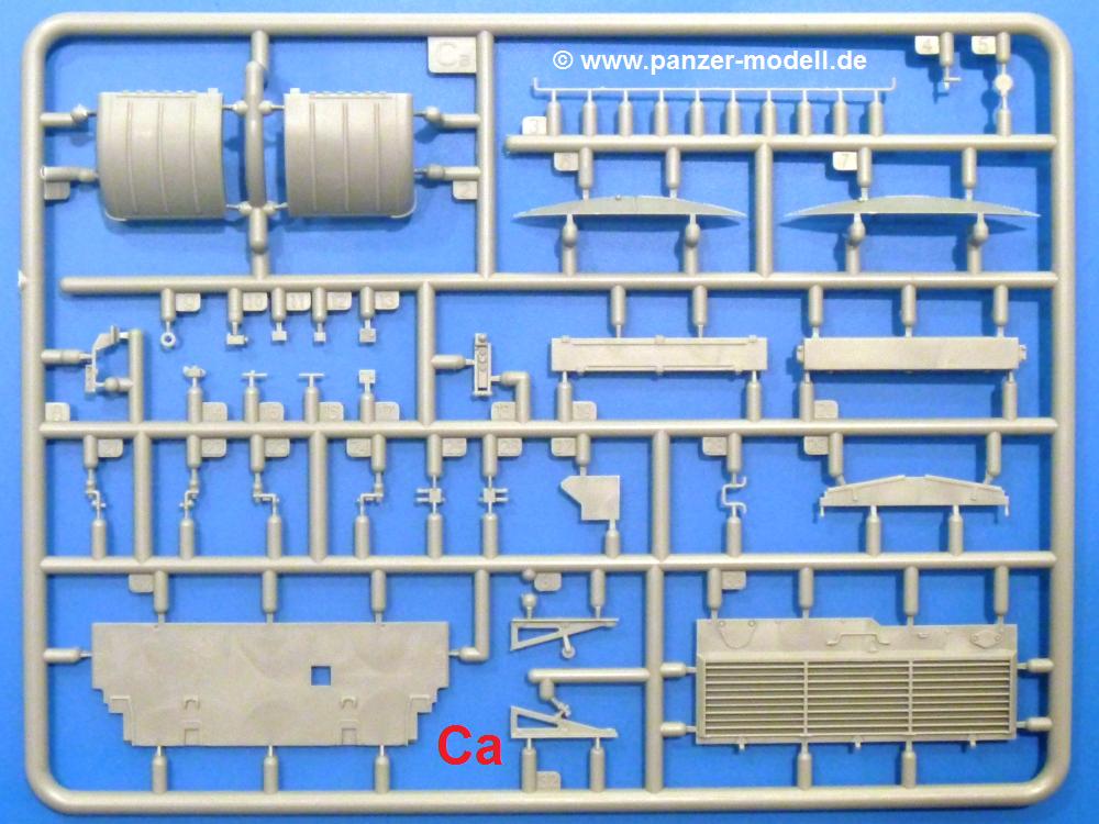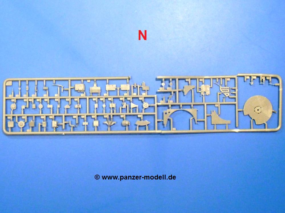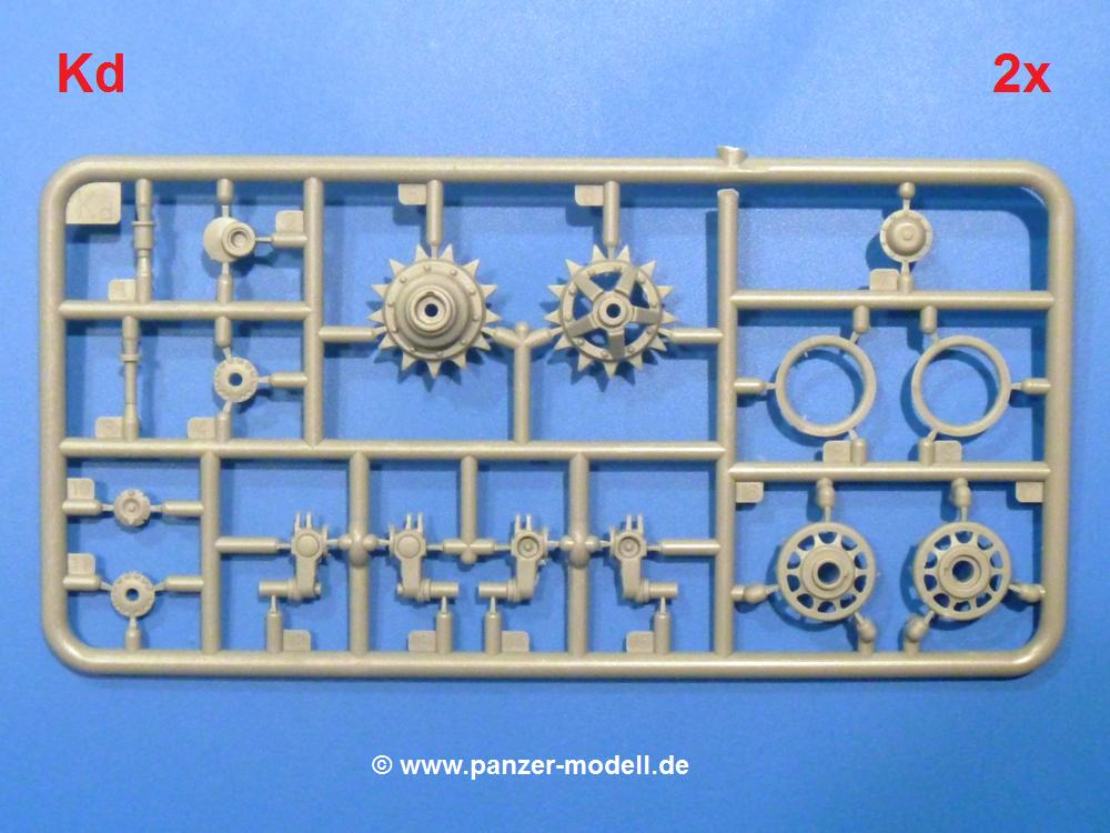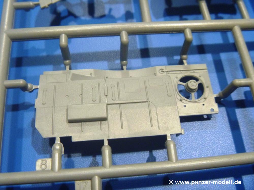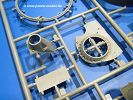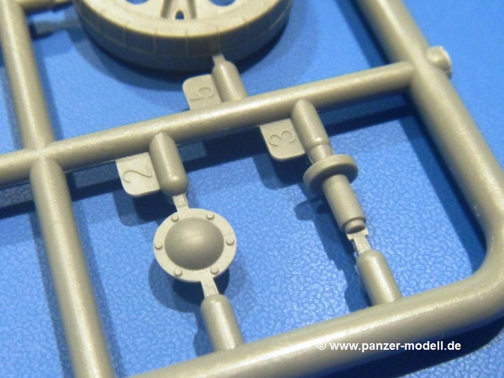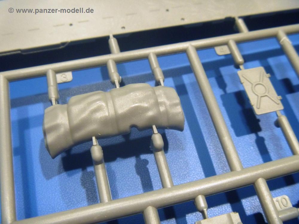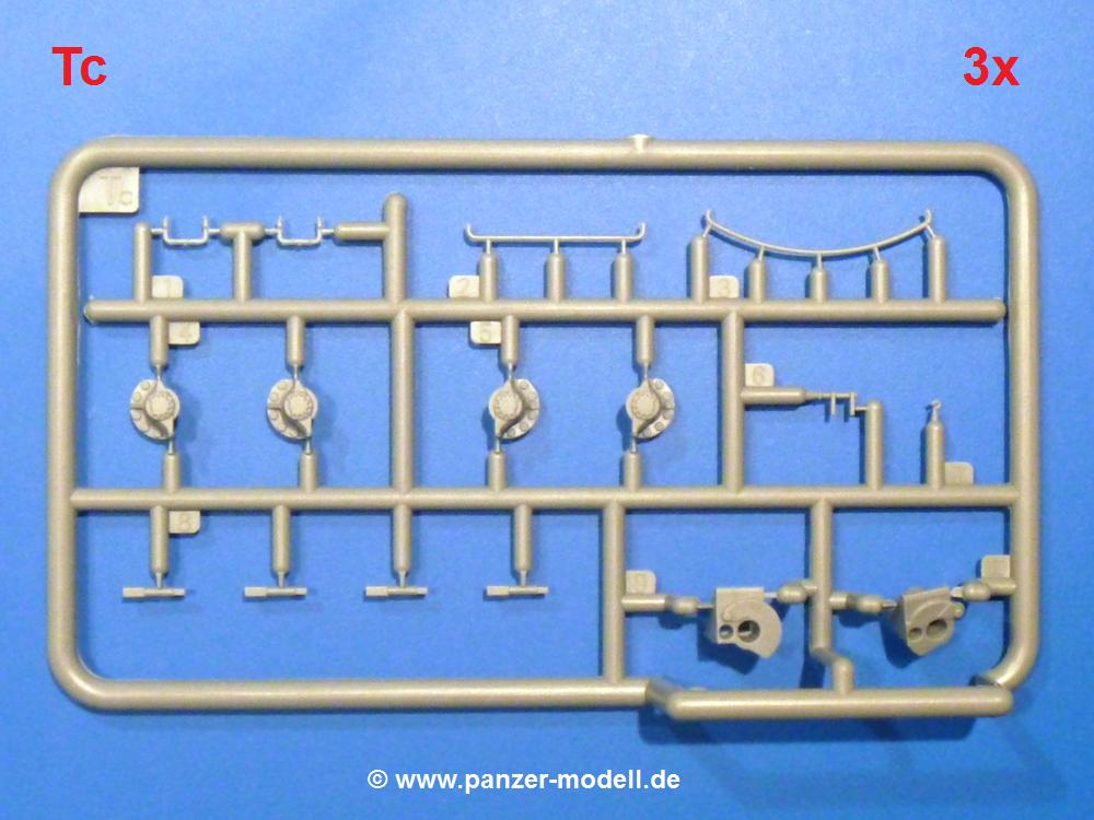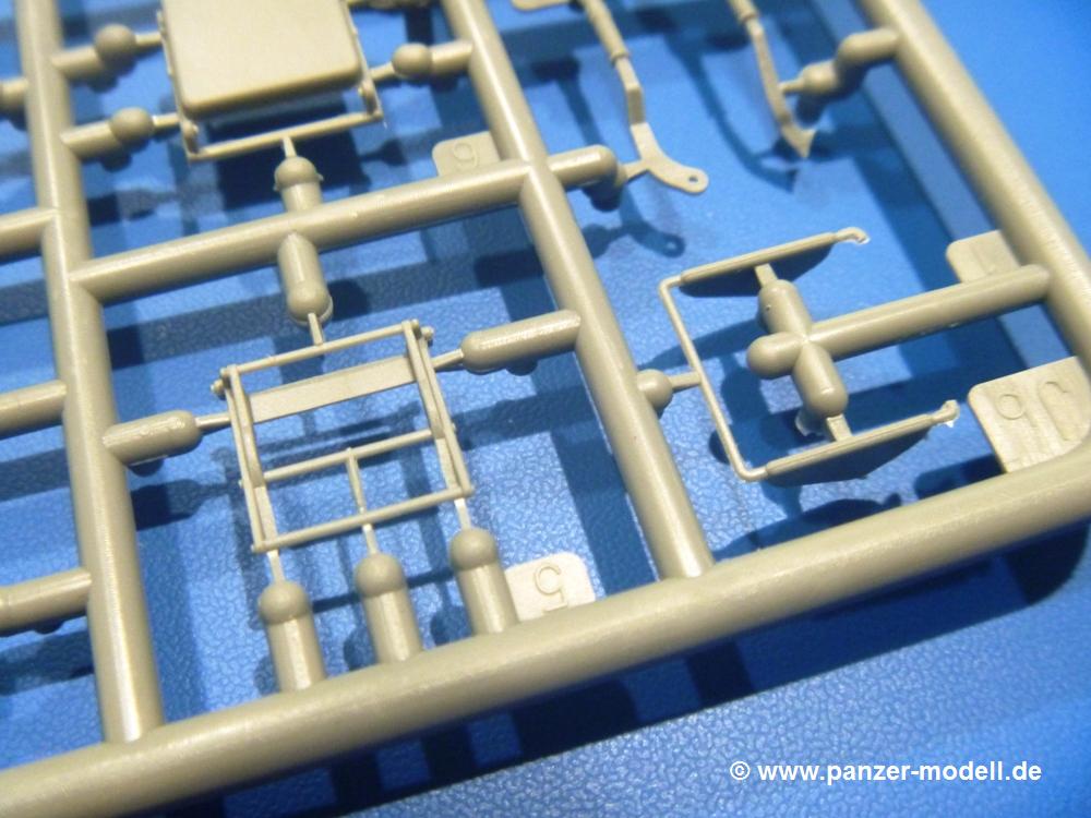 Die Teile aus hellgrauem Plastik sind sauber gespritzt, ohne Verzug und Versatz, hier und da minimaler Grat, keine Fischhäute. Auswerferspuren sind kaum zu sehen und nur auf Innenseiten von Teilen vorhanden, so dass sie beim Zusammenbau verschwinden, ohne das man sie wegschleifen und verspachteln müsste. Viel Vorsicht muss man aufwenden, um manche filigrane Teile wie Gestänge und Leitungen zerstörungsfrei von den Spritzlingen zu lösen.Was wird nun geboten? "Jede Menge!" kann man schon zu Anfang sagen. Separate Drehstäbe, Schwingarmlager, Schwingarme und die Notausstiegluke finden ihren Platz im Wannenboden. Neben der Notausstiegsluke findet man auch Öffnung und Verschlussdeckel zum Grabenbeschuss. Die 5 Bodenbleche des Kampfraumbodens sind sehr schön wiedergegeben. Der Fahrerplatz ist mit Lenk-, Schalthebeln, Pedalen und mehrteiligem Fahrersitz ausgestattet. Rechts vom Fahrer findet man einen großen Staukasten, an den der Munitionsbunker für 20 Schuss separate 100 mm Munition angrenzt. An die Wanneninnenwände werden so einige Instrumente, Munitions-, Schalt- und Staukästen angebaut. Auch weitere 100 mm Munition und eine Feuerlöschanlage gibt es. Dazu kommt ein separater Handfeuerlöscher.Der 12-Zylinder V-Dieselmotor enthält viele Details wie die Einspritzpumpe, Ein- und Auslasskanäle, Lichtmaschine, Anlasser, Luftfilterkasten mit untergebautem Zyklonluftfilter, Anlasskompressor, Kraftstofffilter, Turbo und verschiedene Leitungen. Nur die Einspritzleitungen von der Einspritzpumpe zu den Düsen muss man selbst (z.B. aus feinem Draht) herstellen. Die Motortrennwand ist schon gut detailliert. Zusätzliche Teile sind ein MG-Munitionsbehälter, eine 100 mm Patrone, ein Schaltkasten. Das Gimmick hier ist der Kampfraumlüfter mit dem PE-Gitter.Auch im Turm wurde kein Detail ausgelassen. Rohrbremsen, Verschlussblock und Hülsenabweiser erwartet man auf alle Fälle. Der Verschluss als separates Teil erlaubt das Einlegen von 100 mm Munition, Bediengestänge ist vorhanden. Höhen- und Seitenrichtmaschine sind samt ihrer Elektromotoren sauber wiedergegeben. Die Sitze der Besatzung sind ebenso da wie die Munitionshalterungen samt der separaten Munition und dem Funkgerät. Das koaxiale MG mit Munitions- und Hülsenfangkasten ist reichlich detailliert. Das Zielfernrohr des Richtschützen und die Nachtsichtoptik sind schon kleine Bausätze für sich. Wenn ich mit nicht verzählt habe, kommen bei der Kommandantenluke je nach Variation bis zu 29(!) Teile zusammen - Winkelspiegel, Scheibenwischer, Bediengriffe, Suchscheinwerfer etc.Auch Außen ist so einiges los. Für die Kraftstofftanks auf den Kettenabdeckungen gibt es separate Leitungen. Den Wetterschutz für den Fahrer kann man aufgebaut mit Glaseinsatz, Scheibenwischer und Bedienhebel dafür aufbauen oder zusammengefaltet auf der gerollten Plane am Turmheck platzieren. Die Plane wird von PE-Bändern gehalten. Das Fla-MG setzt sich aus fast 30 Teilen zusammen. Hier gibt es auch ein Stück Munitionsgurt. Die Kanonenblende kann man wahlweise ohne oder mit Blendenplane einbauen. Je nach Wahl unterscheidet sich dann der Anbau des Schießscheinwerfers. Entscheidet man sich für die Nachtkampfvariante des Scheinwerfers, darf man innen auch eine Glühlampe aus Klarsichtmaterial einsetzen. Apropos Nachtkampfvariante - die Bauanleitung gibt dafür Optionen vor. Für den Nachtkampf also offene Such- und Schießscheinwerfer und eingebaute Nachtkampfoptik oder für den Tagkampf mit Deckeln verschlossen.Für das Fahrgestell gilt, wenn man die Schwingarme nicht feststellt, bleibt es beweglich, so dass man es z.B. an Dioramengelände anpassen kann. Die Einzelgliederkette kommt einem da entgegen. Wirft man einen genaueren Blick auf die Glieder, wird man die feinen Gussnummern erkennen. Bei den Laufrollen hat man die Wahl zwischen den älteren Spinnennetzrädern oder den moderneren 5-Speichenrädern. Der Bemalungsplan zeigt den T-54 aber immer nur mit 5-Speichenrädern.Es sind Abziehbilder (Decals) für 4 Versionen dabei.
