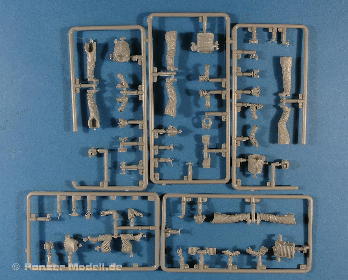 Im Karton dieses Bausatzes finden wir 5 Spritzlinge, also einen Spritzling pro Figur, die aus dem Bausatz baubar ist. Bundeswehrfiguren in Spritzguss sind derzeit noch relativ selten - umso erfreulicher, dass ein renommierter Hersteller sich dieses Themas annimmt.