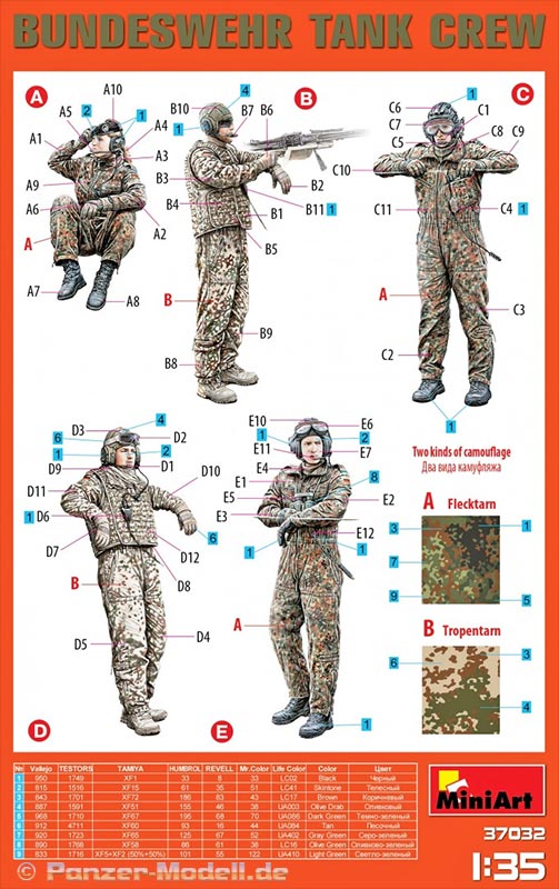 Die Anleitung zu Bau und Bemalung findet sich auf der Kartonrückseite und ist recht übersichtlich. Zusätzlich werden sowohl die Tarnmuster des Tropentarn und des Standard 5 Farb Flecktarn in einem kleinen Beispiel gezeigt. Die Farbangaben werden für Vallejo, Testors, Tamiya, Humbrol, Revell, Mr.Color und Lifecolor in einer übersichtlichen Liste mit den entsprechenden farbnummern gemacht. .