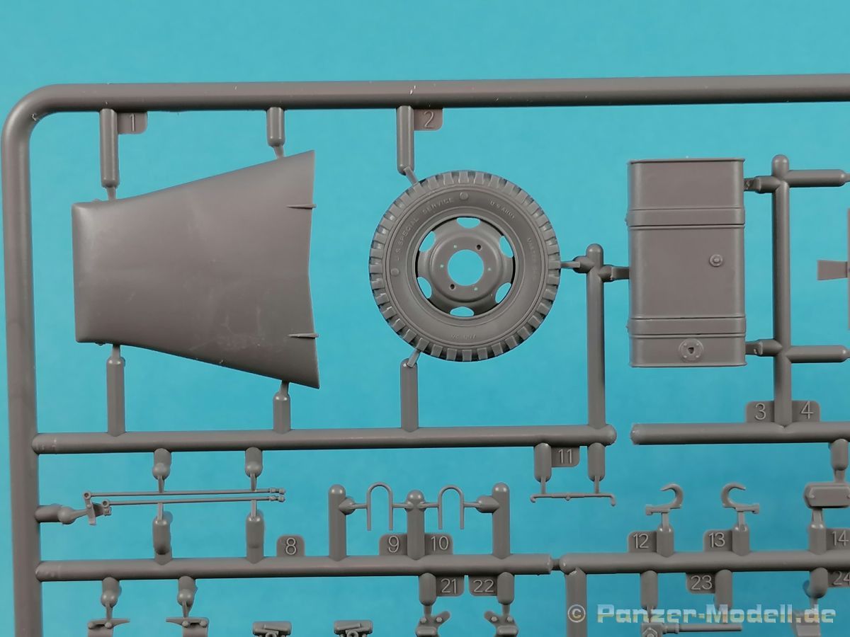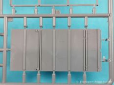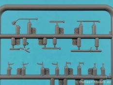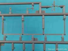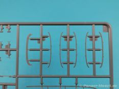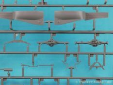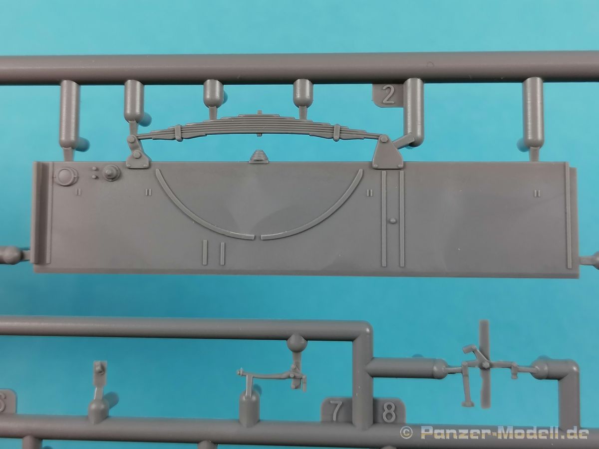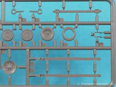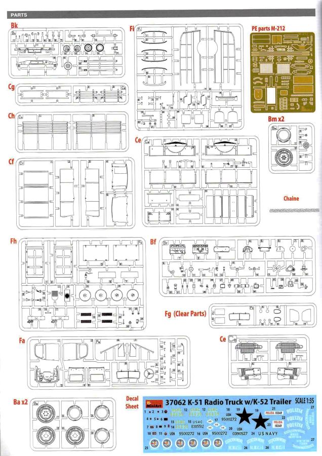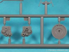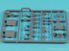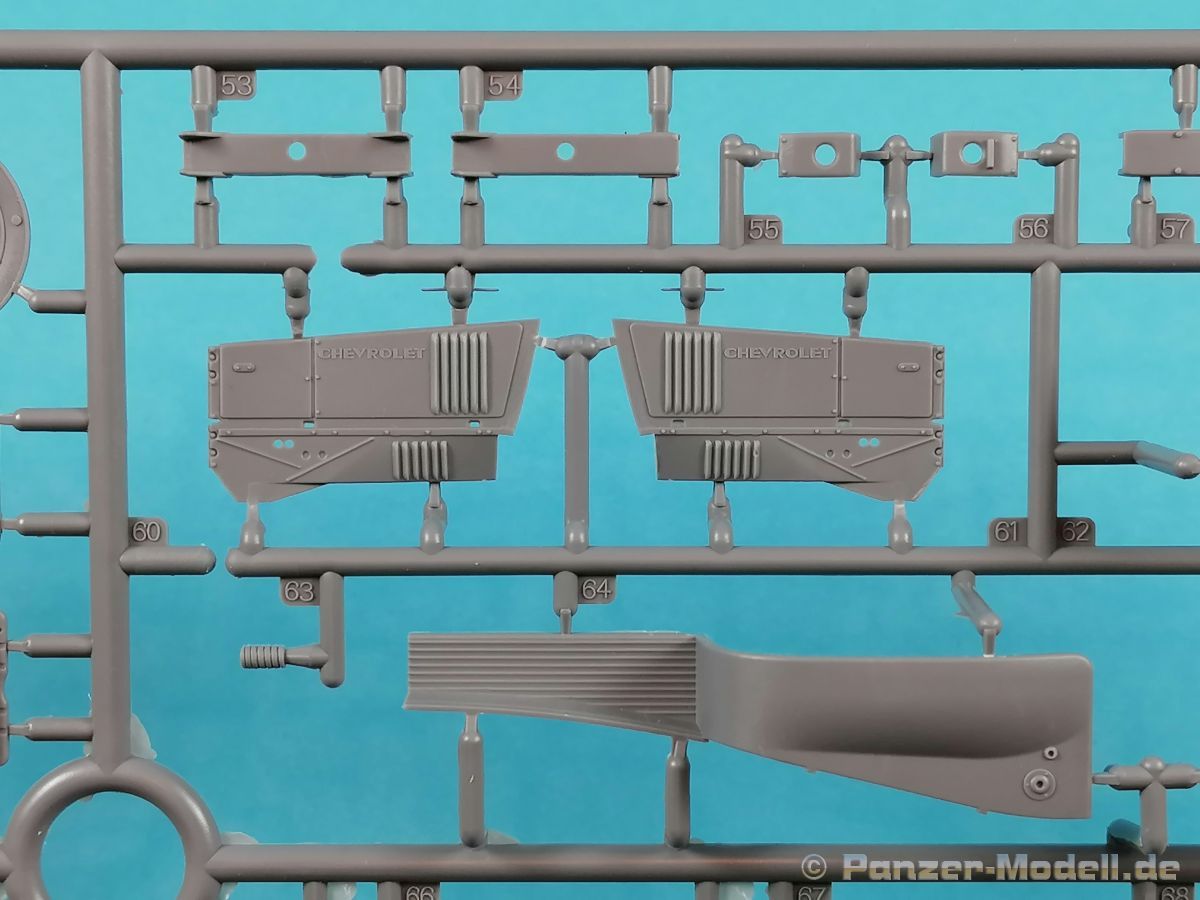 Von Chevrolet als Hersteller wurden zwischen 1940 bis August 1945 rund 150.000 Exemplare in den unterschiedlichsten Varianten produziert. Eingesetzt von den amerikanischen Streitkräften und deren Verbündeten. Mit zusätzlicher Ausrüstung wurde er dann zu einem K-51 Fernmeldewagen, der meist einen K-52 Einachs-Anhänger mit aufgelastetem Generator für den benötigten Strom zog. Es gab ihn in verschiedenen Varianten, die für Generatoren, Munition oder Wassertanks ausgelegt waren. In seiner Grundkonfiguration war er ein Lastanhänger mit Heckklappe. Es wurden fast 260.000 dieser Anhänger produziert. Der Karton mit Stülpdeckel enthält 23 hellgraue Rahmen, einen Klarsichtspritzling, 1 PE-Platine, 1 Metallkette, Decals und die Bauanleitung. MiniArt packt die Spritzlinge alle zusammen in eine Klarsichttüte. Der Klarsichtspritzling und die Decals sind noch einmal gesondert in eine kleinere Klarsichttüte geschützt eingepackt. Zudem befindet sich die PE-Platine gemäß MiniArt Standard in einem stabilen Kuvert aus Pappe. Schon auf den ersten Blick zeigt sich erneut eine sehr hohe Gußqualität. Alle Teile sind sauber gespritzt und ausgeformt. Verzug, Versatz oder Flash sind offensichtlich nicht vorhanden. Es gibt natürlich die bekannten Auswerfermarken, die aber erneut so auf den Teilen sitzten das man sie nicht bearbeiten/verspachteln muß, da sie auf den Innenseiten von Teilen sitzen und später dem Auge des Betrachters entzogen sind. Der Guß der Teile ist absolut auf der Höhe der Zeit und findet seinen Niederschlag auch in der Erstellung allerfeinster Bauteile. Wie üblich bei MiniArt ist die Detailfülle überwältigend. Sind diese bereits angegossen an diversen Bauteilen oder eigenständig beigelegt. Die Klarteile verdienen ihren Namen definitiv und weisen im Fall der Scheinwerfergläser auch eine feine Struktur auf. Auch wenn der Kit etwas “overengieered” erscheint, hier ist viel Bastelspaß gegeben. Prinzipiell kann man das Zugfahrzeug auf drei (wenn man den Motor mitzählt auf vier) Komponenten eingrenzen. Den Rahmen mit Motor, das Führerhaus mit Motorhaube, Kühler und den Schutzblechen sowie den Laderaum als Kastenausführung. Von dem im Bausatz enthaltenen Anhänger gibt es mittlerweile drei verschiedene Einzelmodelle, aber nur der Anhänger in diesem Set deckt alle Features der bisher produzierten ab. Und damit kommen wir zur ebenfalls typischen Bauanleitung von MiniArt. Neben dem üblichen gut gemachten Titelbild sind die Umschlagseiten mit insgesamt vier Bemalungsvorschlägen belegt. (siehe Bildteil). Auf Seite drei und vier sind die Spritzlinge in gewohnter Aufstellung zu finden, während der Baubeginn ab Seite fünf dokumentiert ist. Insgesamt 57 Bauabschnitte, teilweise mit Untergruppen hinterlegt, sind bis zum fertigen LKW abzuarbeiten. Weitere 18 Baustufen dokumentieren den Bau des Trailers mit allen Optionen. Allerdings sollte sich der geneigte Modellbauer die Zeit nehmen und den Bauplan vorab einmal zu studieren. Denn im Plan finden sich Hinweise z.B. welche Teile bei welcher Variante zu montieren sind; gleichwohl zur Verwendung diverser Optionsteile und wo eventuell Bohrungen zu machen sind etc. Das A und O ist wie bei vielen Kits das genaue und exakte Ausrichten des Leiterrahmens denn Fehler in diesem Bereich ziehen sich über den gesamten weiteren Bau hin… Das sollte aber recht flott gehen wenn man die Querträger aus den Folgestufen mit ins Kalkül zieht. Achsen, Blattfedern, Anhängerkupplung und weiter Teile finden ihren Platz. Der Motor, ein kleiner, feiner Bausatz im Bausatz, besticht ebenfalls durch filigrane und detaireiche Details. Lichtmaschine, Vergaser, Keilriemenscheiben mit Keilriemen, Zündverteiler und mehr erfreuen das Auge. Der Kühlergrill selbst ist perfekt umgesetzt und gibt den Blick in das Innere (bis zum Kühler) des Motorraums frei. Wer die Motorhaube geöffnet darstellen will braucht lediglich die Kabellage zu ergänzen. Auch die Spritzwand zum Motorraum punktet durch viele kleine, extra anzubringende (auch eine Ölkanne) Details. Die Räder sind einteilig und lediglich mit einer Reifenflanke zu vervollständigen und machen mit dem Reifenpofil eine gute Figur. Gut zu erkennen sind auch die Angaben des Herstellers auf den Reifen. Der Detailreichtum setzt sich auch in der Fahrerkabine bzw. im Kastenaufbau fort. Hier baut alles auf einer Grundplatte auf. Diese reicht von der Motortrennwand bis zum Heck. Instrumente werden mit Decals belegt. Ab und an kommen auch PEs zu Einsatz die entweder als Option oder direkt zu verbauen sind. Innenverkleidungen der Türen können punkten, ebenso die Möglichkeit die Fenster offen oder geschlossen darzustellen. Ebenfalls sehr schön reproduziert sind auch die Sitze und Türverkleidungen mit leichter Struktur. Die Scheibenwischer liegen als Kunststoffteil bzw. als PEs bei. Das Innenleben des Kastenaufbaus kann mit Rippen und Verstärkungen überzeugen. Auch der Außenbereich der Karosserie gefällt. Selbst die Regenrinnen finden ihren Platz… Optionen, wie schon geschrieben, sind allesamt im Bauplan dargestellt. Z.B. kann der Kühlergrill aus Plastik verwendet oder als Ätzteil verwendet werden. Um die Sache zu vereinfachen liegen Lehren bei. Löblich! Gleichwohl gibt es allgemeine Hinweise zu den Bemalungsmustern wo Bauteile angebaut oder weggelassen werden müssen. Und damit kommen wir noch zum Trailer, der qualitativ auf dem selben Level wie der Truck liegt. Alle Details sind mustergültig umgesetzt. Drei Varianten können gebaut werden. Als Pritsche, mit Spriegeln oder mit Verdeck. Die Pritschenelemente zeigen eine durchaus feine und für diesen Maßstab ausreichende Holzstruktur der Planken. Aufgrund der detaillierten Scharniere und Verschlüsse kann man die Pritschenwände optional auch abgeklappt bauen. Somit sind auch Verladeszenen möglich. Überzeugen kann durchaus auch das Verdeck. Leider liegt dem Kit keinerlei Beladung bei. Wer jetzt noch eine Farblegende vermisst hat, findet diese 