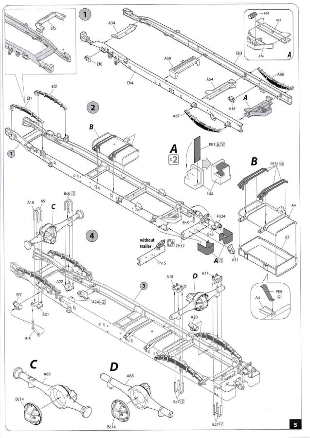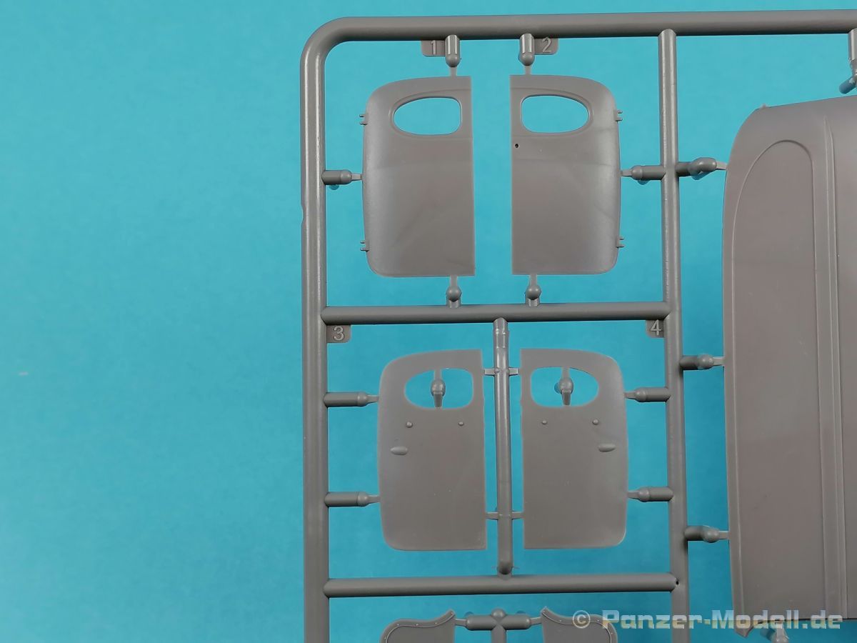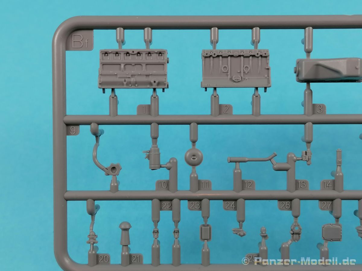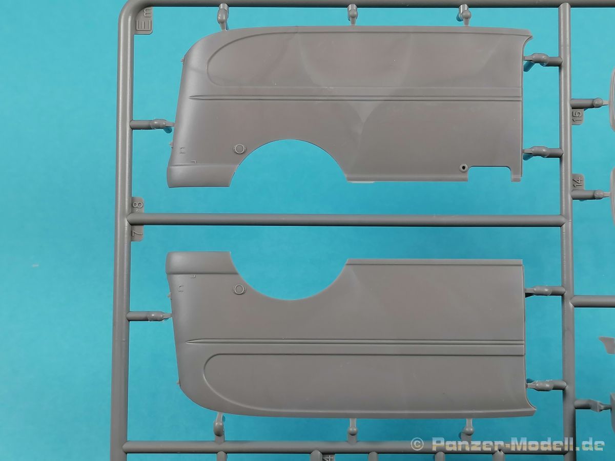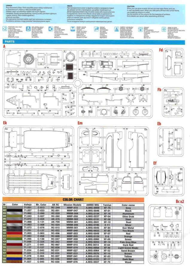 Von Chevrolet als Hersteller wurden zwischen 1940 bis August 1945 rund 150.000 Exemplare in den unterschiedlichsten Varianten produziert. Eingesetzt von den amerikanischen Streitkräften und deren Verbündeten. Mit zusätzlicher Ausrüstung wurde er dann zu einem K-51 Fernmeldewagen, der meist einen K-52 Einachs-Anhänger mit aufgelastetem Generator für den benötigten Strom zog. Es gab ihn in verschiedenen Varianten, die für Generatoren, Munition oder Wassertanks ausgelegt waren. In seiner Grundkonfiguration war er ein Lastanhänger mit Heckklappe. Es wurden fast 260.000 dieser Anhänger produziert. Der Karton mit Stülpdeckel enthält 23 hellgraue Rahmen, einen Klarsichtspritzling, 1 PE-Platine, 1 Metallkette, Decals und die Bauanleitung. MiniArt packt die Spritzlinge alle zusammen in eine Klarsichttüte. Der Klarsichtspritzling und die Decals sind noch einmal gesondert in eine kleinere Klarsichttüte geschützt eingepackt. Zudem befindet sich die PE-Platine gemäß MiniArt Standard in einem stabilen Kuvert aus Pappe. Schon auf den ersten Blick zeigt sich erneut eine sehr hohe Gußqualität. Alle Teile sind sauber gespritzt und ausgeformt. Verzug, Versatz oder Flash sind offensichtlich nicht vorhanden. Es gibt natürlich die bekannten Auswerfermarken, die aber erneut so auf den Teilen sitzten das man sie nicht bearbeiten/verspachteln muß, da sie auf den Innenseiten von Teilen sitzen und später dem Auge des Betrachters entzogen sind. Der Guß der Teile ist absolut auf der Höhe der Zeit und findet seinen Niederschlag auch in der Erstellung allerfeinster Bauteile. Wie üblich bei MiniArt ist die Detailfülle überwältigend. Sind diese bereits angegossen an diversen Bauteilen oder eigenständig beigelegt. Die Klarteile verdienen ihren Namen definitiv und weisen im Fall der Scheinwerfergläser auch eine feine Struktur auf. Auch wenn der Kit etwas “overengieered” erscheint, hier ist viel Bastelspaß gegeben. Prinzipiell kann man das Zugfahrzeug auf drei (wenn man den Motor mitzählt auf vier) Komponenten eingrenzen. Den Rahmen mit Motor, das Führerhaus mit Motorhaube, Kühler und den Schutzblechen sowie den Laderaum als Kastenausführung. Von dem im Bausatz enthaltenen Anhänger gibt es mittlerweile drei verschiedene Einzelmodelle, aber nur der Anhänger in diesem Set deckt alle Features der bisher produzierten ab. Und damit kommen wir zur ebenfalls typischen Bauanleitung von MiniArt. Neben dem üblichen gut gemachten Titelbild sind die Umschlagseiten mit insgesamt vier Bemalungsvorschlägen belegt. (siehe Bildteil). Auf Seite drei und vier sind die Spritzlinge in gewohnter Aufstellung zu finden, während der Baubeginn ab Seite fünf dokumentiert ist. Insgesamt 57 Bauabschnitte, teilweise mit Untergruppen hinterlegt, sind bis zum fertigen LKW abzuarbeiten. Weitere 18 Baustufen dokumentieren den Bau des Trailers mit allen Optionen. Allerdings sollte sich der geneigte Modellbauer die Zeit nehmen und den Bauplan vorab einmal zu studieren. Denn im Plan finden sich Hinweise z.B. welche Teile bei welcher Variante zu montieren sind; gleichwohl zur Verwendung diverser Optionsteile und wo eventuell Bohrungen zu machen sind etc. Das A und O ist wie bei vielen Kits das genaue und exakte Ausrichten des Leiterrahmens denn Fehler in diesem Bereich ziehen sich über den gesamten weiteren Bau hin… Das sollte aber recht flott gehen wenn man die Querträger aus den Folgestufen mit ins Kalkül zieht. Achsen, Blattfedern, Anhängerkupplung und weiter Teile finden ihren Platz. Der Motor, ein kleiner, feiner Bausatz im Bausatz, besticht ebenfalls durch filigrane und detaireiche Details. Lichtmaschine, Vergaser, Keilriemenscheiben mit Keilriemen, Zündverteiler und mehr erfreuen das Auge. Der Kühlergrill selbst ist perfekt umgesetzt und gibt den Blick in das Innere (bis zum Kühler) des Motorraums frei. Wer die Motorhaube geöffnet darstellen will braucht lediglich die Kabellage zu ergänzen. Auch die Spritzwand zum Motorraum punktet durch viele kleine, extra anzubringende (auch eine Ölkanne) Details. Die Räder sind einteilig und lediglich mit einer Reifenflanke zu vervollständigen und machen mit dem Reifenpofil eine gute Figur. Gut zu erkennen sind auch die Angaben des Herstellers auf den Reifen. Der Detailreichtum setzt sich auch in der Fahrerkabine bzw. im Kastenaufbau fort. Hier baut alles auf einer Grundplatte auf. Diese reicht von der Motortrennwand bis zum Heck. Instrumente werden mit Decals belegt. Ab und an kommen auch PEs zu Einsatz die entweder als Option oder direkt zu verbauen sind. Innenverkleidungen der Türen können punkten, ebenso die Möglichkeit die Fenster offen oder geschlossen darzustellen. Ebenfalls sehr schön reproduziert sind auch die Sitze und Türverkleidungen mit leichter Struktur. Die Scheibenwischer liegen als Kunststoffteil bzw. als PEs bei. Das Innenleben des Kastenaufbaus kann mit Rippen und Verstärkungen überzeugen. Auch der Außenbereich der Karosserie gefällt. Selbst die Regenrinnen finden ihren Platz… Optionen, wie schon geschrieben, sind allesamt im Bauplan dargestellt. Z.B. kann der Kühlergrill aus Plastik verwendet oder als Ätzteil verwendet werden. Um die Sache zu vereinfachen liegen Lehren bei. Löblich! Gleichwohl gibt es allgemeine Hinweise zu den Bemalungsmustern wo Bauteile angebaut oder weggelassen werden müssen. Und damit kommen wir noch zum Trailer, der qualitativ auf dem selben Level wie der Truck liegt. Alle Details sind mustergültig umgesetzt. Drei Varianten können gebaut werden. Als Pritsche, mit Spriegeln oder mit Verdeck. Die Pritschenelemente zeigen eine durchaus feine und für diesen Maßstab ausreichende Holzstruktur der Planken. Aufgrund der detaillierten Scharniere und Verschlüsse kann man die Pritschenwände optional auch abgeklappt bauen. Somit sind auch Verladeszenen möglich. Überzeugen kann durchaus auch das Verdeck. Leider liegt dem Kit keinerlei Beladung bei. Wer jetzt noch eine Farblegende vermisst hat, findet diese 