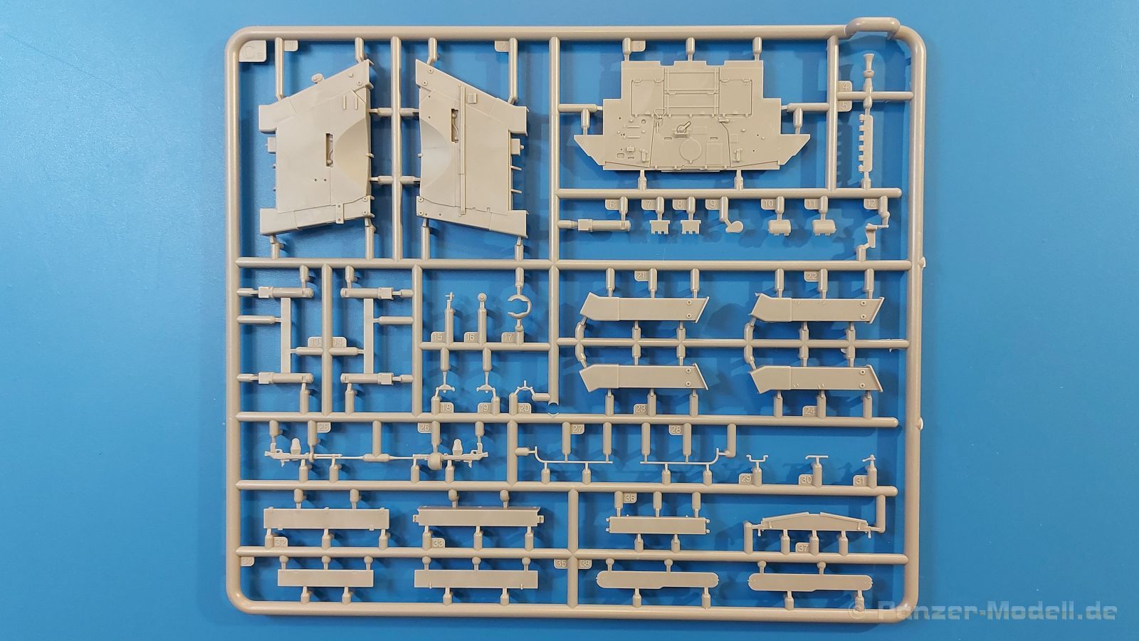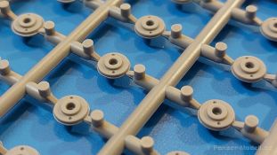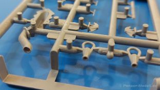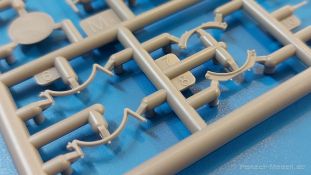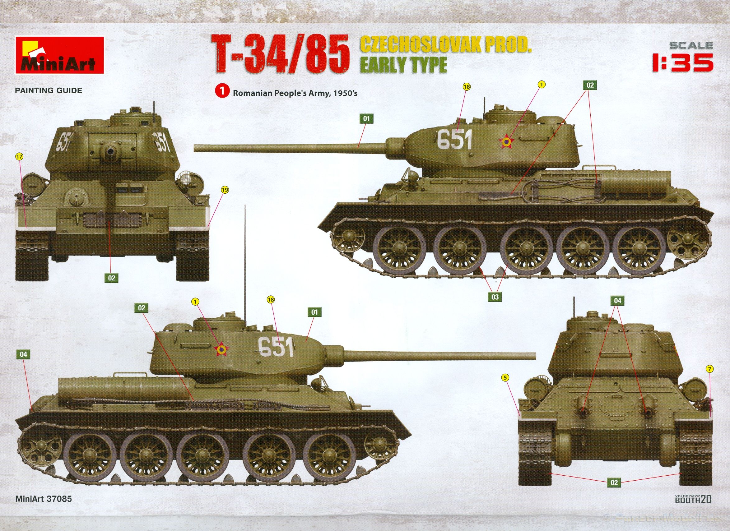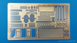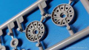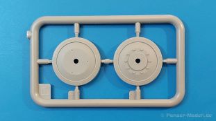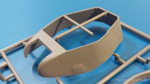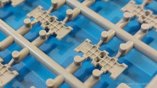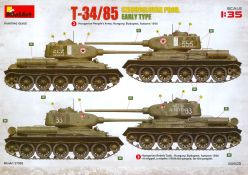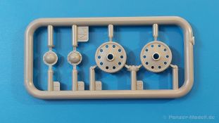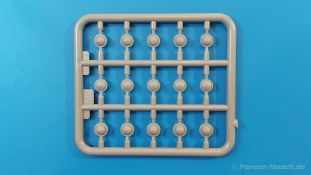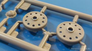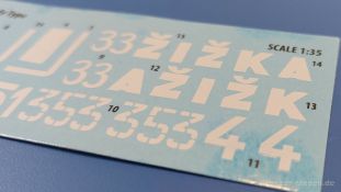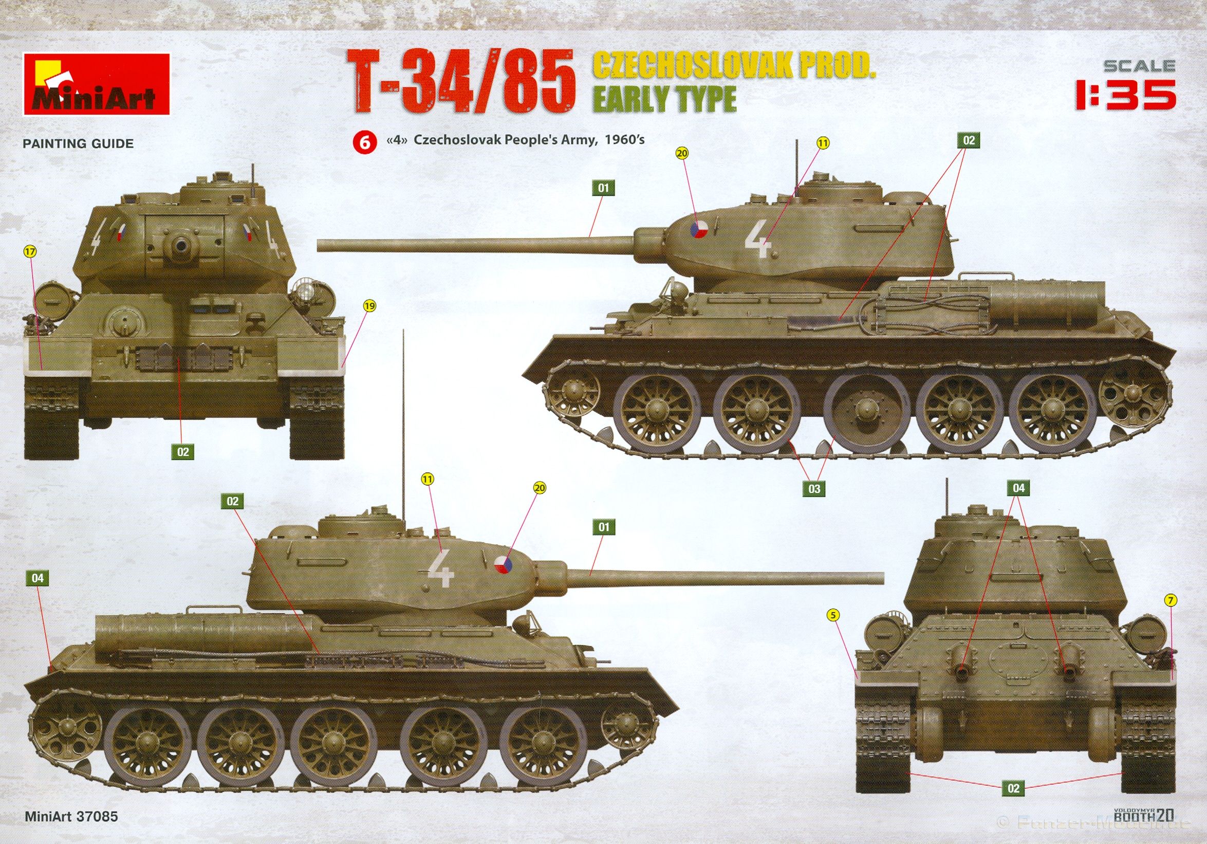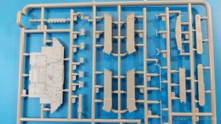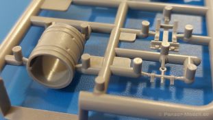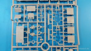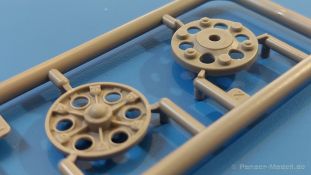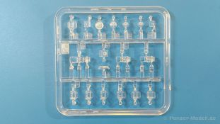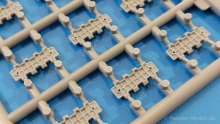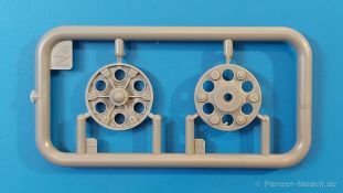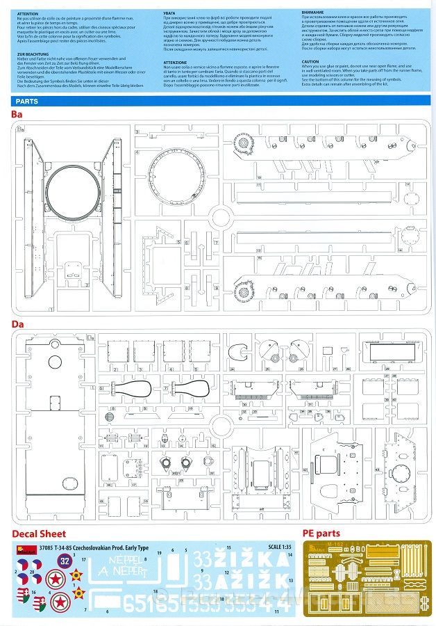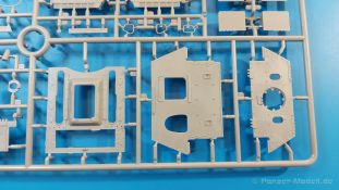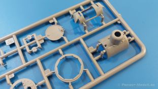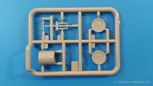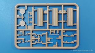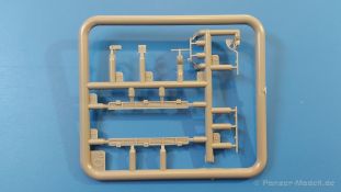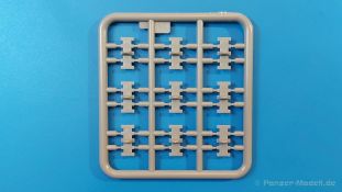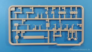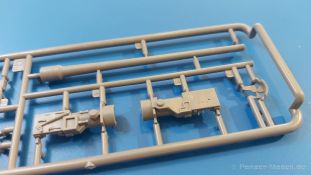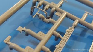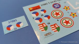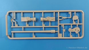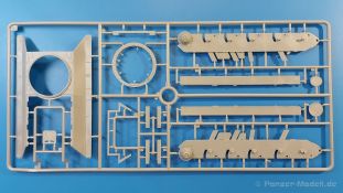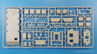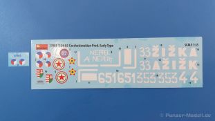 Das Original: Es gibt wohl kaum einen Militärmodellbauer, der den sowjetischen T-34 nicht kennt. Als einer der meistgebauten und am längsten im Einsatz befindlichen Panzer kann man ihn nicht übersehen. Seine Produktion zog sich von 1940 bis 1955 mit über 60.000 gebauten Exemplaren, die große Masse davon in den Jahren 1940-45. Seine schräge Panzerung war ein Novum der Zeit und bereitete den deutschen Gegnern einiges Kopfzerbrechen. Anfangs war er mit 2 MG und einer 76mm Kanone ausgerüstet, ab 1944 bekam er einen größeren Turm mit 85mm Kanone und ebenfalls 2 MG. Sein 500 PS Motor konnte ihn auf über 50 km/h beschleunigen. Der Bausatz: Unter der MiniArt Nummer 37069 gibt es bereits die tschechoslowakische Version mit voller Inneneinrichtung. Heute liegt vor uns der abgespeckte Bausatz ohne Inneneinrichtung. Der 385 x 240 x 75 mm große Karton enthält immer noch 62(!) hellgraue, 2 Klarsichtspritzlinge, 1 PE-Platine und ein Decalsheet (+Zusatzblatt). Wie bereits bei früheren T-34 Bausätzen von MiniArt sind sauber gespritzte und filigrane Teile sind die Norm. Verzug oder Versatz konnte ich nicht entdecken. Bemerkenswerten Grat konnte ich jetzt nur an den Laufrollen entdecken. Ich denke mal, dass die Formen ein paar Durchgänge mehr hinter sich haben, da ja auch andere Bausätze die gleichen Räder nutzen. Die Auswerfer sind ausnahmslos auf die Spritzrahmen gesetzt, so dass die Teile keine Spuren davon aufweisen. Auch wenn es keine Inneneinrichtung gibt, sind Innendetails an Wannenboden und Wänden zu finden, da es die gleichen Teile wie aus dem Interior-Bausatz sind. Die Wanne ist unterteilt in Boden, Bug-, Heck-, Seiten- und Trennwände. Die Bugplatte wird mit Seilhaken und funktionierenden Riegeln versehen. Ein interessantes Detail: je nach Version wird eine Kabelführung und ein Notek-Scheinwerfer montiert, wie man ihn von Wehrmachtsfahrzeugen kennt. Die Fahrerluke hat Details auf beiden Seiten inklusive Winkelspiegeln aus Klarsichtmaterial. Der Dom des Bug-MGs zeigt eine schöne Gussstruktur. Das MG mit Kugelblende kann beweglich eingebaut werden. Die Heckplatte mit den markanten Schraubenköpfen wird mit den, an den Enden ausgehöhlten, Auspuffrohren versehen und die runde Wartungsklappe angebracht. Nur für die Version 3 montiert man die kleinen, hinten querliegenden Kraftstoffbehälter. Auch die hinteren Seilhaken bekommen funktionierende Riegel aus PE und Plastik. Alle Versionen des Modelles erhalten die typischen Kraftstoffbehälter an den Seiten, zwei rechts, einer links mit feindetaillierten Halterungen, die mit PE Bändern verfeinert werden. Die Griffe an den Enden der Tanks sind ebenfalls aus PE-Material. Die typischen Eisgreifer sind natürlich dabei. Insgesamt 18 werden in 3 Paketen mittels PE-Ösen und -bändern auf der echten Kettenabdeckung angebracht. Für die beiden Abschleppseile gibt es nur die Seilkauschen. Die Seile stellt man selbst her. Der hintere Staukasten auf der rechten Kettenabdeckung kann ebenso wie der baugleiche vorn auf der linken Kettenabdeckung auch offen gebaut werden. Die linke Seite zeigt einige Merkmale der Nachkriegs-T34. Die sonst trompetenförmige Hupe wird durch ein kleineres Exemplar ersetzt, das an einer PW-Halterung montiert wird. Der einzige Fahrscheinwerfer ist innen hohl und wird mit einem geriffelten Klarsichtglas und einem Schutzgitter aus PE versehen. Für das Gitter gibt es eine Biegehilfe am Spritzling Da. Die große Säge kennt man bereits, die beiden Stahlseile ohne Kauschen in Halterungen sind mir ebenso neu am T34 wie auch das einsame Rücklicht in einer konischen Panzerung. Das Motordeck ist wie bei den Interior-Modellen mit allen separaten Lüfterklappen und Gittern versehen. Das große, hintere Gitter wird aus einem PE-Rahmen und -gitter ausgebaut. Das Fahrgestell beginnt bereits im Inneren mit den Federkästen, in die die schönen Druckfedern eingebaut werden. Alle Schwingarme sind separat ausgeführt. Die Räder mit Spinnwebspeichen und runden Durchbrüchen sehen sehr gut aus. Es liegt auch ein Laufrollenpaar mit Scheibenfelgen dabei, welches anstelle der linken, mittleren Laufrolle beim Bau der Version 6 benötigt wird. Leit- und Antriebsräder sind ebenfalls mit Durchbrüchen und Spinnwebspeichen versehen. Die Kettenglieder werden immer je ein Glied mit und eins ohne Führungszahn ineinander geklipst und sollten theoretisch auch beweglich bleiben, wenn die feinen Stifte das aushalten. Ein genauer Blick auf die Glieder zeigt uns nicht nur das Waffelmuster außen, sondern auch feine Gussnummern auf jedem Glied. Kommen wir zum Turm. Im Turm finden sich nur noch die Innenwände, das Rohrlager, der Verschluss und das koaxiale MG. Aus kristallklarem Material sind die Winkelspiegel im Dach und der Kommandantenluke und die Sichtblöcke der Kommandantenkuppel. Sowohl Kommandantenluke als auch Ladeschützenluke können offen oder geschlossen gebaut werden. Das Kanonenrohr ist aus einem Stück gegossen und an der Mündung ca. 3mm tief "aufgebohrt". Die Struktur des Turmes selbst und der Blende kommen glaubhaft rüber. Außen am Turm gibt es die üblichen Handgriffe. Haken zum Turmanheben, Nahverteidigungsstopfen, eine Antenne sowie die Panzerung der Dachlüfter sind weitere Details. Diesem Modell legt MiniArt Abziehbilder (Decals) für 7 Fahrzeuge und ein kleines Zusatzblatt mit tschechischen Kokarden bei. Die Decals sind seidenmatt mit wenig Rand.