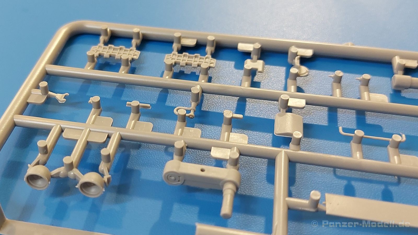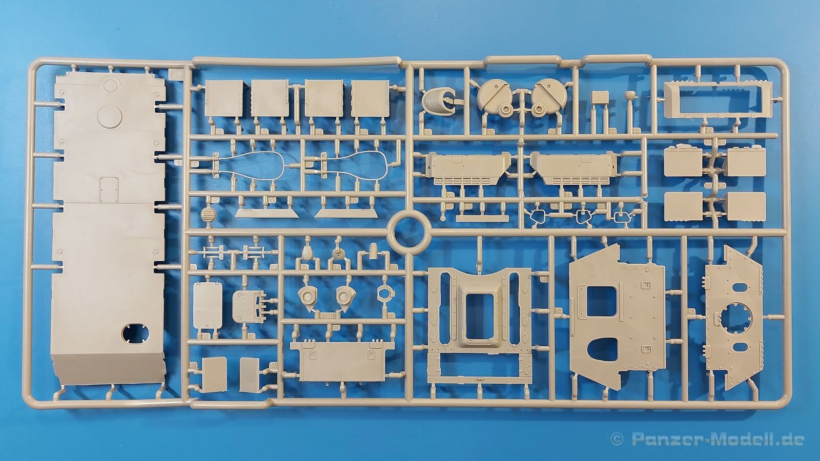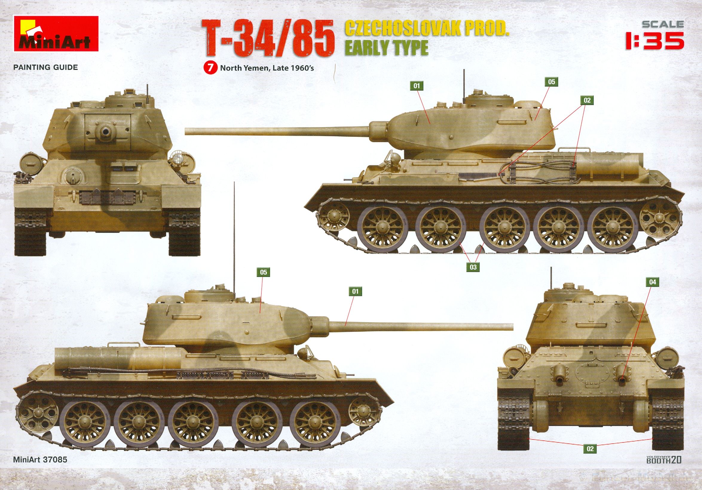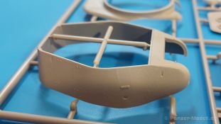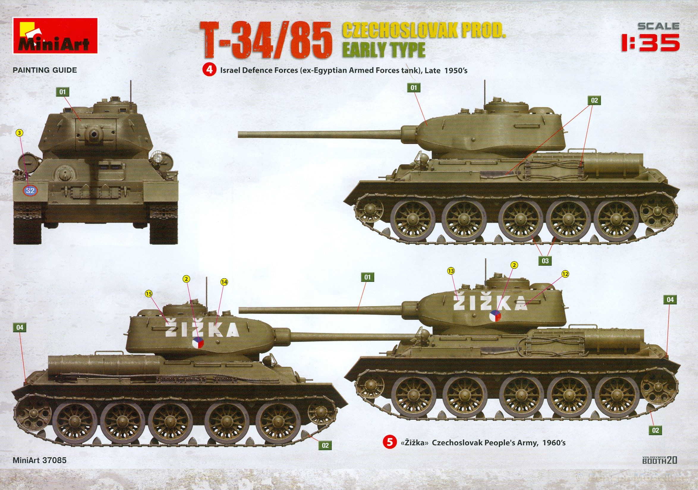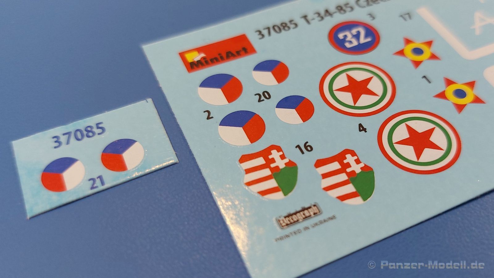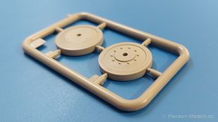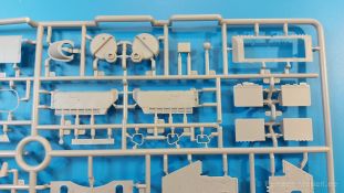 Das Original: Es gibt wohl kaum einen Militärmodellbauer, der den sowjetischen T-34 nicht kennt. Als einer der meistgebauten und am längsten im Einsatz befindlichen Panzer kann man ihn nicht übersehen. Seine Produktion zog sich von 1940 bis 1955 mit über 60.000 gebauten Exemplaren, die große Masse davon in den Jahren 1940-45. Seine schräge Panzerung war ein Novum der Zeit und bereitete den deutschen Gegnern einiges Kopfzerbrechen. Anfangs war er mit 2 MG und einer 76mm Kanone ausgerüstet, ab 1944 bekam er einen größeren Turm mit 85mm Kanone und ebenfalls 2 MG. Sein 500 PS Motor konnte ihn auf über 50 km/h beschleunigen. Der Bausatz: Unter der MiniArt Nummer 37069 gibt es bereits die tschechoslowakische Version mit voller Inneneinrichtung. Heute liegt vor uns der abgespeckte Bausatz ohne Inneneinrichtung. Der 385 x 240 x 75 mm große Karton enthält immer noch 62(!) hellgraue, 2 Klarsichtspritzlinge, 1 PE-Platine und ein Decalsheet (+Zusatzblatt). Wie bereits bei früheren T-34 Bausätzen von MiniArt sind sauber gespritzte und filigrane Teile sind die Norm. Verzug oder Versatz konnte ich nicht entdecken. Bemerkenswerten Grat konnte ich jetzt nur an den Laufrollen entdecken. Ich denke mal, dass die Formen ein paar Durchgänge mehr hinter sich haben, da ja auch andere Bausätze die gleichen Räder nutzen. Die Auswerfer sind ausnahmslos auf die Spritzrahmen gesetzt, so dass die Teile keine Spuren davon aufweisen. Auch wenn es keine Inneneinrichtung gibt, sind Innendetails an Wannenboden und Wänden zu finden, da es die gleichen Teile wie aus dem Interior-Bausatz sind. Die Wanne ist unterteilt in Boden, Bug-, Heck-, Seiten- und Trennwände. Die Bugplatte wird mit Seilhaken und funktionierenden Riegeln versehen. Ein interessantes Detail: je nach Version wird eine Kabelführung und ein Notek-Scheinwerfer montiert, wie man ihn von Wehrmachtsfahrzeugen kennt. Die Fahrerluke hat Details auf beiden Seiten inklusive Winkelspiegeln aus Klarsichtmaterial. Der Dom des Bug-MGs zeigt eine schöne Gussstruktur. Das MG mit Kugelblende kann beweglich eingebaut werden. Die Heckplatte mit den markanten Schraubenköpfen wird mit den, an den Enden ausgehöhlten, Auspuffrohren versehen und die runde Wartungsklappe angebracht. Nur für die Version 3 montiert man die kleinen, hinten querliegenden Kraftstoffbehälter. Auch die hinteren Seilhaken bekommen funktionierende Riegel aus PE und Plastik. Alle Versionen des Modelles erhalten die typischen Kraftstoffbehälter an den Seiten, zwei rechts, einer links mit feindetaillierten Halterungen, die mit PE Bändern verfeinert werden. Die Griffe an den Enden der Tanks sind ebenfalls aus PE-Material. Die typischen Eisgreifer sind natürlich dabei. Insgesamt 18 werden in 3 Paketen mittels PE-Ösen und -bändern auf der echten Kettenabdeckung angebracht. Für die beiden Abschleppseile gibt es nur die Seilkauschen. Die Seile stellt man selbst her. Der hintere Staukasten auf der rechten Kettenabdeckung kann ebenso wie der baugleiche vorn auf der linken Kettenabdeckung auch offen gebaut werden. Die linke Seite zeigt einige Merkmale der Nachkriegs-T34. Die sonst trompetenförmige Hupe wird durch ein kleineres Exemplar ersetzt, das an einer PW-Halterung montiert wird. Der einzige Fahrscheinwerfer ist innen hohl und wird mit einem geriffelten Klarsichtglas und einem Schutzgitter aus PE versehen. Für das Gitter gibt es eine Biegehilfe am Spritzling Da. Die große Säge kennt man bereits, die beiden Stahlseile ohne Kauschen in Halterungen sind mir ebenso neu am T34 wie auch das einsame Rücklicht in einer konischen Panzerung. Das Motordeck ist wie bei den Interior-Modellen mit allen separaten Lüfterklappen und Gittern versehen. Das große, hintere Gitter wird aus einem PE-Rahmen und -gitter ausgebaut. Das Fahrgestell beginnt bereits im Inneren mit den Federkästen, in die die schönen Druckfedern eingebaut werden. Alle Schwingarme sind separat ausgeführt. Die Räder mit Spinnwebspeichen und runden Durchbrüchen sehen sehr gut aus. Es liegt auch ein Laufrollenpaar mit Scheibenfelgen dabei, welches anstelle der linken, mittleren Laufrolle beim Bau der Version 6 benötigt wird. Leit- und Antriebsräder sind ebenfalls mit Durchbrüchen und Spinnwebspeichen versehen. Die Kettenglieder werden immer je ein Glied mit und eins ohne Führungszahn ineinander geklipst und sollten theoretisch auch beweglich bleiben, wenn die feinen Stifte das aushalten. Ein genauer Blick auf die Glieder zeigt uns nicht nur das Waffelmuster außen, sondern auch feine Gussnummern auf jedem Glied. Kommen wir zum Turm. Im Turm finden sich nur noch die Innenwände, das Rohrlager, der Verschluss und das koaxiale MG. Aus kristallklarem Material sind die Winkelspiegel im Dach und der Kommandantenluke und die Sichtblöcke der Kommandantenkuppel. Sowohl Kommandantenluke als auch Ladeschützenluke können offen oder geschlossen gebaut werden. Das Kanonenrohr ist aus einem Stück gegossen und an der Mündung ca. 3mm tief "aufgebohrt". Die Struktur des Turmes selbst und der Blende kommen glaubhaft rüber. Außen am Turm gibt es die üblichen Handgriffe. Haken zum Turmanheben, Nahverteidigungsstopfen, eine Antenne sowie die Panzerung der Dachlüfter sind weitere Details. Diesem Modell legt MiniArt Abziehbilder (Decals) für 7 Fahrzeuge und ein kleines Zusatzblatt mit tschechischen Kokarden bei. Die Decals sind seidenmatt mit wenig Rand.