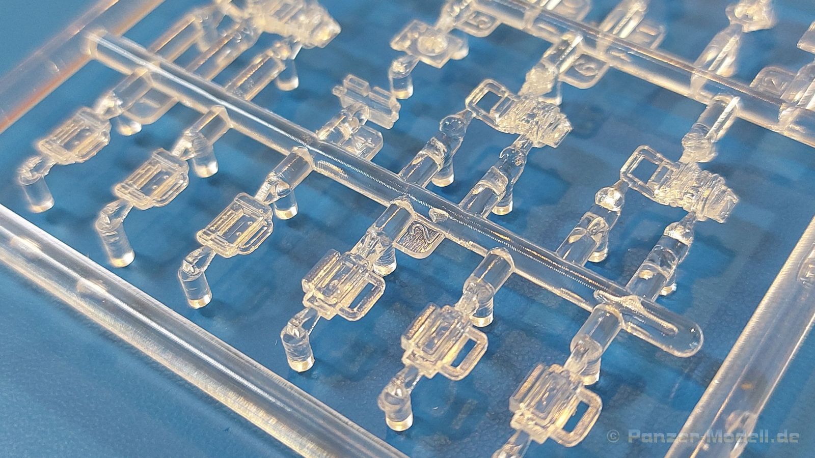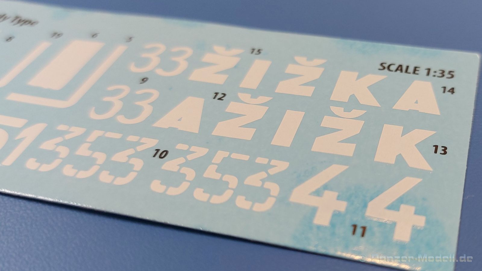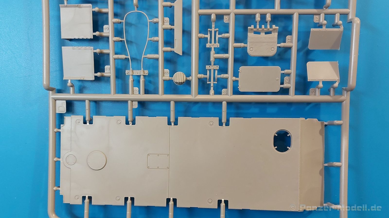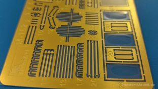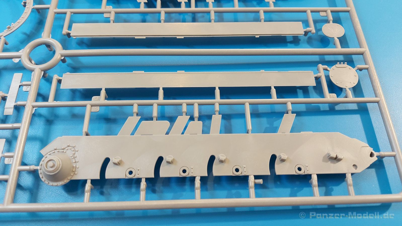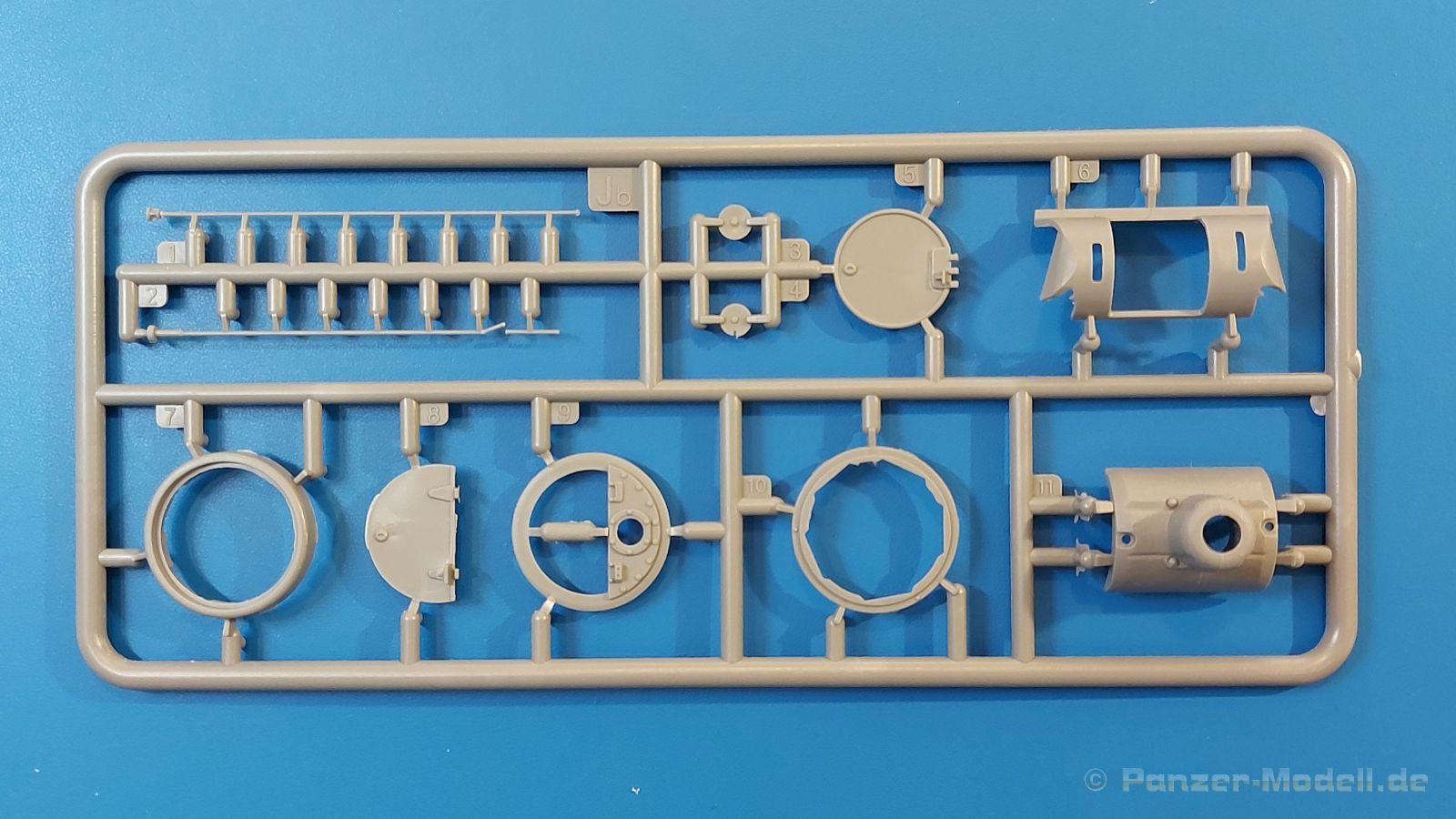 Das Original: Es gibt wohl kaum einen Militärmodellbauer, der den sowjetischen T-34 nicht kennt. Als einer der meistgebauten und am längsten im Einsatz befindlichen Panzer kann man ihn nicht übersehen. Seine Produktion zog sich von 1940 bis 1955 mit über 60.000 gebauten Exemplaren, die große Masse davon in den Jahren 1940-45. Seine schräge Panzerung war ein Novum der Zeit und bereitete den deutschen Gegnern einiges Kopfzerbrechen. Anfangs war er mit 2 MG und einer 76mm Kanone ausgerüstet, ab 1944 bekam er einen größeren Turm mit 85mm Kanone und ebenfalls 2 MG. Sein 500 PS Motor konnte ihn auf über 50 km/h beschleunigen. Der Bausatz: Unter der MiniArt Nummer 37069 gibt es bereits die tschechoslowakische Version mit voller Inneneinrichtung. Heute liegt vor uns der abgespeckte Bausatz ohne Inneneinrichtung. Der 385 x 240 x 75 mm große Karton enthält immer noch 62(!) hellgraue, 2 Klarsichtspritzlinge, 1 PE-Platine und ein Decalsheet (+Zusatzblatt). Wie bereits bei früheren T-34 Bausätzen von MiniArt sind sauber gespritzte und filigrane Teile sind die Norm. Verzug oder Versatz konnte ich nicht entdecken. Bemerkenswerten Grat konnte ich jetzt nur an den Laufrollen entdecken. Ich denke mal, dass die Formen ein paar Durchgänge mehr hinter sich haben, da ja auch andere Bausätze die gleichen Räder nutzen. Die Auswerfer sind ausnahmslos auf die Spritzrahmen gesetzt, so dass die Teile keine Spuren davon aufweisen. Auch wenn es keine Inneneinrichtung gibt, sind Innendetails an Wannenboden und Wänden zu finden, da es die gleichen Teile wie aus dem Interior-Bausatz sind. Die Wanne ist unterteilt in Boden, Bug-, Heck-, Seiten- und Trennwände. Die Bugplatte wird mit Seilhaken und funktionierenden Riegeln versehen. Ein interessantes Detail: je nach Version wird eine Kabelführung und ein Notek-Scheinwerfer montiert, wie man ihn von Wehrmachtsfahrzeugen kennt. Die Fahrerluke hat Details auf beiden Seiten inklusive Winkelspiegeln aus Klarsichtmaterial. Der Dom des Bug-MGs zeigt eine schöne Gussstruktur. Das MG mit Kugelblende kann beweglich eingebaut werden. Die Heckplatte mit den markanten Schraubenköpfen wird mit den, an den Enden ausgehöhlten, Auspuffrohren versehen und die runde Wartungsklappe angebracht. Nur für die Version 3 montiert man die kleinen, hinten querliegenden Kraftstoffbehälter. Auch die hinteren Seilhaken bekommen funktionierende Riegel aus PE und Plastik. Alle Versionen des Modelles erhalten die typischen Kraftstoffbehälter an den Seiten, zwei rechts, einer links mit feindetaillierten Halterungen, die mit PE Bändern verfeinert werden. Die Griffe an den Enden der Tanks sind ebenfalls aus PE-Material. Die typischen Eisgreifer sind natürlich dabei. Insgesamt 18 werden in 3 Paketen mittels PE-Ösen und -bändern auf der echten Kettenabdeckung angebracht. Für die beiden Abschleppseile gibt es nur die Seilkauschen. Die Seile stellt man selbst her. Der hintere Staukasten auf der rechten Kettenabdeckung kann ebenso wie der baugleiche vorn auf der linken Kettenabdeckung auch offen gebaut werden. Die linke Seite zeigt einige Merkmale der Nachkriegs-T34. Die sonst trompetenförmige Hupe wird durch ein kleineres Exemplar ersetzt, das an einer PW-Halterung montiert wird. Der einzige Fahrscheinwerfer ist innen hohl und wird mit einem geriffelten Klarsichtglas und einem Schutzgitter aus PE versehen. Für das Gitter gibt es eine Biegehilfe am Spritzling Da. Die große Säge kennt man bereits, die beiden Stahlseile ohne Kauschen in Halterungen sind mir ebenso neu am T34 wie auch das einsame Rücklicht in einer konischen Panzerung. Das Motordeck ist wie bei den Interior-Modellen mit allen separaten Lüfterklappen und Gittern versehen. Das große, hintere Gitter wird aus einem PE-Rahmen und -gitter ausgebaut. Das Fahrgestell beginnt bereits im Inneren mit den Federkästen, in die die schönen Druckfedern eingebaut werden. Alle Schwingarme sind separat ausgeführt. Die Räder mit Spinnwebspeichen und runden Durchbrüchen sehen sehr gut aus. Es liegt auch ein Laufrollenpaar mit Scheibenfelgen dabei, welches anstelle der linken, mittleren Laufrolle beim Bau der Version 6 benötigt wird. Leit- und Antriebsräder sind ebenfalls mit Durchbrüchen und Spinnwebspeichen versehen. Die Kettenglieder werden immer je ein Glied mit und eins ohne Führungszahn ineinander geklipst und sollten theoretisch auch beweglich bleiben, wenn die feinen Stifte das aushalten. Ein genauer Blick auf die Glieder zeigt uns nicht nur das Waffelmuster außen, sondern auch feine Gussnummern auf jedem Glied. Kommen wir zum Turm. Im Turm finden sich nur noch die Innenwände, das Rohrlager, der Verschluss und das koaxiale MG. Aus kristallklarem Material sind die Winkelspiegel im Dach und der Kommandantenluke und die Sichtblöcke der Kommandantenkuppel. Sowohl Kommandantenluke als auch Ladeschützenluke können offen oder geschlossen gebaut werden. Das Kanonenrohr ist aus einem Stück gegossen und an der Mündung ca. 3mm tief "aufgebohrt". Die Struktur des Turmes selbst und der Blende kommen glaubhaft rüber. Außen am Turm gibt es die üblichen Handgriffe. Haken zum Turmanheben, Nahverteidigungsstopfen, eine Antenne sowie die Panzerung der Dachlüfter sind weitere Details. Diesem Modell legt MiniArt Abziehbilder (Decals) für 7 Fahrzeuge und ein kleines Zusatzblatt mit tschechischen Kokarden bei. Die Decals sind seidenmatt mit wenig Rand.