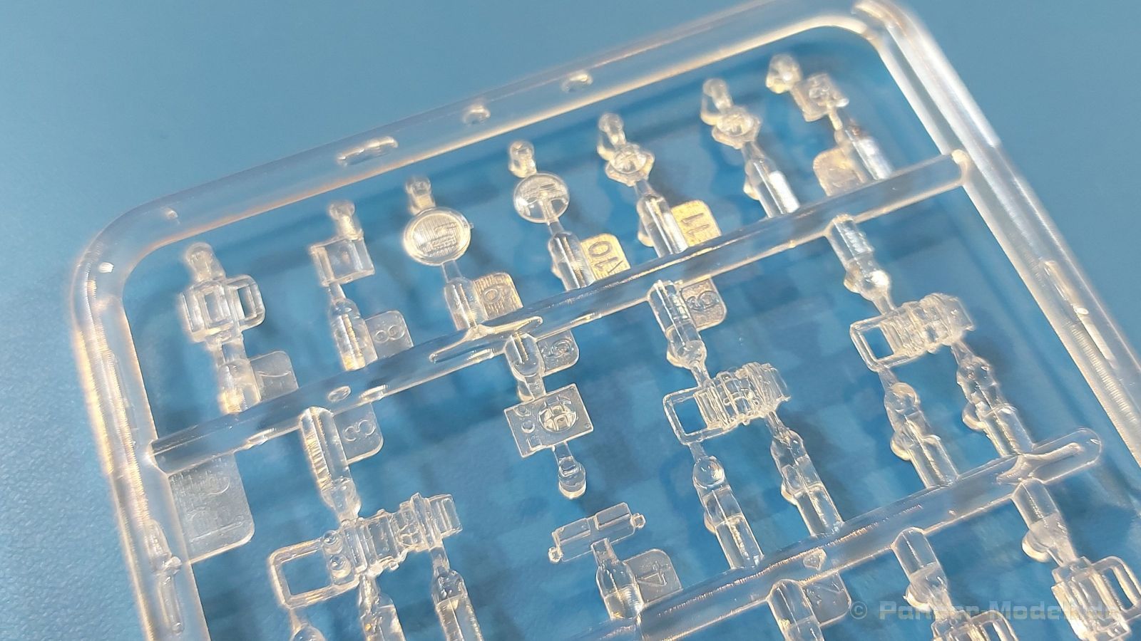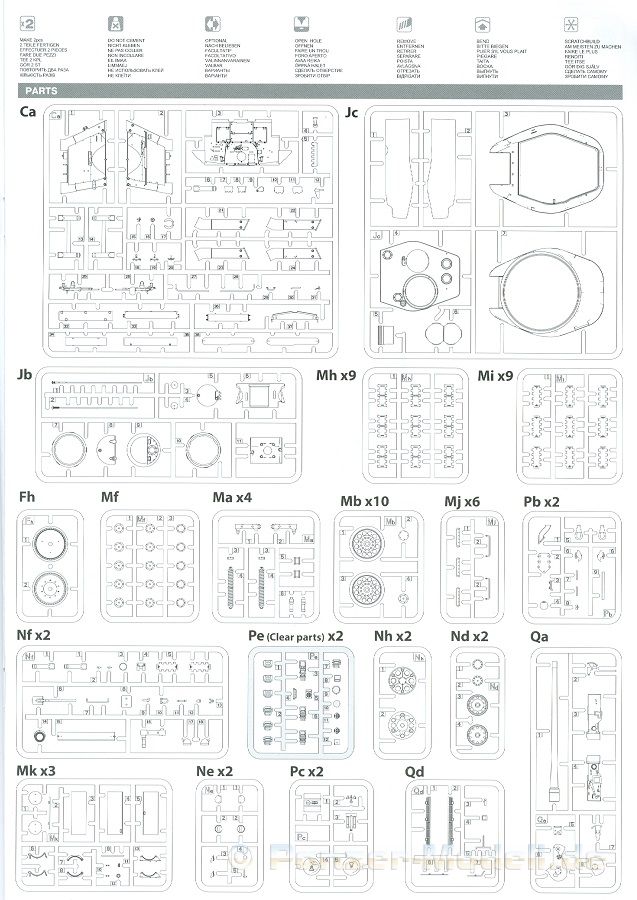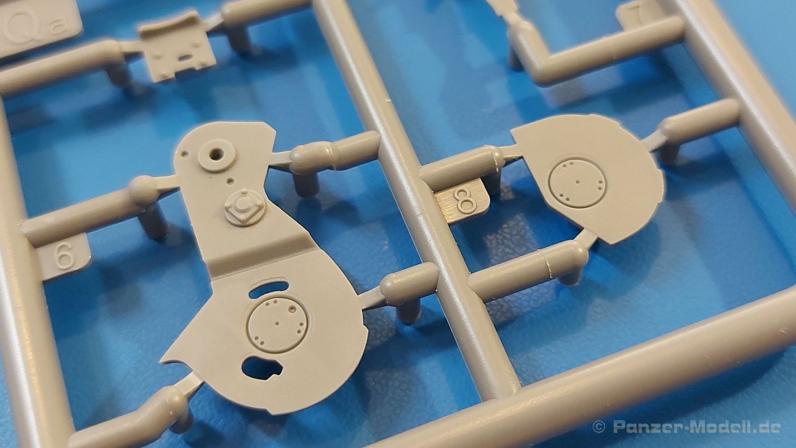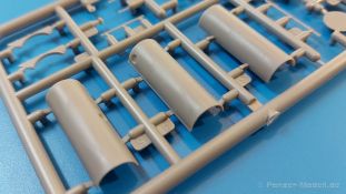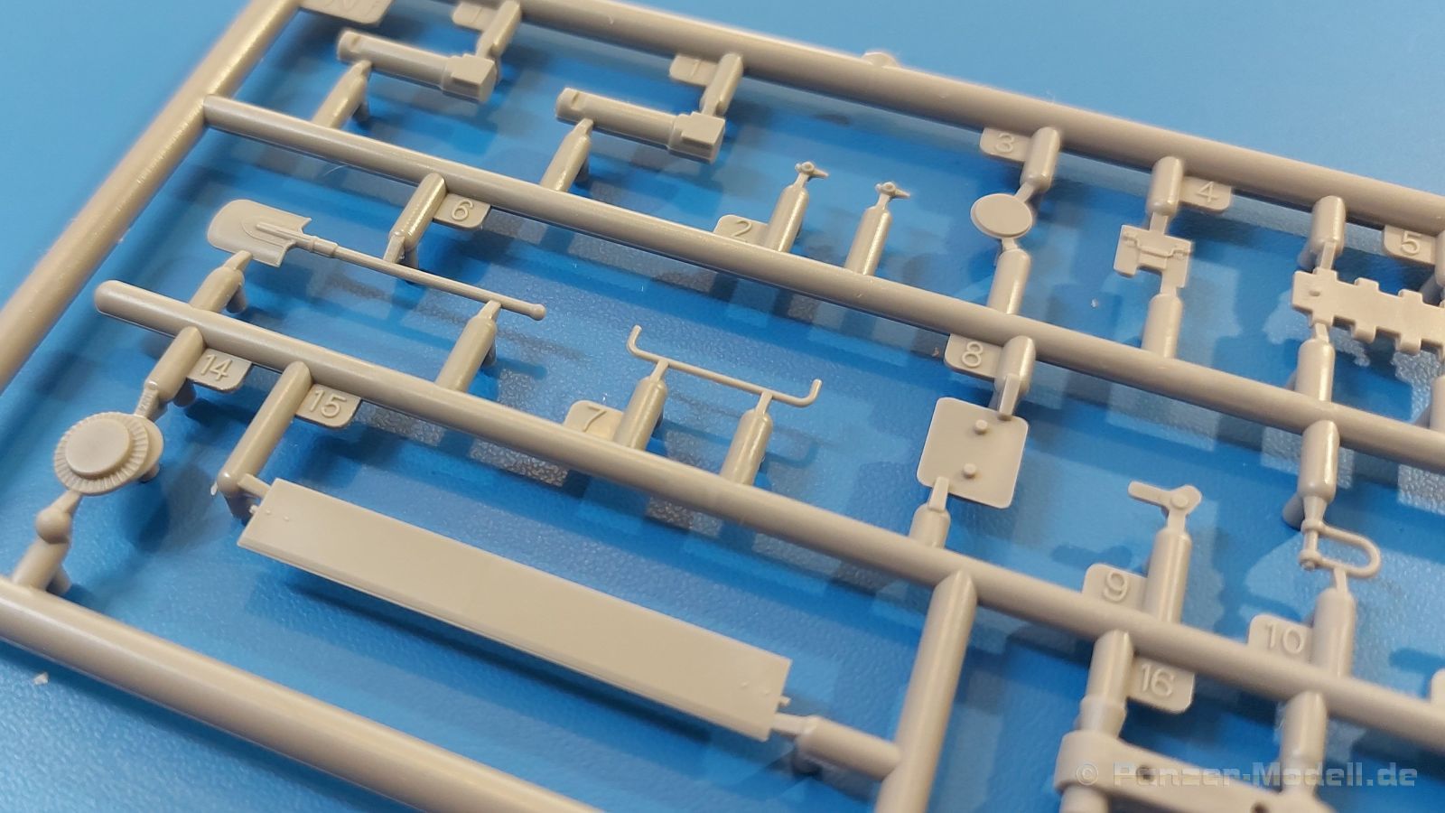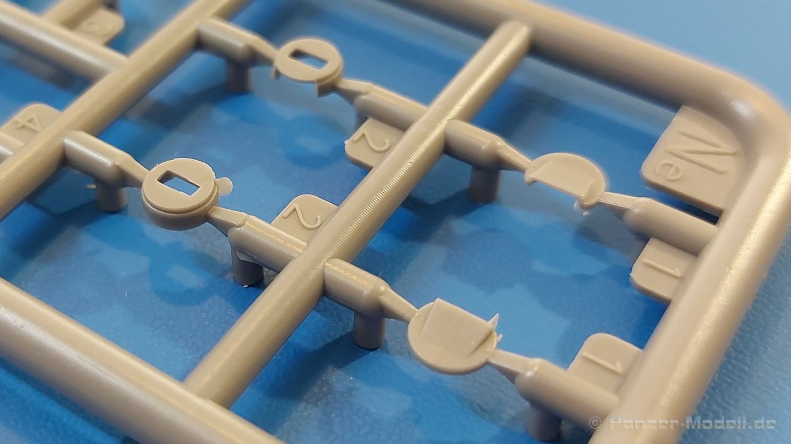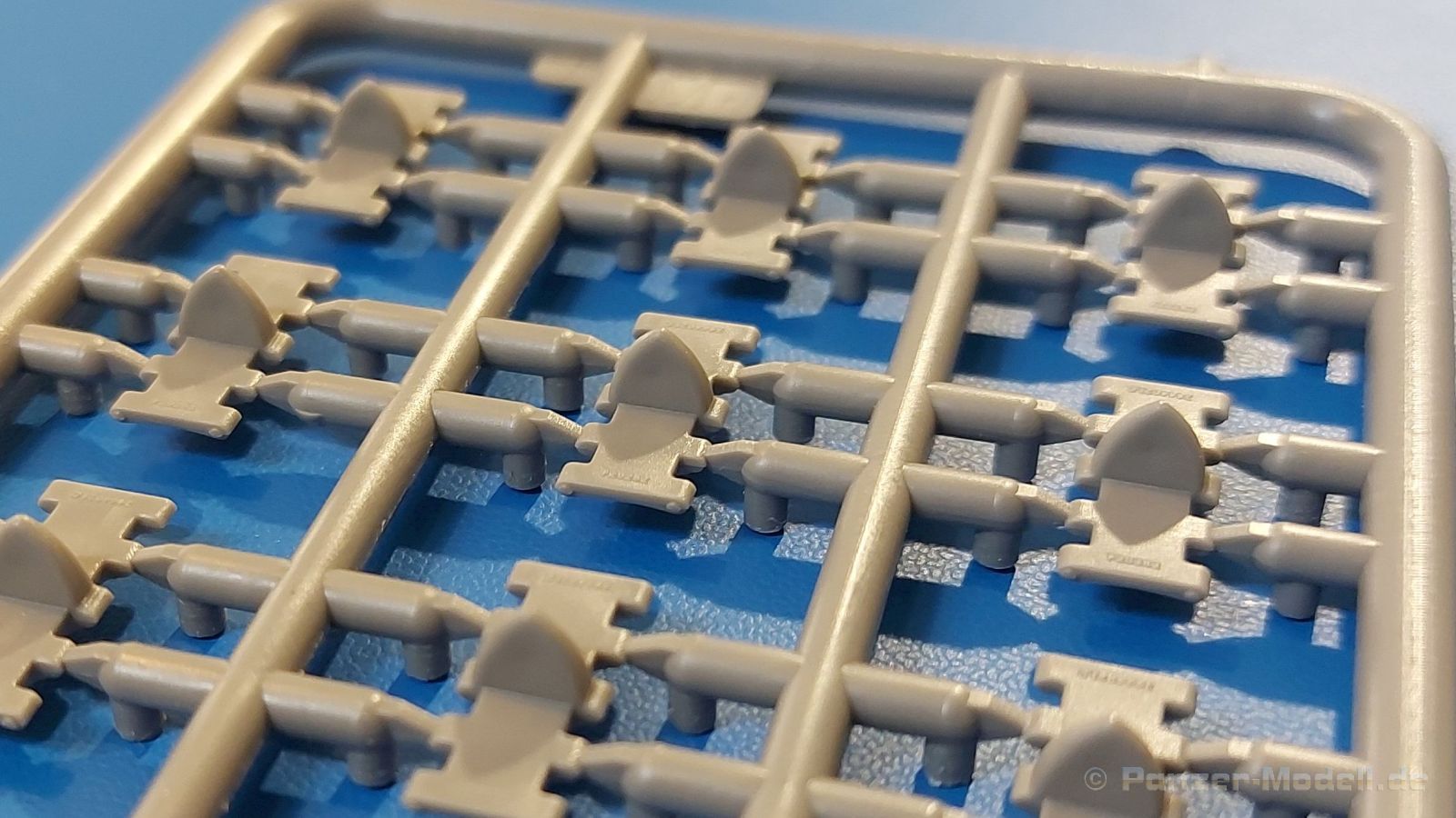 Das Original: Es gibt wohl kaum einen Militärmodellbauer, der den sowjetischen T-34 nicht kennt. Als einer der meistgebauten und am längsten im Einsatz befindlichen Panzer kann man ihn nicht übersehen. Seine Produktion zog sich von 1940 bis 1955 mit über 60.000 gebauten Exemplaren, die große Masse davon in den Jahren 1940-45. Seine schräge Panzerung war ein Novum der Zeit und bereitete den deutschen Gegnern einiges Kopfzerbrechen. Anfangs war er mit 2 MG und einer 76mm Kanone ausgerüstet, ab 1944 bekam er einen größeren Turm mit 85mm Kanone und ebenfalls 2 MG. Sein 500 PS Motor konnte ihn auf über 50 km/h beschleunigen. Der Bausatz: Unter der MiniArt Nummer 37069 gibt es bereits die tschechoslowakische Version mit voller Inneneinrichtung. Heute liegt vor uns der abgespeckte Bausatz ohne Inneneinrichtung. Der 385 x 240 x 75 mm große Karton enthält immer noch 62(!) hellgraue, 2 Klarsichtspritzlinge, 1 PE-Platine und ein Decalsheet (+Zusatzblatt). Wie bereits bei früheren T-34 Bausätzen von MiniArt sind sauber gespritzte und filigrane Teile sind die Norm. Verzug oder Versatz konnte ich nicht entdecken. Bemerkenswerten Grat konnte ich jetzt nur an den Laufrollen entdecken. Ich denke mal, dass die Formen ein paar Durchgänge mehr hinter sich haben, da ja auch andere Bausätze die gleichen Räder nutzen. Die Auswerfer sind ausnahmslos auf die Spritzrahmen gesetzt, so dass die Teile keine Spuren davon aufweisen. Auch wenn es keine Inneneinrichtung gibt, sind Innendetails an Wannenboden und Wänden zu finden, da es die gleichen Teile wie aus dem Interior-Bausatz sind. Die Wanne ist unterteilt in Boden, Bug-, Heck-, Seiten- und Trennwände. Die Bugplatte wird mit Seilhaken und funktionierenden Riegeln versehen. Ein interessantes Detail: je nach Version wird eine Kabelführung und ein Notek-Scheinwerfer montiert, wie man ihn von Wehrmachtsfahrzeugen kennt. Die Fahrerluke hat Details auf beiden Seiten inklusive Winkelspiegeln aus Klarsichtmaterial. Der Dom des Bug-MGs zeigt eine schöne Gussstruktur. Das MG mit Kugelblende kann beweglich eingebaut werden. Die Heckplatte mit den markanten Schraubenköpfen wird mit den, an den Enden ausgehöhlten, Auspuffrohren versehen und die runde Wartungsklappe angebracht. Nur für die Version 3 montiert man die kleinen, hinten querliegenden Kraftstoffbehälter. Auch die hinteren Seilhaken bekommen funktionierende Riegel aus PE und Plastik. Alle Versionen des Modelles erhalten die typischen Kraftstoffbehälter an den Seiten, zwei rechts, einer links mit feindetaillierten Halterungen, die mit PE Bändern verfeinert werden. Die Griffe an den Enden der Tanks sind ebenfalls aus PE-Material. Die typischen Eisgreifer sind natürlich dabei. Insgesamt 18 werden in 3 Paketen mittels PE-Ösen und -bändern auf der echten Kettenabdeckung angebracht. Für die beiden Abschleppseile gibt es nur die Seilkauschen. Die Seile stellt man selbst her. Der hintere Staukasten auf der rechten Kettenabdeckung kann ebenso wie der baugleiche vorn auf der linken Kettenabdeckung auch offen gebaut werden. Die linke Seite zeigt einige Merkmale der Nachkriegs-T34. Die sonst trompetenförmige Hupe wird durch ein kleineres Exemplar ersetzt, das an einer PW-Halterung montiert wird. Der einzige Fahrscheinwerfer ist innen hohl und wird mit einem geriffelten Klarsichtglas und einem Schutzgitter aus PE versehen. Für das Gitter gibt es eine Biegehilfe am Spritzling Da. Die große Säge kennt man bereits, die beiden Stahlseile ohne Kauschen in Halterungen sind mir ebenso neu am T34 wie auch das einsame Rücklicht in einer konischen Panzerung. Das Motordeck ist wie bei den Interior-Modellen mit allen separaten Lüfterklappen und Gittern versehen. Das große, hintere Gitter wird aus einem PE-Rahmen und -gitter ausgebaut. Das Fahrgestell beginnt bereits im Inneren mit den Federkästen, in die die schönen Druckfedern eingebaut werden. Alle Schwingarme sind separat ausgeführt. Die Räder mit Spinnwebspeichen und runden Durchbrüchen sehen sehr gut aus. Es liegt auch ein Laufrollenpaar mit Scheibenfelgen dabei, welches anstelle der linken, mittleren Laufrolle beim Bau der Version 6 benötigt wird. Leit- und Antriebsräder sind ebenfalls mit Durchbrüchen und Spinnwebspeichen versehen. Die Kettenglieder werden immer je ein Glied mit und eins ohne Führungszahn ineinander geklipst und sollten theoretisch auch beweglich bleiben, wenn die feinen Stifte das aushalten. Ein genauer Blick auf die Glieder zeigt uns nicht nur das Waffelmuster außen, sondern auch feine Gussnummern auf jedem Glied. Kommen wir zum Turm. Im Turm finden sich nur noch die Innenwände, das Rohrlager, der Verschluss und das koaxiale MG. Aus kristallklarem Material sind die Winkelspiegel im Dach und der Kommandantenluke und die Sichtblöcke der Kommandantenkuppel. Sowohl Kommandantenluke als auch Ladeschützenluke können offen oder geschlossen gebaut werden. Das Kanonenrohr ist aus einem Stück gegossen und an der Mündung ca. 3mm tief "aufgebohrt". Die Struktur des Turmes selbst und der Blende kommen glaubhaft rüber. Außen am Turm gibt es die üblichen Handgriffe. Haken zum Turmanheben, Nahverteidigungsstopfen, eine Antenne sowie die Panzerung der Dachlüfter sind weitere Details. Diesem Modell legt MiniArt Abziehbilder (Decals) für 7 Fahrzeuge und ein kleines Zusatzblatt mit tschechischen Kokarden bei. Die Decals sind seidenmatt mit wenig Rand.