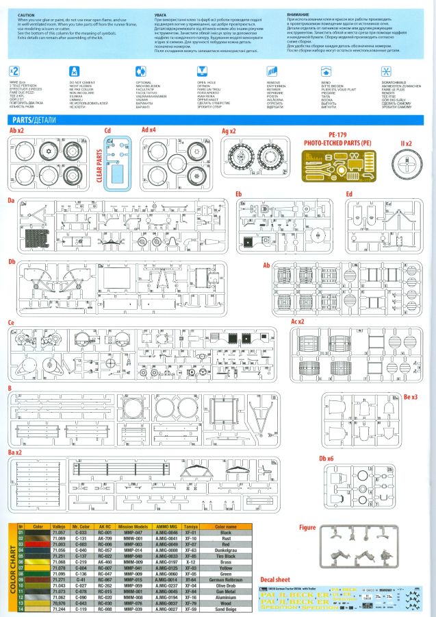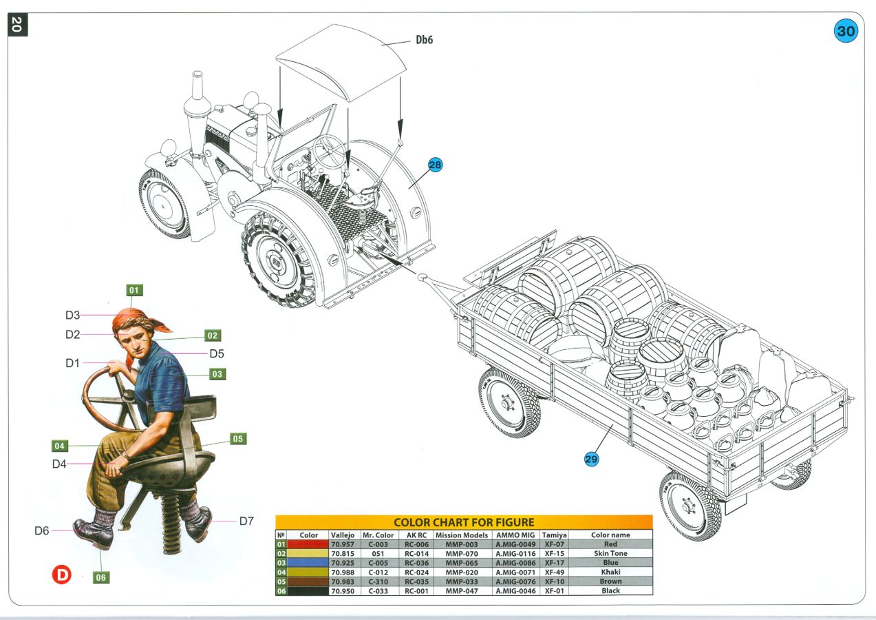 Die Bauanleitung hat 24 Seiten. Sie beginnt mit der Bemalungs- und Markierungsanleitung für das erste Fahrzeuggespann. Dem folgt 1 Seite mit Kartoninhalt und Farbtabelle mit Nummernangaben der Hersteller Vallejo, Mr. Color, AK RC, Mission Models, Ammo MiG und Tamiya. 30 Bauschritte, ergänzt durch Unterbauschritte und Detailbemalungshinweise, sind meines Erachtens sinnvoll, logisch aufgeteilt, leicht verständlich und reichen für Fahrzeuge, Figur und Ladung. Im letzten Bauschritt gibt es noch eine Farbtabelle für die Figur, obwohl ich denke, dass man für die zivile Figur auch eine andere Farbwahl treffen könnte. Dann folgen Bemalungs- und Markierungsanleitungen des zweiten Gespanns und beide Gespanne zusammen zur Übersicht. Zum Schluss bekommt man noch einen Ausblick auf andere Traktor-Bausätze. Ein volles Paket für ein klasse Diorama. MiniArt hat ganze Arbeit geleistet. Anfänger sollten sich wohl etwas zurückhalten, grad wegen der Klein- und PE-Teile. Ein Preis von ca. 43 - 52€ erscheint mir für das Gebotene als gerechtfertigt.