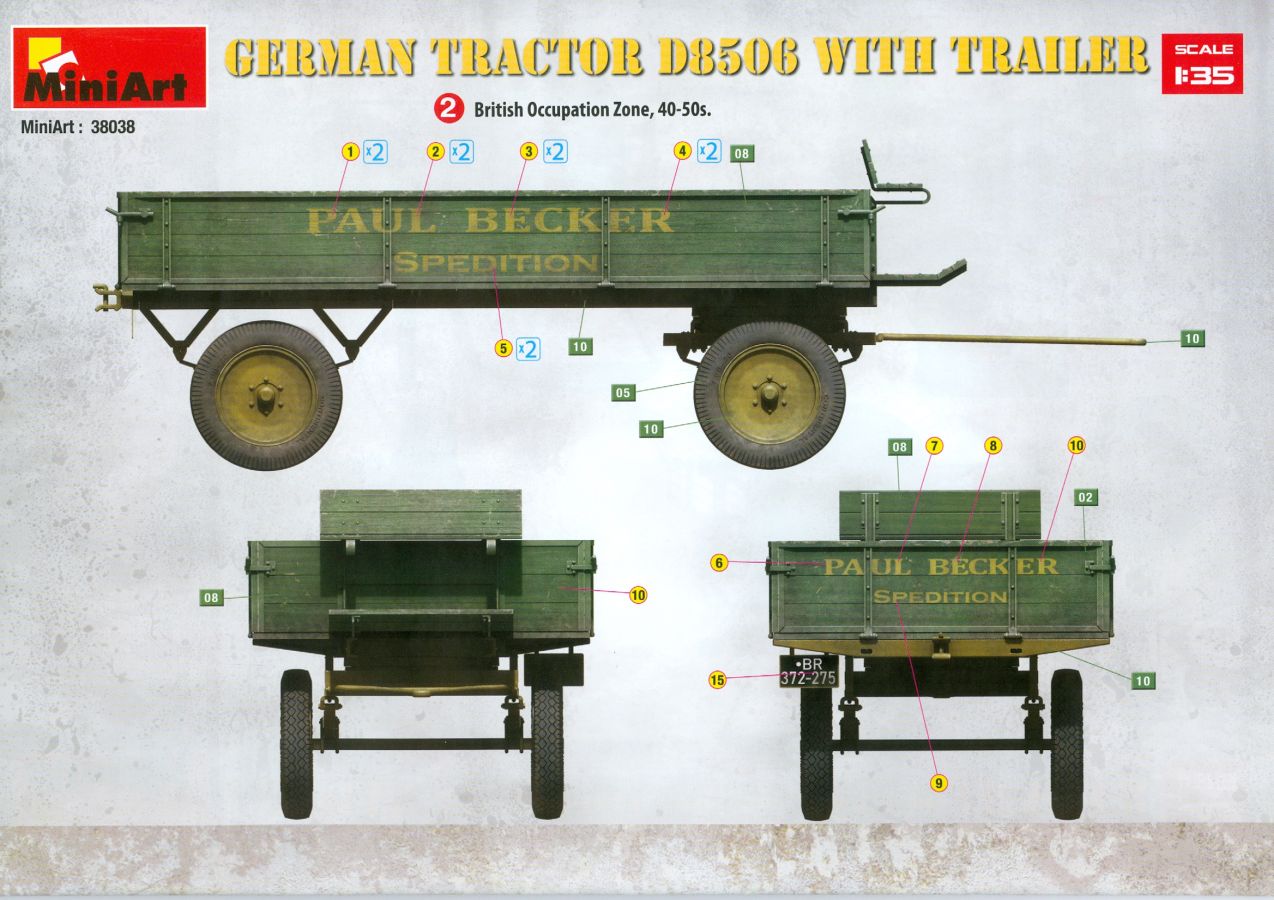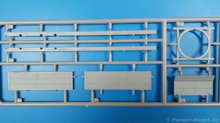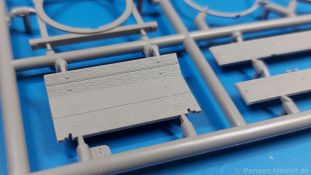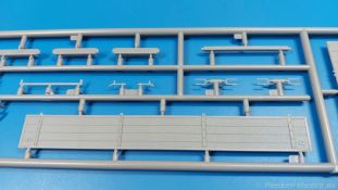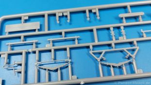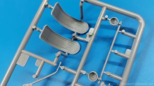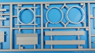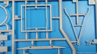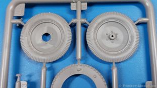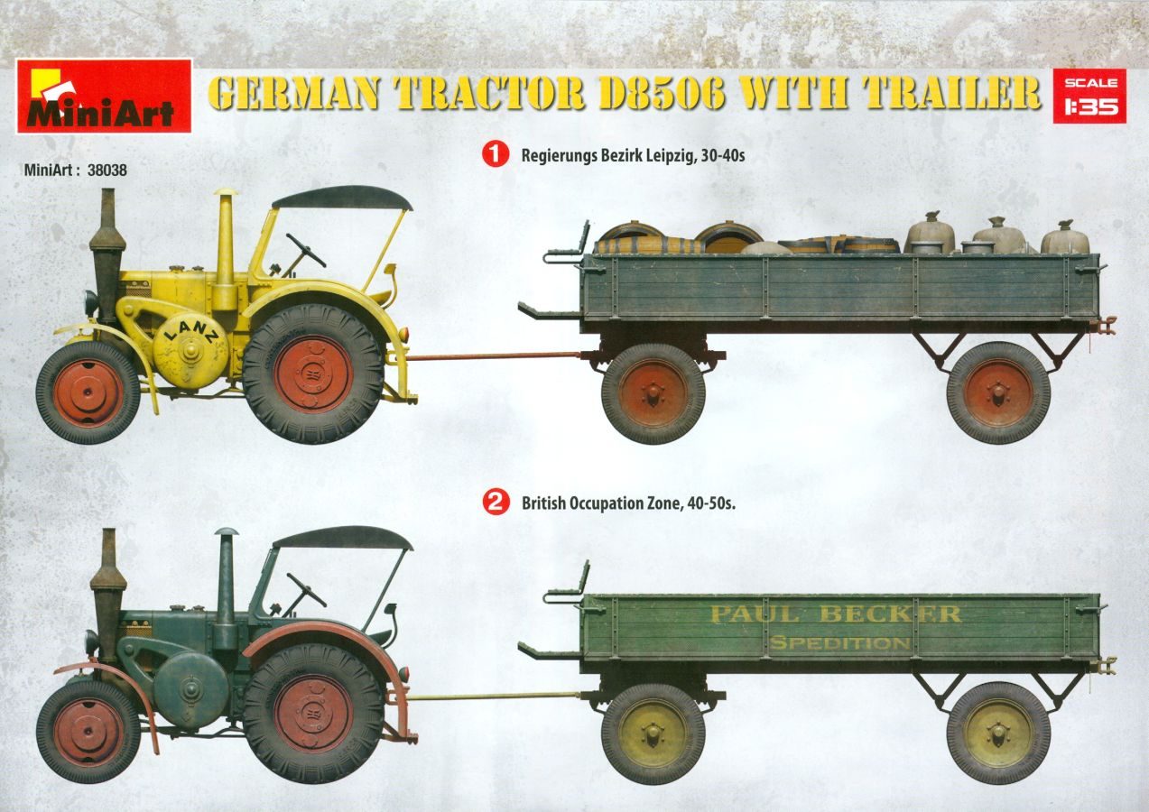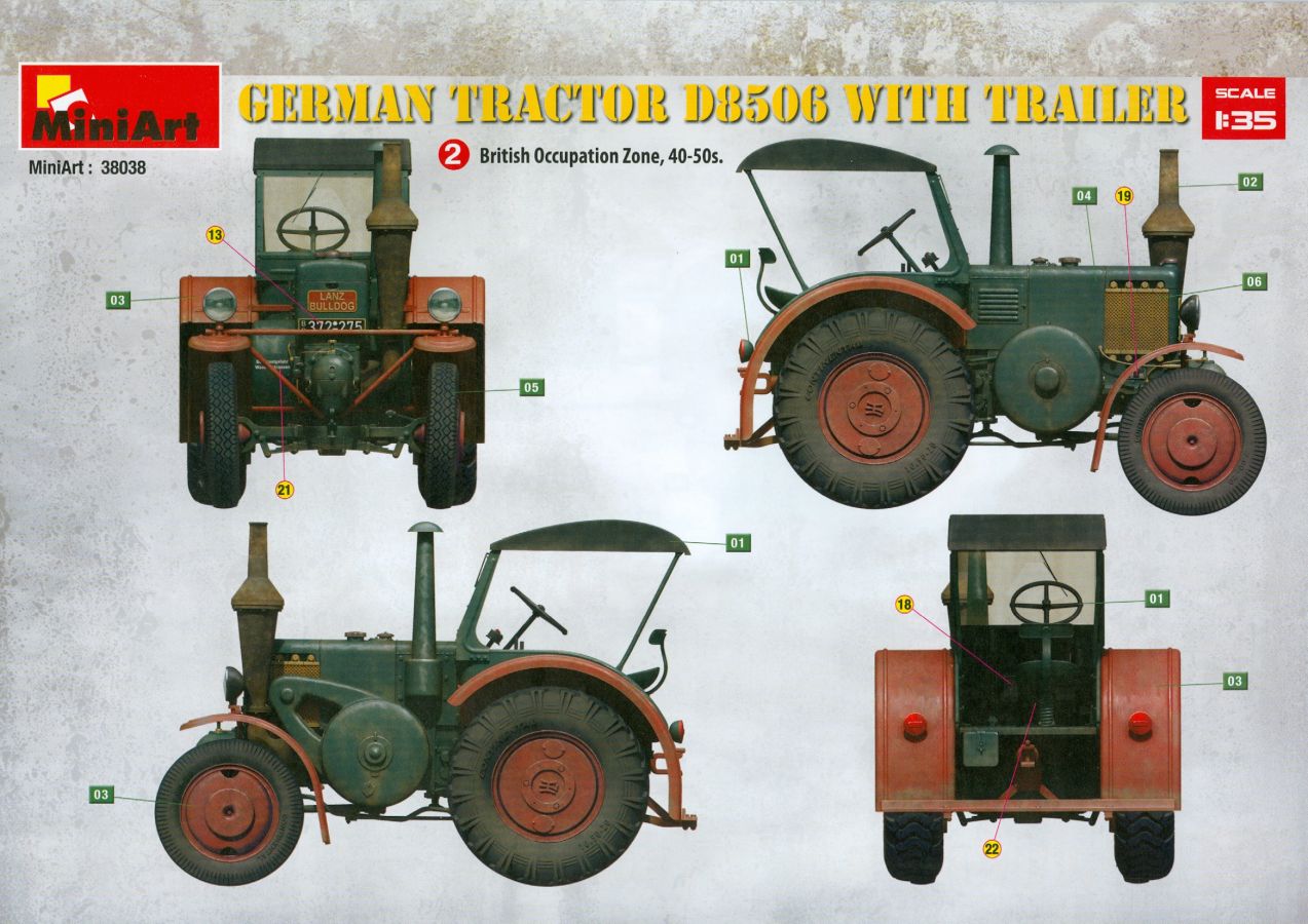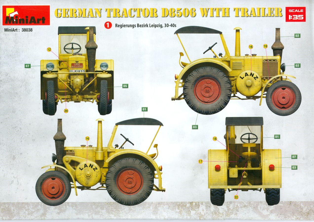 Das Original: Der Bulldog war eigentlich ein für den Einzylinder Glühkopfmotor, mit dem Säge-, Mühlen-, Steinbrecher- und Dreschmaschinen angetrieben wurden, bis man entdeckte, dass sich der Motor auch für Ackerschlepper eignet. Der Schlepper der Firma Lanz mit der Bezeichnung D8506, auch Ackerluft-Bulldog genannt, wurde zwischen 1934 und 1955 hergestellt und wog über 3 Tonnen. Sein 10 Liter Motor mit 30 bzw. 35 PS (22kW/25,6 kW) konnte ihn bis 17,7 km/h beschleunigen. Unter anderem kann er mit Gasöl, Schweröl, Diesel, Petroleum und Pflanzenöl betrieben werden (Vielstoffmotor). In der Landwirtschaft eingesetzt wurde er zum Ziehen von Lasten und bedienen landwirtschaftlicher Geräte eingesetzt, aber auch die Wehrmacht hat ihn genutzt. Der Bausatz: Von der ukrainischen Firma MiniArt gibt es inzwischen etliche Modelle des Lanz Bulldog in 1:35, teils solo, teils mit Anhänger, die sich z.B. in der Bereifung, der Auslegung der Luftansaugung oder der Auspuffanlage unterscheiden. Der 385 x 240 x 60 mm große Stülpdeckelkarton enthält in eine Klarsichttüte verpackt für… · den Traktor: 9 hellgraue, 1 Klarsichtspritzling, 2 Plastikreifen, 1 PE-Platine MiniArt bietet gute Qualität! Man erblickt sauber gespritzte und filigrane Teile. Verzug oder Versatz konnte ich nicht entdecken. Es gibt etwas feinen Grat, wie z.B. auf den Laufflächen der großen Traktorhinterreifen, aber der verschwindet, sobald er das Bastelmesser sieht. Die Auswerfer sind fast ausnahmslos auf die Spritzrahmen gesetzt, so dass die Teile so gut wie keine Spuren davon aufweisen, bzw. nur an Stellen, die nach dem Zusammenbau nicht mehr zu sehen sind. Da der Bulldog in rahmenloser Blockbauweise hergestellt wurde, gibt es große Teile für den Block, der Motor, Getriebe und Hinterachse aufnimmt. So einige Wartungsdeckel mit ihrer prominenten Verschraubung sind bereits angegossen. Es gibt auch einige Kleinteile, die aufgebohrt werden müssen, wenn man die außenliegenden (Kraftstoff? Öl?) Leitungen, die aus Draht selbst hergestellt werden müssten, anbringen möchte. Auffällig ist der Glühkopf, der mit PEs und einer Sechskantmutter weiter detailliert wird. Am Heck gibt es noch eine einfache Anhängekupplung. Der Einsteckbolzen, um den beiliegenden Anhänger anzuhängen, ist bereits mit eingegossen. Da muss man dann improvisieren. Außenliegende Gestänge und Federn liegen als separate Teile bei. Die Motorhaube besteht aus Front-, Rücken-, Seitenteilen und der oberen Abdeckung, die noch 3 Wartungsdeckel erhält. Die Seitenteile wiesen eine sehr schöne Gitterstruktur und Schraubenköpfe im Kühlerbereich auf beiden Seiten auf. Am Rückenteil ist diesmal der Rahmen für die Windschutzscheibe bereits angegossen. Er bekommt noch kleine Seitenflügel. Die Scheibe selbst ist aus kristallklarem Klarsichtmaterial. Einen Scheibenwischer aus PE gibt es auch noch. Natürlich bekommt die Front das Lanz Bulldog PE, das genügend Tiefe hat, dass man die Buchstaben und den Rand leicht anmalen kann. Der D 8506 hat den hochaufragenden Luftansaugstutzen an der linken Seite, der an Teil Eb12 anschließt. Da auch das Seitenteil für die Version ohne den Stutzen dabei ist, darauf achten, dass man nichts verwechselt! Interessant wird auch die Plattform für den Fahrer. Das Riffelblech ist sehr gut dargestellt, aber… es gibt nur ein Pedal, das Kupplungspedal! Keine Angst MiniArt ist da kein Fehler unterlaufen, denn gemäß meiner kurzen Recherche wird dieser Bulldog wohl mit dem Handbremshebel links vom Fahrersitz gebremst und auch festgestellt. Zum Beschleunigen gibt es einen Handgashebel, der an der rechten Seite der Plattform angebracht wird. Der Schalthebel mit Kugelknauf für 3 Vorwärts- und 1 Rückwärtsgang ist natürlich auch dabei. Der Fahrer hat einen schönen, gelochten Schalensitz mit einfacher Rückenlehne. Der Sitz ist mit einem Blechstreifen an der Plattform angebracht und sitzt auf einer Feder auf. Lenkstange und -rad sind zwar dabei, werden aber unter bestimmten Umständen weggelassen. Mehr dazu später. Unter der Plattform wird noch ein Staukasten angebracht, dessen Deckel einen schönen Flügelmutterverschluss zeigt. Die hinteren, sehr ausladenden Kotflügel bilden gleichzeitig hinten offene Seitenwände für den Fahrer. Auf die Kotflügel kommen Rücklichter mit klaren Gläsern und weiteres PE-Gestänge sichert die Kotflügel nach vorn. Innen werden zwei Stützstangen für das Dach angebracht. Das Dach ist auch innen struktiert. Am Gestänge der Kotflügel wird eine hinten querliegende, gelochte Traverse angebracht, die zur Aufnahme von landwirtschaftlichen Gerätschaften dient. Die Vorderachse besteht aus dem Querträger, den Gelenkköpfen, Lenkgestänge und Stabilisatoren. Gemäß dem Aufbau der Teile ist ein möglicher Lenkeinschlag nicht vorgesehen. Auch eine kleinere Anhängevorrichtung mit angegossenem Kupplungsbolzen gibt es. An der linken Seite wird der große Luftansaugstutzen mit Regenschutz und der noch größere Auspuff angebracht. Der Auspuff kommt diesmal ohne PE-Schelle aus. Das Endrohr ist einige Millimeter ausgehöhlt. Die Hinterräder haben beim D 8506 Gummireifen, die am Modell aus Felgeninnen- und Außenseiten mit angegossenen Reifenflanken, die wiederum einen Teil des Profils darstellen und separaten Laufflächen mit dem Rest des groben Profils. Die Vorderräder setzen sich aus je 5 Teilen zusammen, drei Scheiben, die durch ihre Form gut die Profiltiefe wiedergeben und wie bei den Hinterrädern Felgeninnen- und Außenseiten mit angegossenen Reifenflanken. Alle Reifenflanken tragen in erhabenen Buchstaben den Herstellernamen Continental und die Reifengrößen. Auch die Vorderräder bekommen viertelkreisförmige Kotflügel, die an zwei querliegenden Stangen angebracht werden. Auf die Kotflügel klebt man eine weitere Querstange, die die ausgehöhlten Scheinwerfer mit innenliegenden Leuchtkörpern beinhalten. Fein geriffelte Klarsichtscheiben schließen die Schweinwerfer. Links und rechts zwische