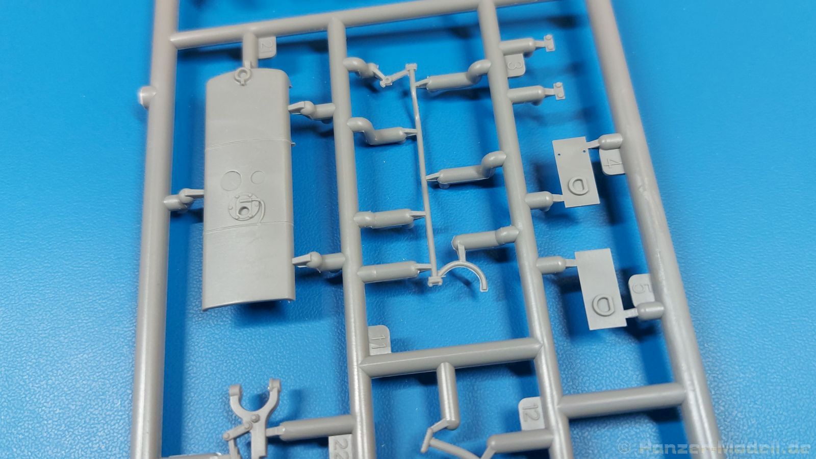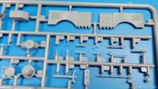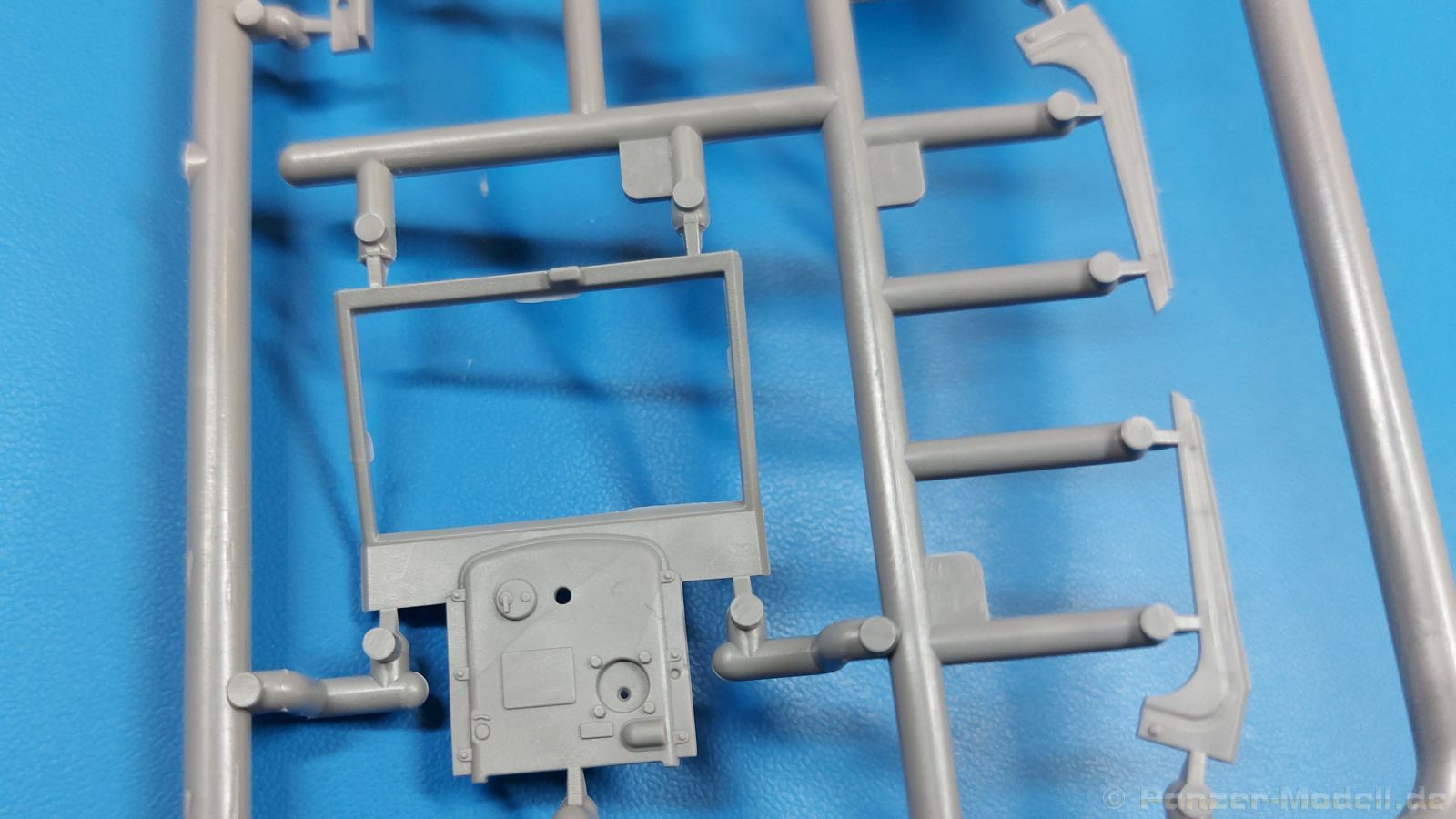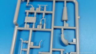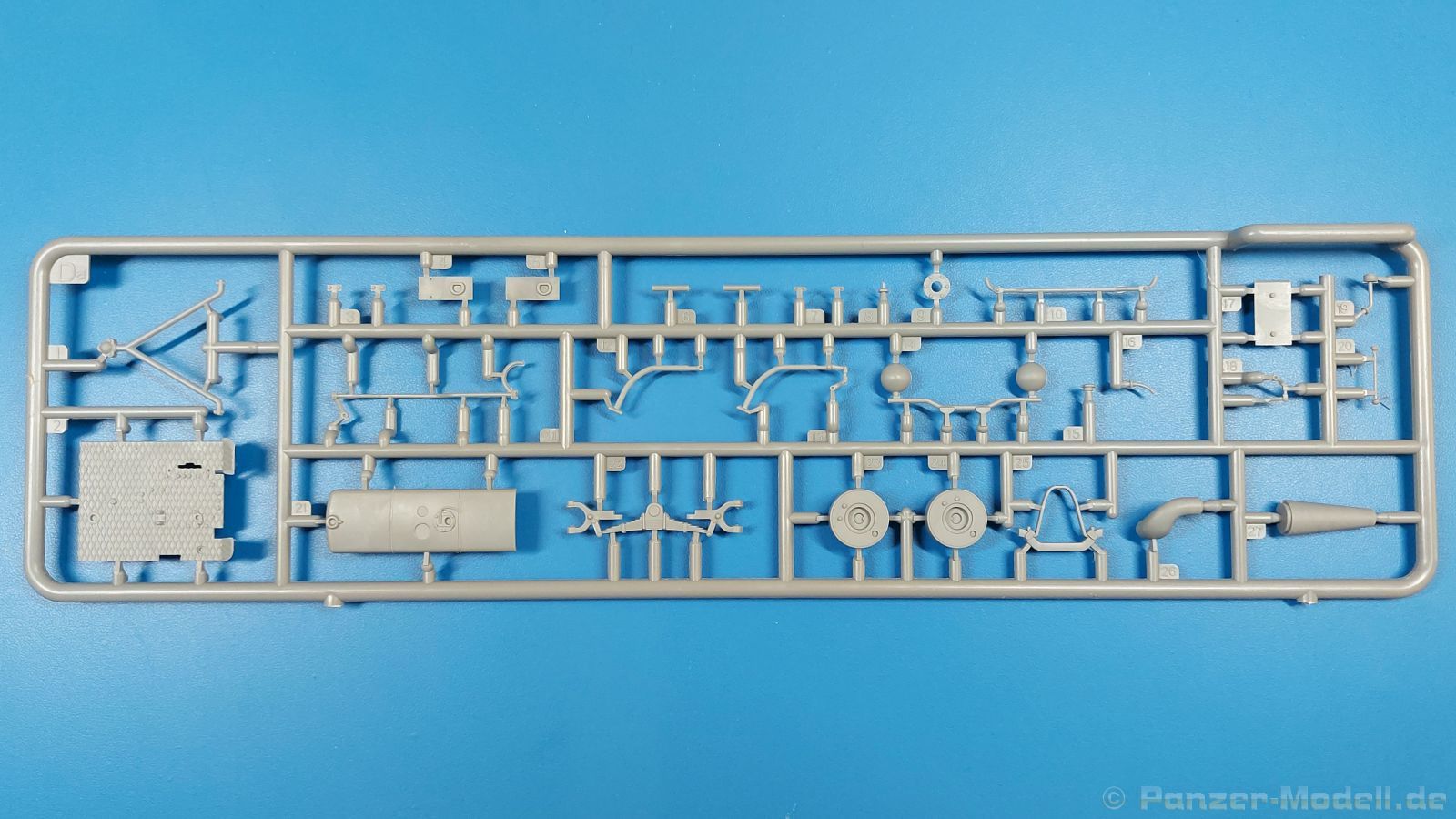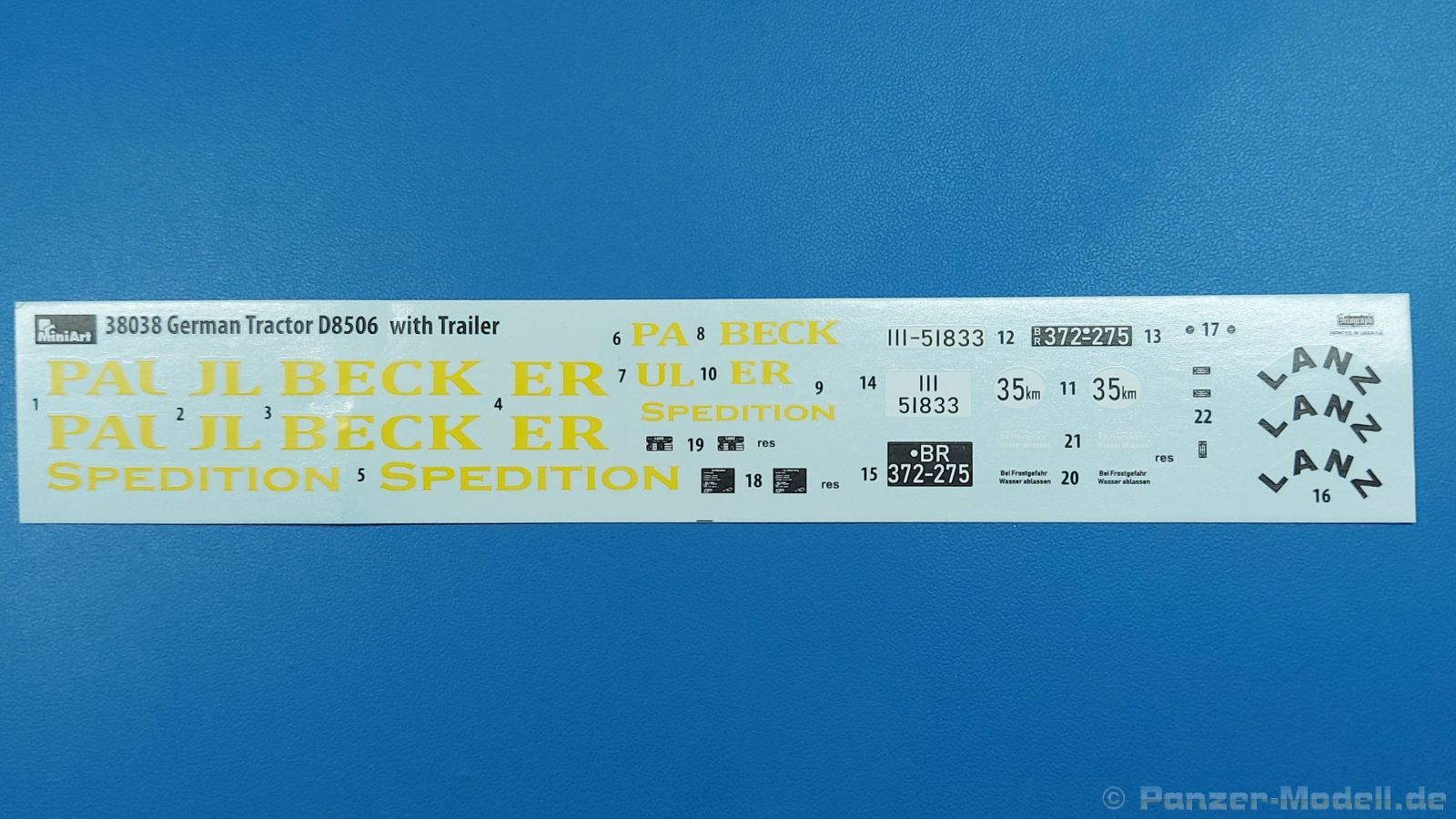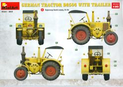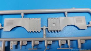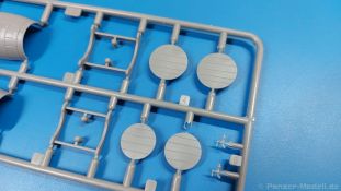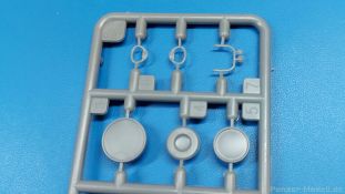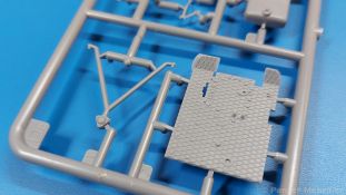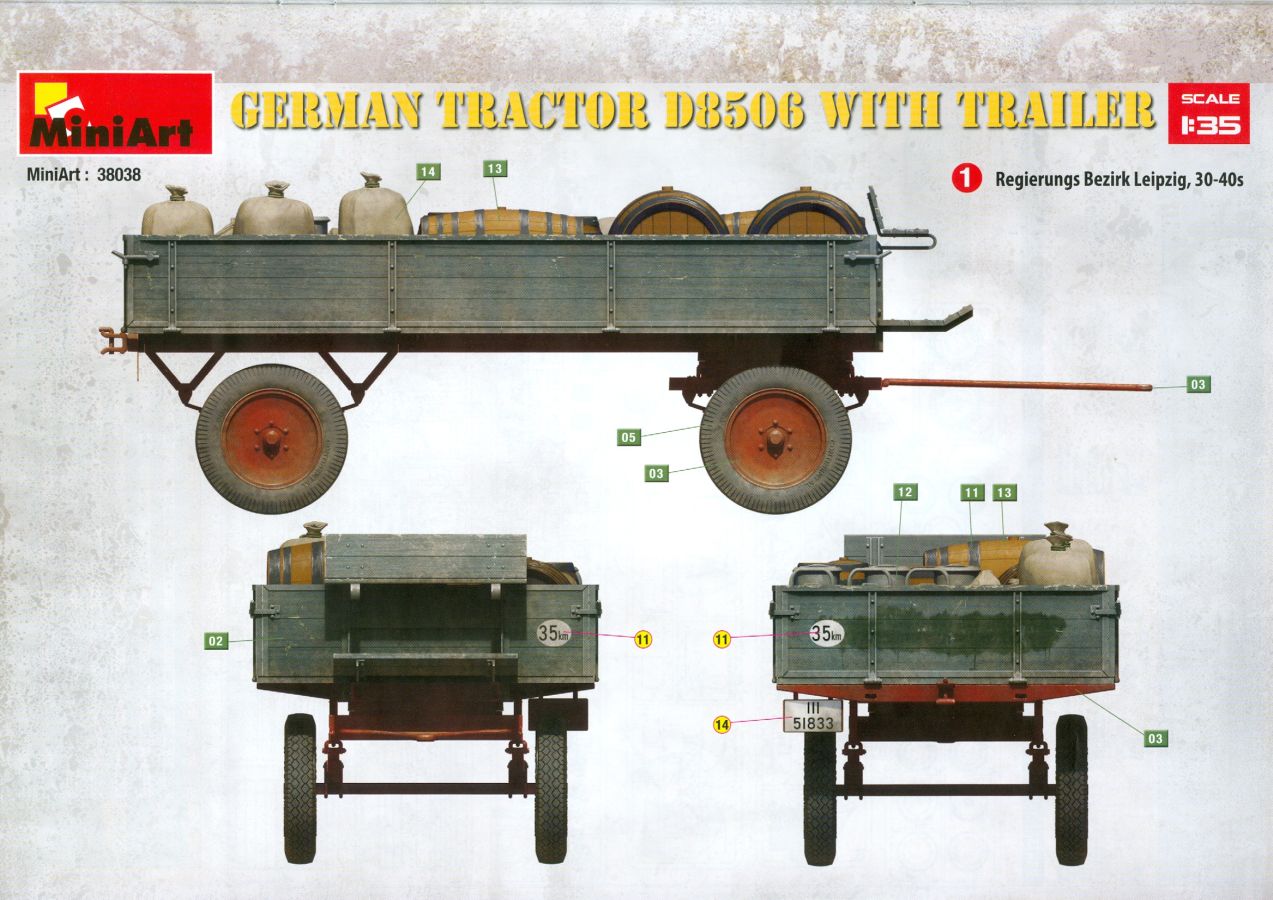 Das Original: Der Bulldog war eigentlich ein für den Einzylinder Glühkopfmotor, mit dem Säge-, Mühlen-, Steinbrecher- und Dreschmaschinen angetrieben wurden, bis man entdeckte, dass sich der Motor auch für Ackerschlepper eignet. Der Schlepper der Firma Lanz mit der Bezeichnung D8506, auch Ackerluft-Bulldog genannt, wurde zwischen 1934 und 1955 hergestellt und wog über 3 Tonnen. Sein 10 Liter Motor mit 30 bzw. 35 PS (22kW/25,6 kW) konnte ihn bis 17,7 km/h beschleunigen. Unter anderem kann er mit Gasöl, Schweröl, Diesel, Petroleum und Pflanzenöl betrieben werden (Vielstoffmotor). In der Landwirtschaft eingesetzt wurde er zum Ziehen von Lasten und bedienen landwirtschaftlicher Geräte eingesetzt, aber auch die Wehrmacht hat ihn genutzt. Der Bausatz: Von der ukrainischen Firma MiniArt gibt es inzwischen etliche Modelle des Lanz Bulldog in 1:35, teils solo, teils mit Anhänger, die sich z.B. in der Bereifung, der Auslegung der Luftansaugung oder der Auspuffanlage unterscheiden. Der 385 x 240 x 60 mm große Stülpdeckelkarton enthält in eine Klarsichttüte verpackt für… · den Traktor: 9 hellgraue, 1 Klarsichtspritzling, 2 Plastikreifen, 1 PE-Platine MiniArt bietet gute Qualität! Man erblickt sauber gespritzte und filigrane Teile. Verzug oder Versatz konnte ich nicht entdecken. Es gibt etwas feinen Grat, wie z.B. auf den Laufflächen der großen Traktorhinterreifen, aber der verschwindet, sobald er das Bastelmesser sieht. Die Auswerfer sind fast ausnahmslos auf die Spritzrahmen gesetzt, so dass die Teile so gut wie keine Spuren davon aufweisen, bzw. nur an Stellen, die nach dem Zusammenbau nicht mehr zu sehen sind. Da der Bulldog in rahmenloser Blockbauweise hergestellt wurde, gibt es große Teile für den Block, der Motor, Getriebe und Hinterachse aufnimmt. So einige Wartungsdeckel mit ihrer prominenten Verschraubung sind bereits angegossen. Es gibt auch einige Kleinteile, die aufgebohrt werden müssen, wenn man die außenliegenden (Kraftstoff? Öl?) Leitungen, die aus Draht selbst hergestellt werden müssten, anbringen möchte. Auffällig ist der Glühkopf, der mit PEs und einer Sechskantmutter weiter detailliert wird. Am Heck gibt es noch eine einfache Anhängekupplung. Der Einsteckbolzen, um den beiliegenden Anhänger anzuhängen, ist bereits mit eingegossen. Da muss man dann improvisieren. Außenliegende Gestänge und Federn liegen als separate Teile bei. Die Motorhaube besteht aus Front-, Rücken-, Seitenteilen und der oberen Abdeckung, die noch 3 Wartungsdeckel erhält. Die Seitenteile wiesen eine sehr schöne Gitterstruktur und Schraubenköpfe im Kühlerbereich auf beiden Seiten auf. Am Rückenteil ist diesmal der Rahmen für die Windschutzscheibe bereits angegossen. Er bekommt noch kleine Seitenflügel. Die Scheibe selbst ist aus kristallklarem Klarsichtmaterial. Einen Scheibenwischer aus PE gibt es auch noch. Natürlich bekommt die Front das Lanz Bulldog PE, das genügend Tiefe hat, dass man die Buchstaben und den Rand leicht anmalen kann. Der D 8506 hat den hochaufragenden Luftansaugstutzen an der linken Seite, der an Teil Eb12 anschließt. Da auch das Seitenteil für die Version ohne den Stutzen dabei ist, darauf achten, dass man nichts verwechselt! Interessant wird auch die Plattform für den Fahrer. Das Riffelblech ist sehr gut dargestellt, aber… es gibt nur ein Pedal, das Kupplungspedal! Keine Angst MiniArt ist da kein Fehler unterlaufen, denn gemäß meiner kurzen Recherche wird dieser Bulldog wohl mit dem Handbremshebel links vom Fahrersitz gebremst und auch festgestellt. Zum Beschleunigen gibt es einen Handgashebel, der an der rechten Seite der Plattform angebracht wird. Der Schalthebel mit Kugelknauf für 3 Vorwärts- und 1 Rückwärtsgang ist natürlich auch dabei. Der Fahrer hat einen schönen, gelochten Schalensitz mit einfacher Rückenlehne. Der Sitz ist mit einem Blechstreifen an der Plattform angebracht und sitzt auf einer Feder auf. Lenkstange und -rad sind zwar dabei, werden aber unter bestimmten Umständen weggelassen. Mehr dazu später. Unter der Plattform wird noch ein Staukasten angebracht, dessen Deckel einen schönen Flügelmutterverschluss zeigt. Die hinteren, sehr ausladenden Kotflügel bilden gleichzeitig hinten offene Seitenwände für den Fahrer. Auf die Kotflügel kommen Rücklichter mit klaren Gläsern und weiteres PE-Gestänge sichert die Kotflügel nach vorn. Innen werden zwei Stützstangen für das Dach angebracht. Das Dach ist auch innen struktiert. Am Gestänge der Kotflügel wird eine hinten querliegende, gelochte Traverse angebracht, die zur Aufnahme von landwirtschaftlichen Gerätschaften dient. Die Vorderachse besteht aus dem Querträger, den Gelenkköpfen, Lenkgestänge und Stabilisatoren. Gemäß dem Aufbau der Teile ist ein möglicher Lenkeinschlag nicht vorgesehen. Auch eine kleinere Anhängevorrichtung mit angegossenem Kupplungsbolzen gibt es. An der linken Seite wird der große Luftansaugstutzen mit Regenschutz und der noch größere Auspuff angebracht. Der Auspuff kommt diesmal ohne PE-Schelle aus. Das Endrohr ist einige Millimeter ausgehöhlt. Die Hinterräder haben beim D 8506 Gummireifen, die am Modell aus Felgeninnen- und Außenseiten mit angegossenen Reifenflanken, die wiederum einen Teil des Profils darstellen und separaten Laufflächen mit dem Rest des groben Profils. Die Vorderräder setzen sich aus je 5 Teilen zusammen, drei Scheiben, die durch ihre Form gut die Profiltiefe wiedergeben und wie bei den Hinterrädern Felgeninnen- und Außenseiten mit angegossenen Reifenflanken. Alle Reifenflanken tragen in erhabenen Buchstaben den Herstellernamen Continental und die Reifengrößen. Auch die Vorderräder bekommen viertelkreisförmige Kotflügel, die an zwei querliegenden Stangen angebracht werden. Auf die Kotflügel klebt man eine weitere Querstange, die die ausgehöhlten Scheinwerfer mit innenliegenden Leuchtkörpern beinhalten. Fein geriffelte Klarsichtscheiben schließen die Schweinwerfer. Links und rechts zwische