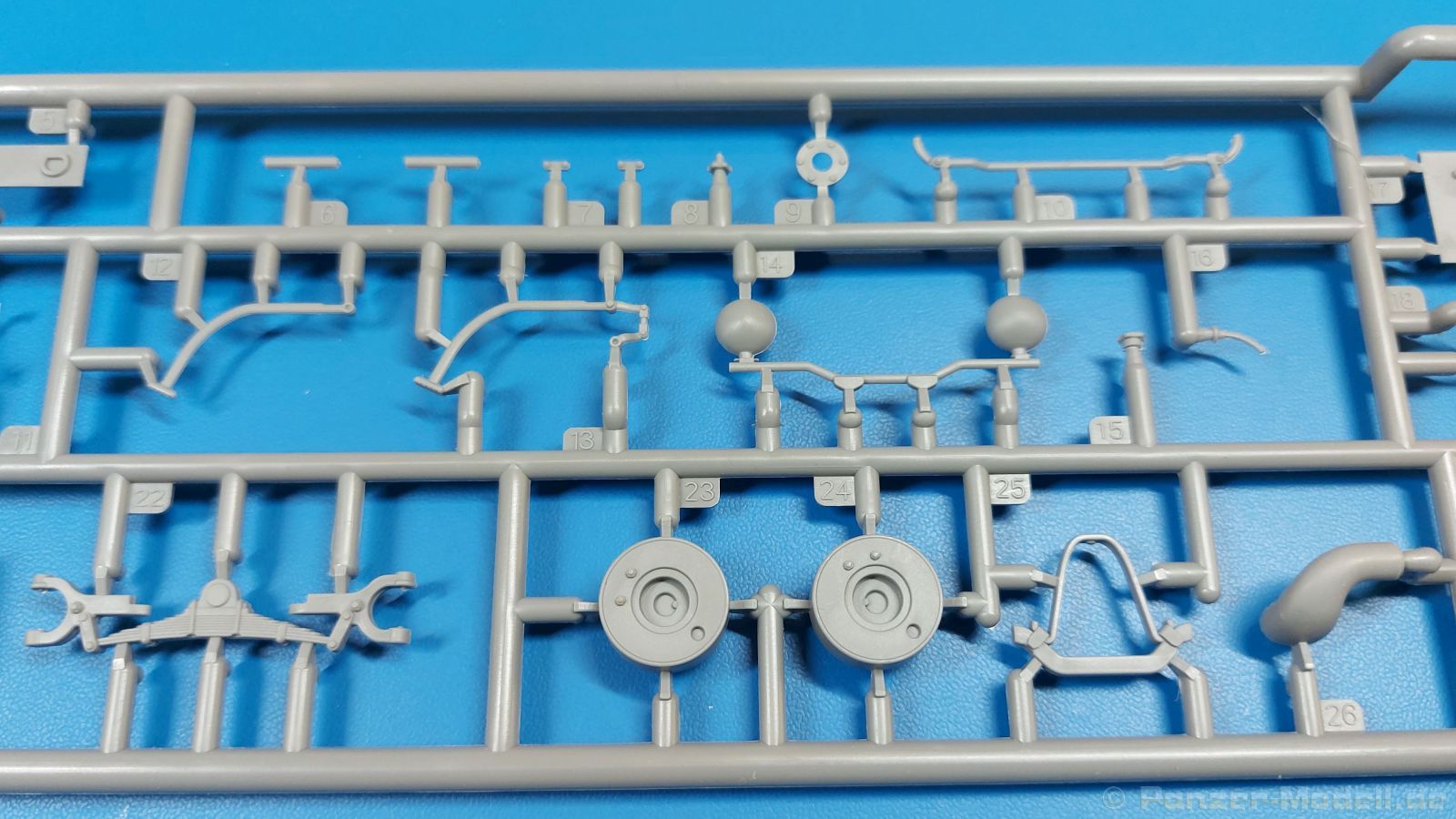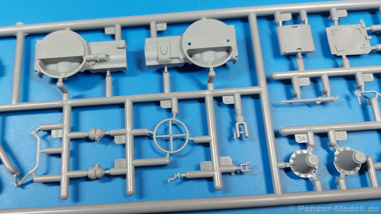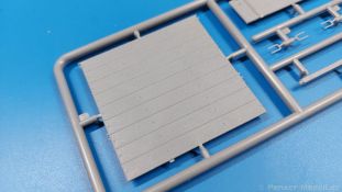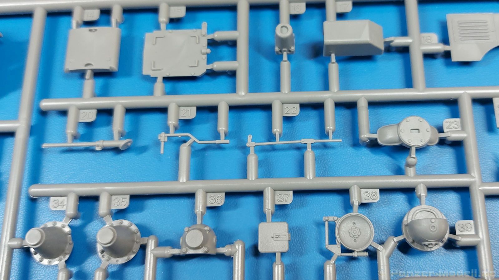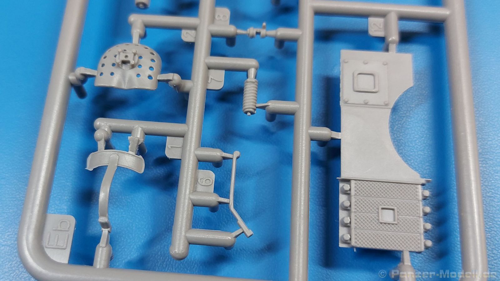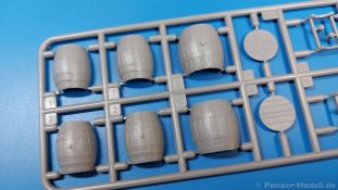 Das Original: Der Bulldog war eigentlich ein für den Einzylinder Glühkopfmotor, mit dem Säge-, Mühlen-, Steinbrecher- und Dreschmaschinen angetrieben wurden, bis man entdeckte, dass sich der Motor auch für Ackerschlepper eignet. Der Schlepper der Firma Lanz mit der Bezeichnung D8506, auch Ackerluft-Bulldog genannt, wurde zwischen 1934 und 1955 hergestellt und wog über 3 Tonnen. Sein 10 Liter Motor mit 30 bzw. 35 PS (22kW/25,6 kW) konnte ihn bis 17,7 km/h beschleunigen. Unter anderem kann er mit Gasöl, Schweröl, Diesel, Petroleum und Pflanzenöl betrieben werden (Vielstoffmotor). In der Landwirtschaft eingesetzt wurde er zum Ziehen von Lasten und bedienen landwirtschaftlicher Geräte eingesetzt, aber auch die Wehrmacht hat ihn genutzt. Der Bausatz: Von der ukrainischen Firma MiniArt gibt es inzwischen etliche Modelle des Lanz Bulldog in 1:35, teils solo, teils mit Anhänger, die sich z.B. in der Bereifung, der Auslegung der Luftansaugung oder der Auspuffanlage unterscheiden. Der 385 x 240 x 60 mm große Stülpdeckelkarton enthält in eine Klarsichttüte verpackt für… · den Traktor: 9 hellgraue, 1 Klarsichtspritzling, 2 Plastikreifen, 1 PE-Platine MiniArt bietet gute Qualität! Man erblickt sauber gespritzte und filigrane Teile. Verzug oder Versatz konnte ich nicht entdecken. Es gibt etwas feinen Grat, wie z.B. auf den Laufflächen der großen Traktorhinterreifen, aber der verschwindet, sobald er das Bastelmesser sieht. Die Auswerfer sind fast ausnahmslos auf die Spritzrahmen gesetzt, so dass die Teile so gut wie keine Spuren davon aufweisen, bzw. nur an Stellen, die nach dem Zusammenbau nicht mehr zu sehen sind. Da der Bulldog in rahmenloser Blockbauweise hergestellt wurde, gibt es große Teile für den Block, der Motor, Getriebe und Hinterachse aufnimmt. So einige Wartungsdeckel mit ihrer prominenten Verschraubung sind bereits angegossen. Es gibt auch einige Kleinteile, die aufgebohrt werden müssen, wenn man die außenliegenden (Kraftstoff? Öl?) Leitungen, die aus Draht selbst hergestellt werden müssten, anbringen möchte. Auffällig ist der Glühkopf, der mit PEs und einer Sechskantmutter weiter detailliert wird. Am Heck gibt es noch eine einfache Anhängekupplung. Der Einsteckbolzen, um den beiliegenden Anhänger anzuhängen, ist bereits mit eingegossen. Da muss man dann improvisieren. Außenliegende Gestänge und Federn liegen als separate Teile bei. Die Motorhaube besteht aus Front-, Rücken-, Seitenteilen und der oberen Abdeckung, die noch 3 Wartungsdeckel erhält. Die Seitenteile wiesen eine sehr schöne Gitterstruktur und Schraubenköpfe im Kühlerbereich auf beiden Seiten auf. Am Rückenteil ist diesmal der Rahmen für die Windschutzscheibe bereits angegossen. Er bekommt noch kleine Seitenflügel. Die Scheibe selbst ist aus kristallklarem Klarsichtmaterial. Einen Scheibenwischer aus PE gibt es auch noch. Natürlich bekommt die Front das Lanz Bulldog PE, das genügend Tiefe hat, dass man die Buchstaben und den Rand leicht anmalen kann. Der D 8506 hat den hochaufragenden Luftansaugstutzen an der linken Seite, der an Teil Eb12 anschließt. Da auch das Seitenteil für die Version ohne den Stutzen dabei ist, darauf achten, dass man nichts verwechselt! Interessant wird auch die Plattform für den Fahrer. Das Riffelblech ist sehr gut dargestellt, aber… es gibt nur ein Pedal, das Kupplungspedal! Keine Angst MiniArt ist da kein Fehler unterlaufen, denn gemäß meiner kurzen Recherche wird dieser Bulldog wohl mit dem Handbremshebel links vom Fahrersitz gebremst und auch festgestellt. Zum Beschleunigen gibt es einen Handgashebel, der an der rechten Seite der Plattform angebracht wird. Der Schalthebel mit Kugelknauf für 3 Vorwärts- und 1 Rückwärtsgang ist natürlich auch dabei. Der Fahrer hat einen schönen, gelochten Schalensitz mit einfacher Rückenlehne. Der Sitz ist mit einem Blechstreifen an der Plattform angebracht und sitzt auf einer Feder auf. Lenkstange und -rad sind zwar dabei, werden aber unter bestimmten Umständen weggelassen. Mehr dazu später. Unter der Plattform wird noch ein Staukasten angebracht, dessen Deckel einen schönen Flügelmutterverschluss zeigt. Die hinteren, sehr ausladenden Kotflügel bilden gleichzeitig hinten offene Seitenwände für den Fahrer. Auf die Kotflügel kommen Rücklichter mit klaren Gläsern und weiteres PE-Gestänge sichert die Kotflügel nach vorn. Innen werden zwei Stützstangen für das Dach angebracht. Das Dach ist auch innen struktiert. Am Gestänge der Kotflügel wird eine hinten querliegende, gelochte Traverse angebracht, die zur Aufnahme von landwirtschaftlichen Gerätschaften dient. Die Vorderachse besteht aus dem Querträger, den Gelenkköpfen, Lenkgestänge und Stabilisatoren. Gemäß dem Aufbau der Teile ist ein möglicher Lenkeinschlag nicht vorgesehen. Auch eine kleinere Anhängevorrichtung mit angegossenem Kupplungsbolzen gibt es. An der linken Seite wird der große Luftansaugstutzen mit Regenschutz und der noch größere Auspuff angebracht. Der Auspuff kommt diesmal ohne PE-Schelle aus. Das Endrohr ist einige Millimeter ausgehöhlt. Die Hinterräder haben beim D 8506 Gummireifen, die am Modell aus Felgeninnen- und Außenseiten mit angegossenen Reifenflanken, die wiederum einen Teil des Profils darstellen und separaten Laufflächen mit dem Rest des groben Profils. Die Vorderräder setzen sich aus je 5 Teilen zusammen, drei Scheiben, die durch ihre Form gut die Profiltiefe wiedergeben und wie bei den Hinterrädern Felgeninnen- und Außenseiten mit angegossenen Reifenflanken. Alle Reifenflanken tragen in erhabenen Buchstaben den Herstellernamen Continental und die Reifengrößen. Auch die Vorderräder bekommen viertelkreisförmige Kotflügel, die an zwei querliegenden Stangen angebracht werden. Auf die Kotflügel klebt man eine weitere Querstange, die die ausgehöhlten Scheinwerfer mit innenliegenden Leuchtkörpern beinhalten. Fein geriffelte Klarsichtscheiben schließen die Schweinwerfer. Links und rechts zwische