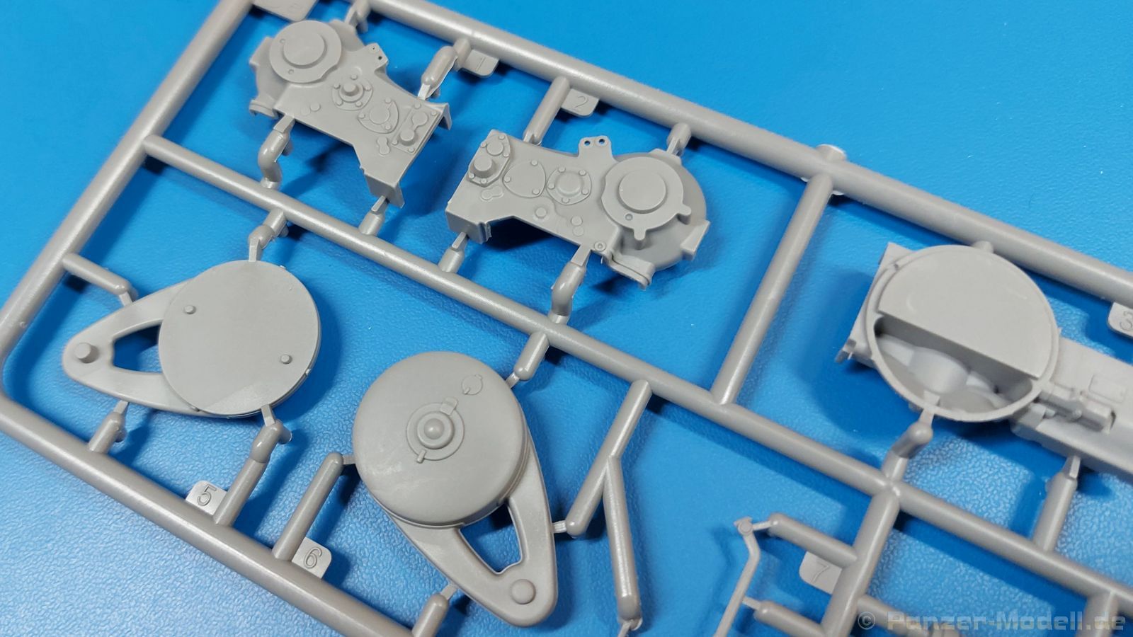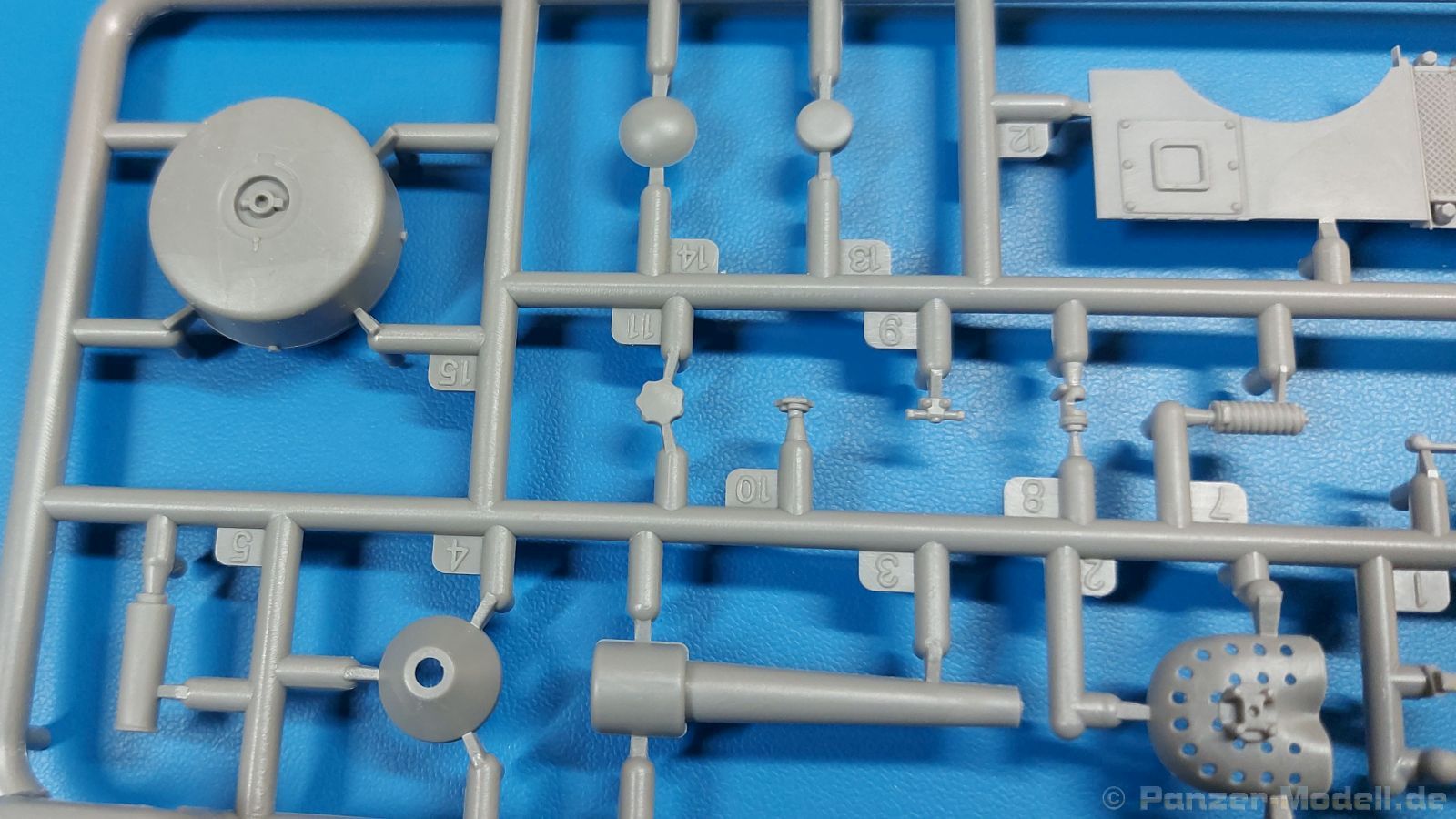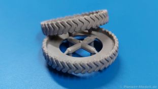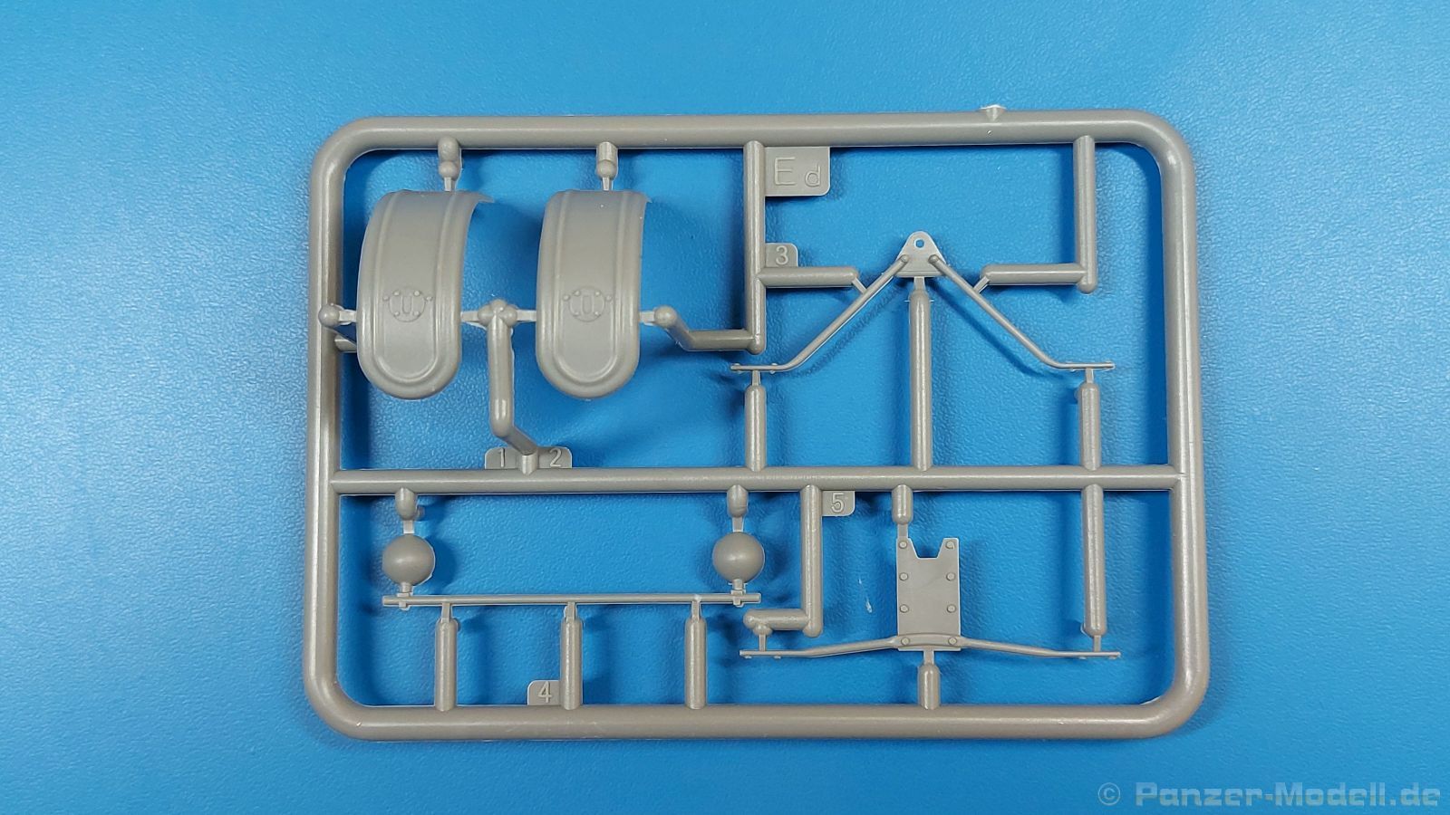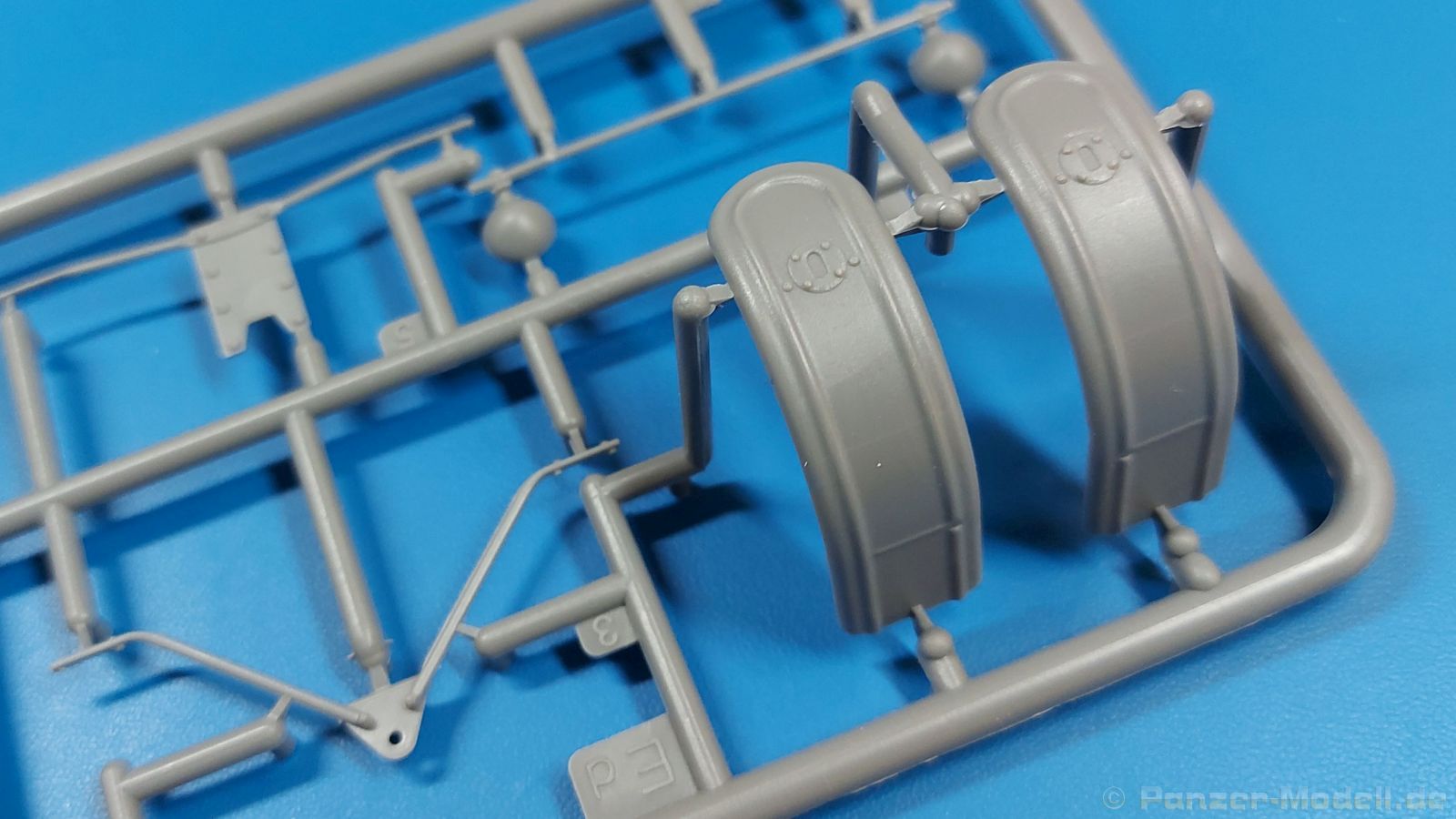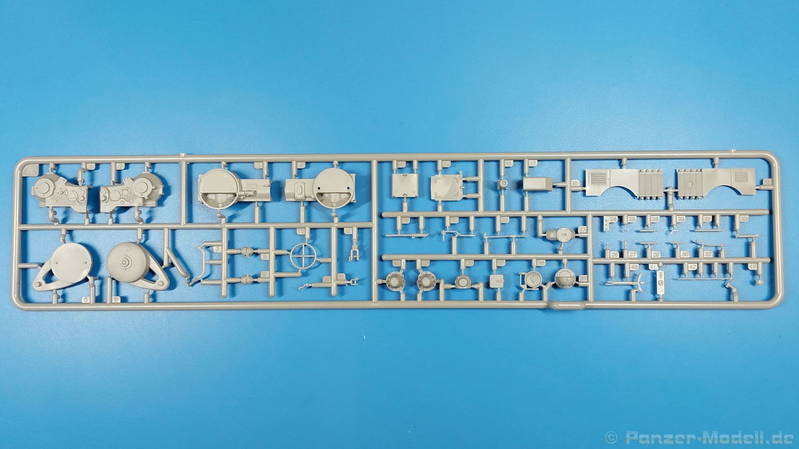 Das Original: Der Bulldog war eigentlich ein für den Einzylinder Glühkopfmotor, mit dem Säge-, Mühlen-, Steinbrecher- und Dreschmaschinen angetrieben wurden, bis man entdeckte, dass sich der Motor auch für Ackerschlepper eignet. Der Schlepper der Firma Lanz mit der Bezeichnung D8506, auch Ackerluft-Bulldog genannt, wurde zwischen 1934 und 1955 hergestellt und wog über 3 Tonnen. Sein 10 Liter Motor mit 30 bzw. 35 PS (22kW/25,6 kW) konnte ihn bis 17,7 km/h beschleunigen. Unter anderem kann er mit Gasöl, Schweröl, Diesel, Petroleum und Pflanzenöl betrieben werden (Vielstoffmotor). In der Landwirtschaft eingesetzt wurde er zum Ziehen von Lasten und bedienen landwirtschaftlicher Geräte eingesetzt, aber auch die Wehrmacht hat ihn genutzt. Der Bausatz: Von der ukrainischen Firma MiniArt gibt es inzwischen etliche Modelle des Lanz Bulldog in 1:35, teils solo, teils mit Anhänger, die sich z.B. in der Bereifung, der Auslegung der Luftansaugung oder der Auspuffanlage unterscheiden. Der 385 x 240 x 60 mm große Stülpdeckelkarton enthält in eine Klarsichttüte verpackt für… · den Traktor: 9 hellgraue, 1 Klarsichtspritzling, 2 Plastikreifen, 1 PE-Platine MiniArt bietet gute Qualität! Man erblickt sauber gespritzte und filigrane Teile. Verzug oder Versatz konnte ich nicht entdecken. Es gibt etwas feinen Grat, wie z.B. auf den Laufflächen der großen Traktorhinterreifen, aber der verschwindet, sobald er das Bastelmesser sieht. Die Auswerfer sind fast ausnahmslos auf die Spritzrahmen gesetzt, so dass die Teile so gut wie keine Spuren davon aufweisen, bzw. nur an Stellen, die nach dem Zusammenbau nicht mehr zu sehen sind. Da der Bulldog in rahmenloser Blockbauweise hergestellt wurde, gibt es große Teile für den Block, der Motor, Getriebe und Hinterachse aufnimmt. So einige Wartungsdeckel mit ihrer prominenten Verschraubung sind bereits angegossen. Es gibt auch einige Kleinteile, die aufgebohrt werden müssen, wenn man die außenliegenden (Kraftstoff? Öl?) Leitungen, die aus Draht selbst hergestellt werden müssten, anbringen möchte. Auffällig ist der Glühkopf, der mit PEs und einer Sechskantmutter weiter detailliert wird. Am Heck gibt es noch eine einfache Anhängekupplung. Der Einsteckbolzen, um den beiliegenden Anhänger anzuhängen, ist bereits mit eingegossen. Da muss man dann improvisieren. Außenliegende Gestänge und Federn liegen als separate Teile bei. Die Motorhaube besteht aus Front-, Rücken-, Seitenteilen und der oberen Abdeckung, die noch 3 Wartungsdeckel erhält. Die Seitenteile wiesen eine sehr schöne Gitterstruktur und Schraubenköpfe im Kühlerbereich auf beiden Seiten auf. Am Rückenteil ist diesmal der Rahmen für die Windschutzscheibe bereits angegossen. Er bekommt noch kleine Seitenflügel. Die Scheibe selbst ist aus kristallklarem Klarsichtmaterial. Einen Scheibenwischer aus PE gibt es auch noch. Natürlich bekommt die Front das Lanz Bulldog PE, das genügend Tiefe hat, dass man die Buchstaben und den Rand leicht anmalen kann. Der D 8506 hat den hochaufragenden Luftansaugstutzen an der linken Seite, der an Teil Eb12 anschließt. Da auch das Seitenteil für die Version ohne den Stutzen dabei ist, darauf achten, dass man nichts verwechselt! Interessant wird auch die Plattform für den Fahrer. Das Riffelblech ist sehr gut dargestellt, aber… es gibt nur ein Pedal, das Kupplungspedal! Keine Angst MiniArt ist da kein Fehler unterlaufen, denn gemäß meiner kurzen Recherche wird dieser Bulldog wohl mit dem Handbremshebel links vom Fahrersitz gebremst und auch festgestellt. Zum Beschleunigen gibt es einen Handgashebel, der an der rechten Seite der Plattform angebracht wird. Der Schalthebel mit Kugelknauf für 3 Vorwärts- und 1 Rückwärtsgang ist natürlich auch dabei. Der Fahrer hat einen schönen, gelochten Schalensitz mit einfacher Rückenlehne. Der Sitz ist mit einem Blechstreifen an der Plattform angebracht und sitzt auf einer Feder auf. Lenkstange und -rad sind zwar dabei, werden aber unter bestimmten Umständen weggelassen. Mehr dazu später. Unter der Plattform wird noch ein Staukasten angebracht, dessen Deckel einen schönen Flügelmutterverschluss zeigt. Die hinteren, sehr ausladenden Kotflügel bilden gleichzeitig hinten offene Seitenwände für den Fahrer. Auf die Kotflügel kommen Rücklichter mit klaren Gläsern und weiteres PE-Gestänge sichert die Kotflügel nach vorn. Innen werden zwei Stützstangen für das Dach angebracht. Das Dach ist auch innen struktiert. Am Gestänge der Kotflügel wird eine hinten querliegende, gelochte Traverse angebracht, die zur Aufnahme von landwirtschaftlichen Gerätschaften dient. Die Vorderachse besteht aus dem Querträger, den Gelenkköpfen, Lenkgestänge und Stabilisatoren. Gemäß dem Aufbau der Teile ist ein möglicher Lenkeinschlag nicht vorgesehen. Auch eine kleinere Anhängevorrichtung mit angegossenem Kupplungsbolzen gibt es. An der linken Seite wird der große Luftansaugstutzen mit Regenschutz und der noch größere Auspuff angebracht. Der Auspuff kommt diesmal ohne PE-Schelle aus. Das Endrohr ist einige Millimeter ausgehöhlt. Die Hinterräder haben beim D 8506 Gummireifen, die am Modell aus Felgeninnen- und Außenseiten mit angegossenen Reifenflanken, die wiederum einen Teil des Profils darstellen und separaten Laufflächen mit dem Rest des groben Profils. Die Vorderräder setzen sich aus je 5 Teilen zusammen, drei Scheiben, die durch ihre Form gut die Profiltiefe wiedergeben und wie bei den Hinterrädern Felgeninnen- und Außenseiten mit angegossenen Reifenflanken. Alle Reifenflanken tragen in erhabenen Buchstaben den Herstellernamen Continental und die Reifengrößen. Auch die Vorderräder bekommen viertelkreisförmige Kotflügel, die an zwei querliegenden Stangen angebracht werden. Auf die Kotflügel klebt man eine weitere Querstange, die die ausgehöhlten Scheinwerfer mit innenliegenden Leuchtkörpern beinhalten. Fein geriffelte Klarsichtscheiben schließen die Schweinwerfer. Links und rechts zwische