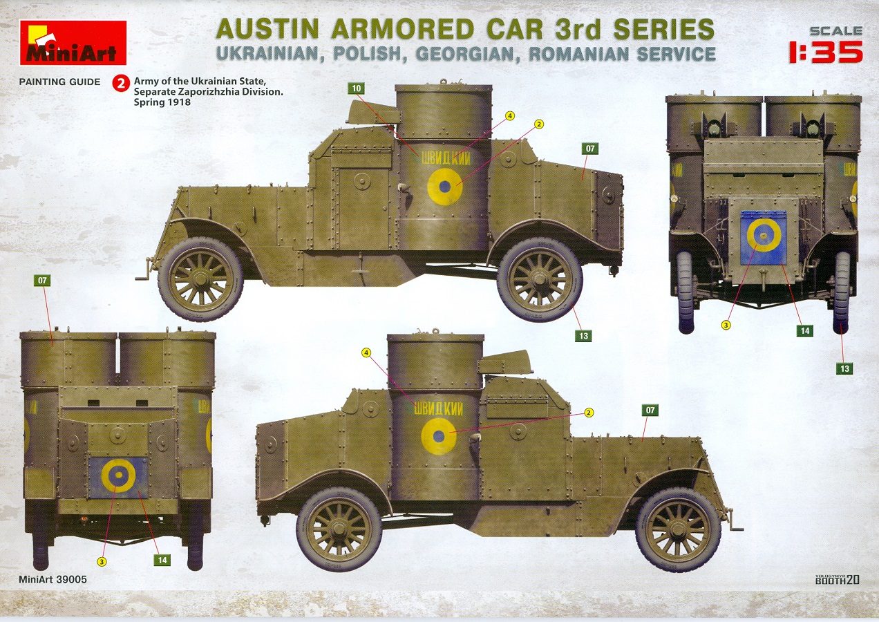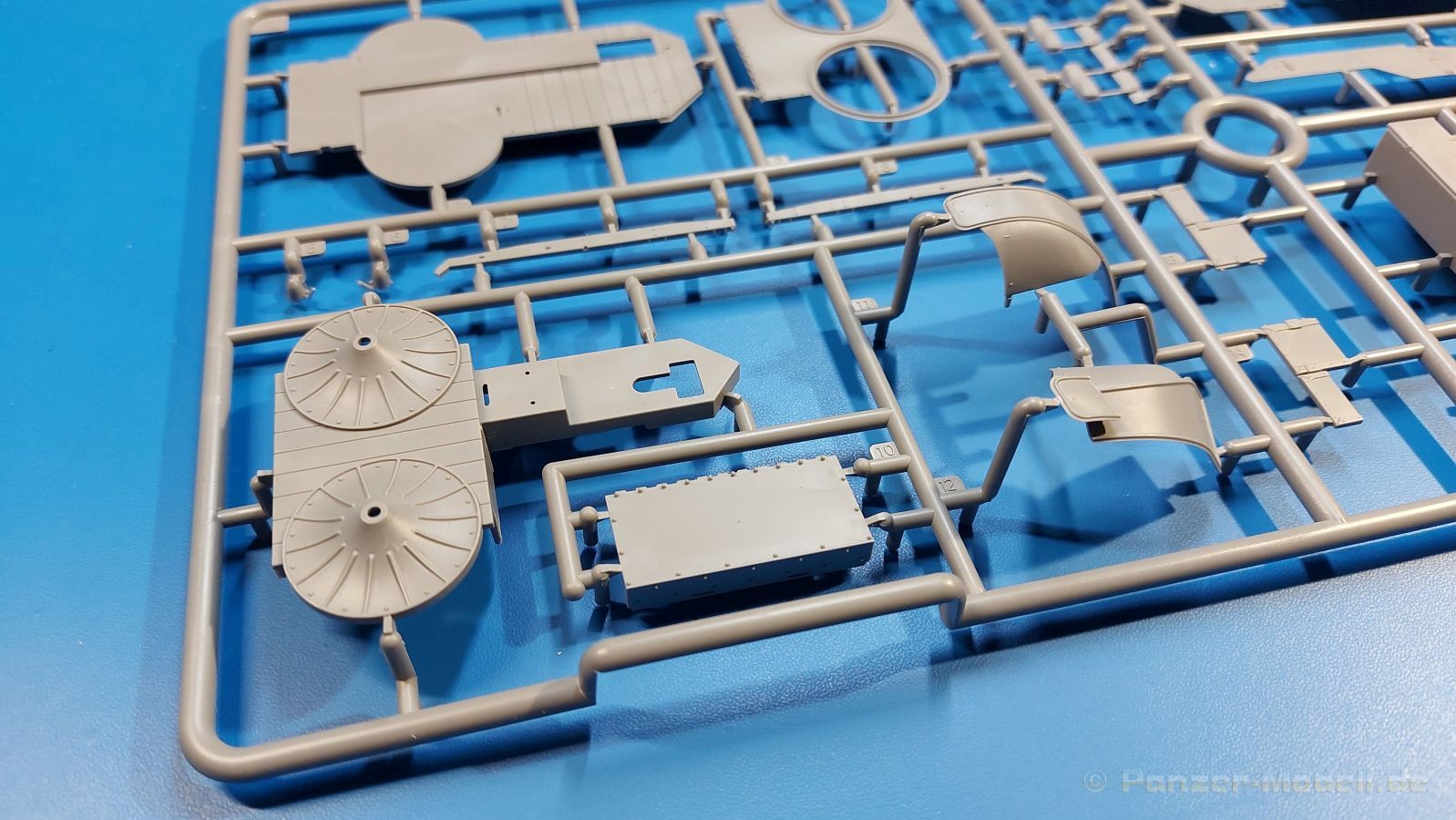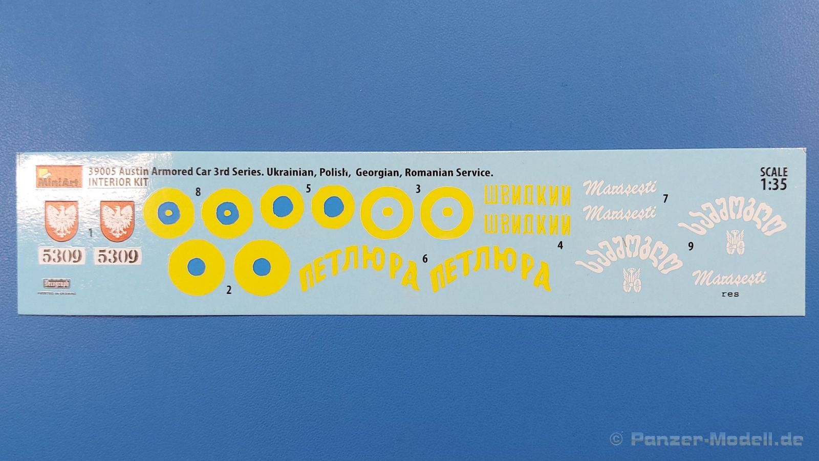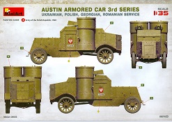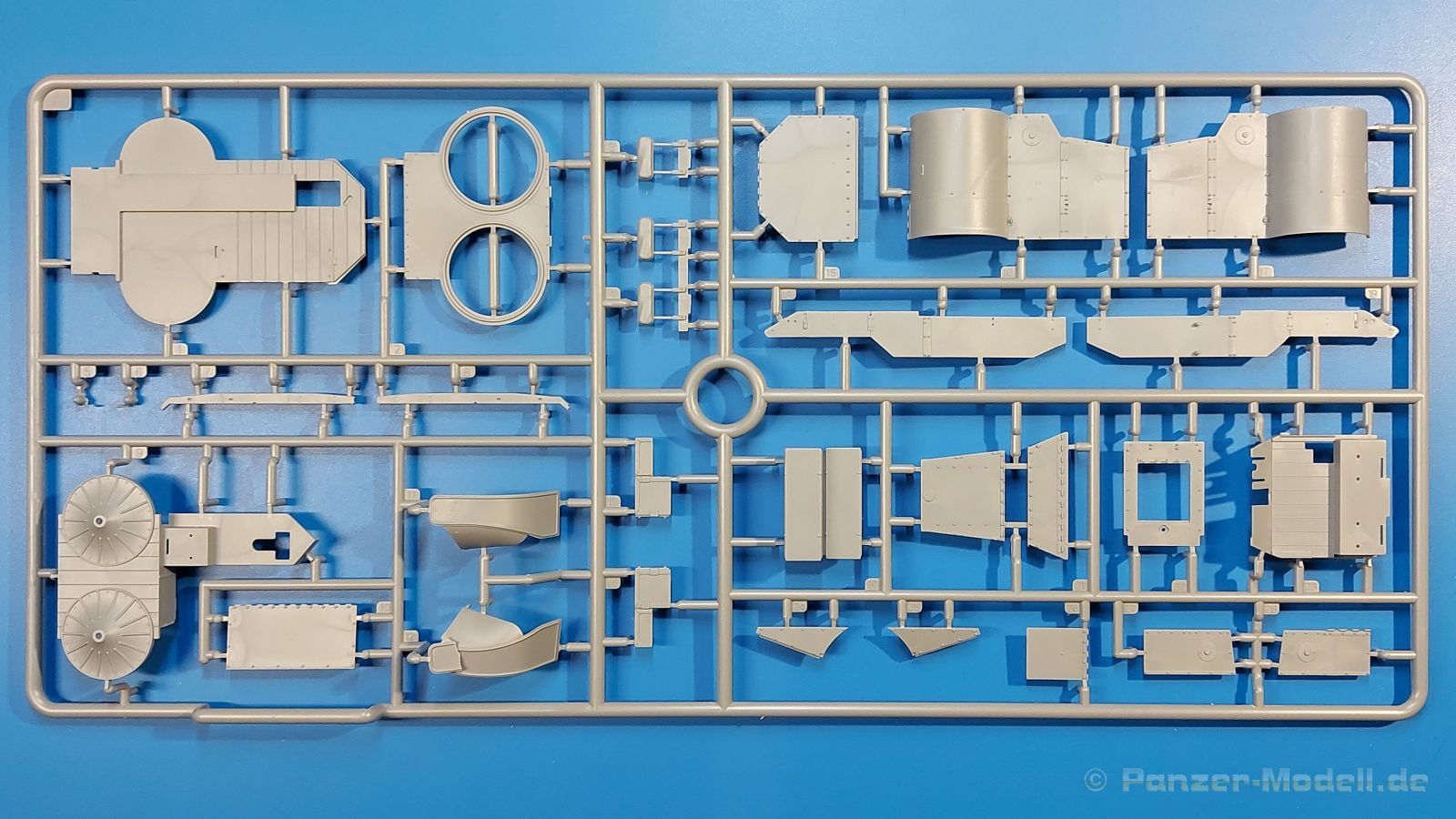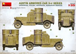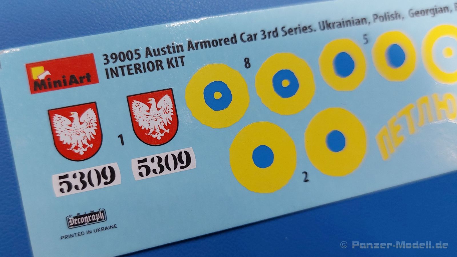 Das Original: Der Austin Panzerwagen wurde während des 1. Weltkrieges produziert. Er basierte ursprünglich auf einem Pkw Fahrgestell und war rundum gepanzert und mit 2 MG-Türmen ausgestattet. E wog über 5 to. und erreichte mit einem 4-Zylinder 50 PS (37 kW) Benzinmotor 56 km/h Höchstgeschwindigkeit. Die Besatzung bestand ursprünglich aus 4 Soldaten, aber nach Einführung des Rückwärtsfahrers dann aus 5. Auch wenn es eigentlich ein britisches Fahrzeug war und im 1. Weltkrieg eingesetzt wurde, erlangte es doch eher Bekanntheit durch seine Nutzung während des russischen Bürgerkrieges. Dort wurde er auch oft als Beutefahrzeug eingesetzt. Der Bausatz: MiniArt hat die Gewohnheit, möglichst viel aus seinen Modellen herauszuholen und Varianten anzubieten. So kommt es, dass dieser Bausatz einer von (bisher) vieren ist. Diesmal haben wir die Version eines, mit Interior voll ausgestatteten, „Beute-Austins“ vor uns. Man möge mir den langen Text verzeihen, aber da war wohl etwas mehr Begeisterung mit im Spiel! Im 385 x 240 x 60 mm großen Karton befinden sich 17 hellgraue und 1 Klarsichtspritzling, 1 PE-Platine, 1 Decalsheet und natürlich eine Bau-/Bemalungsanleitung. Die Teile sind auf dem heutigen Stand der Technik produziert und können mit allerlei Details und Feinheiten glänzen. So gut wie keine Auswerferspuren auf Teilen, da diese meist auf die Gießäste gesetzt sind. Bei den wenigen Teilen, wo man glaubt, Auswerferspuren zu sehen, sitzen sie auf Stellen, die nach dem Bau nicht mehr zu sehen sind. Versatz, Gussgrat konnte ich mit bloßem Auge nicht entdecken. Original verpackt erwarten einen keine Probleme, aber wenn man die Spritzlinge nicht mehr in die Plastiktüten zurückpackt, kann es beim Transport passieren, dass man etwas Bruch hat. In meinem Fall betraf dies den vorderen, linken Kotflügel, dessen vordere Kante angebrochen war. Aber auch dies lässt sich mit den modernen Klebstoffen leicht reparieren. Der Leiterrahmen setzt sich traditionell aus Längs- und Querträgern, verstärkt durch Kreuzträger zusammen. Für den sehr gut detaillierten Motor gibt es extra Längsträger zum Einbau in den Rahmen. Der wassergekühlte Motor, ein Modell im Modell, bietet alle wichtigen Elemente wie z.B. Ölwanne mit separater Ölablassschraube, Motorblock mit gut erkennbaren, erhabenen Austin Aufschriften, Zylinderkopf mit ausliegenden Ventilfedern, Zündkerzen sind erkennbar, Luftansaugkanal mit kleinem Luftfilter, Abgaskrümmer, separate Wasserpumpe, Kühlleitungen, Keilriemen und Kühlerpropeller. Feine PE-Teile peppen den Motor weiter auf. Dazu kommen natürlich noch der Kühler selbst mit feinen Kühlrippen und separatem Kühlwasserdeckel, Kupplung (? - anhand der Pedalerie und Hebel bin ich nicht sicher, ob der Austin bereits so etwas wie eine Kupplung hatte oder ob die Gänge in Tradition feinster spannabhebender Verformung reingequält wurden… Für Aufklärung zur Technik wären wir dankbar!) und Getriebe. Auch auf dem Getriebe finden wir die erhabene Austin Aufschrift. Die mehrfach unterteilte Bodenplatte zeigt in einigen Bereichen eine Bretterstruktur. Im hinteren Bereich wird eine etwas erhöhte Plattform für den Rückwärtsfahrer und die beiden MG-Türme angebracht. Die kreisrunden Bodenflächen der Türme sind mit sternförmigen Riffeln versehen, damit die MG-Bedienungen sich mit den Füßen abstoßen konnten, um die Türme zu drehen. Riffel und Nieten sind sehr schön wiedergegeben. Sitzfläche und Rückenlehne geben glaubhaft die Polsterstruktur wieder. Auch die Verschraubungen der Rückenlehne gefallen mir. Neben dem Rückwärtsfahrer finden zwei aufeinander gesetzte Kisten Platz, von denen ich vermute, dass sich zumindest in einer davon der Tank befand. Fahrer und Beifahrer habengleiche Sitzkissen wie der Rückwärtsfahrer. Ähnlich die beiden Rückenlehnen, die aber bereits zusammen an einem Brett montiert sind. Während das Lenkrad des Rückwärtsfahrers ein einfaches 4-Speichen Rad ist, besitzt das Hauptlenkrad ein kleineren, inneren Ring mit zusätzliche Hebeln. Die Armaturentafel zeigt sehr viele Instrumente. Leider gibt es keine Decals dazu. Im Fußbereich des Fahrers wird eine kleine Ballpumpe plus Leitung montiert, die auf der anderen Seite im Motorraum in einer trompetenförmigen Hupe endet. Die genaue Montage wird in einem Extrabild in der Bauanleitung aufgezeigt. Der gepanzerte Aufbau ist ein Thema für sich, denn er besteht aus unzählig vielen Panzerplatten, Trägern, Klappen und PE-Teilen. Alle Aufbauteile sind beidseitig detailliert wie man es von einem Interior Bausatz wohl erwartet. Präzises Arbeiten ist hier Pflicht, damit alle Teile stimmig zusammenkommen. Bei allen Klappen und Deckeln, die man alternativ offen oder geschlossen anbauen kann, muss man sehr genau schauen, da oftmals Hebel und Gestänge je nach Anbau unterschiedlich ausfallen. Da wäre z.B. die Stange, mit der der Beifahrer gleichzeitig die Motorentlüftungsklappe auf der Haube und die Kühlerklappe bedient. Oder der Sägezahnhebel der hinteren Sichtklappe. Oder der Ausstellhebel der seitlichen Sichtklappen. Bei der Fahrerfront kann man sich entscheiden, ob man die obere Klappe anhebt und die untere Klappe ganz nach vorn abklappt, wie es z.B. bei Fahrten weitab vom Feind wohl sicherlich gemacht wurde. Andere Variationen sind da auch noch möglich. Für 5 Fahrzeuge verschiedener Länder gibt Abziehbilder (Decals). Die ukrainischen Rondells erscheinen etwas verschmiert, welches aber Absicht ist, da im Original die Rondells wohl auch nur schnell mit dem Pinsel aufgemalt wurden. Alle Decals sind seidenmatt mit wenig Rand.