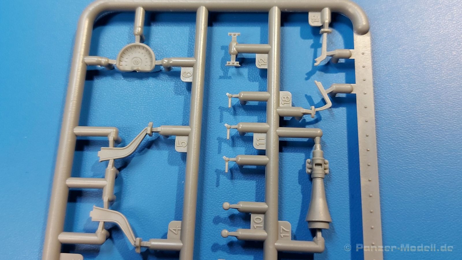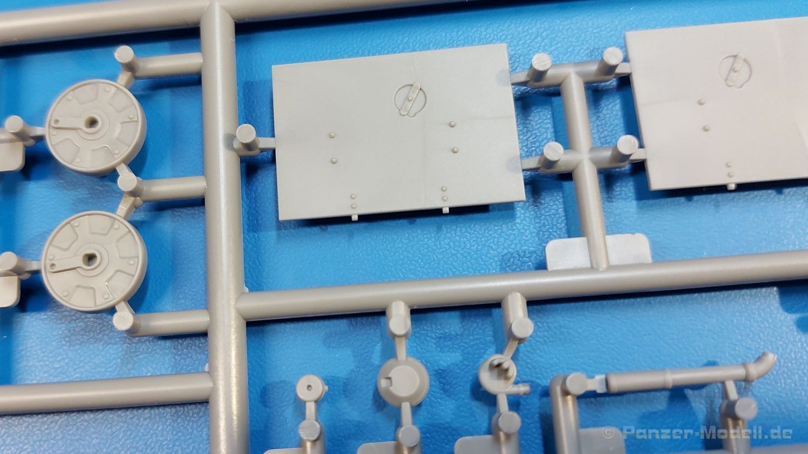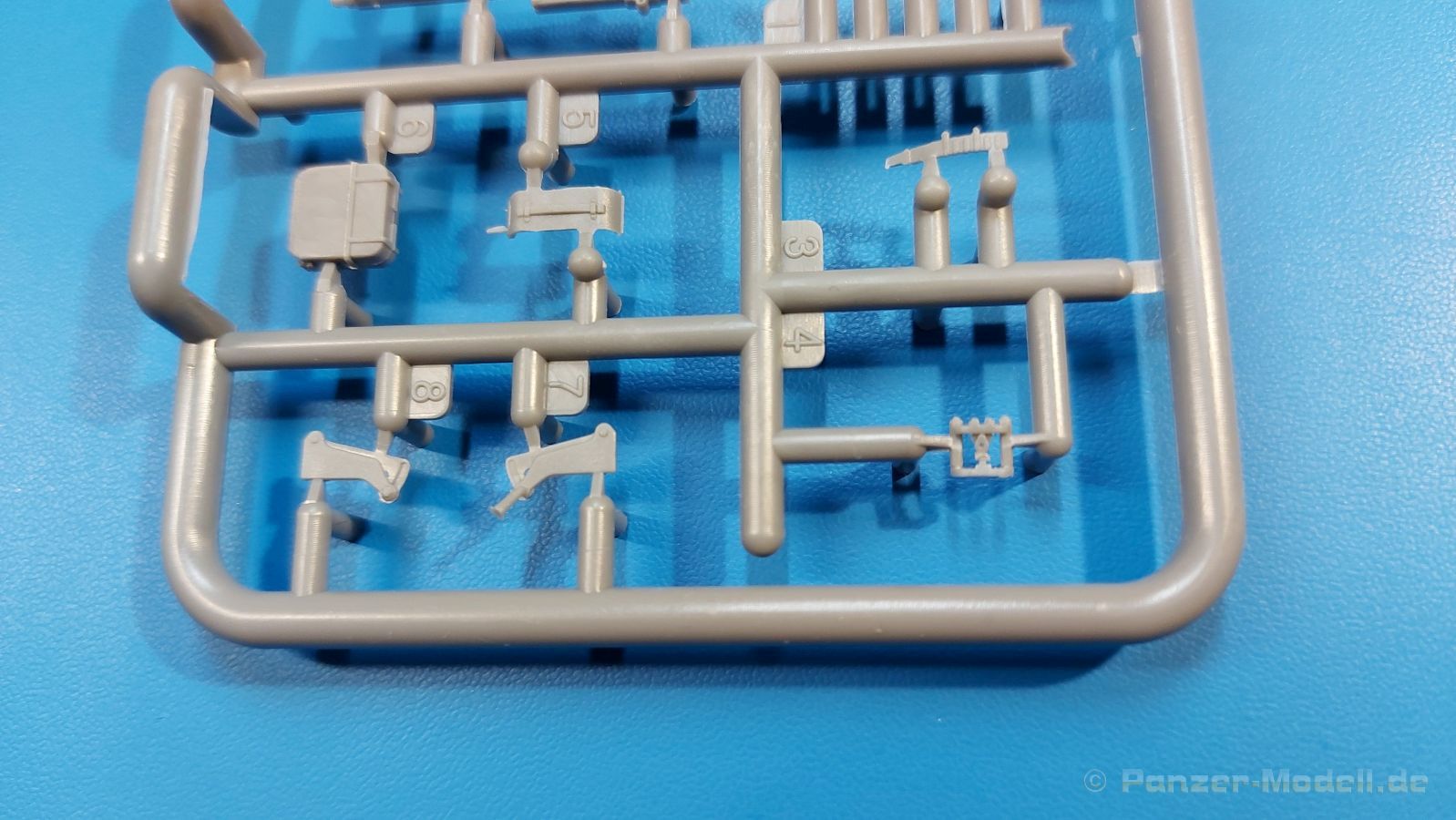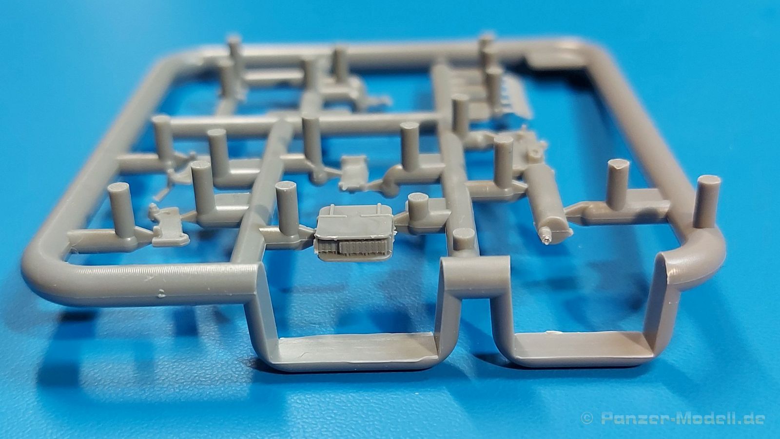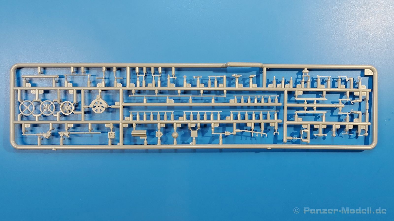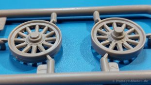 Das Original: Der Austin Panzerwagen wurde während des 1. Weltkrieges produziert. Er basierte ursprünglich auf einem Pkw Fahrgestell und war rundum gepanzert und mit 2 MG-Türmen ausgestattet. E wog über 5 to. und erreichte mit einem 4-Zylinder 50 PS (37 kW) Benzinmotor 56 km/h Höchstgeschwindigkeit. Die Besatzung bestand ursprünglich aus 4 Soldaten, aber nach Einführung des Rückwärtsfahrers dann aus 5. Auch wenn es eigentlich ein britisches Fahrzeug war und im 1. Weltkrieg eingesetzt wurde, erlangte es doch eher Bekanntheit durch seine Nutzung während des russischen Bürgerkrieges. Dort wurde er auch oft als Beutefahrzeug eingesetzt. Der Bausatz: MiniArt hat die Gewohnheit, möglichst viel aus seinen Modellen herauszuholen und Varianten anzubieten. So kommt es, dass dieser Bausatz einer von (bisher) vieren ist. Diesmal haben wir die Version eines, mit Interior voll ausgestatteten, „Beute-Austins“ vor uns. Man möge mir den langen Text verzeihen, aber da war wohl etwas mehr Begeisterung mit im Spiel! Im 385 x 240 x 60 mm großen Karton befinden sich 17 hellgraue und 1 Klarsichtspritzling, 1 PE-Platine, 1 Decalsheet und natürlich eine Bau-/Bemalungsanleitung. Die Teile sind auf dem heutigen Stand der Technik produziert und können mit allerlei Details und Feinheiten glänzen. So gut wie keine Auswerferspuren auf Teilen, da diese meist auf die Gießäste gesetzt sind. Bei den wenigen Teilen, wo man glaubt, Auswerferspuren zu sehen, sitzen sie auf Stellen, die nach dem Bau nicht mehr zu sehen sind. Versatz, Gussgrat konnte ich mit bloßem Auge nicht entdecken. Original verpackt erwarten einen keine Probleme, aber wenn man die Spritzlinge nicht mehr in die Plastiktüten zurückpackt, kann es beim Transport passieren, dass man etwas Bruch hat. In meinem Fall betraf dies den vorderen, linken Kotflügel, dessen vordere Kante angebrochen war. Aber auch dies lässt sich mit den modernen Klebstoffen leicht reparieren. Der Leiterrahmen setzt sich traditionell aus Längs- und Querträgern, verstärkt durch Kreuzträger zusammen. Für den sehr gut detaillierten Motor gibt es extra Längsträger zum Einbau in den Rahmen. Der wassergekühlte Motor, ein Modell im Modell, bietet alle wichtigen Elemente wie z.B. Ölwanne mit separater Ölablassschraube, Motorblock mit gut erkennbaren, erhabenen Austin Aufschriften, Zylinderkopf mit ausliegenden Ventilfedern, Zündkerzen sind erkennbar, Luftansaugkanal mit kleinem Luftfilter, Abgaskrümmer, separate Wasserpumpe, Kühlleitungen, Keilriemen und Kühlerpropeller. Feine PE-Teile peppen den Motor weiter auf. Dazu kommen natürlich noch der Kühler selbst mit feinen Kühlrippen und separatem Kühlwasserdeckel, Kupplung (? - anhand der Pedalerie und Hebel bin ich nicht sicher, ob der Austin bereits so etwas wie eine Kupplung hatte oder ob die Gänge in Tradition feinster spannabhebender Verformung reingequält wurden… Für Aufklärung zur Technik wären wir dankbar!) und Getriebe. Auch auf dem Getriebe finden wir die erhabene Austin Aufschrift. Die mehrfach unterteilte Bodenplatte zeigt in einigen Bereichen eine Bretterstruktur. Im hinteren Bereich wird eine etwas erhöhte Plattform für den Rückwärtsfahrer und die beiden MG-Türme angebracht. Die kreisrunden Bodenflächen der Türme sind mit sternförmigen Riffeln versehen, damit die MG-Bedienungen sich mit den Füßen abstoßen konnten, um die Türme zu drehen. Riffel und Nieten sind sehr schön wiedergegeben. Sitzfläche und Rückenlehne geben glaubhaft die Polsterstruktur wieder. Auch die Verschraubungen der Rückenlehne gefallen mir. Neben dem Rückwärtsfahrer finden zwei aufeinander gesetzte Kisten Platz, von denen ich vermute, dass sich zumindest in einer davon der Tank befand. Fahrer und Beifahrer habengleiche Sitzkissen wie der Rückwärtsfahrer. Ähnlich die beiden Rückenlehnen, die aber bereits zusammen an einem Brett montiert sind. Während das Lenkrad des Rückwärtsfahrers ein einfaches 4-Speichen Rad ist, besitzt das Hauptlenkrad ein kleineren, inneren Ring mit zusätzliche Hebeln. Die Armaturentafel zeigt sehr viele Instrumente. Leider gibt es keine Decals dazu. Im Fußbereich des Fahrers wird eine kleine Ballpumpe plus Leitung montiert, die auf der anderen Seite im Motorraum in einer trompetenförmigen Hupe endet. Die genaue Montage wird in einem Extrabild in der Bauanleitung aufgezeigt. Der gepanzerte Aufbau ist ein Thema für sich, denn er besteht aus unzählig vielen Panzerplatten, Trägern, Klappen und PE-Teilen. Alle Aufbauteile sind beidseitig detailliert wie man es von einem Interior Bausatz wohl erwartet. Präzises Arbeiten ist hier Pflicht, damit alle Teile stimmig zusammenkommen. Bei allen Klappen und Deckeln, die man alternativ offen oder geschlossen anbauen kann, muss man sehr genau schauen, da oftmals Hebel und Gestänge je nach Anbau unterschiedlich ausfallen. Da wäre z.B. die Stange, mit der der Beifahrer gleichzeitig die Motorentlüftungsklappe auf der Haube und die Kühlerklappe bedient. Oder der Sägezahnhebel der hinteren Sichtklappe. Oder der Ausstellhebel der seitlichen Sichtklappen. Bei der Fahrerfront kann man sich entscheiden, ob man die obere Klappe anhebt und die untere Klappe ganz nach vorn abklappt, wie es z.B. bei Fahrten weitab vom Feind wohl sicherlich gemacht wurde. Andere Variationen sind da auch noch möglich. Für 5 Fahrzeuge verschiedener Länder gibt Abziehbilder (Decals). Die ukrainischen Rondells erscheinen etwas verschmiert, welches aber Absicht ist, da im Original die Rondells wohl auch nur schnell mit dem Pinsel aufgemalt wurden. Alle Decals sind seidenmatt mit wenig Rand.