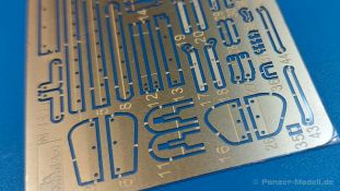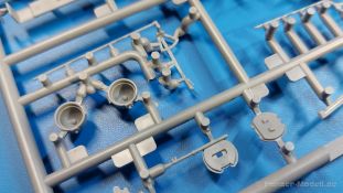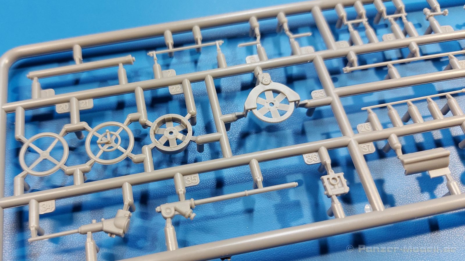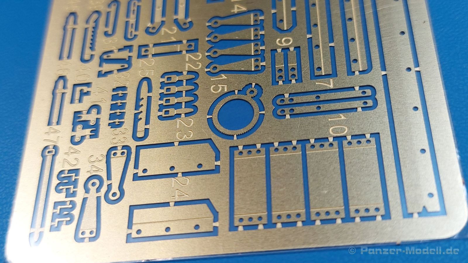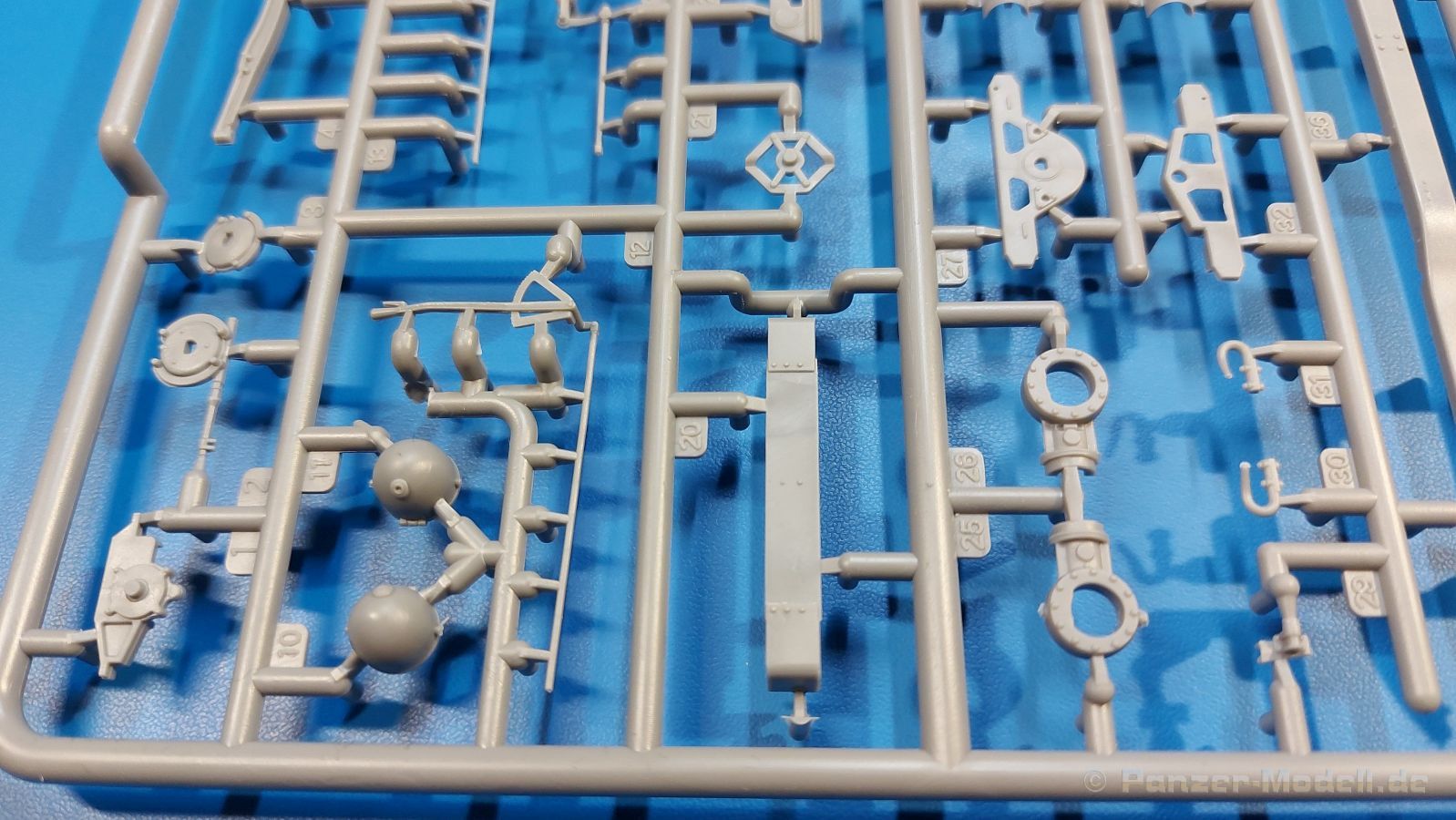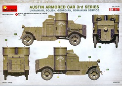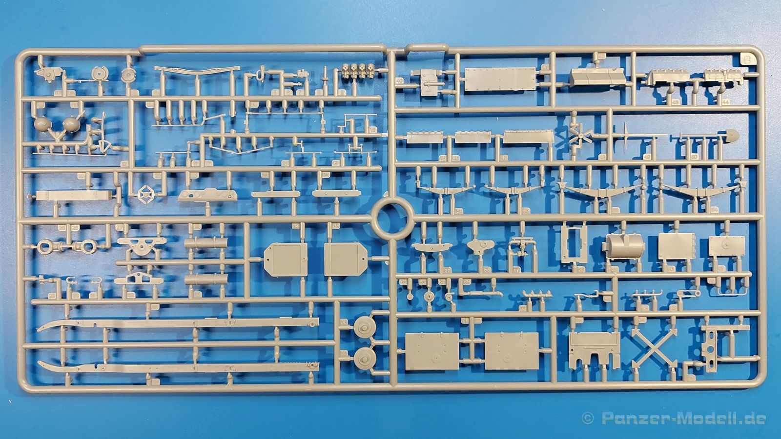 Das Original: Der Austin Panzerwagen wurde während des 1. Weltkrieges produziert. Er basierte ursprünglich auf einem Pkw Fahrgestell und war rundum gepanzert und mit 2 MG-Türmen ausgestattet. E wog über 5 to. und erreichte mit einem 4-Zylinder 50 PS (37 kW) Benzinmotor 56 km/h Höchstgeschwindigkeit. Die Besatzung bestand ursprünglich aus 4 Soldaten, aber nach Einführung des Rückwärtsfahrers dann aus 5. Auch wenn es eigentlich ein britisches Fahrzeug war und im 1. Weltkrieg eingesetzt wurde, erlangte es doch eher Bekanntheit durch seine Nutzung während des russischen Bürgerkrieges. Dort wurde er auch oft als Beutefahrzeug eingesetzt. Der Bausatz: MiniArt hat die Gewohnheit, möglichst viel aus seinen Modellen herauszuholen und Varianten anzubieten. So kommt es, dass dieser Bausatz einer von (bisher) vieren ist. Diesmal haben wir die Version eines, mit Interior voll ausgestatteten, „Beute-Austins“ vor uns. Man möge mir den langen Text verzeihen, aber da war wohl etwas mehr Begeisterung mit im Spiel! Im 385 x 240 x 60 mm großen Karton befinden sich 17 hellgraue und 1 Klarsichtspritzling, 1 PE-Platine, 1 Decalsheet und natürlich eine Bau-/Bemalungsanleitung. Die Teile sind auf dem heutigen Stand der Technik produziert und können mit allerlei Details und Feinheiten glänzen. So gut wie keine Auswerferspuren auf Teilen, da diese meist auf die Gießäste gesetzt sind. Bei den wenigen Teilen, wo man glaubt, Auswerferspuren zu sehen, sitzen sie auf Stellen, die nach dem Bau nicht mehr zu sehen sind. Versatz, Gussgrat konnte ich mit bloßem Auge nicht entdecken. Original verpackt erwarten einen keine Probleme, aber wenn man die Spritzlinge nicht mehr in die Plastiktüten zurückpackt, kann es beim Transport passieren, dass man etwas Bruch hat. In meinem Fall betraf dies den vorderen, linken Kotflügel, dessen vordere Kante angebrochen war. Aber auch dies lässt sich mit den modernen Klebstoffen leicht reparieren. Der Leiterrahmen setzt sich traditionell aus Längs- und Querträgern, verstärkt durch Kreuzträger zusammen. Für den sehr gut detaillierten Motor gibt es extra Längsträger zum Einbau in den Rahmen. Der wassergekühlte Motor, ein Modell im Modell, bietet alle wichtigen Elemente wie z.B. Ölwanne mit separater Ölablassschraube, Motorblock mit gut erkennbaren, erhabenen Austin Aufschriften, Zylinderkopf mit ausliegenden Ventilfedern, Zündkerzen sind erkennbar, Luftansaugkanal mit kleinem Luftfilter, Abgaskrümmer, separate Wasserpumpe, Kühlleitungen, Keilriemen und Kühlerpropeller. Feine PE-Teile peppen den Motor weiter auf. Dazu kommen natürlich noch der Kühler selbst mit feinen Kühlrippen und separatem Kühlwasserdeckel, Kupplung (? - anhand der Pedalerie und Hebel bin ich nicht sicher, ob der Austin bereits so etwas wie eine Kupplung hatte oder ob die Gänge in Tradition feinster spannabhebender Verformung reingequält wurden… Für Aufklärung zur Technik wären wir dankbar!) und Getriebe. Auch auf dem Getriebe finden wir die erhabene Austin Aufschrift. Die mehrfach unterteilte Bodenplatte zeigt in einigen Bereichen eine Bretterstruktur. Im hinteren Bereich wird eine etwas erhöhte Plattform für den Rückwärtsfahrer und die beiden MG-Türme angebracht. Die kreisrunden Bodenflächen der Türme sind mit sternförmigen Riffeln versehen, damit die MG-Bedienungen sich mit den Füßen abstoßen konnten, um die Türme zu drehen. Riffel und Nieten sind sehr schön wiedergegeben. Sitzfläche und Rückenlehne geben glaubhaft die Polsterstruktur wieder. Auch die Verschraubungen der Rückenlehne gefallen mir. Neben dem Rückwärtsfahrer finden zwei aufeinander gesetzte Kisten Platz, von denen ich vermute, dass sich zumindest in einer davon der Tank befand. Fahrer und Beifahrer habengleiche Sitzkissen wie der Rückwärtsfahrer. Ähnlich die beiden Rückenlehnen, die aber bereits zusammen an einem Brett montiert sind. Während das Lenkrad des Rückwärtsfahrers ein einfaches 4-Speichen Rad ist, besitzt das Hauptlenkrad ein kleineren, inneren Ring mit zusätzliche Hebeln. Die Armaturentafel zeigt sehr viele Instrumente. Leider gibt es keine Decals dazu. Im Fußbereich des Fahrers wird eine kleine Ballpumpe plus Leitung montiert, die auf der anderen Seite im Motorraum in einer trompetenförmigen Hupe endet. Die genaue Montage wird in einem Extrabild in der Bauanleitung aufgezeigt. Der gepanzerte Aufbau ist ein Thema für sich, denn er besteht aus unzählig vielen Panzerplatten, Trägern, Klappen und PE-Teilen. Alle Aufbauteile sind beidseitig detailliert wie man es von einem Interior Bausatz wohl erwartet. Präzises Arbeiten ist hier Pflicht, damit alle Teile stimmig zusammenkommen. Bei allen Klappen und Deckeln, die man alternativ offen oder geschlossen anbauen kann, muss man sehr genau schauen, da oftmals Hebel und Gestänge je nach Anbau unterschiedlich ausfallen. Da wäre z.B. die Stange, mit der der Beifahrer gleichzeitig die Motorentlüftungsklappe auf der Haube und die Kühlerklappe bedient. Oder der Sägezahnhebel der hinteren Sichtklappe. Oder der Ausstellhebel der seitlichen Sichtklappen. Bei der Fahrerfront kann man sich entscheiden, ob man die obere Klappe anhebt und die untere Klappe ganz nach vorn abklappt, wie es z.B. bei Fahrten weitab vom Feind wohl sicherlich gemacht wurde. Andere Variationen sind da auch noch möglich. Für 5 Fahrzeuge verschiedener Länder gibt Abziehbilder (Decals). Die ukrainischen Rondells erscheinen etwas verschmiert, welches aber Absicht ist, da im Original die Rondells wohl auch nur schnell mit dem Pinsel aufgemalt wurden. Alle Decals sind seidenmatt mit wenig Rand.