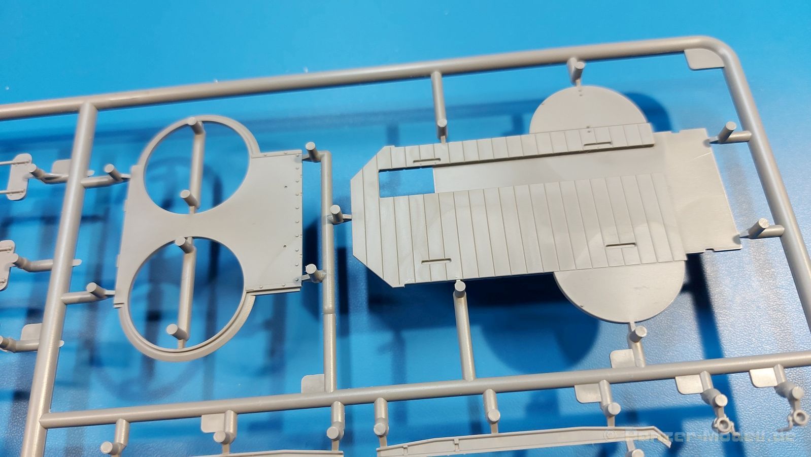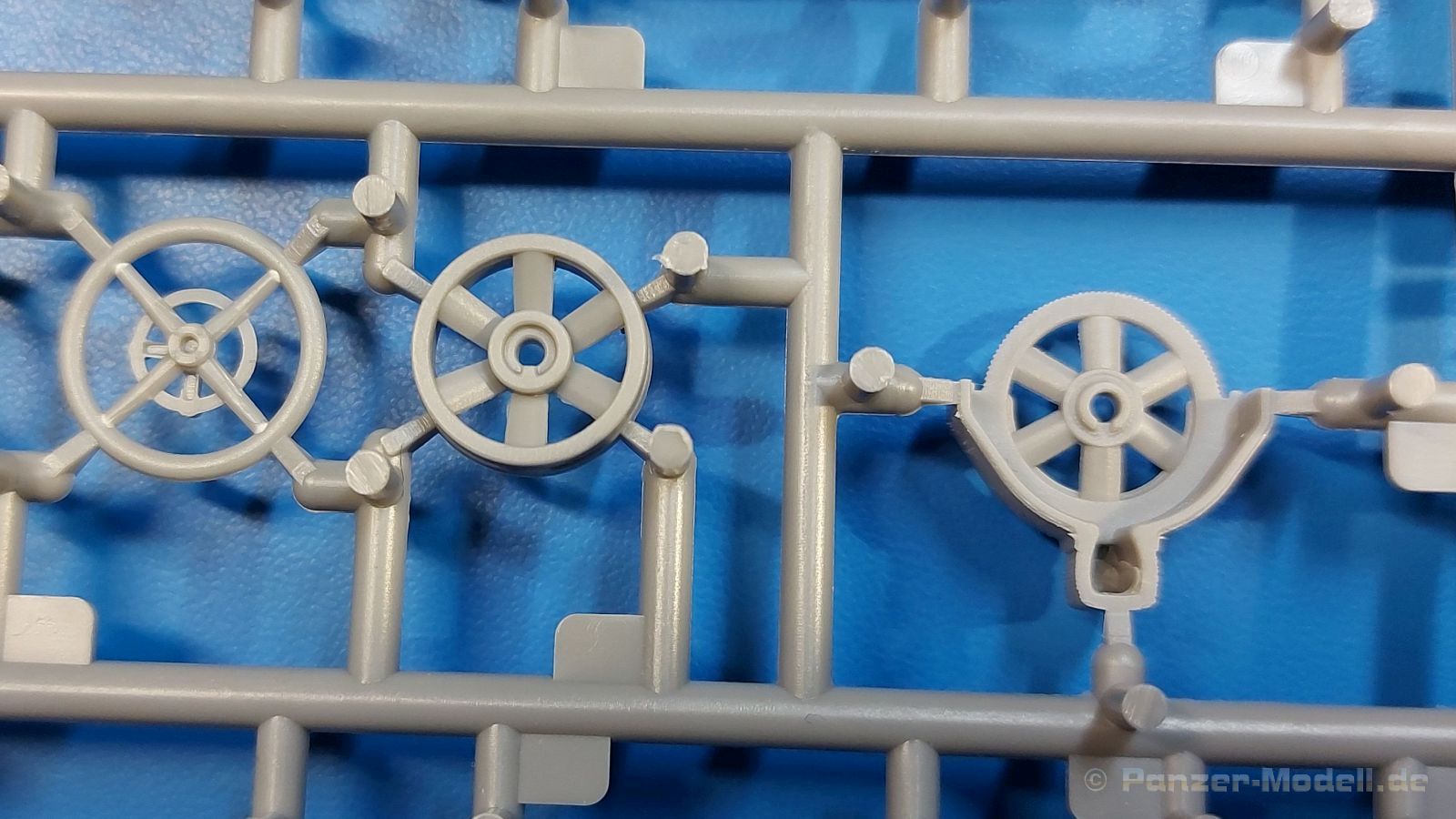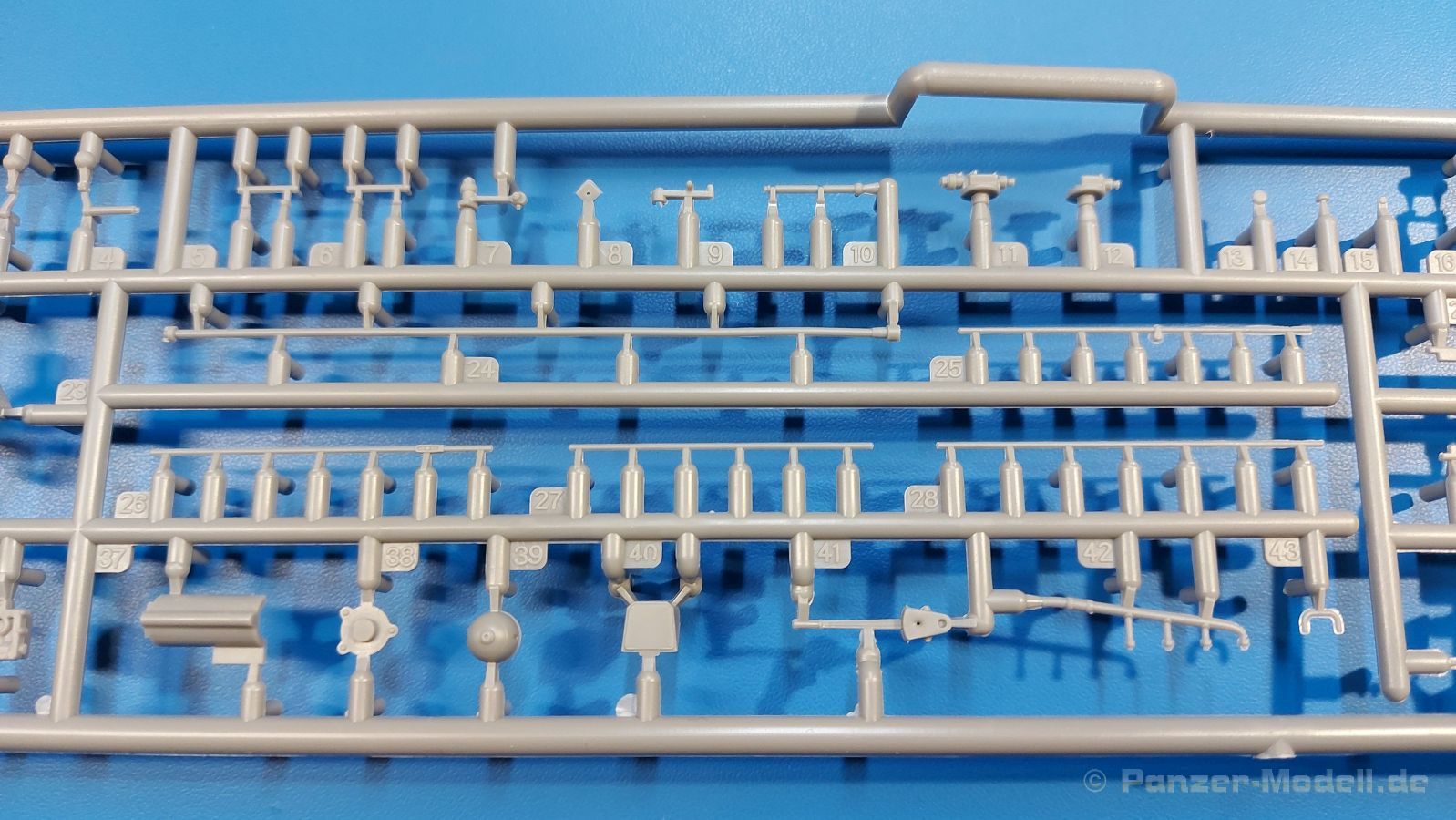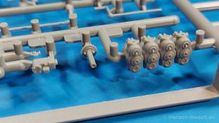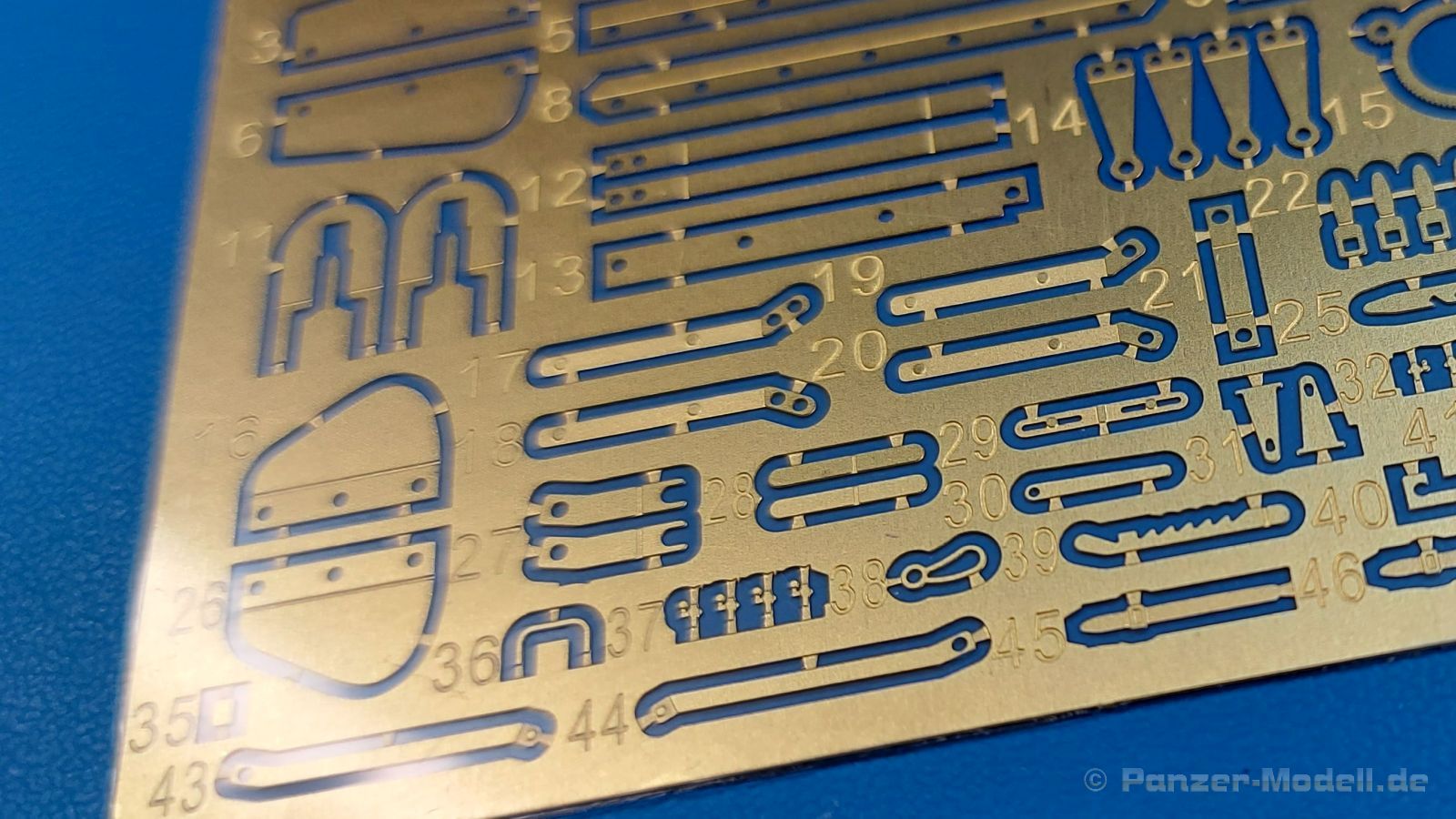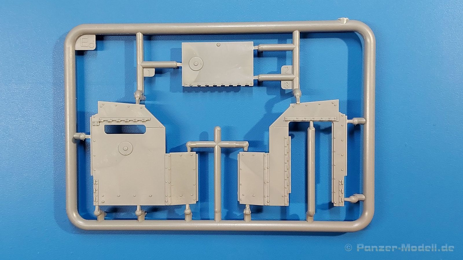Das Original: Der Austin Panzerwagen wurde während des 1. Weltkrieges produziert. Er basierte ursprünglich auf einem Pkw Fahrgestell und war rundum gepanzert und mit 2 MG-Türmen ausgestattet. E wog über 5 to. und erreichte mit einem 4-Zylinder 50 PS (37 kW) Benzinmotor 56 km/h Höchstgeschwindigkeit. Die Besatzung bestand ursprünglich aus 4 Soldaten, aber nach Einführung des Rückwärtsfahrers dann aus 5. Auch wenn es eigentlich ein britisches Fahrzeug war und im 1. Weltkrieg eingesetzt wurde, erlangte es doch eher Bekanntheit durch seine Nutzung während des russischen Bürgerkrieges. Dort wurde er auch oft als Beutefahrzeug eingesetzt. Der Bausatz: MiniArt hat die Gewohnheit, möglichst viel aus seinen Modellen herauszuholen und Varianten anzubieten. So kommt es, dass dieser Bausatz einer von (bisher) vieren ist. Diesmal haben wir die Version eines, mit Interior voll ausgestatteten, „Beute-Austins“ vor uns. Man möge mir den langen Text verzeihen, aber da war wohl etwas mehr Begeisterung mit im Spiel! Im 385 x 240 x 60 mm großen Karton befinden sich 17 hellgraue und 1 Klarsichtspritzling, 1 PE-Platine, 1 Decalsheet und natürlich eine Bau-/Bemalungsanleitung. Die Teile sind auf dem heutigen Stand der Technik produziert und können mit allerlei Details und Feinheiten glänzen. So gut wie keine Auswerferspuren auf Teilen, da diese meist auf die Gießäste gesetzt sind. Bei den wenigen Teilen, wo man glaubt, Auswerferspuren zu sehen, sitzen sie auf Stellen, die nach dem Bau nicht mehr zu sehen sind. Versatz, Gussgrat konnte ich mit bloßem Auge nicht entdecken. Original verpackt erwarten einen keine Probleme, aber wenn man die Spritzlinge nicht mehr in die Plastiktüten zurückpackt, kann es beim Transport passieren, dass man etwas Bruch hat. In meinem Fall betraf dies den vorderen, linken Kotflügel, dessen vordere Kante angebrochen war. Aber auch dies lässt sich mit den modernen Klebstoffen leicht reparieren. Der Leiterrahmen setzt sich traditionell aus Längs- und Querträgern, verstärkt durch Kreuzträger zusammen. Für den sehr gut detaillierten Motor gibt es extra Längsträger zum Einbau in den Rahmen. Der wassergekühlte Motor, ein Modell im Modell, bietet alle wichtigen Elemente wie z.B. Ölwanne mit separater Ölablassschraube, Motorblock mit gut erkennbaren, erhabenen Austin Aufschriften, Zylinderkopf mit ausliegenden Ventilfedern, Zündkerzen sind erkennbar, Luftansaugkanal mit kleinem Luftfilter, Abgaskrümmer, separate Wasserpumpe, Kühlleitungen, Keilriemen und Kühlerpropeller. Feine PE-Teile peppen den Motor weiter auf. Dazu kommen natürlich noch der Kühler selbst mit feinen Kühlrippen und separatem Kühlwasserdeckel, Kupplung (? - anhand der Pedalerie und Hebel bin ich nicht sicher, ob der Austin bereits so etwas wie eine Kupplung hatte oder ob die Gänge in Tradition feinster spannabhebender Verformung reingequält wurden… Für Aufklärung zur Technik wären wir dankbar!) und Getriebe. Auch auf dem Getriebe finden wir die erhabene Austin Aufschrift. Die mehrfach unterteilte Bodenplatte zeigt in einigen Bereichen eine Bretterstruktur. Im hinteren Bereich wird eine etwas erhöhte Plattform für den Rückwärtsfahrer und die beiden MG-Türme angebracht. Die kreisrunden Bodenflächen der Türme sind mit sternförmigen Riffeln versehen, damit die MG-Bedienungen sich mit den Füßen abstoßen konnten, um die Türme zu drehen. Riffel und Nieten sind sehr schön wiedergegeben. Sitzfläche und Rückenlehne geben glaubhaft die Polsterstruktur wieder. Auch die Verschraubungen der Rückenlehne gefallen mir. Neben dem Rückwärtsfahrer finden zwei aufeinander gesetzte Kisten Platz, von denen ich vermute, dass sich zumindest in einer davon der Tank befand. Fahrer und Beifahrer habengleiche Sitzkissen wie der Rückwärtsfahrer. Ähnlich die beiden Rückenlehnen, die aber bereits zusammen an einem Brett montiert sind. Während das Lenkrad des Rückwärtsfahrers ein einfaches 4-Speichen Rad ist, besitzt das Hauptlenkrad ein kleineren, inneren Ring mit zusätzliche Hebeln. Die Armaturentafel zeigt sehr viele Instrumente. Leider gibt es keine Decals dazu. Im Fußbereich des Fahrers wird eine kleine Ballpumpe plus Leitung montiert, die auf der anderen Seite im Motorraum in einer trompetenförmigen Hupe endet. Die genaue Montage wird in einem Extrabild in der Bauanleitung aufgezeigt. Der gepanzerte Aufbau ist ein Thema für sich, denn er besteht aus unzählig vielen Panzerplatten, Trägern, Klappen und PE-Teilen. Alle Aufbauteile sind beidseitig detailliert wie man es von einem Interior Bausatz wohl erwartet. Präzises Arbeiten ist hier Pflicht, damit alle Teile stimmig zusammenkommen. Bei allen Klappen und Deckeln, die man alternativ offen oder geschlossen anbauen kann, muss man sehr genau schauen, da oftmals Hebel und Gestänge je nach Anbau unterschiedlich ausfallen. Da wäre z.B. die Stange, mit der der Beifahrer gleichzeitig die Motorentlüftungsklappe auf der Haube und die Kühlerklappe bedient. Oder der Sägezahnhebel der hinteren Sichtklappe. Oder der Ausstellhebel der seitlichen Sichtklappen. Bei der Fahrerfront kann man sich entscheiden, ob man die obere Klappe anhebt und die untere Klappe ganz nach vorn abklappt, wie es z.B. bei Fahrten weitab vom Feind wohl sicherlich gemacht wurde. Andere Variationen sind da auch noch möglich. Für 5 Fahrzeuge verschiedener Länder gibt Abziehbilder (Decals). Die ukrainischen Rondells erscheinen etwas verschmiert, welches aber Absicht ist, da im Original die Rondells wohl auch nur schnell mit dem Pinsel aufgemalt wurden. Alle Decals sind seidenmatt mit wenig Rand.