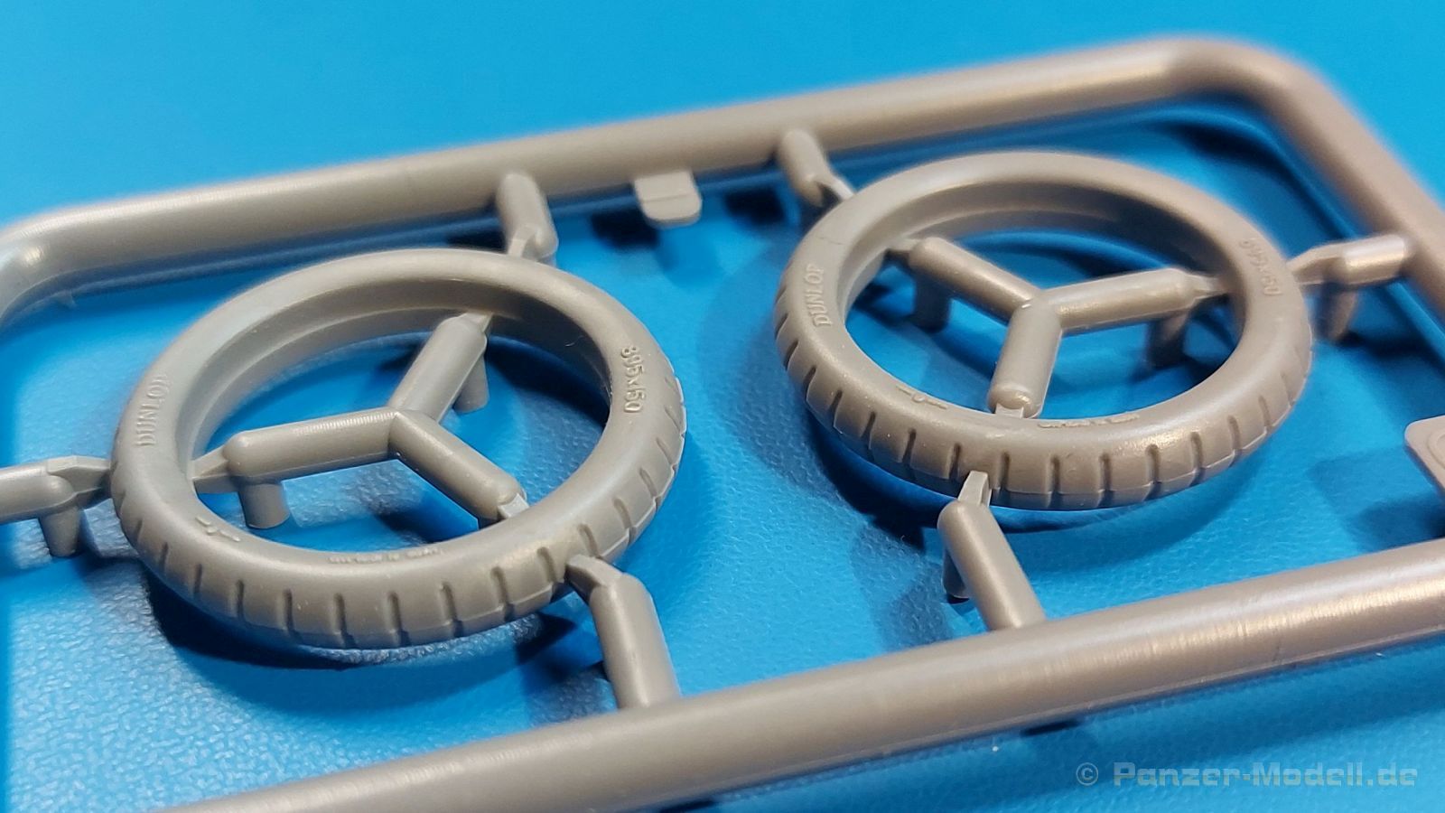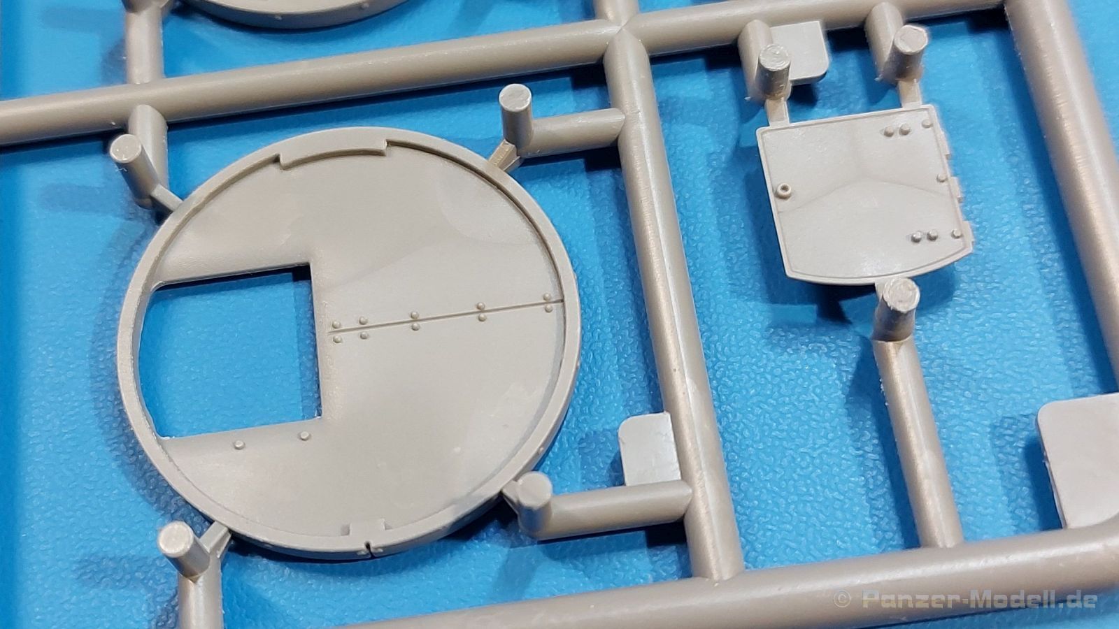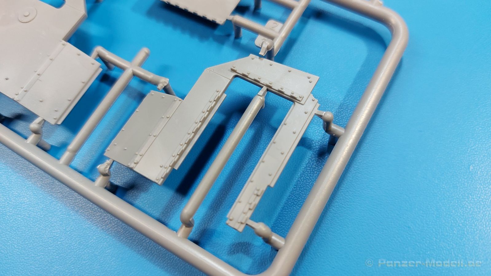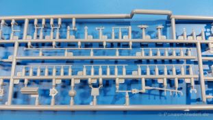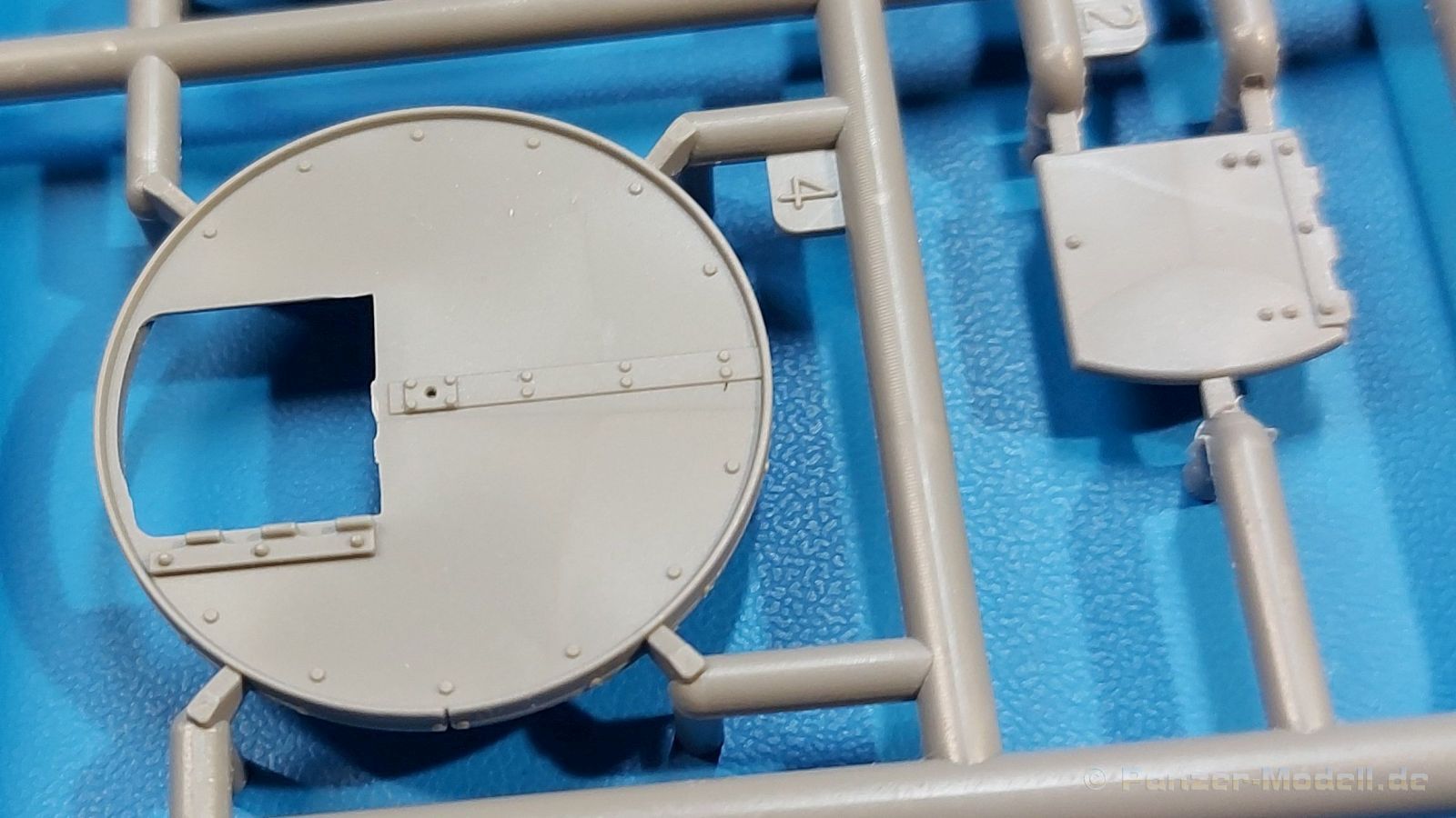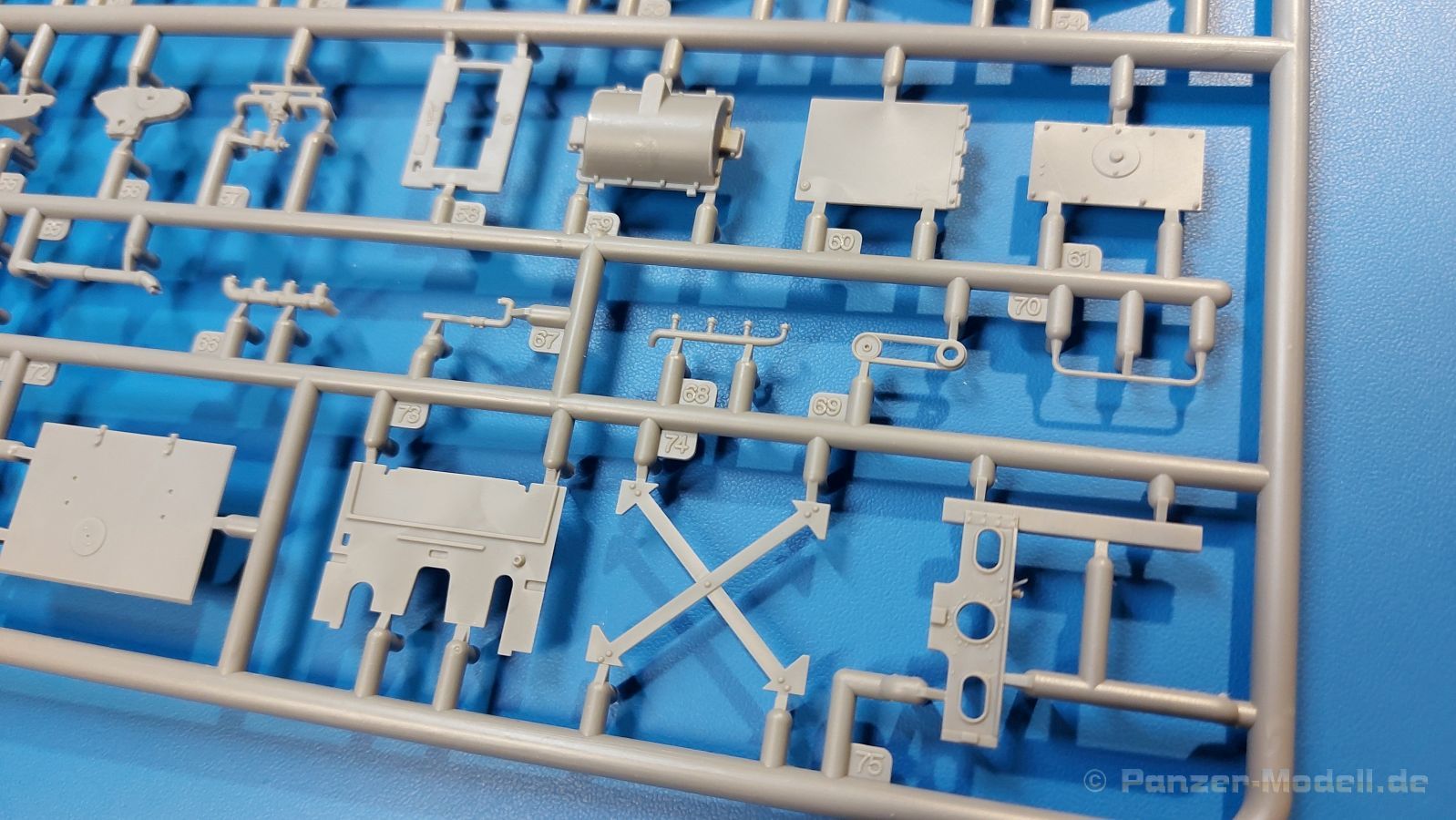 Das Original: Der Austin Panzerwagen wurde während des 1. Weltkrieges produziert. Er basierte ursprünglich auf einem Pkw Fahrgestell und war rundum gepanzert und mit 2 MG-Türmen ausgestattet. E wog über 5 to. und erreichte mit einem 4-Zylinder 50 PS (37 kW) Benzinmotor 56 km/h Höchstgeschwindigkeit. Die Besatzung bestand ursprünglich aus 4 Soldaten, aber nach Einführung des Rückwärtsfahrers dann aus 5. Auch wenn es eigentlich ein britisches Fahrzeug war und im 1. Weltkrieg eingesetzt wurde, erlangte es doch eher Bekanntheit durch seine Nutzung während des russischen Bürgerkrieges. Dort wurde er auch oft als Beutefahrzeug eingesetzt. Der Bausatz: MiniArt hat die Gewohnheit, möglichst viel aus seinen Modellen herauszuholen und Varianten anzubieten. So kommt es, dass dieser Bausatz einer von (bisher) vieren ist. Diesmal haben wir die Version eines, mit Interior voll ausgestatteten, „Beute-Austins“ vor uns. Man möge mir den langen Text verzeihen, aber da war wohl etwas mehr Begeisterung mit im Spiel! Im 385 x 240 x 60 mm großen Karton befinden sich 17 hellgraue und 1 Klarsichtspritzling, 1 PE-Platine, 1 Decalsheet und natürlich eine Bau-/Bemalungsanleitung. Die Teile sind auf dem heutigen Stand der Technik produziert und können mit allerlei Details und Feinheiten glänzen. So gut wie keine Auswerferspuren auf Teilen, da diese meist auf die Gießäste gesetzt sind. Bei den wenigen Teilen, wo man glaubt, Auswerferspuren zu sehen, sitzen sie auf Stellen, die nach dem Bau nicht mehr zu sehen sind. Versatz, Gussgrat konnte ich mit bloßem Auge nicht entdecken. Original verpackt erwarten einen keine Probleme, aber wenn man die Spritzlinge nicht mehr in die Plastiktüten zurückpackt, kann es beim Transport passieren, dass man etwas Bruch hat. In meinem Fall betraf dies den vorderen, linken Kotflügel, dessen vordere Kante angebrochen war. Aber auch dies lässt sich mit den modernen Klebstoffen leicht reparieren. Der Leiterrahmen setzt sich traditionell aus Längs- und Querträgern, verstärkt durch Kreuzträger zusammen. Für den sehr gut detaillierten Motor gibt es extra Längsträger zum Einbau in den Rahmen. Der wassergekühlte Motor, ein Modell im Modell, bietet alle wichtigen Elemente wie z.B. Ölwanne mit separater Ölablassschraube, Motorblock mit gut erkennbaren, erhabenen Austin Aufschriften, Zylinderkopf mit ausliegenden Ventilfedern, Zündkerzen sind erkennbar, Luftansaugkanal mit kleinem Luftfilter, Abgaskrümmer, separate Wasserpumpe, Kühlleitungen, Keilriemen und Kühlerpropeller. Feine PE-Teile peppen den Motor weiter auf. Dazu kommen natürlich noch der Kühler selbst mit feinen Kühlrippen und separatem Kühlwasserdeckel, Kupplung (? - anhand der Pedalerie und Hebel bin ich nicht sicher, ob der Austin bereits so etwas wie eine Kupplung hatte oder ob die Gänge in Tradition feinster spannabhebender Verformung reingequält wurden… Für Aufklärung zur Technik wären wir dankbar!) und Getriebe. Auch auf dem Getriebe finden wir die erhabene Austin Aufschrift. Die mehrfach unterteilte Bodenplatte zeigt in einigen Bereichen eine Bretterstruktur. Im hinteren Bereich wird eine etwas erhöhte Plattform für den Rückwärtsfahrer und die beiden MG-Türme angebracht. Die kreisrunden Bodenflächen der Türme sind mit sternförmigen Riffeln versehen, damit die MG-Bedienungen sich mit den Füßen abstoßen konnten, um die Türme zu drehen. Riffel und Nieten sind sehr schön wiedergegeben. Sitzfläche und Rückenlehne geben glaubhaft die Polsterstruktur wieder. Auch die Verschraubungen der Rückenlehne gefallen mir. Neben dem Rückwärtsfahrer finden zwei aufeinander gesetzte Kisten Platz, von denen ich vermute, dass sich zumindest in einer davon der Tank befand. Fahrer und Beifahrer habengleiche Sitzkissen wie der Rückwärtsfahrer. Ähnlich die beiden Rückenlehnen, die aber bereits zusammen an einem Brett montiert sind. Während das Lenkrad des Rückwärtsfahrers ein einfaches 4-Speichen Rad ist, besitzt das Hauptlenkrad ein kleineren, inneren Ring mit zusätzliche Hebeln. Die Armaturentafel zeigt sehr viele Instrumente. Leider gibt es keine Decals dazu. Im Fußbereich des Fahrers wird eine kleine Ballpumpe plus Leitung montiert, die auf der anderen Seite im Motorraum in einer trompetenförmigen Hupe endet. Die genaue Montage wird in einem Extrabild in der Bauanleitung aufgezeigt. Der gepanzerte Aufbau ist ein Thema für sich, denn er besteht aus unzählig vielen Panzerplatten, Trägern, Klappen und PE-Teilen. Alle Aufbauteile sind beidseitig detailliert wie man es von einem Interior Bausatz wohl erwartet. Präzises Arbeiten ist hier Pflicht, damit alle Teile stimmig zusammenkommen. Bei allen Klappen und Deckeln, die man alternativ offen oder geschlossen anbauen kann, muss man sehr genau schauen, da oftmals Hebel und Gestänge je nach Anbau unterschiedlich ausfallen. Da wäre z.B. die Stange, mit der der Beifahrer gleichzeitig die Motorentlüftungsklappe auf der Haube und die Kühlerklappe bedient. Oder der Sägezahnhebel der hinteren Sichtklappe. Oder der Ausstellhebel der seitlichen Sichtklappen. Bei der Fahrerfront kann man sich entscheiden, ob man die obere Klappe anhebt und die untere Klappe ganz nach vorn abklappt, wie es z.B. bei Fahrten weitab vom Feind wohl sicherlich gemacht wurde. Andere Variationen sind da auch noch möglich. Für 5 Fahrzeuge verschiedener Länder gibt Abziehbilder (Decals). Die ukrainischen Rondells erscheinen etwas verschmiert, welches aber Absicht ist, da im Original die Rondells wohl auch nur schnell mit dem Pinsel aufgemalt wurden. Alle Decals sind seidenmatt mit wenig Rand.