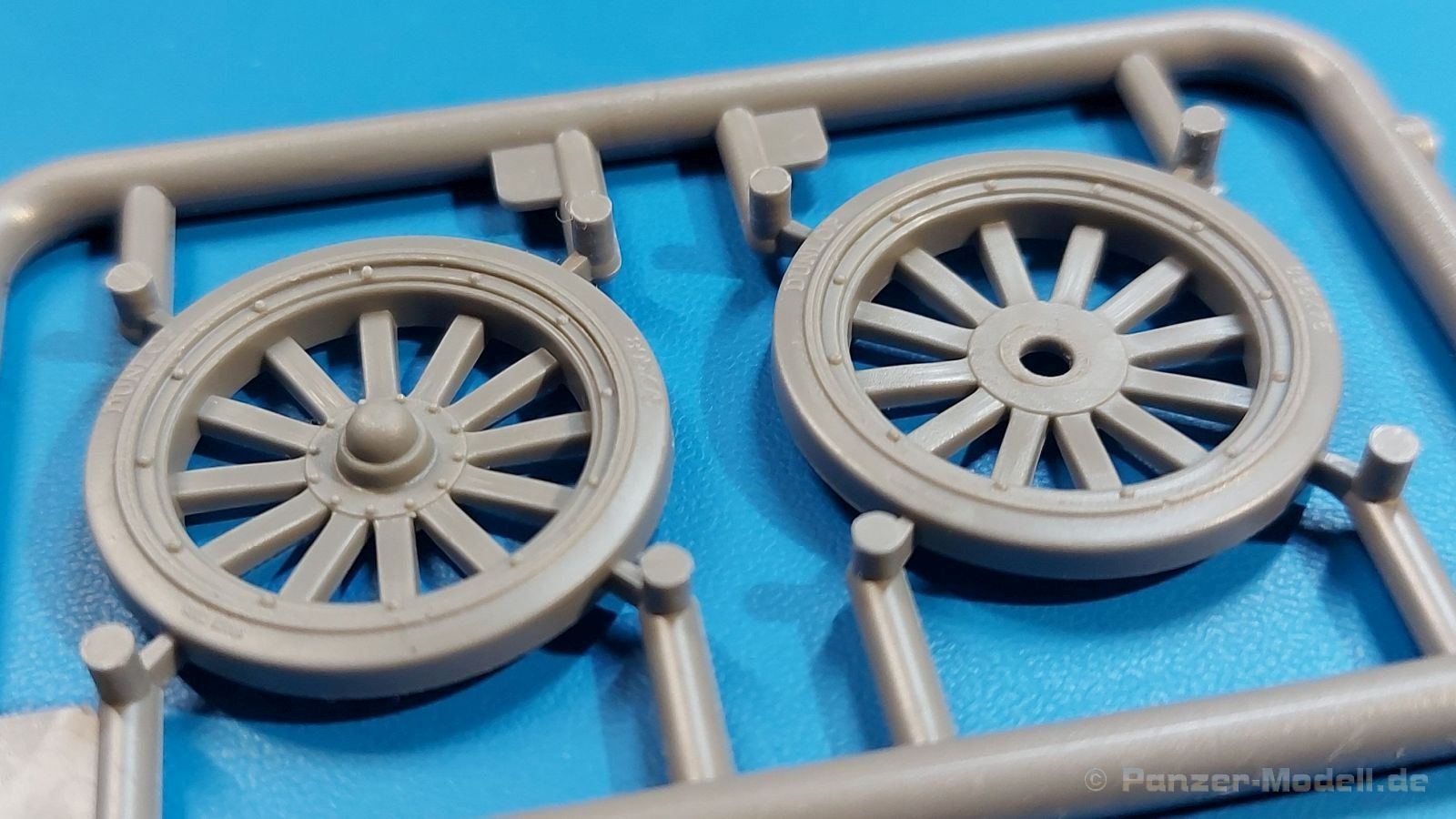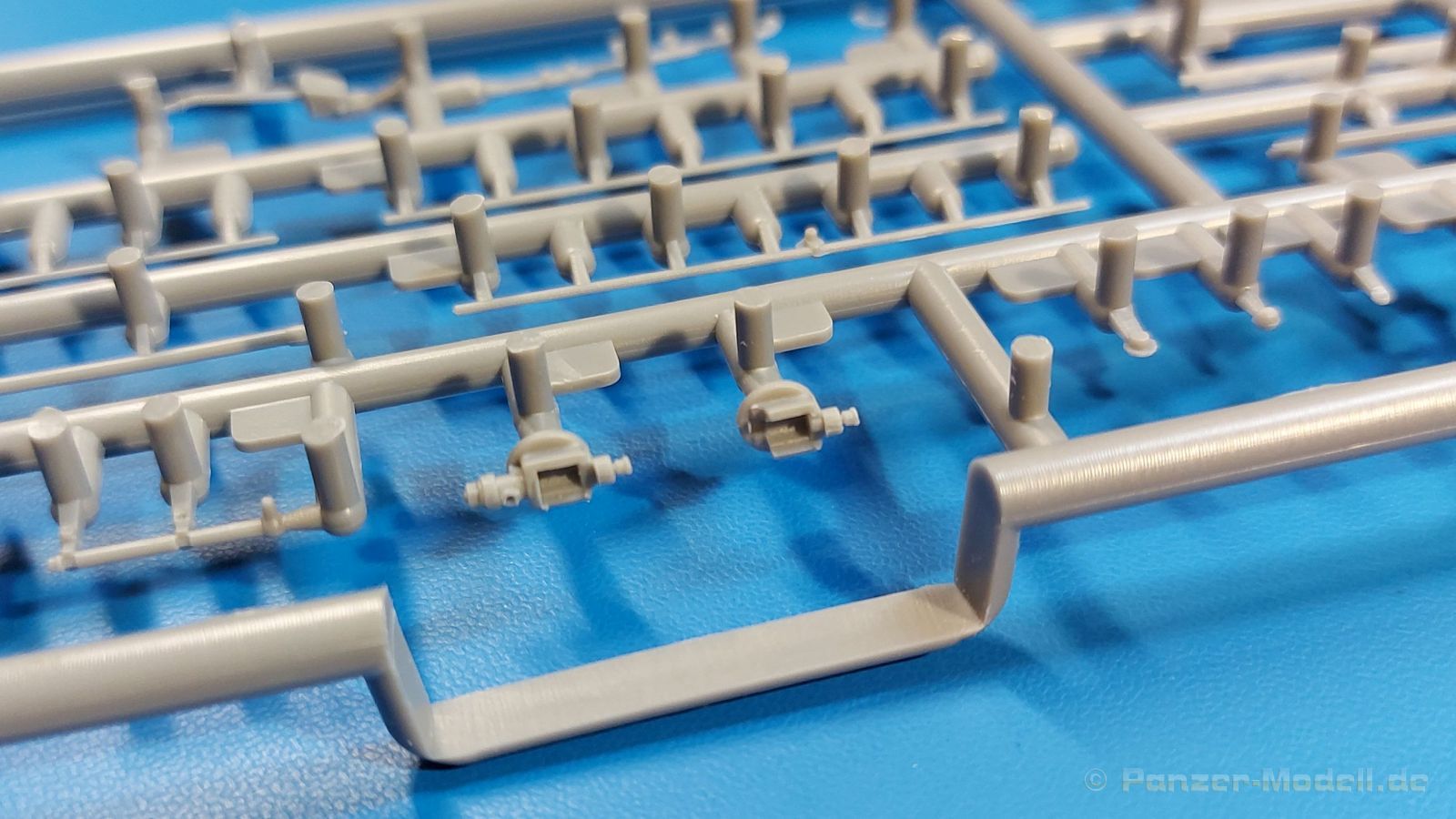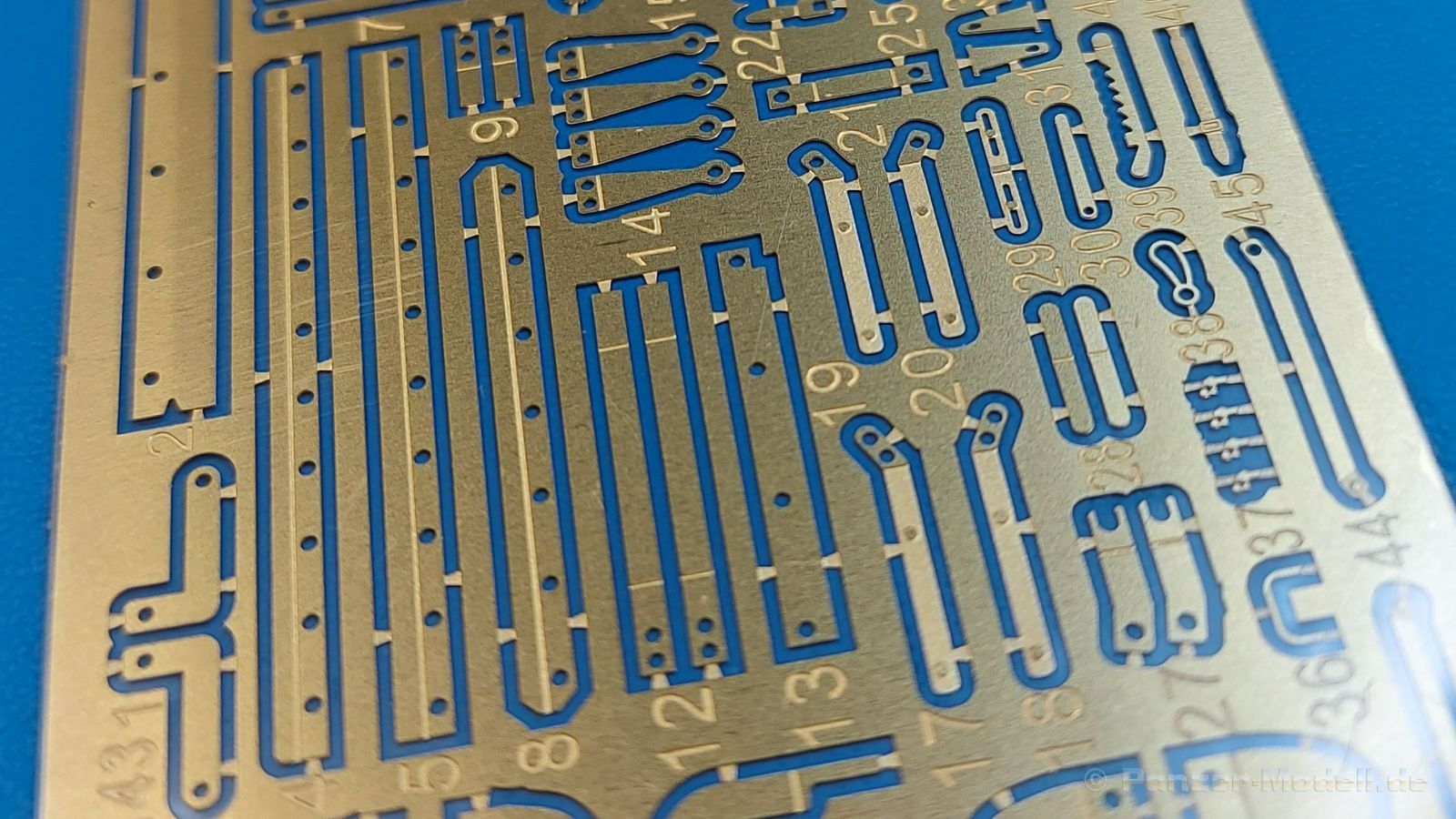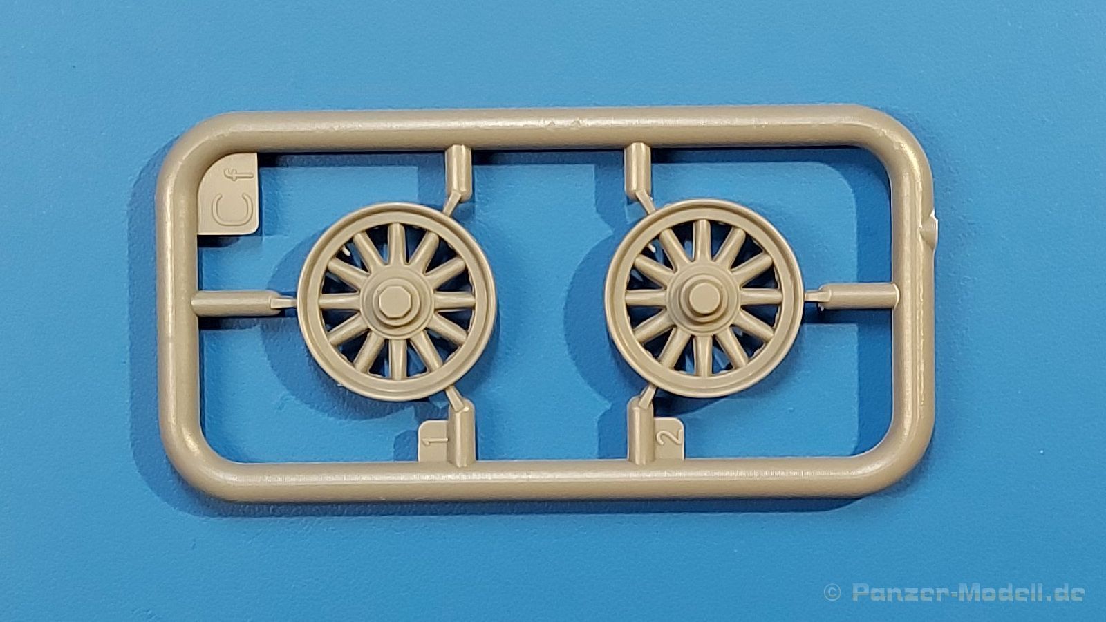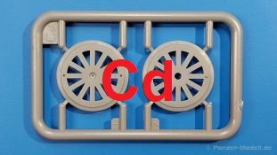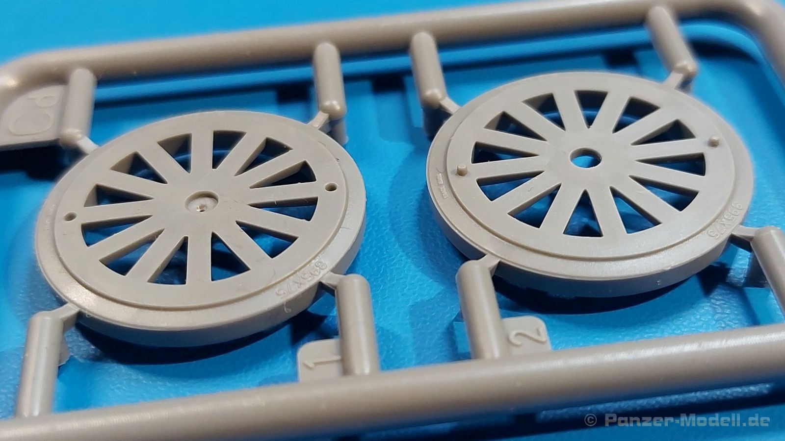 Das Original: Der Austin Panzerwagen wurde während des 1. Weltkrieges produziert. Er basierte ursprünglich auf einem Pkw Fahrgestell und war rundum gepanzert und mit 2 MG-Türmen ausgestattet. E wog über 5 to. und erreichte mit einem 4-Zylinder 50 PS (37 kW) Benzinmotor 56 km/h Höchstgeschwindigkeit. Die Besatzung bestand ursprünglich aus 4 Soldaten, aber nach Einführung des Rückwärtsfahrers dann aus 5. Auch wenn es eigentlich ein britisches Fahrzeug war und im 1. Weltkrieg eingesetzt wurde, erlangte es doch eher Bekanntheit durch seine Nutzung während des russischen Bürgerkrieges. Dort wurde er auch oft als Beutefahrzeug eingesetzt. Der Bausatz: MiniArt hat die Gewohnheit, möglichst viel aus seinen Modellen herauszuholen und Varianten anzubieten. So kommt es, dass dieser Bausatz einer von (bisher) vieren ist. Diesmal haben wir die Version eines, mit Interior voll ausgestatteten, „Beute-Austins“ vor uns. Man möge mir den langen Text verzeihen, aber da war wohl etwas mehr Begeisterung mit im Spiel! Im 385 x 240 x 60 mm großen Karton befinden sich 17 hellgraue und 1 Klarsichtspritzling, 1 PE-Platine, 1 Decalsheet und natürlich eine Bau-/Bemalungsanleitung. Die Teile sind auf dem heutigen Stand der Technik produziert und können mit allerlei Details und Feinheiten glänzen. So gut wie keine Auswerferspuren auf Teilen, da diese meist auf die Gießäste gesetzt sind. Bei den wenigen Teilen, wo man glaubt, Auswerferspuren zu sehen, sitzen sie auf Stellen, die nach dem Bau nicht mehr zu sehen sind. Versatz, Gussgrat konnte ich mit bloßem Auge nicht entdecken. Original verpackt erwarten einen keine Probleme, aber wenn man die Spritzlinge nicht mehr in die Plastiktüten zurückpackt, kann es beim Transport passieren, dass man etwas Bruch hat. In meinem Fall betraf dies den vorderen, linken Kotflügel, dessen vordere Kante angebrochen war. Aber auch dies lässt sich mit den modernen Klebstoffen leicht reparieren. Der Leiterrahmen setzt sich traditionell aus Längs- und Querträgern, verstärkt durch Kreuzträger zusammen. Für den sehr gut detaillierten Motor gibt es extra Längsträger zum Einbau in den Rahmen. Der wassergekühlte Motor, ein Modell im Modell, bietet alle wichtigen Elemente wie z.B. Ölwanne mit separater Ölablassschraube, Motorblock mit gut erkennbaren, erhabenen Austin Aufschriften, Zylinderkopf mit ausliegenden Ventilfedern, Zündkerzen sind erkennbar, Luftansaugkanal mit kleinem Luftfilter, Abgaskrümmer, separate Wasserpumpe, Kühlleitungen, Keilriemen und Kühlerpropeller. Feine PE-Teile peppen den Motor weiter auf. Dazu kommen natürlich noch der Kühler selbst mit feinen Kühlrippen und separatem Kühlwasserdeckel, Kupplung (? - anhand der Pedalerie und Hebel bin ich nicht sicher, ob der Austin bereits so etwas wie eine Kupplung hatte oder ob die Gänge in Tradition feinster spannabhebender Verformung reingequält wurden… Für Aufklärung zur Technik wären wir dankbar!) und Getriebe. Auch auf dem Getriebe finden wir die erhabene Austin Aufschrift. Die mehrfach unterteilte Bodenplatte zeigt in einigen Bereichen eine Bretterstruktur. Im hinteren Bereich wird eine etwas erhöhte Plattform für den Rückwärtsfahrer und die beiden MG-Türme angebracht. Die kreisrunden Bodenflächen der Türme sind mit sternförmigen Riffeln versehen, damit die MG-Bedienungen sich mit den Füßen abstoßen konnten, um die Türme zu drehen. Riffel und Nieten sind sehr schön wiedergegeben. Sitzfläche und Rückenlehne geben glaubhaft die Polsterstruktur wieder. Auch die Verschraubungen der Rückenlehne gefallen mir. Neben dem Rückwärtsfahrer finden zwei aufeinander gesetzte Kisten Platz, von denen ich vermute, dass sich zumindest in einer davon der Tank befand. Fahrer und Beifahrer habengleiche Sitzkissen wie der Rückwärtsfahrer. Ähnlich die beiden Rückenlehnen, die aber bereits zusammen an einem Brett montiert sind. Während das Lenkrad des Rückwärtsfahrers ein einfaches 4-Speichen Rad ist, besitzt das Hauptlenkrad ein kleineren, inneren Ring mit zusätzliche Hebeln. Die Armaturentafel zeigt sehr viele Instrumente. Leider gibt es keine Decals dazu. Im Fußbereich des Fahrers wird eine kleine Ballpumpe plus Leitung montiert, die auf der anderen Seite im Motorraum in einer trompetenförmigen Hupe endet. Die genaue Montage wird in einem Extrabild in der Bauanleitung aufgezeigt. Der gepanzerte Aufbau ist ein Thema für sich, denn er besteht aus unzählig vielen Panzerplatten, Trägern, Klappen und PE-Teilen. Alle Aufbauteile sind beidseitig detailliert wie man es von einem Interior Bausatz wohl erwartet. Präzises Arbeiten ist hier Pflicht, damit alle Teile stimmig zusammenkommen. Bei allen Klappen und Deckeln, die man alternativ offen oder geschlossen anbauen kann, muss man sehr genau schauen, da oftmals Hebel und Gestänge je nach Anbau unterschiedlich ausfallen. Da wäre z.B. die Stange, mit der der Beifahrer gleichzeitig die Motorentlüftungsklappe auf der Haube und die Kühlerklappe bedient. Oder der Sägezahnhebel der hinteren Sichtklappe. Oder der Ausstellhebel der seitlichen Sichtklappen. Bei der Fahrerfront kann man sich entscheiden, ob man die obere Klappe anhebt und die untere Klappe ganz nach vorn abklappt, wie es z.B. bei Fahrten weitab vom Feind wohl sicherlich gemacht wurde. Andere Variationen sind da auch noch möglich. Für 5 Fahrzeuge verschiedener Länder gibt Abziehbilder (Decals). Die ukrainischen Rondells erscheinen etwas verschmiert, welches aber Absicht ist, da im Original die Rondells wohl auch nur schnell mit dem Pinsel aufgemalt wurden. Alle Decals sind seidenmatt mit wenig Rand.