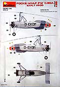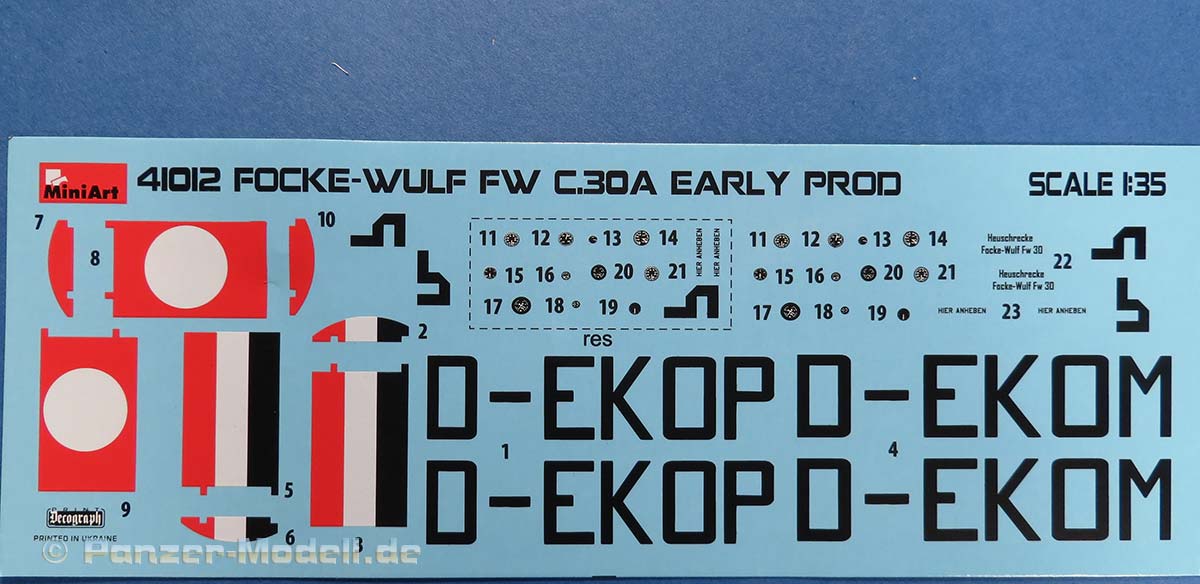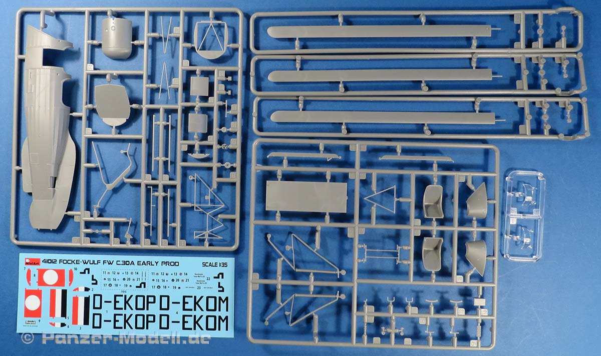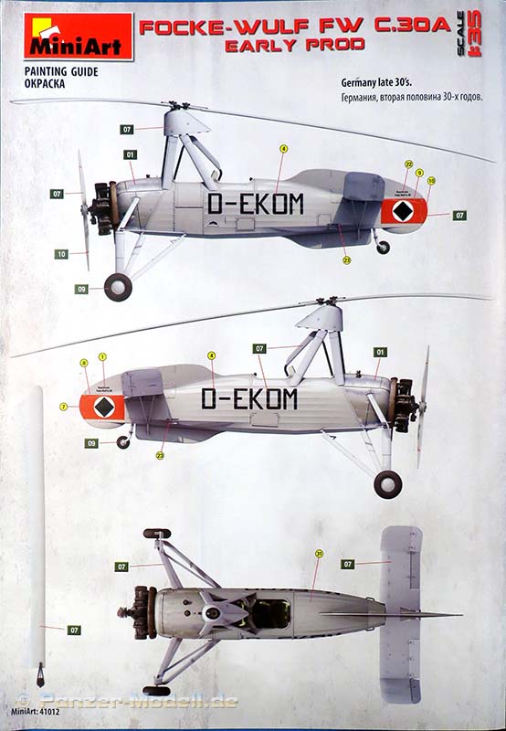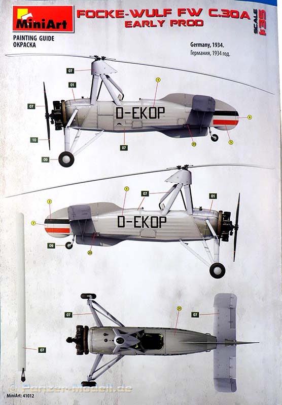 Dieser Tragschrauber von Focke Wulf stellt den Lizenzbau des Cierva C.30A dar, wobei die hier dargestellte frühe Version die beiden Eprobungsmuster darstellen, die das Deutsche Reich 1934 von Avro geliefert bekam und bei der E-Stelle Rechlin erprobt wurden. Im Bausatz finden wir 8 graue und einem klaren Spritzling. Die Qualität ist gut, saubere und feine Details, kein Vezug oder Spritzfehler und Auswerfermarken an später sichtbaren Stellen und Fischhaut sucht man hier vergebens. Es liegt eine Ätzteilplatine zur Verfeinerung bei, diese beinhaltet diverse Bauteile (Gurte, Hebel, Griffe etc.) Die Gravuren des Modells sind sehr schön ausgeführt und überzeugen auf ganzer Linie. Die Oberflächen sind hervorragend dargestellt, hier sind besonders die Rumpfseiten und die gewinkelten Höhenruder genannt bei denen die Struktur des Rahmens schön deutlich dargestellt ist. Der Rumpf selber setzt sich aus zwei Halbteilen zusammen, die horizontal getrennt sind. Das Modell enthält eine komplette Darstellung des Sternmotors, der sihr fein detailliert und sogar duch feien PE Teilchen weiter verfeinert , dargestellt ist. Die Bauanleitung führt in 26 Schritten zum fertigen Modell, diese zeigen sich im typischen sehr übersichtlichen Miniart 3D Stil. In der Bauanleitung finden sich die Bemalungs- und Markierungsanleitungen auf DIN A4 im Hochglanz Farbdruck für die beiden ausgelieferten Exemplare.