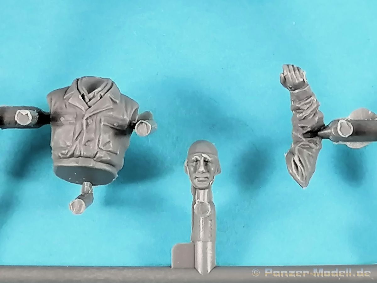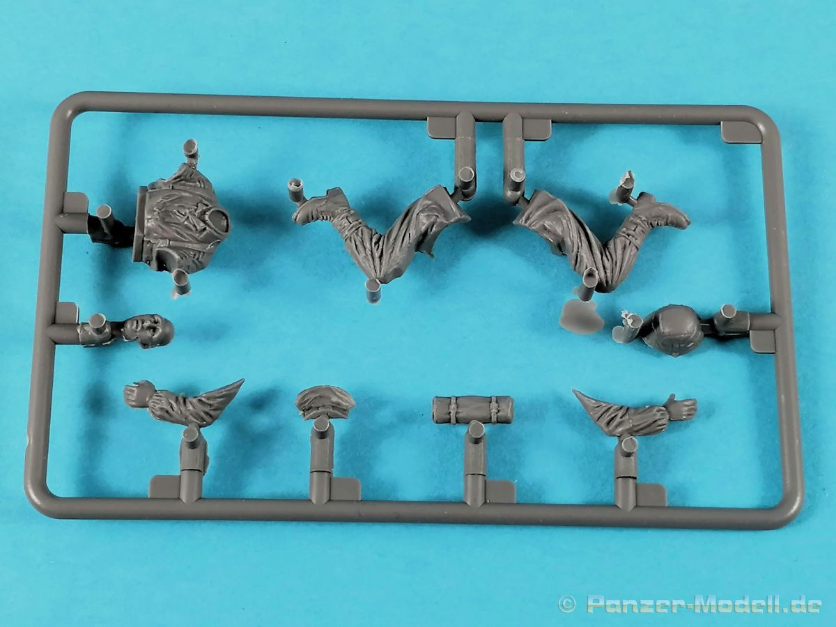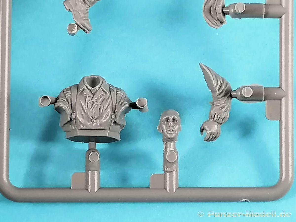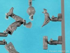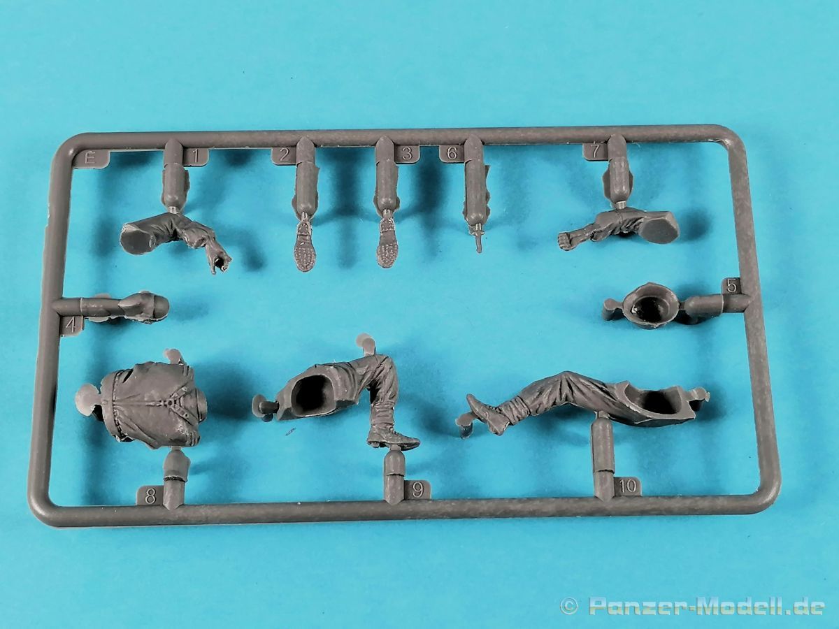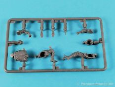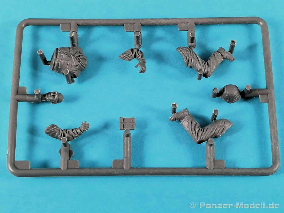 Aus vier, zB. auf einem Panzer aufgesessene Soldaten mit Tarnuniformen der Waffen-SS, die im späteren Verlauf des Krieges anzutreffen waren besteht das erste Set. In der 260x160x35 mm großen Schüttbox befinden sich vier hellgraue Rahmen für die Figuren und drei für Ausrüstung und Waffen. Dazu kommt noch ein kleiner Steg der vier Köpfe aus Resin enthält. Auf der Rückseite der Schachtel sehen wir farbige Abbildungen der Figuren. Teilenummern und Markierungen zeigen, wo die Teile hingehören. Bemalungshinweise und eine Farbtabelle für Vallejo, Mr. Color, AK RC, Mission Models, AMMO MIG und Tamiya Farben befindet unterhalb der Anleitung. Die Teile aus grauem Plastik sind gut ausgeformt und weisen keinen Verzug, Versatz oder Sinkstellen auf. Die Angüsse fallen akzeptabel aus und sind so gesetzt, dass sie beim Abtrennen vom Spritzling und beim Versäubern keine Probleme bereiten. Feiner Grat der Formtrennnaht ist zu finden, aber mit Bastelmesser, einer feinen Feile oder Schleifpapier lässt sich diese leicht entfernen. Jede Figur besteht aus Rumpf, Armen, Beinen, Kopf und Helm mit Tarnüberzug. Bei Figuren, die ihre Waffen direkt in den Händen tragen, sind separate Fingergruppen dabei, mit denen man die Waffen glaubhafter an die Hände kleben kann. Bei der Figur, bei denen die Schuhsohlen sichtbar sind, sind diese separat vorhanden und als genagelte Sohlen zu erkennen. Auch wenn die Helme aufgesetzt werden, sind sie dennoch mit dem gut gestalteten Innenfutter versehen. Details wie Hosennähte und Gamaschen können ebenfalls punkten. Der Faltenwurf der Uniformen ist weicher als bei Resinfiguren, kommt aber glaubhaft daher. Auch die Gesichter sind für Spritzguss gut ausgeführt. Als Alternative liegen für die Köpfe/Gesichter solche aus Resin bei. Sehr löblich! Auf drei weiteren Spritzlingen finden sich Waffen (Karabiner, Maschinenpistolen, Pistolen, Munitionstaschen) und Ausrüstungteile (Helme, Brotbeutel, Klappspaten, Kochgeschirr, Gasmaskenbüchsen, Feldflaschen, Bajonette). Die Detaillierung ist als sehr gut zu bezeichnen. Man findet u.a. auch eine offene, leere Pistolentasche, offenes Kochgeschirr und separate, mehrteilige Klappschulterstützen für die MP40. Am besten orientiert man sich am Kartonbild und der Bau-/Bemalungsanleitung, was davon benötigt wird. Nicht jede Waffe wird direkt zu den Figuren passen, aber man hat dann noch jede Menge für die Ersatzteilkiste Die Halterungen und Titel suggerieren, dass die Figuren aufgesessen auf einem Panzer mitfahren, aber man kann sie sicherlich auch anderweitig verwenden wie sitzend auf den Stufen einer Treppe, auf einem Baumstamm im Gelände oder auf der Pritsche eines Lkws. Möglichkeiten gibt es genug. Definitiv ein Figurensatz der sich lohnt.